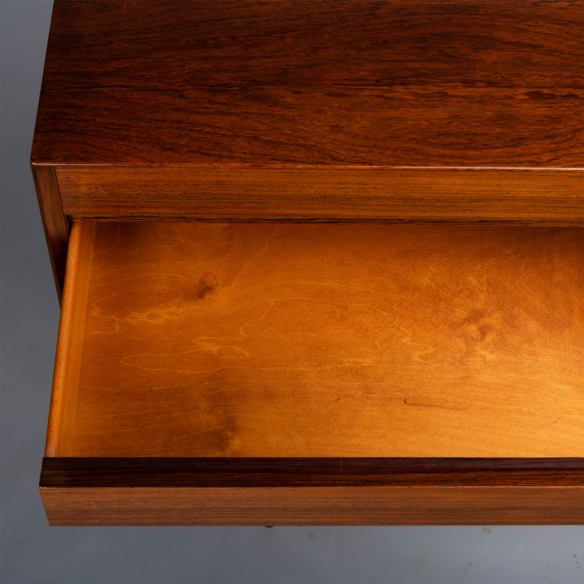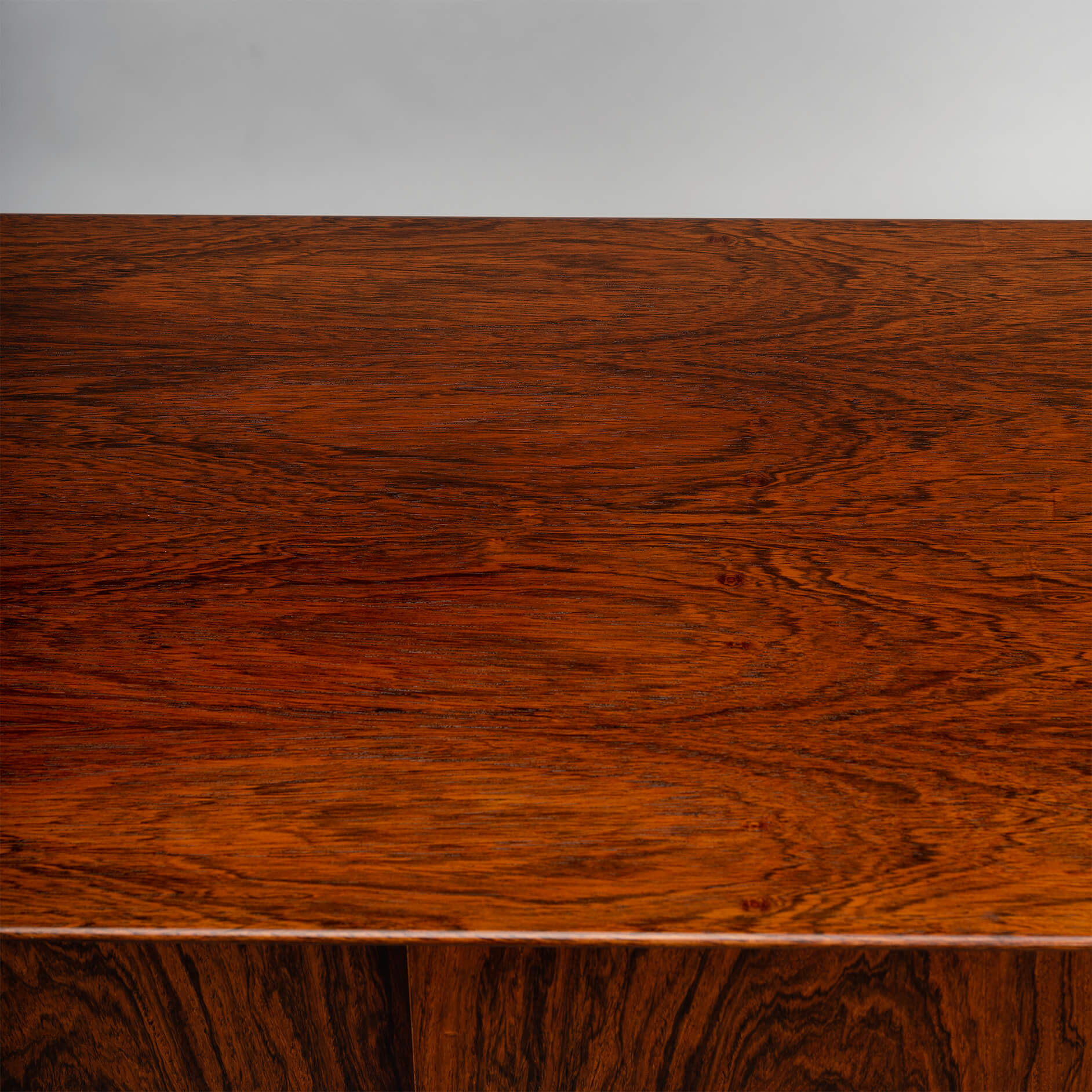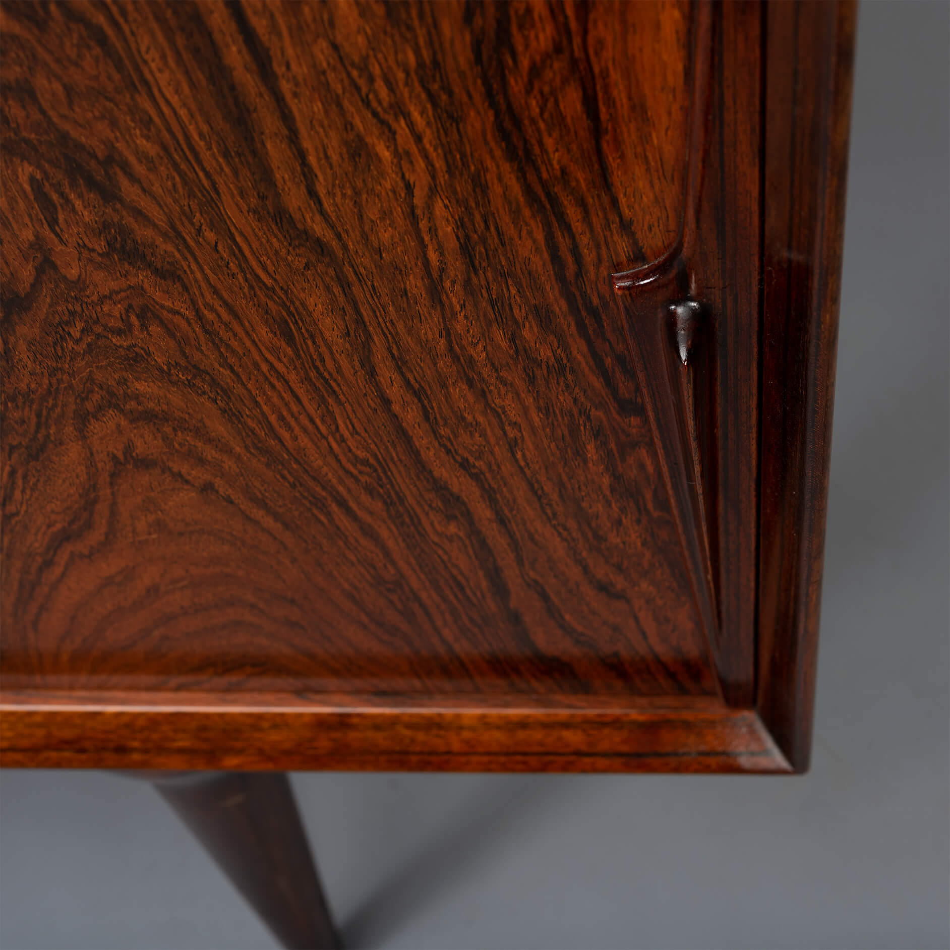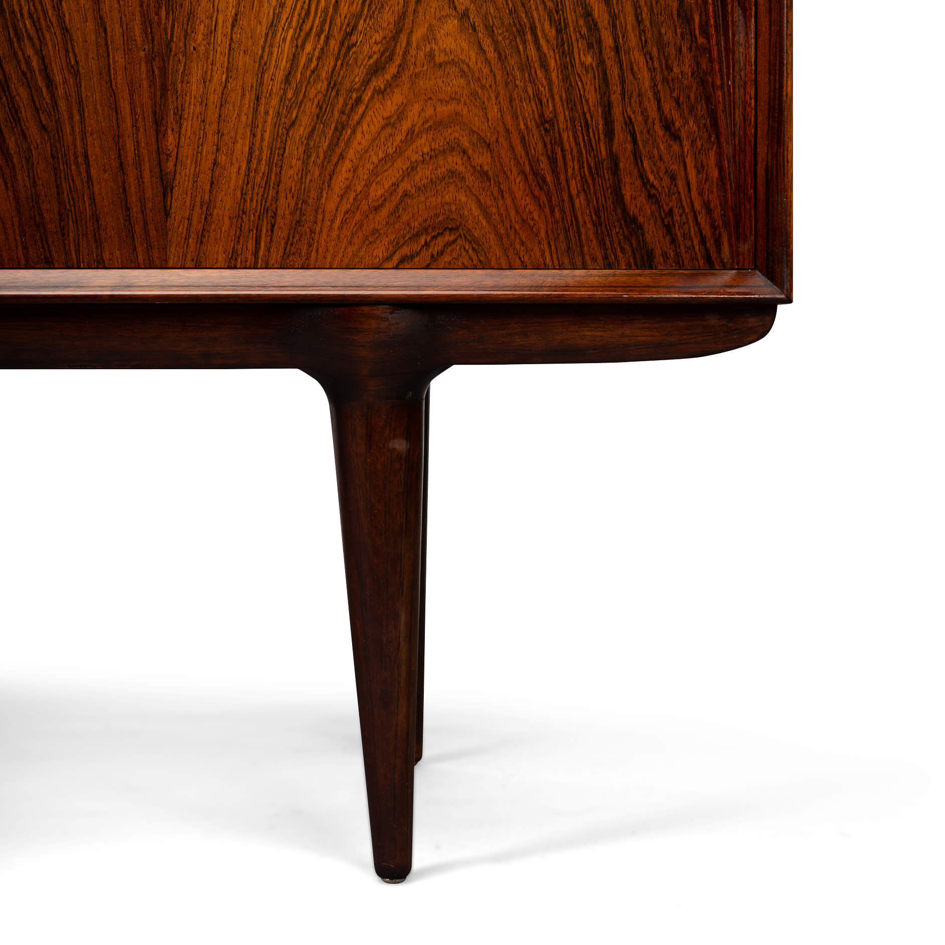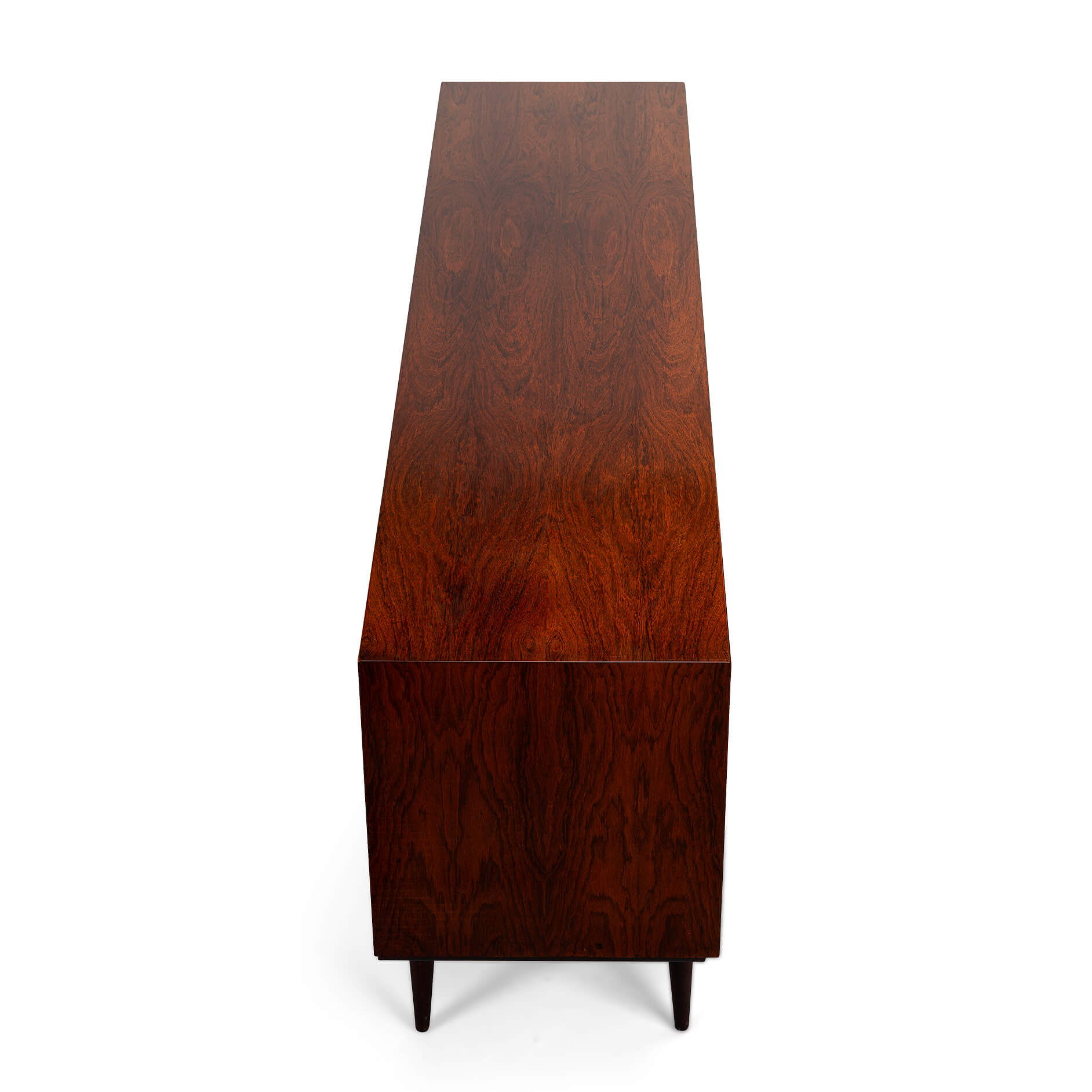 Superb level of quality and use of high end materials on top of its design make it a full pull. Doors accented by beautifully hand-sculpted rosewood handles, slide open to reveal an adjustable shelve. A bank of four drawers provide for enough additional storage. This credenza is in very good vintage condition with minimal signs of use and age.