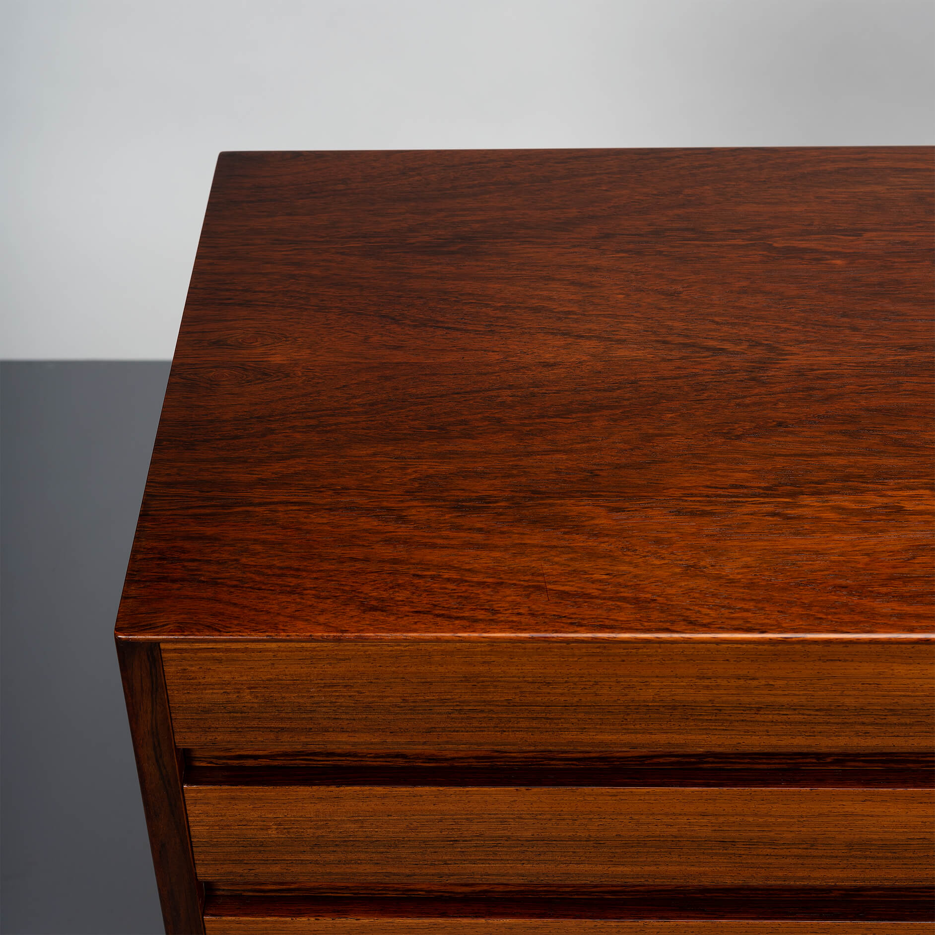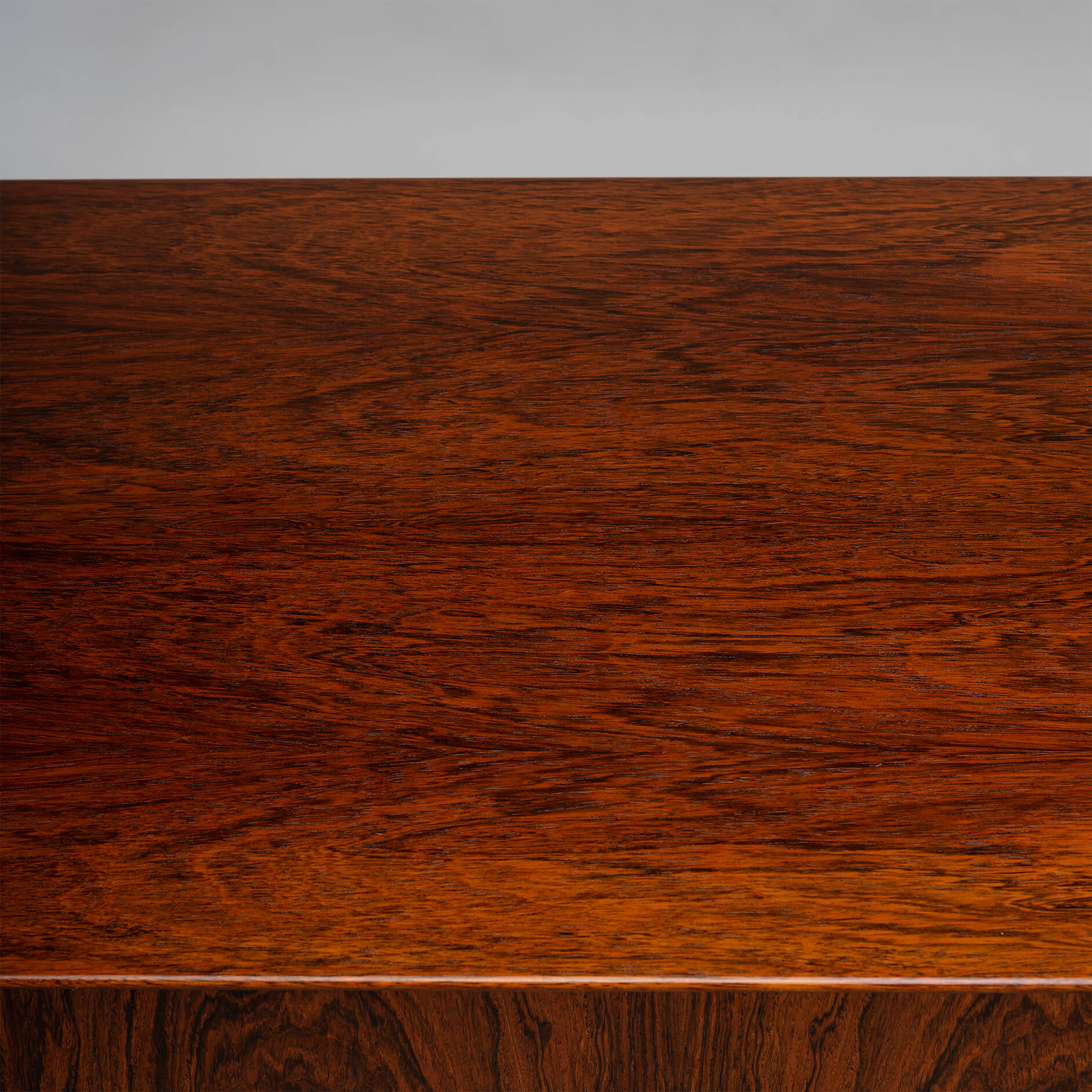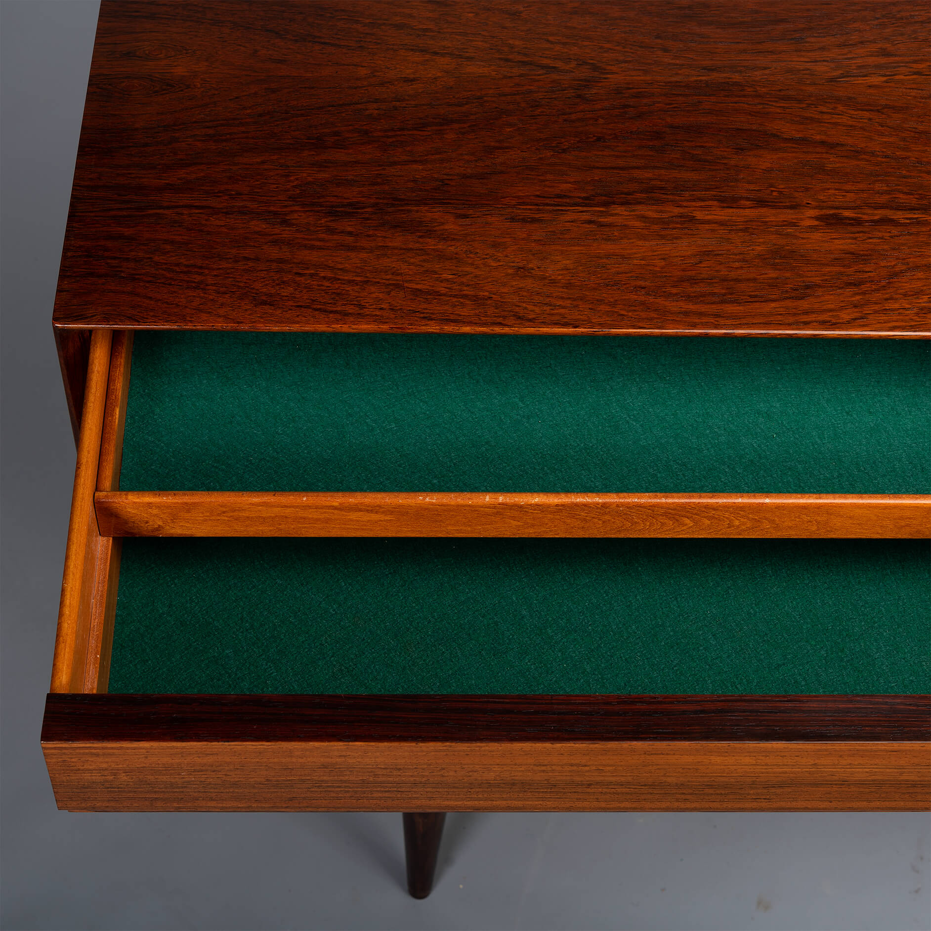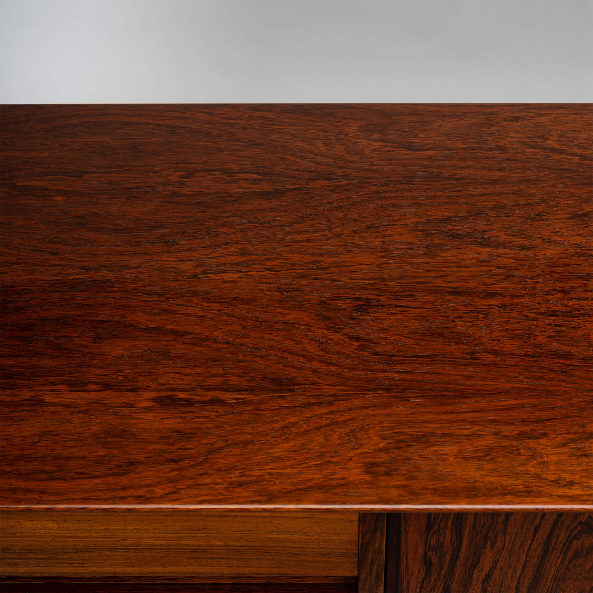 Superb level of quality and use of high end materials on top of its design make it a full pull. Doors accented by beautifully hand-sculpted rosewood handles, slide open to reveal an adjustable shelve. A bank of four drawers provide for enough additional storage. This credenza is in very good vintage condition with minimal signs of use and age.