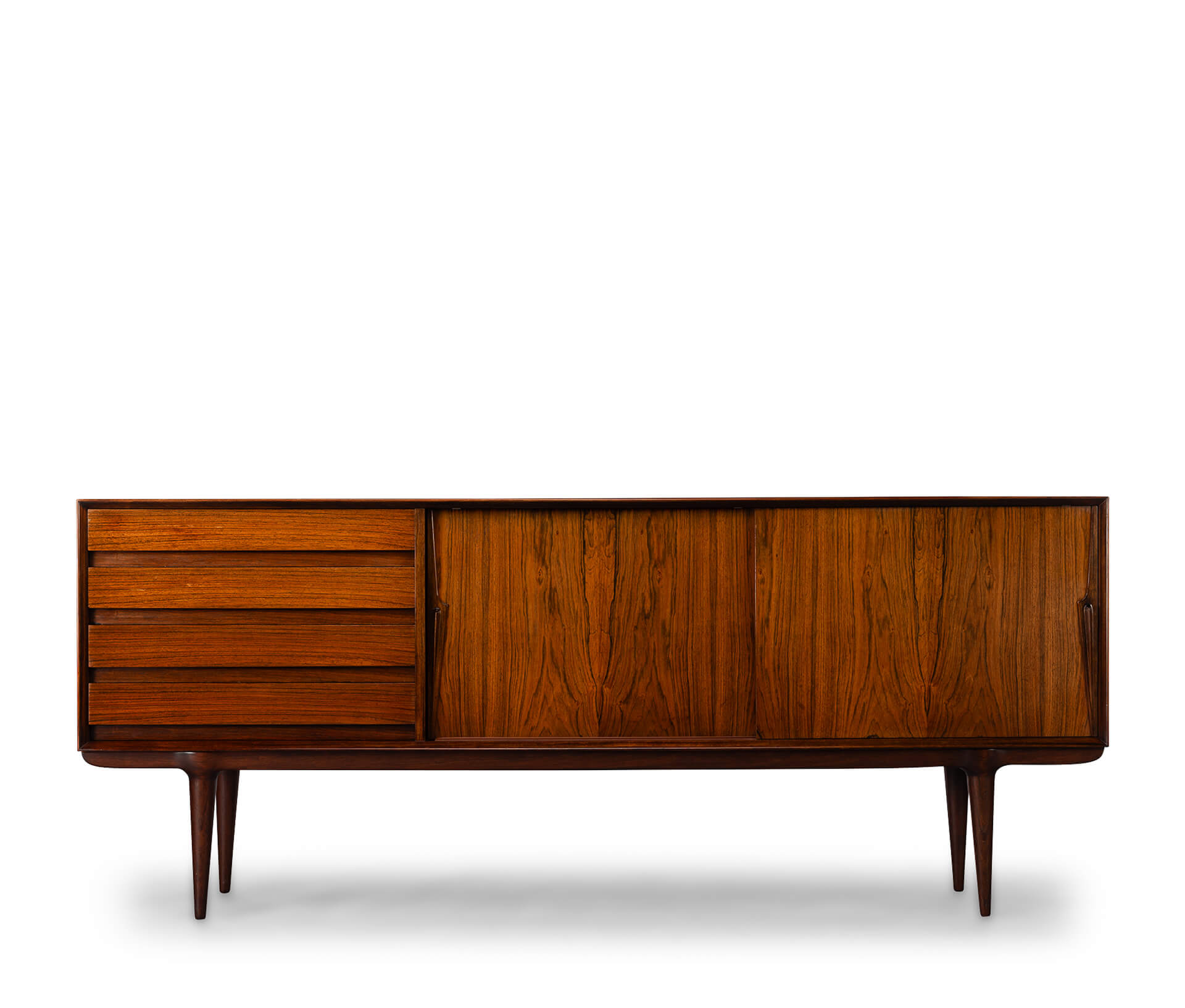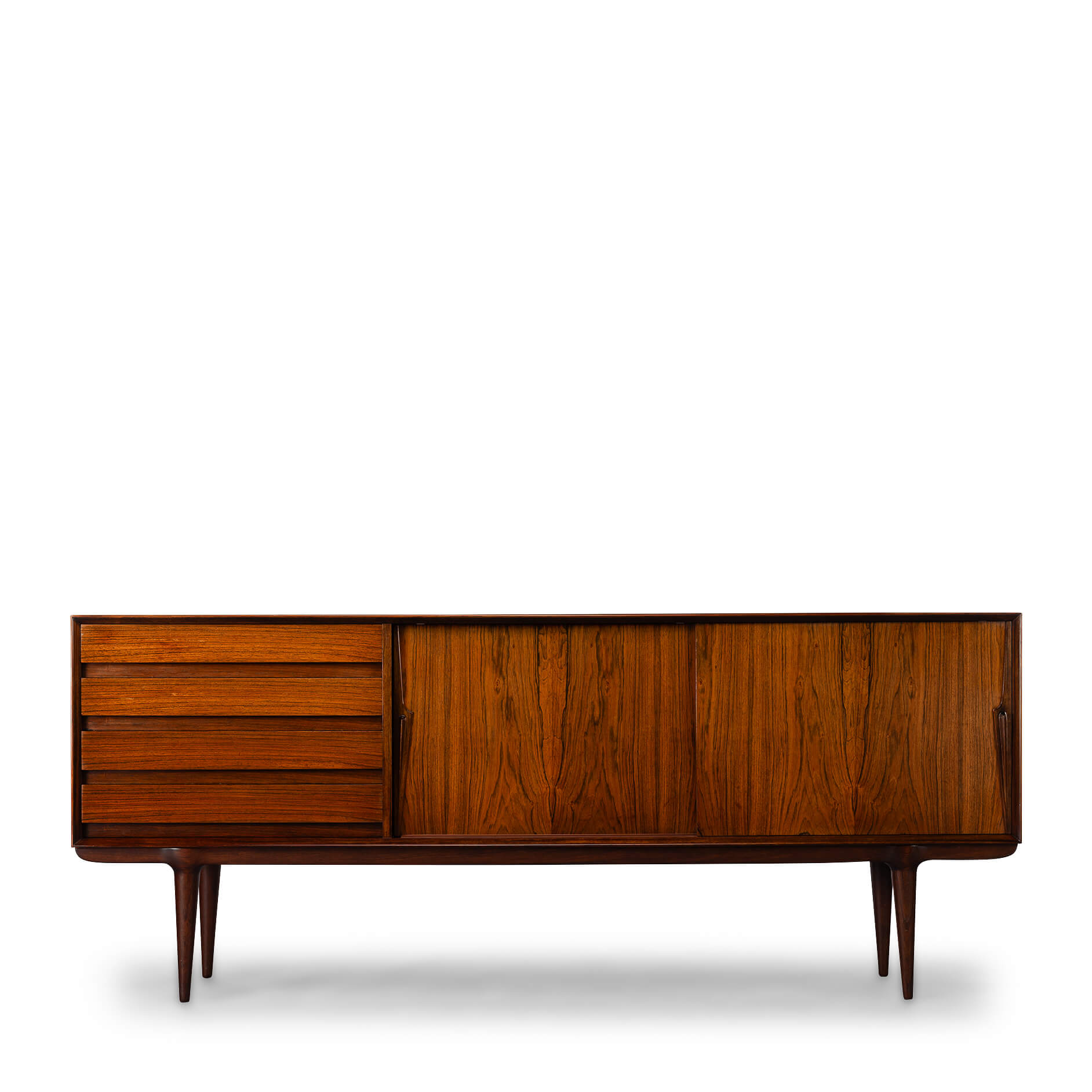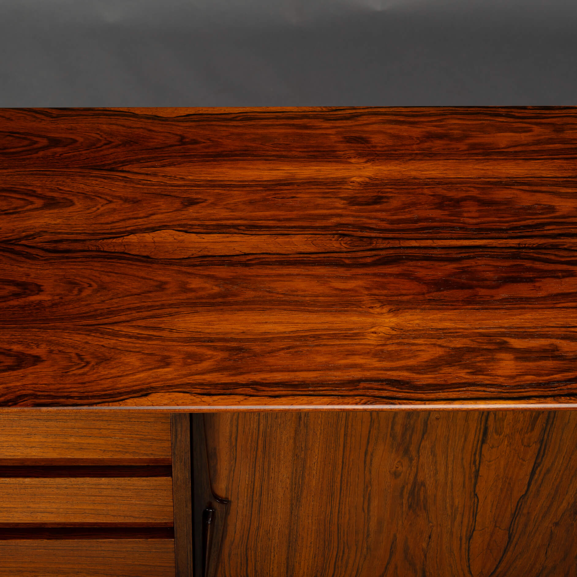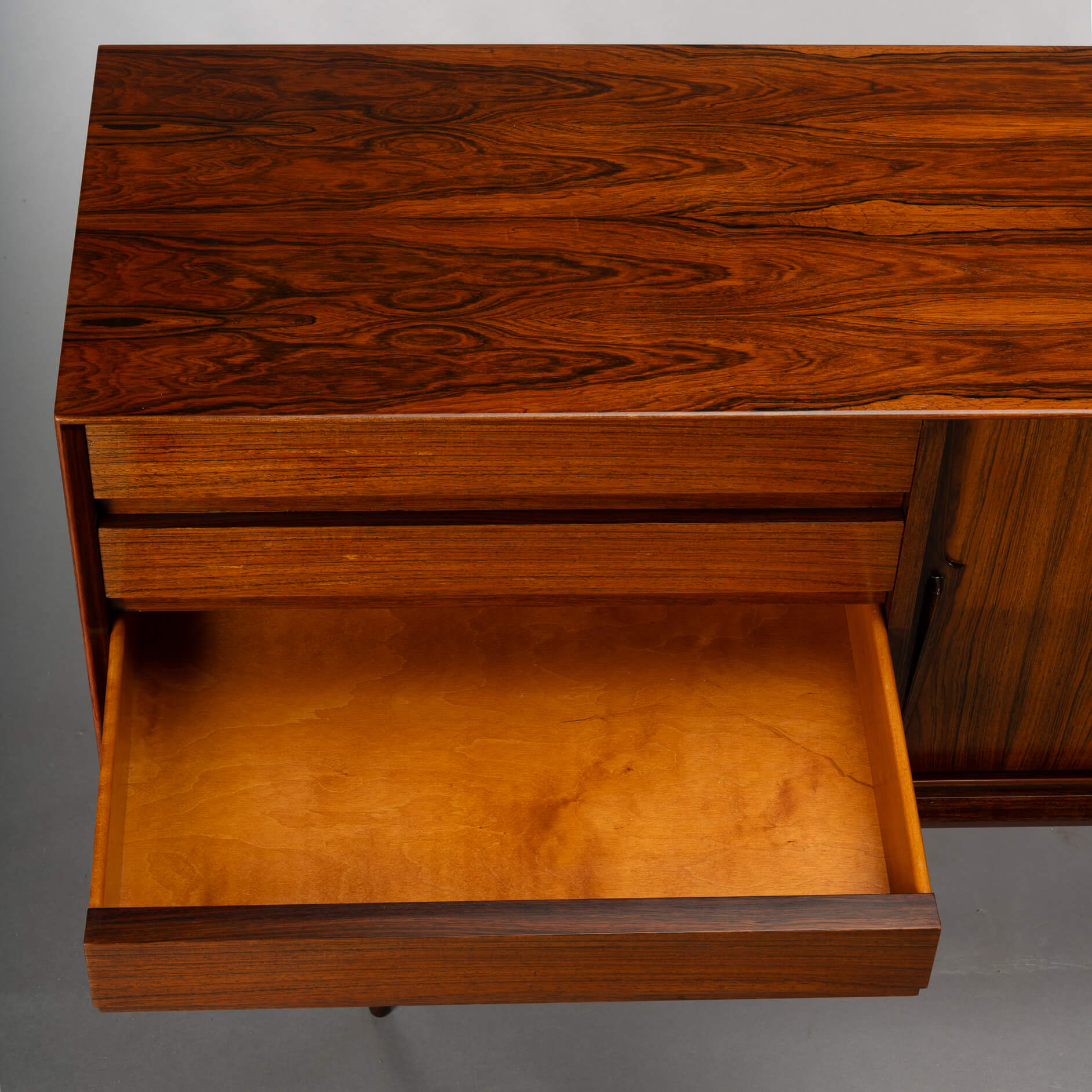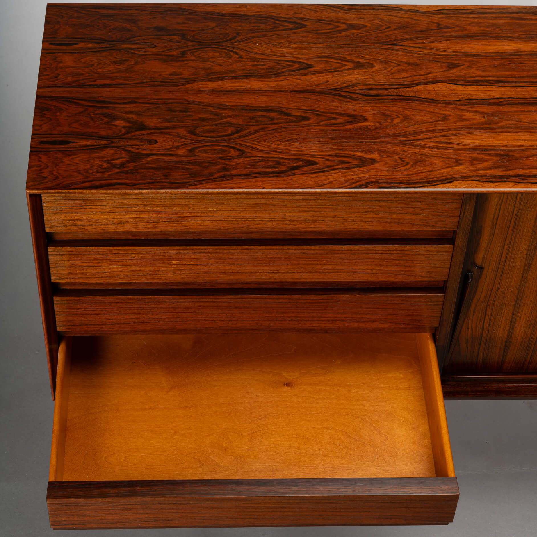 Superb level of quality and use of high end materials on top of its design make it a full pull. Doors accented by beautifully hand-sculpted rosewood handles, slide open to reveal an adjustable shelve. A bank of four drawers provide for enough additional storage. We had the top professionally resprayed with a high-quality cellulose coating. Nothing more was necessary. So this sideboard is in very good vintage condition with minimal signs of use and age.