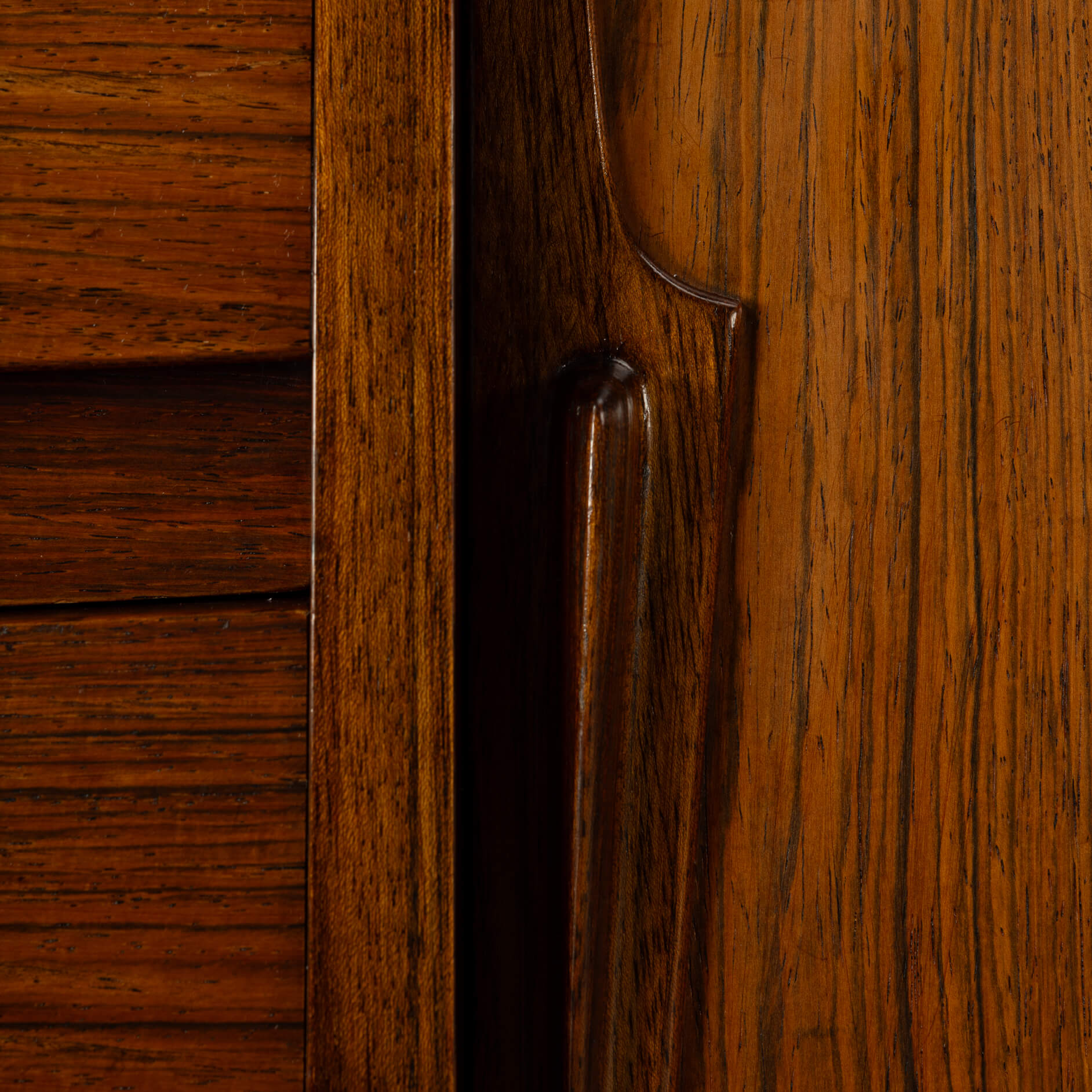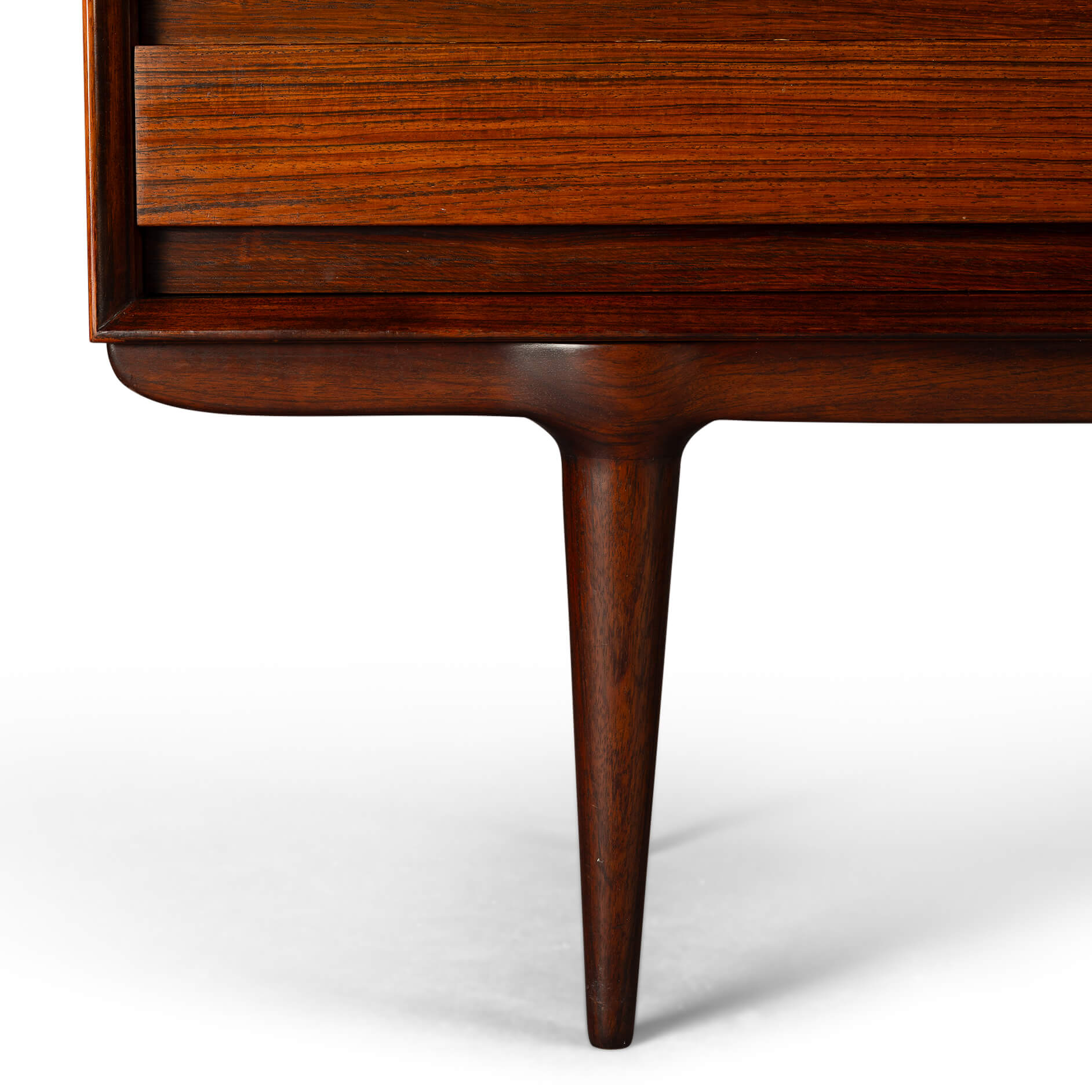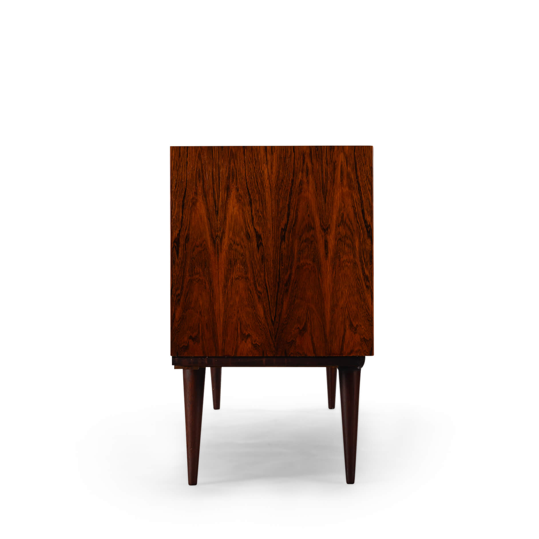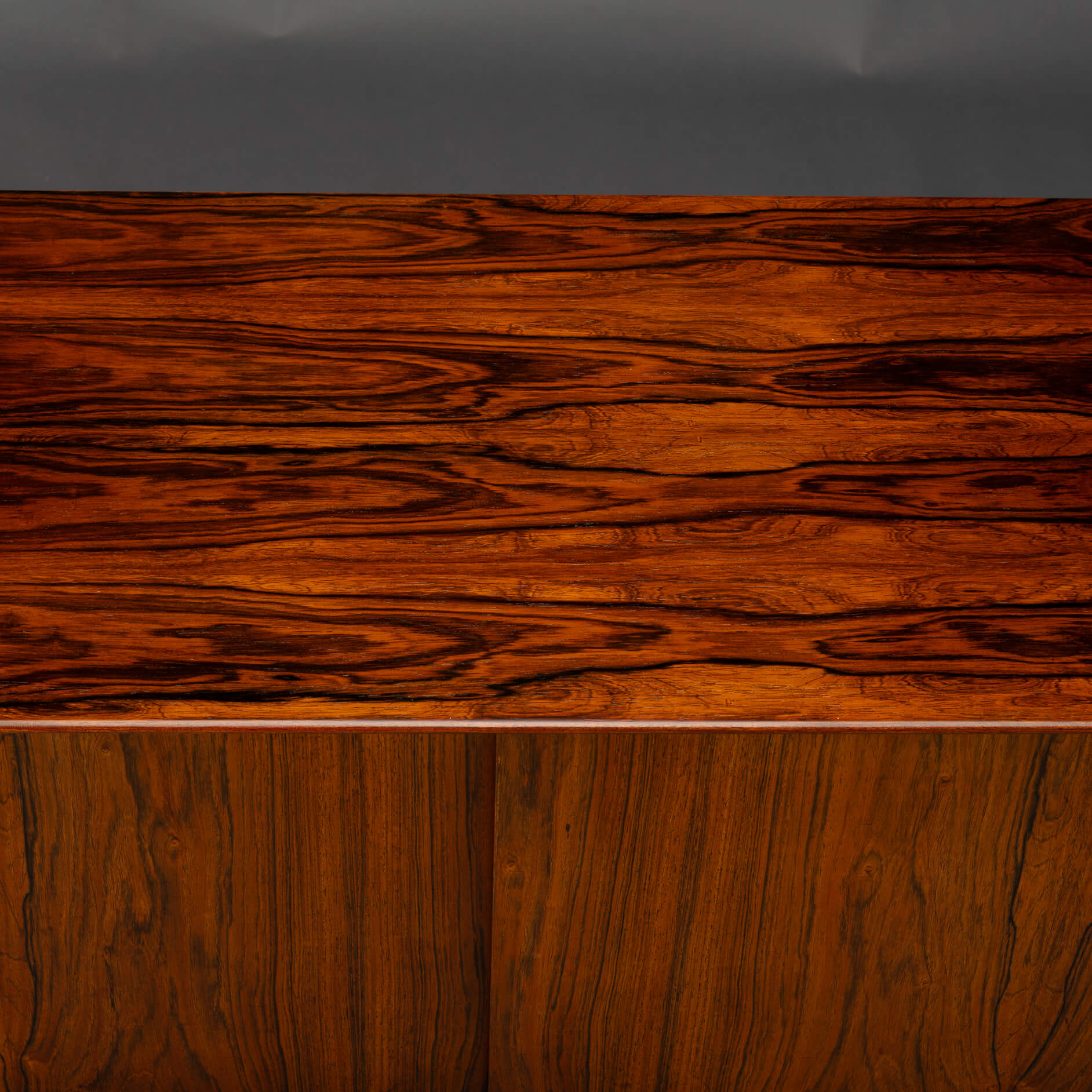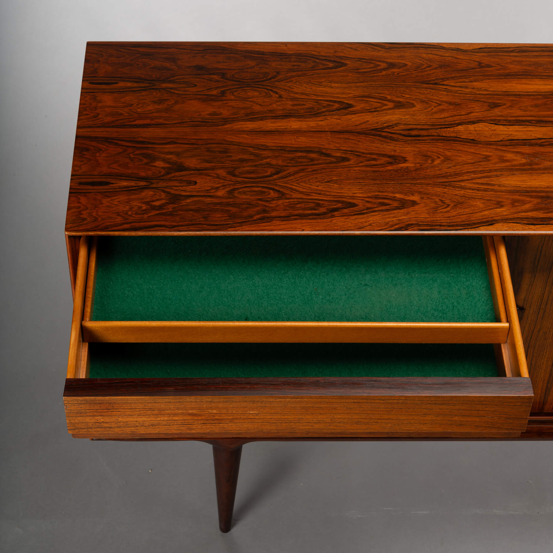Superb level of quality and use of high end materials on top of its design make it a full pull. Doors accented by beautifully hand-sculpted rosewood handles, slide open to reveal an adjustable shelve. A bank of four drawers provide for enough additional storage. We had the top professionally resprayed with a high-quality cellulose coating. Nothing more was necessary. So this sideboard is in very good vintage condition with minimal signs of use and age.