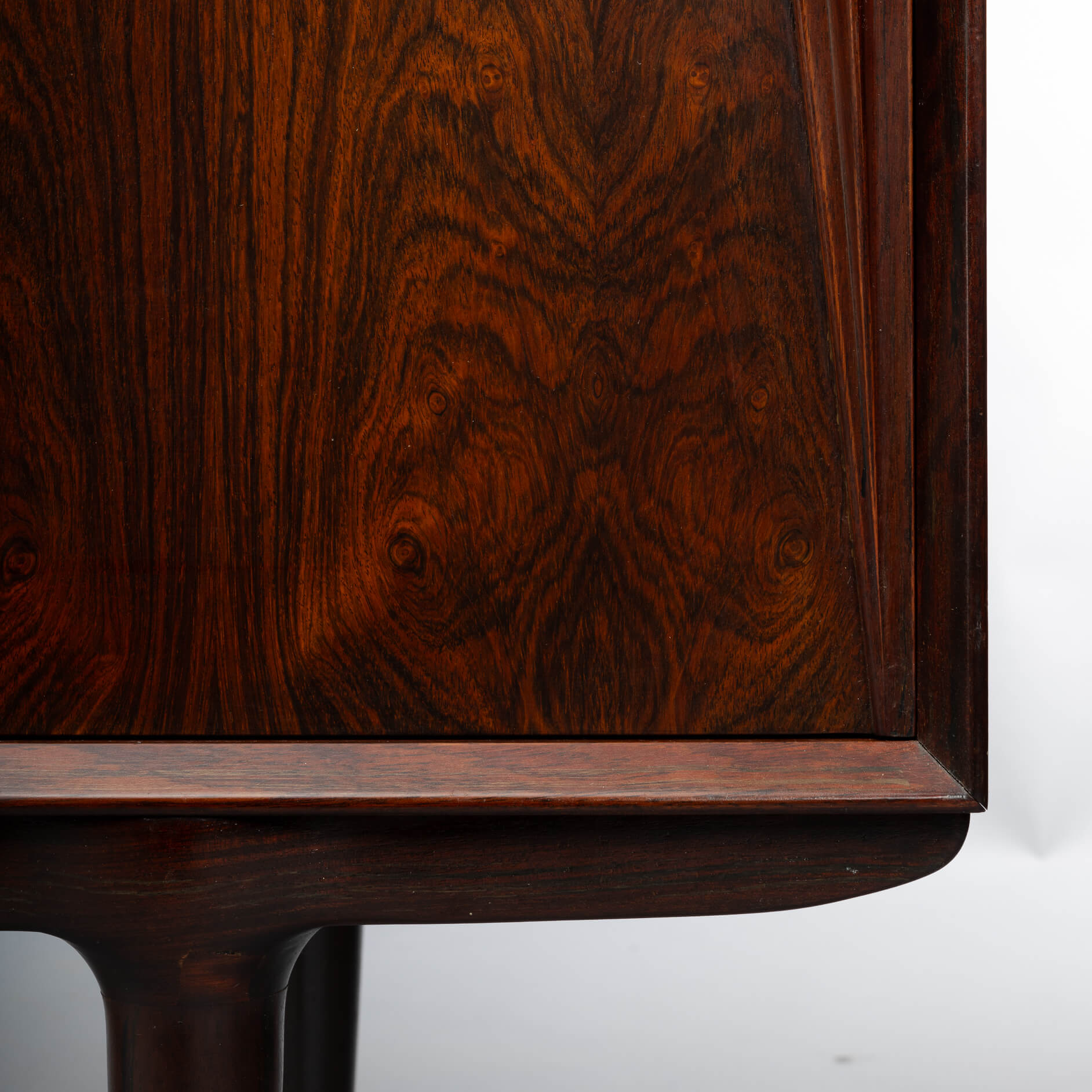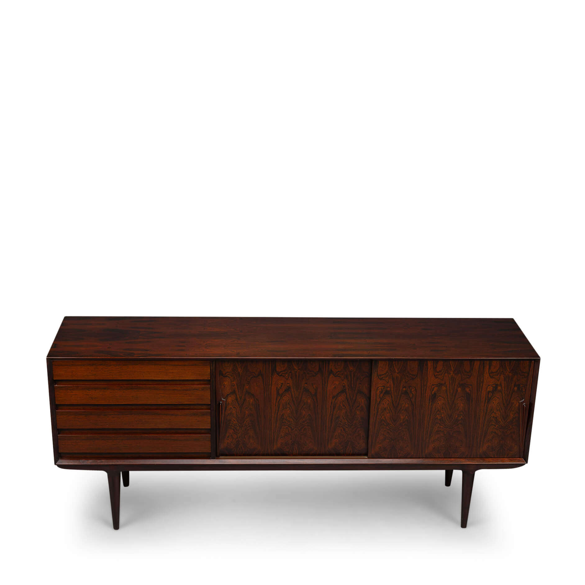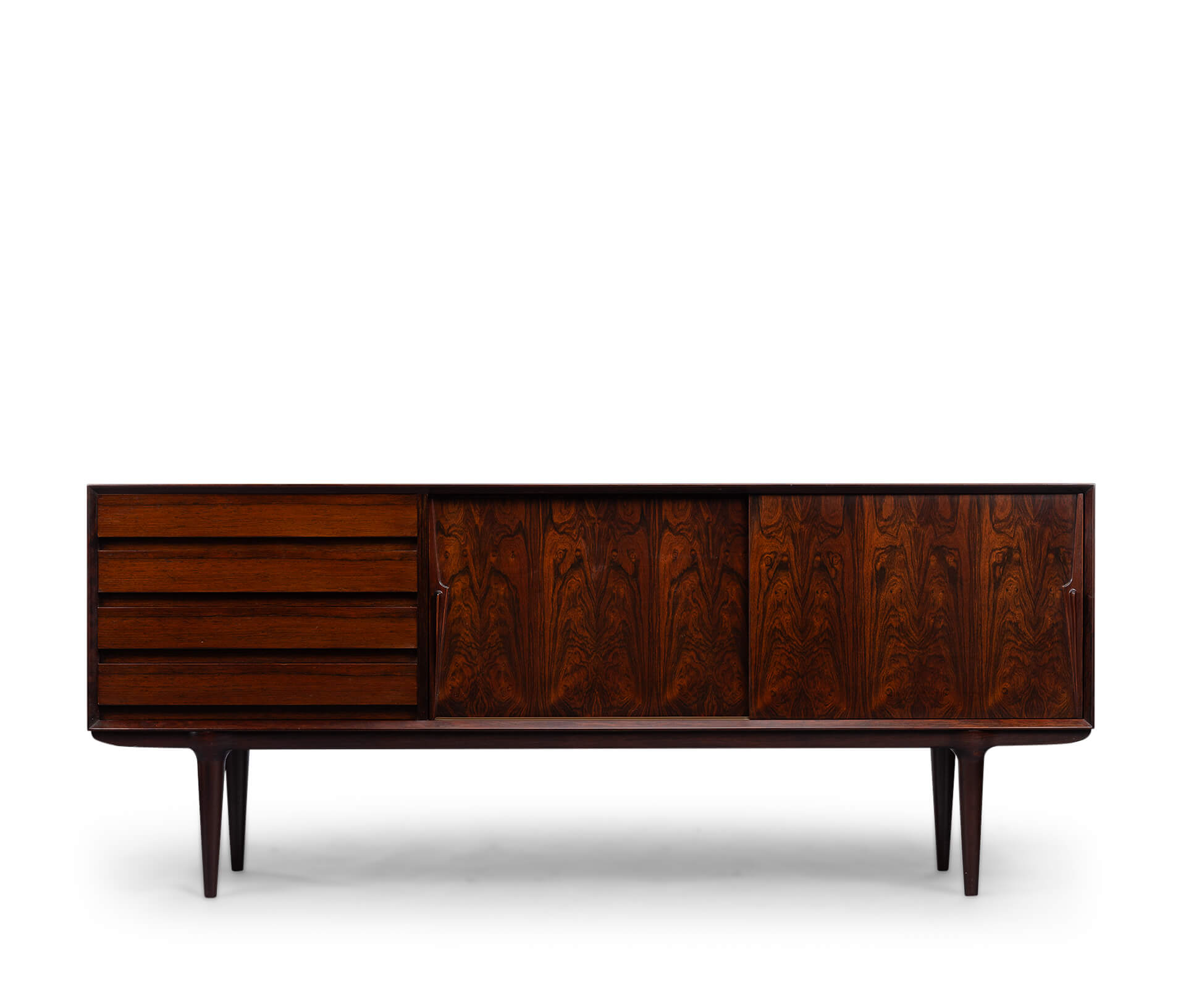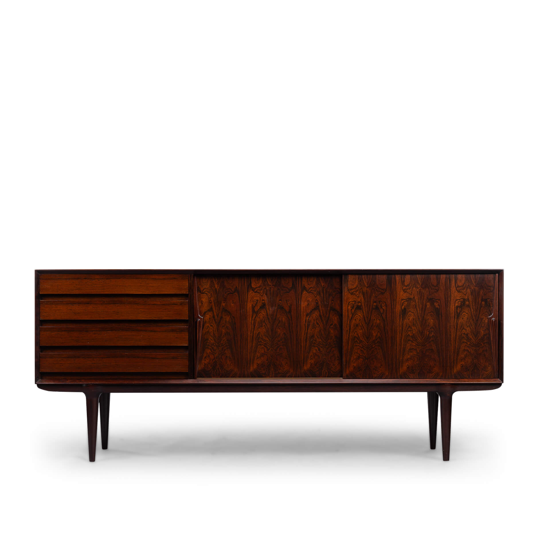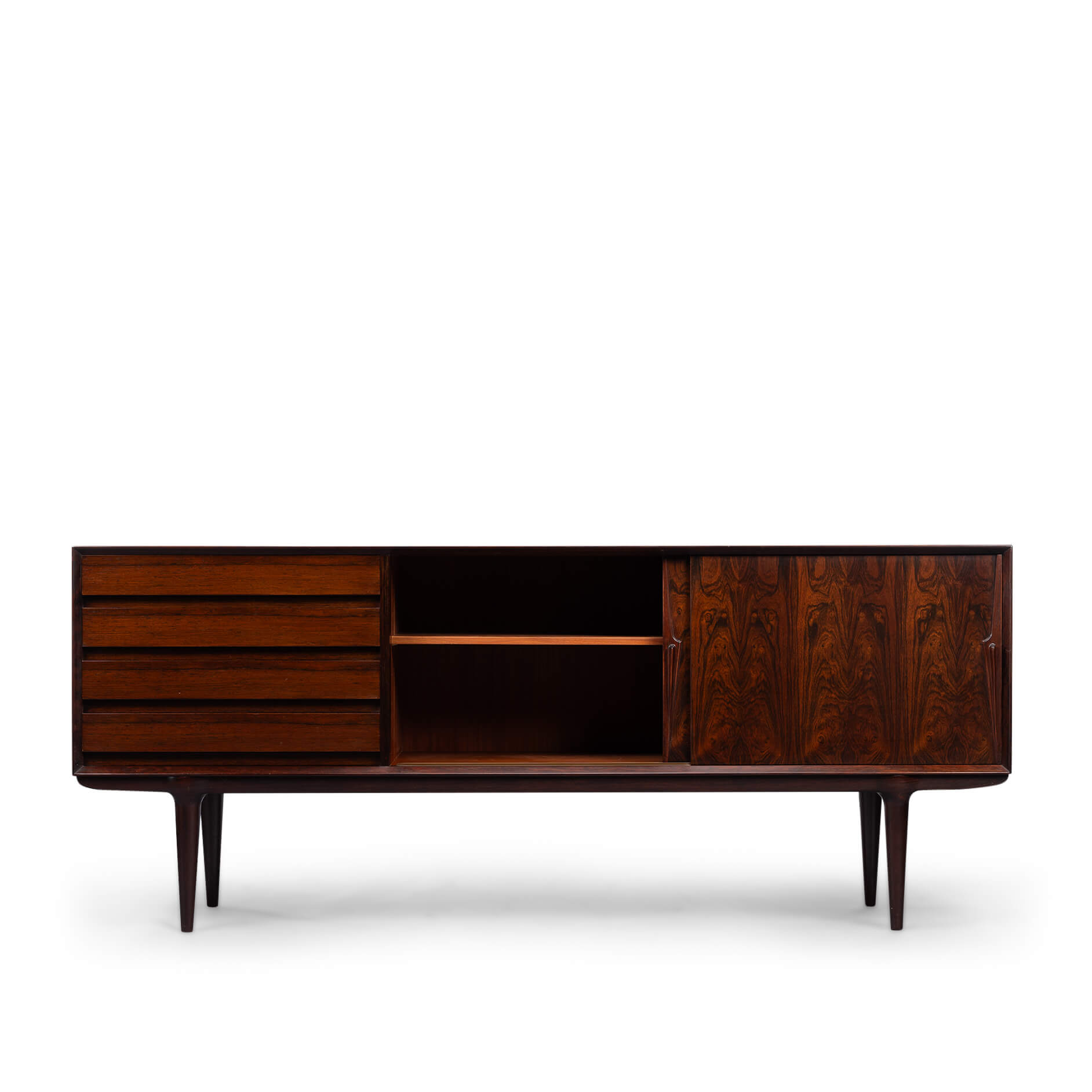 Superb level of quality and use of high end materials on top of its design make it a full pull. Doors accented by beautifully hand-sculpted rosewood handles, slide open to reveal an adjustable shelve. A bank of four drawers provide for enough additional storage. This sideboard is in very good vintage condition with minimal signs of use and age.