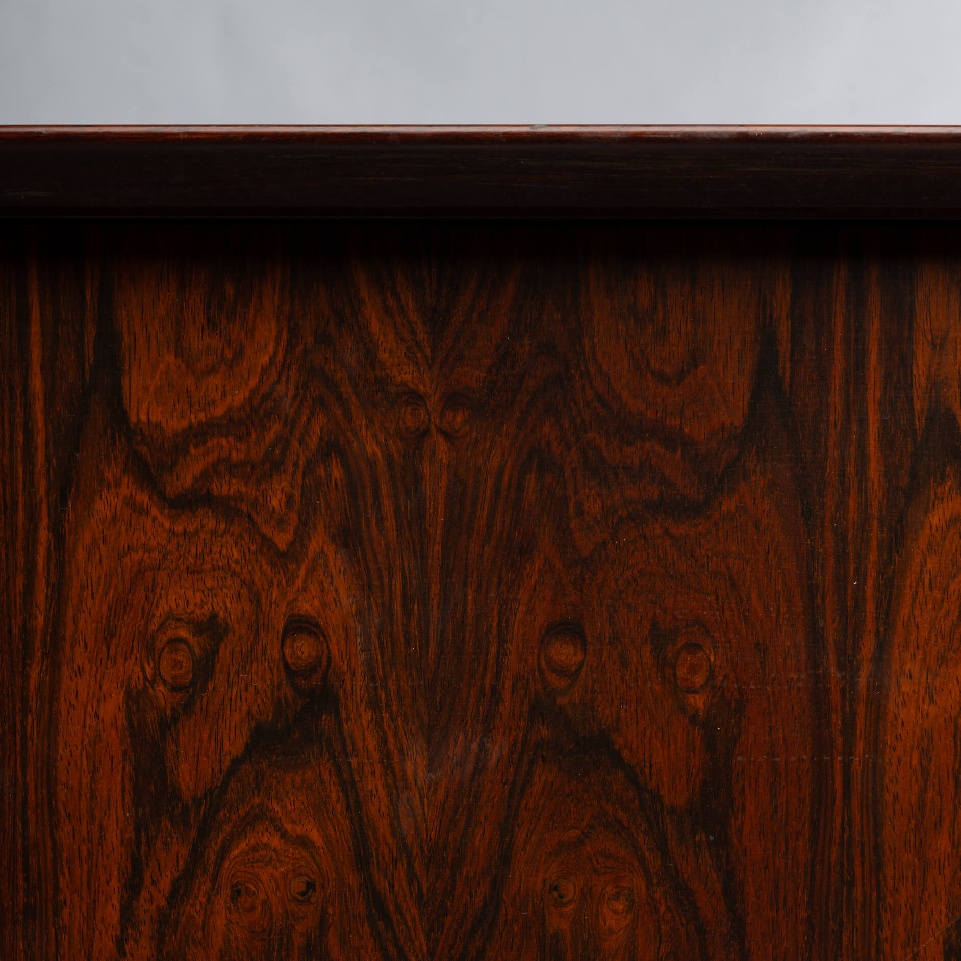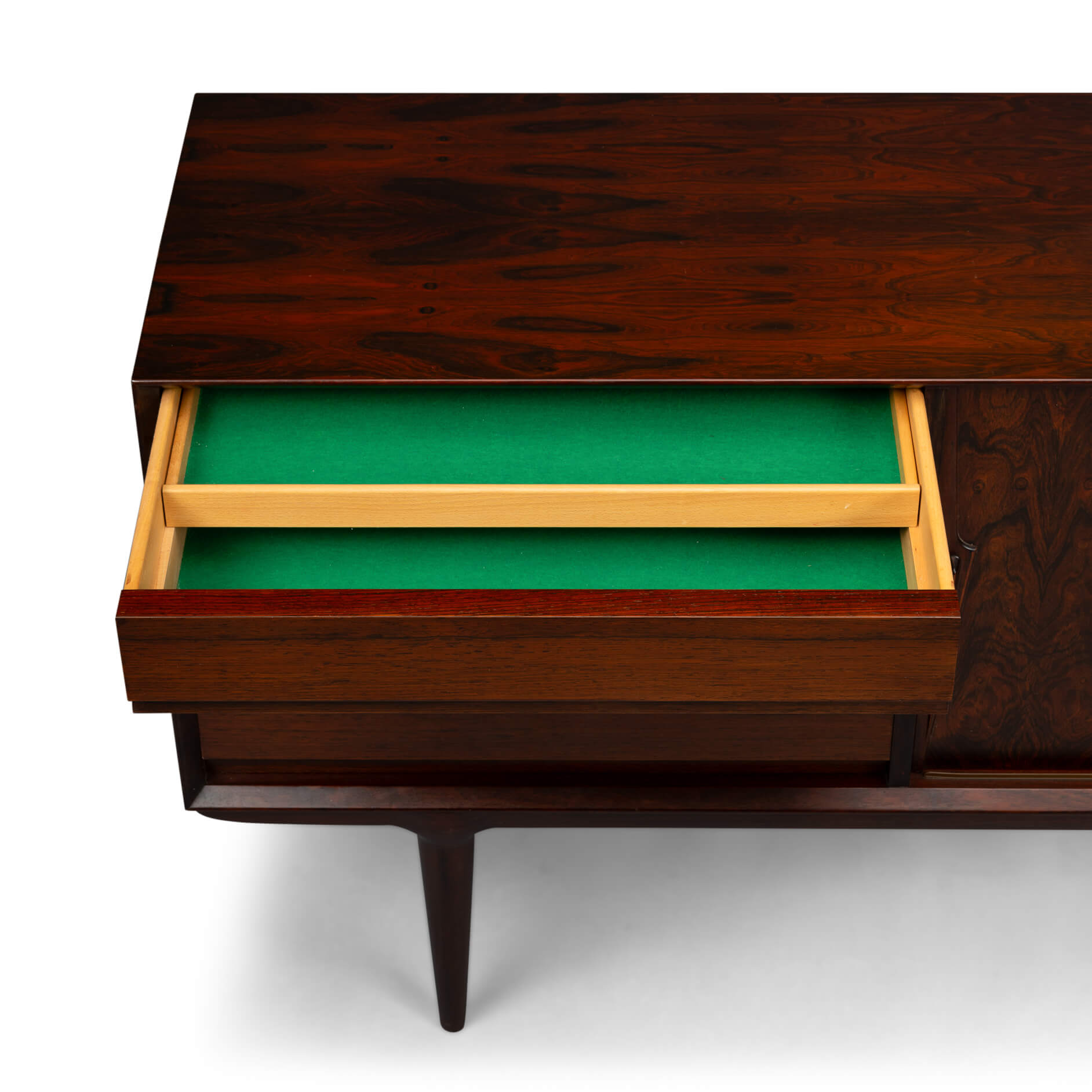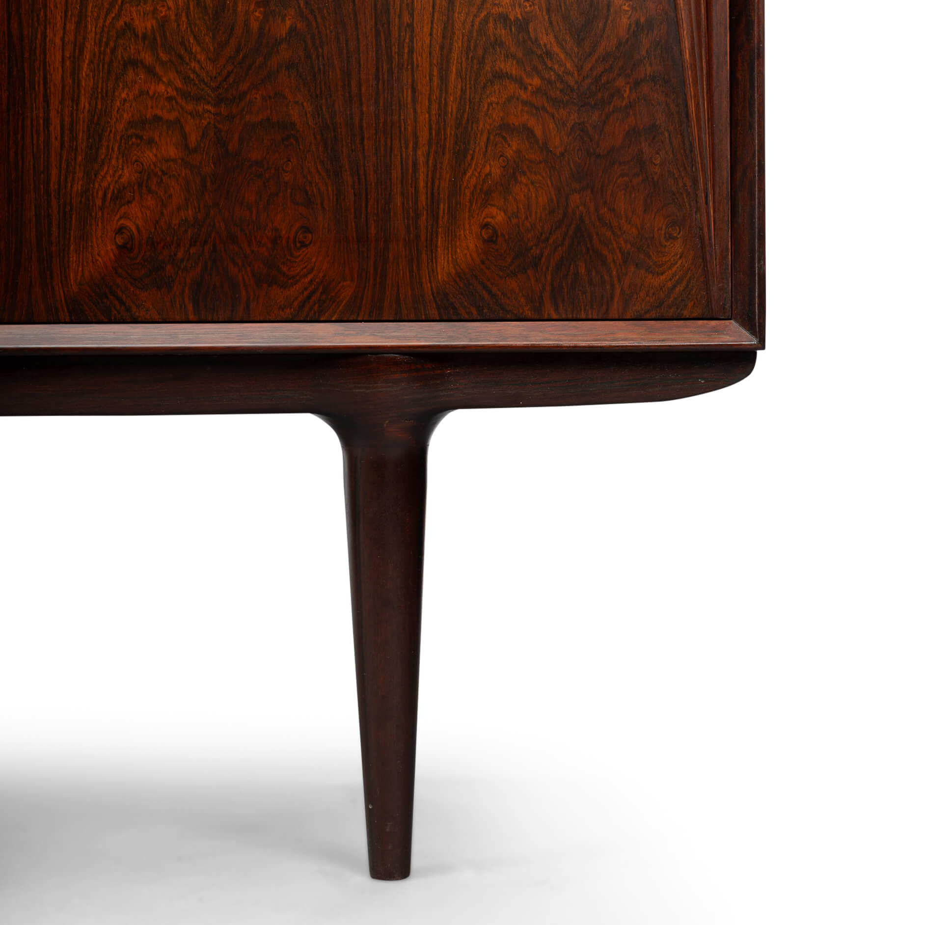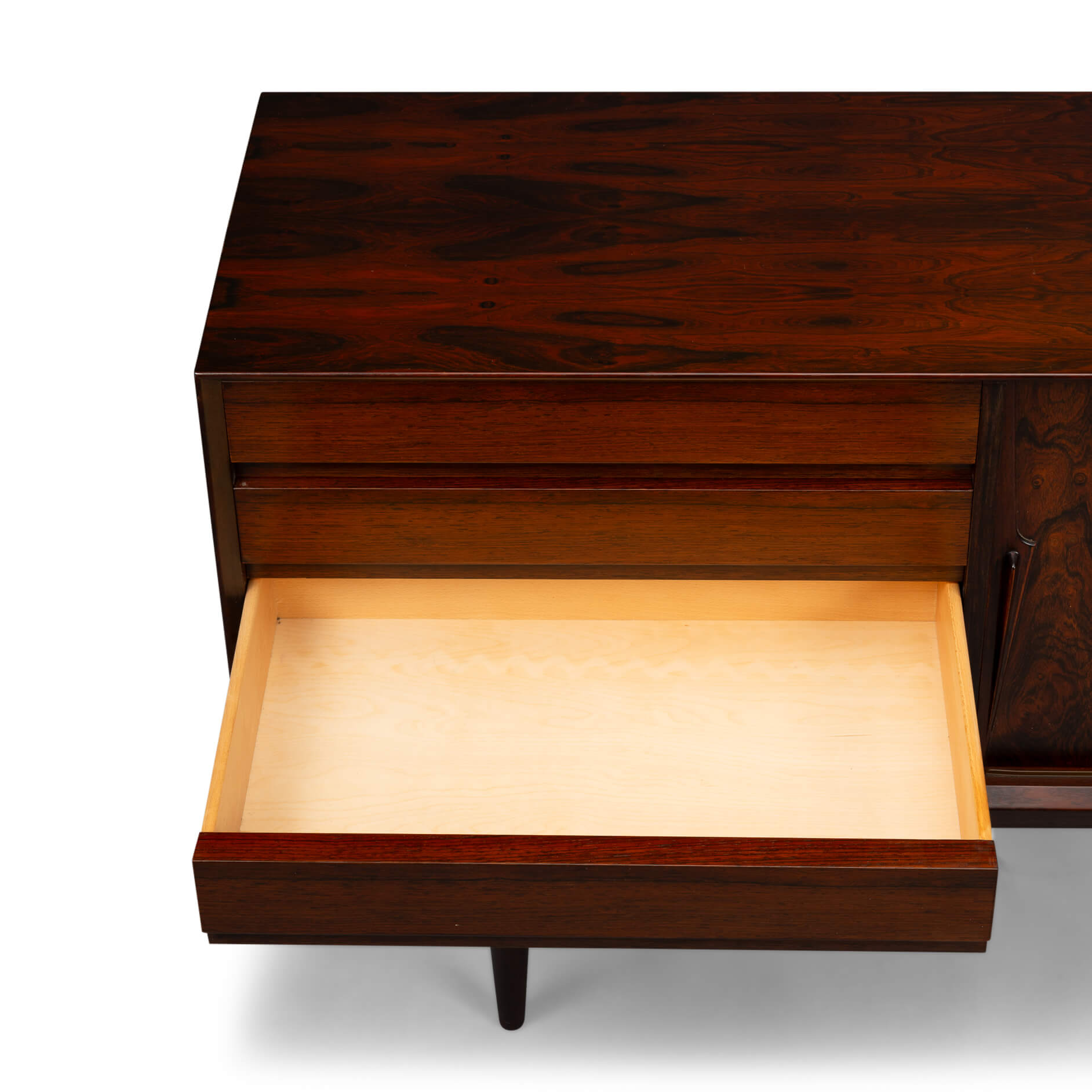 Superb level of quality and use of high end materials on top of its design make it a full pull. Doors accented by beautifully hand-sculpted rosewood handles, slide open to reveal an adjustable shelve. A bank of four drawers provide for enough additional storage. This sideboard is in very good vintage condition with minimal signs of use and age.