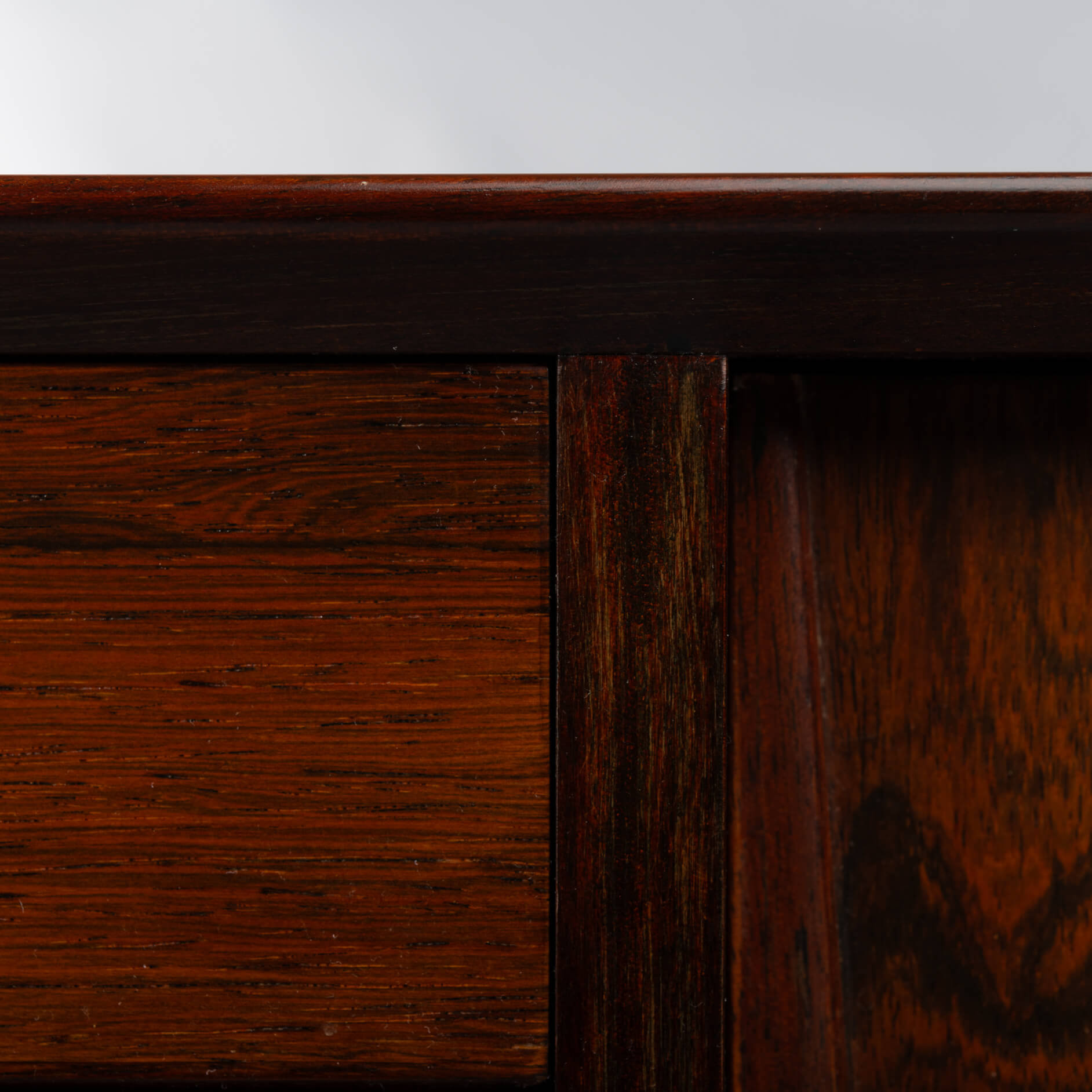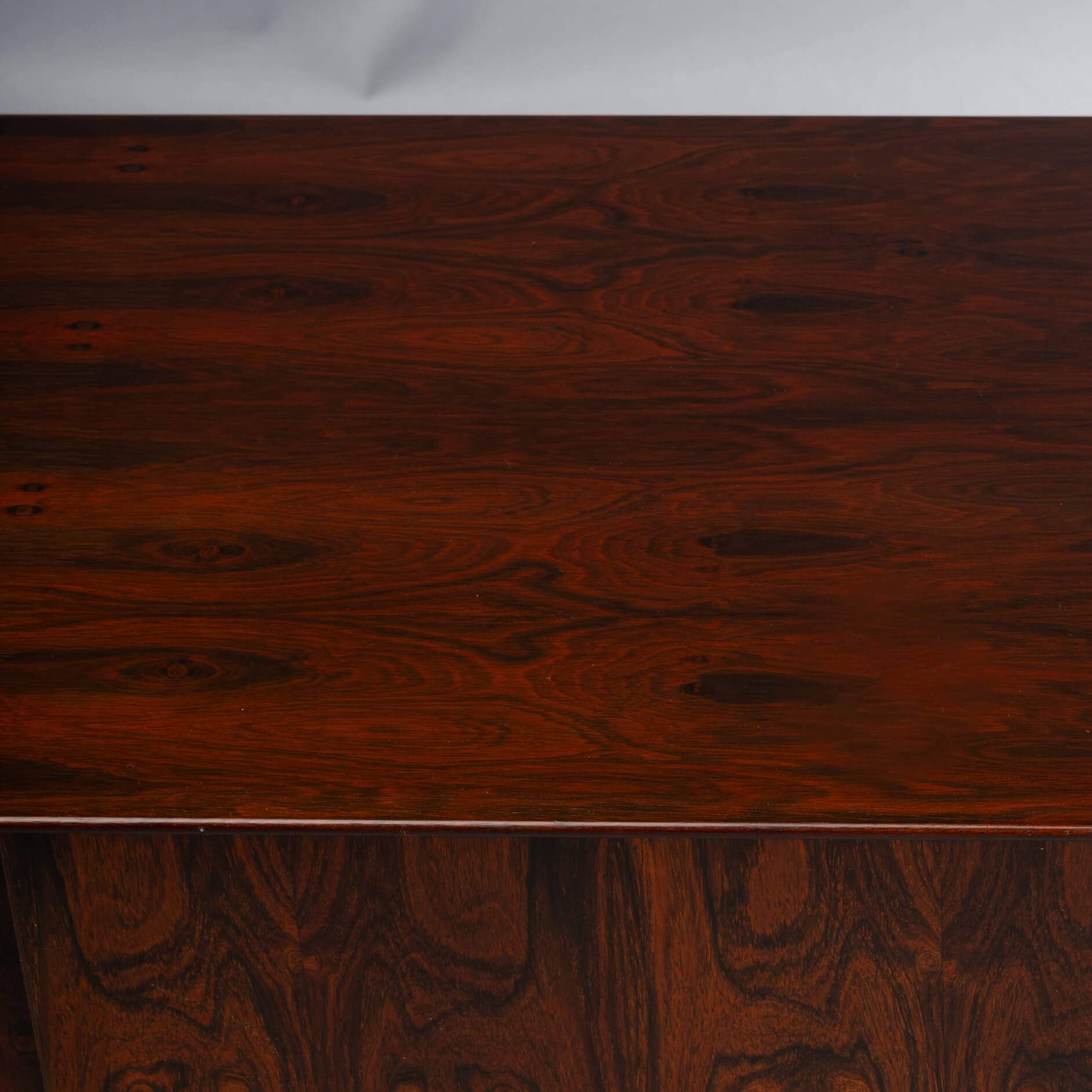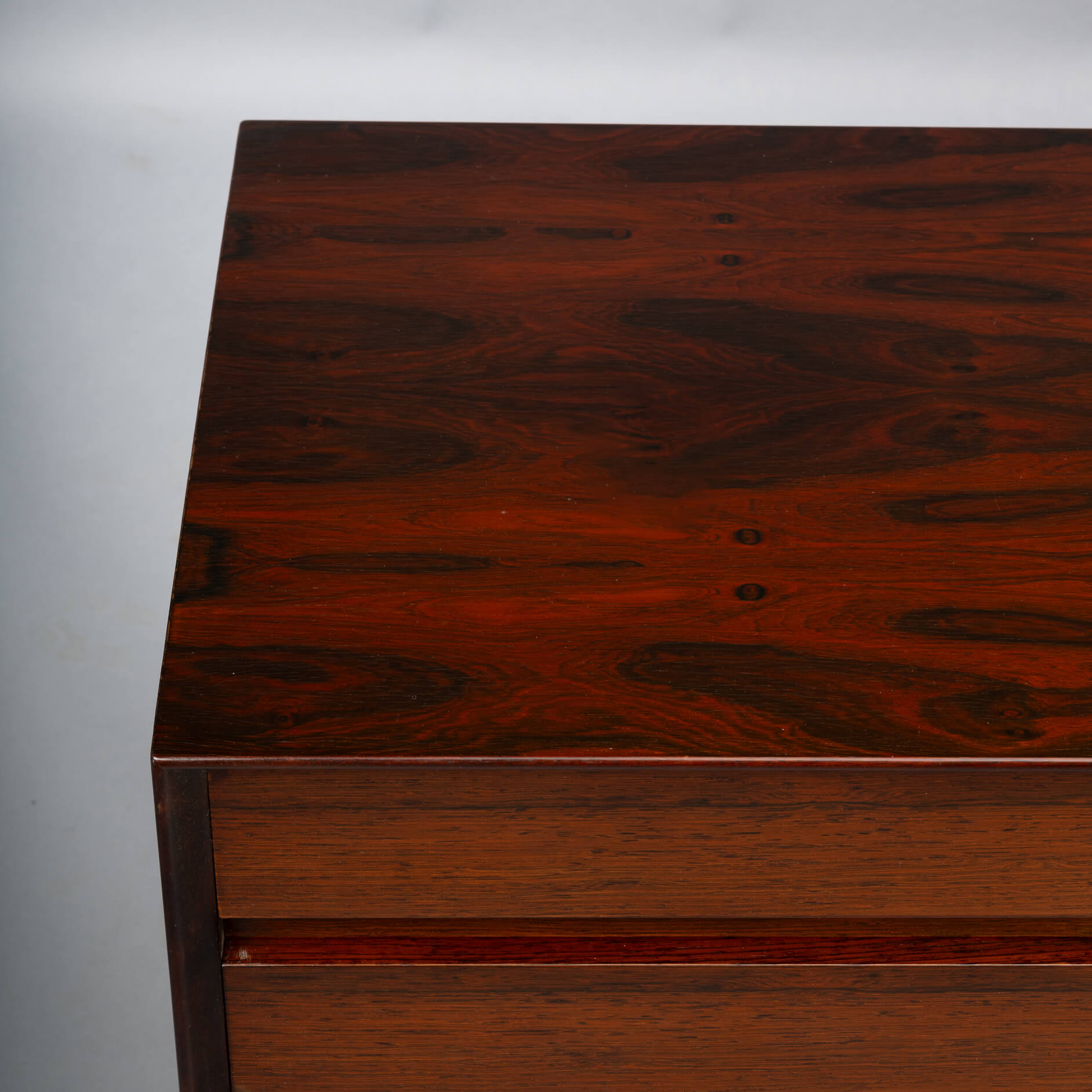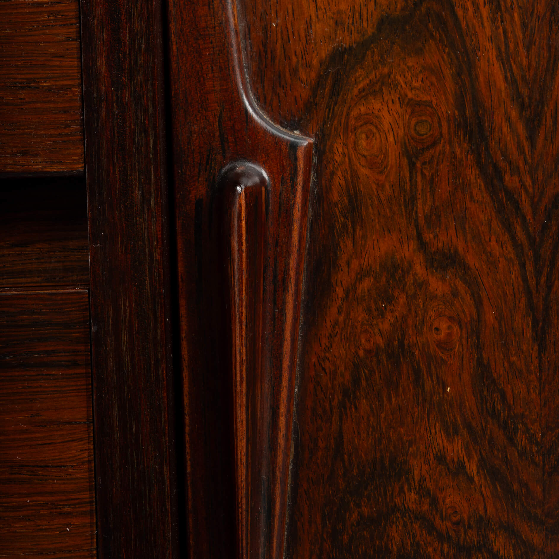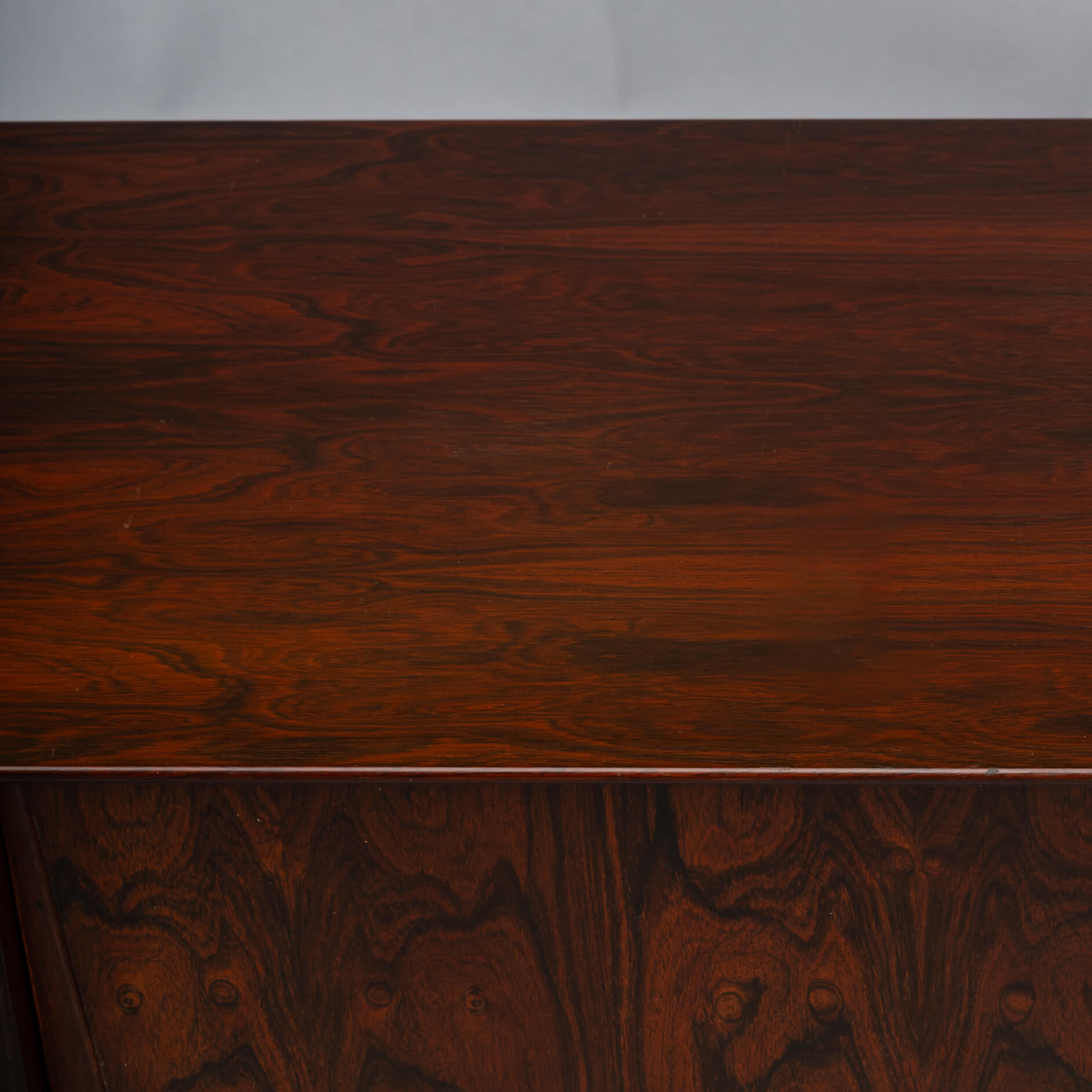 Superb level of quality and use of high end materials on top of its design make it a full pull. Doors accented by beautifully hand-sculpted rosewood handles, slide open to reveal an adjustable shelve. A bank of four drawers provide for enough additional storage. This sideboard is in very good vintage condition with minimal signs of use and age.