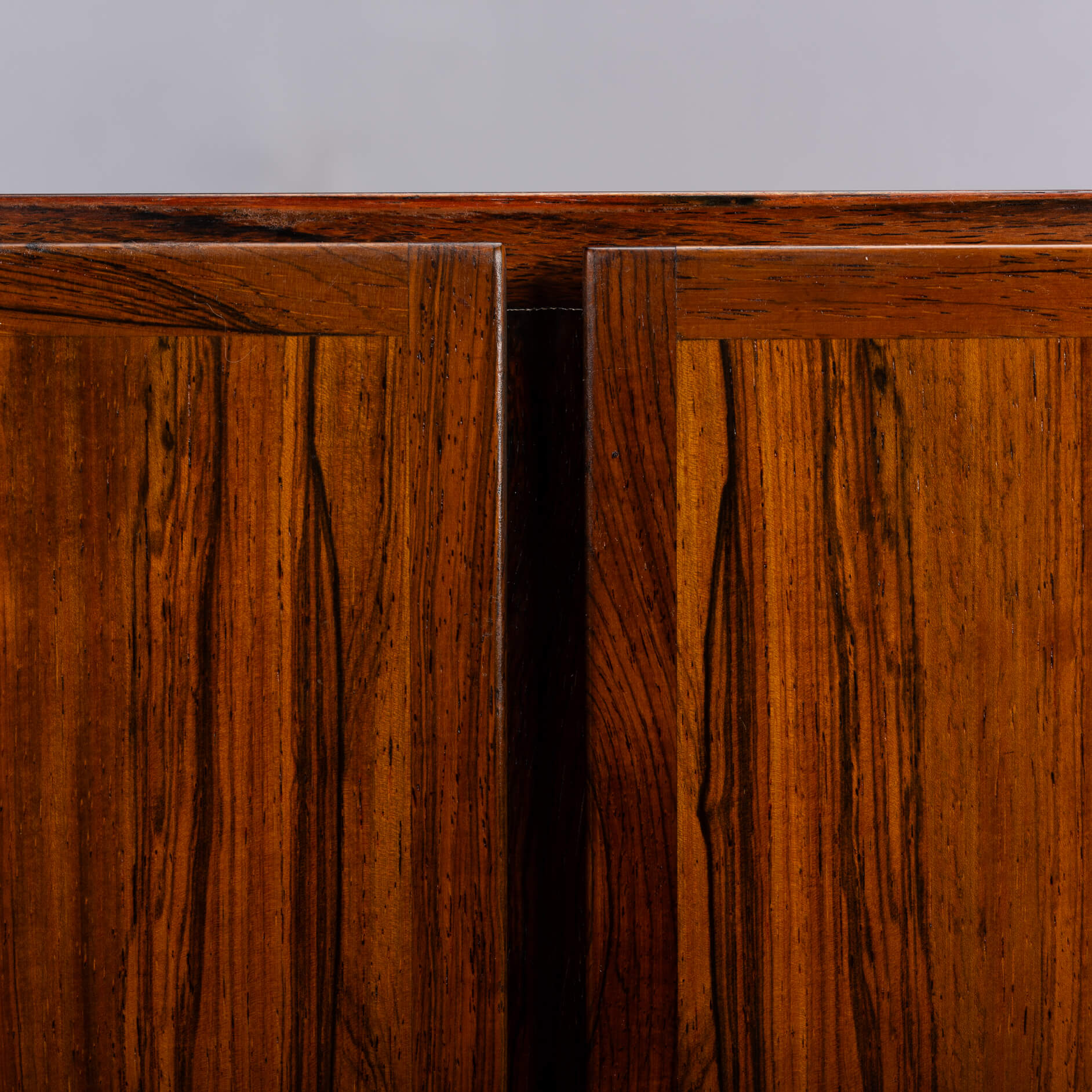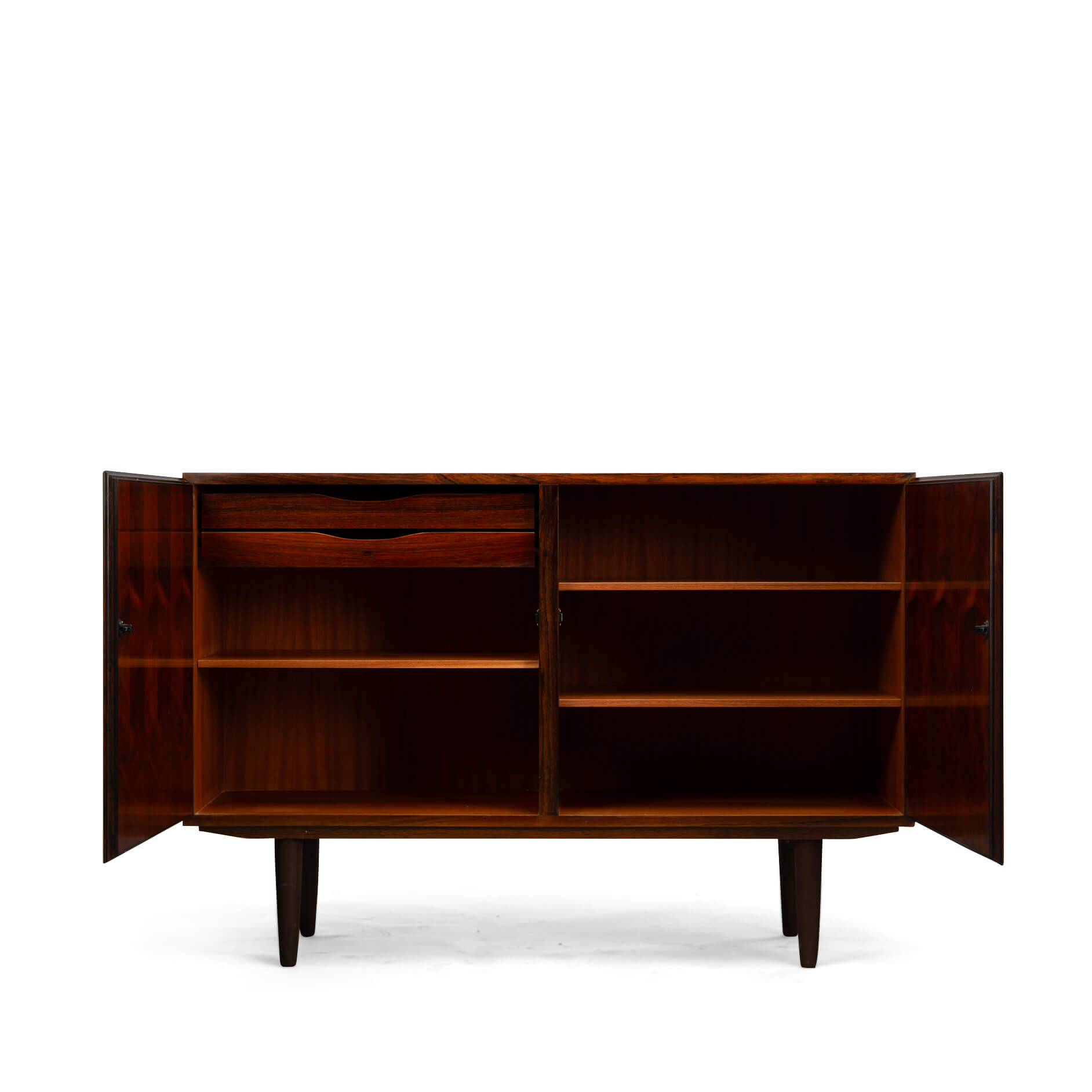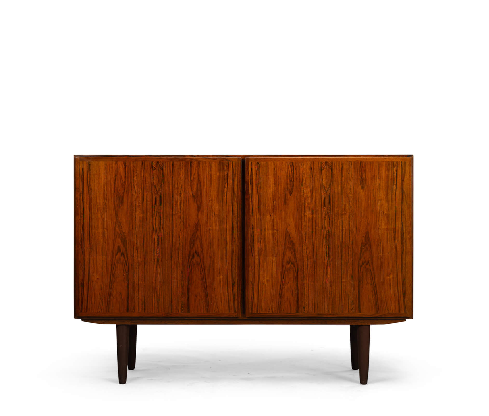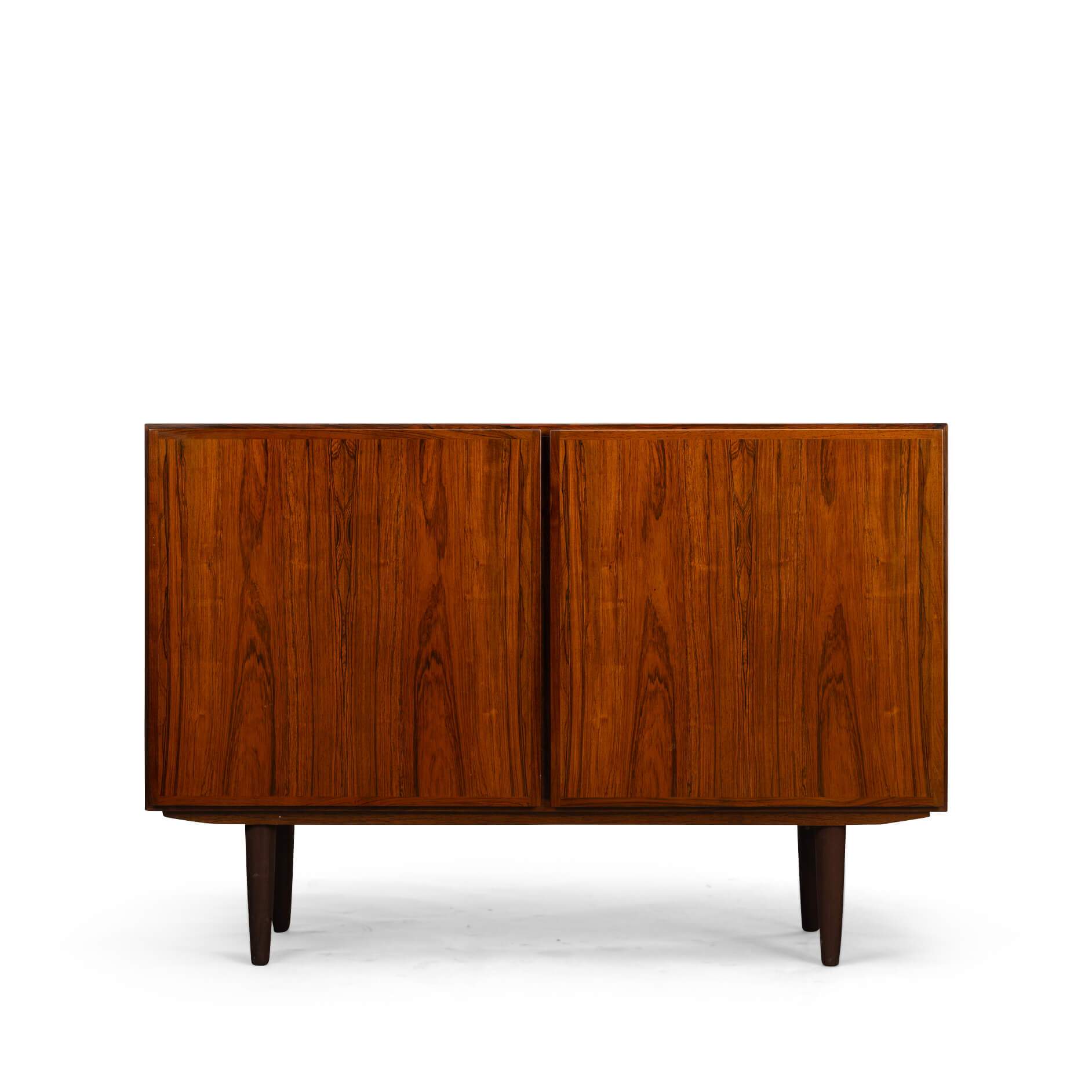 A timeless piece, this palissander model #4 credenza designed by Gunni Omann for Omann Jun Møbelfabrik. Superb level of quality and use of high end materials on top of its design make it a full pull. The doors open to reveal an adjustable shelve.