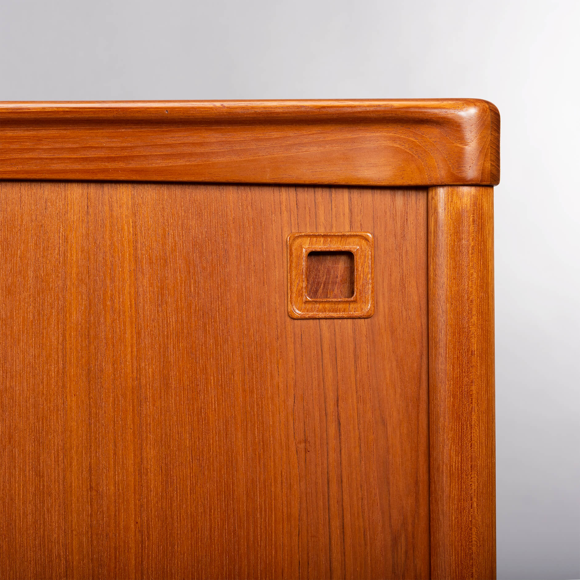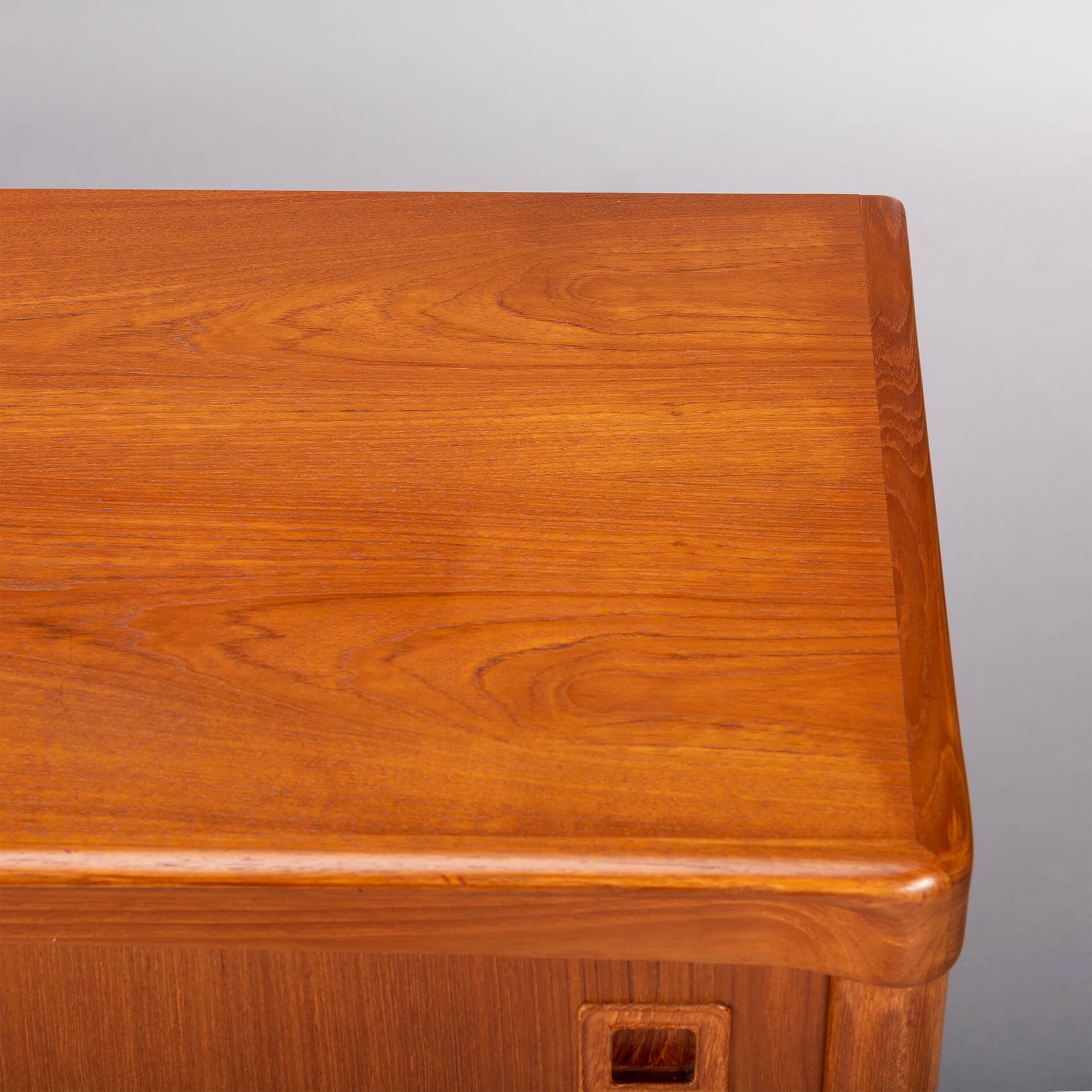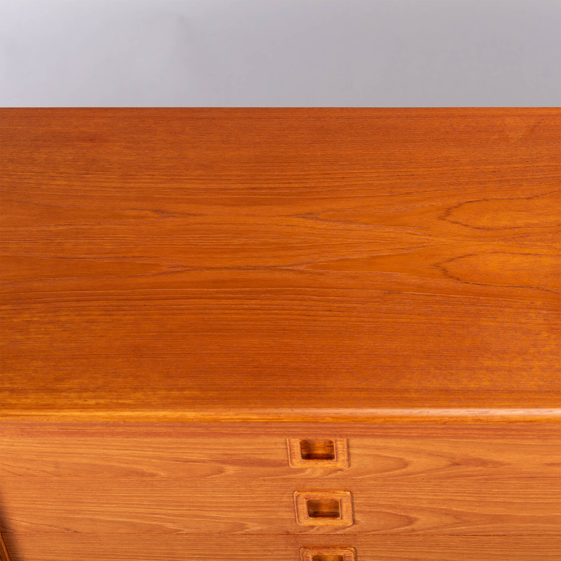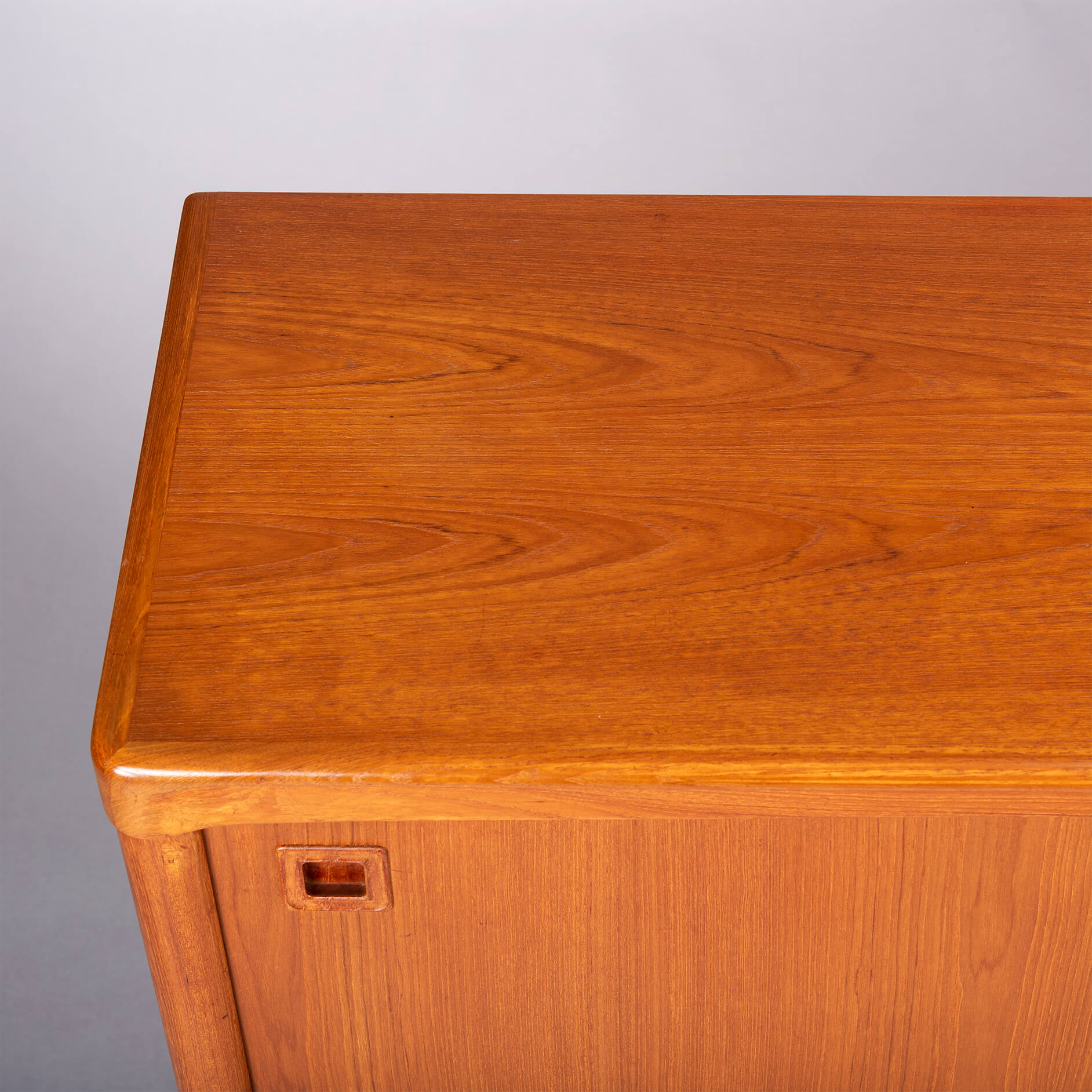 This credenza has many rounded and curved bezels that make you move your eye from detail to detail. The contradiction between curved bezels and square grips is telling for Klein's ideas behind this design. All of this in a wonderful vintage condition, we would know what to do.. ;-)