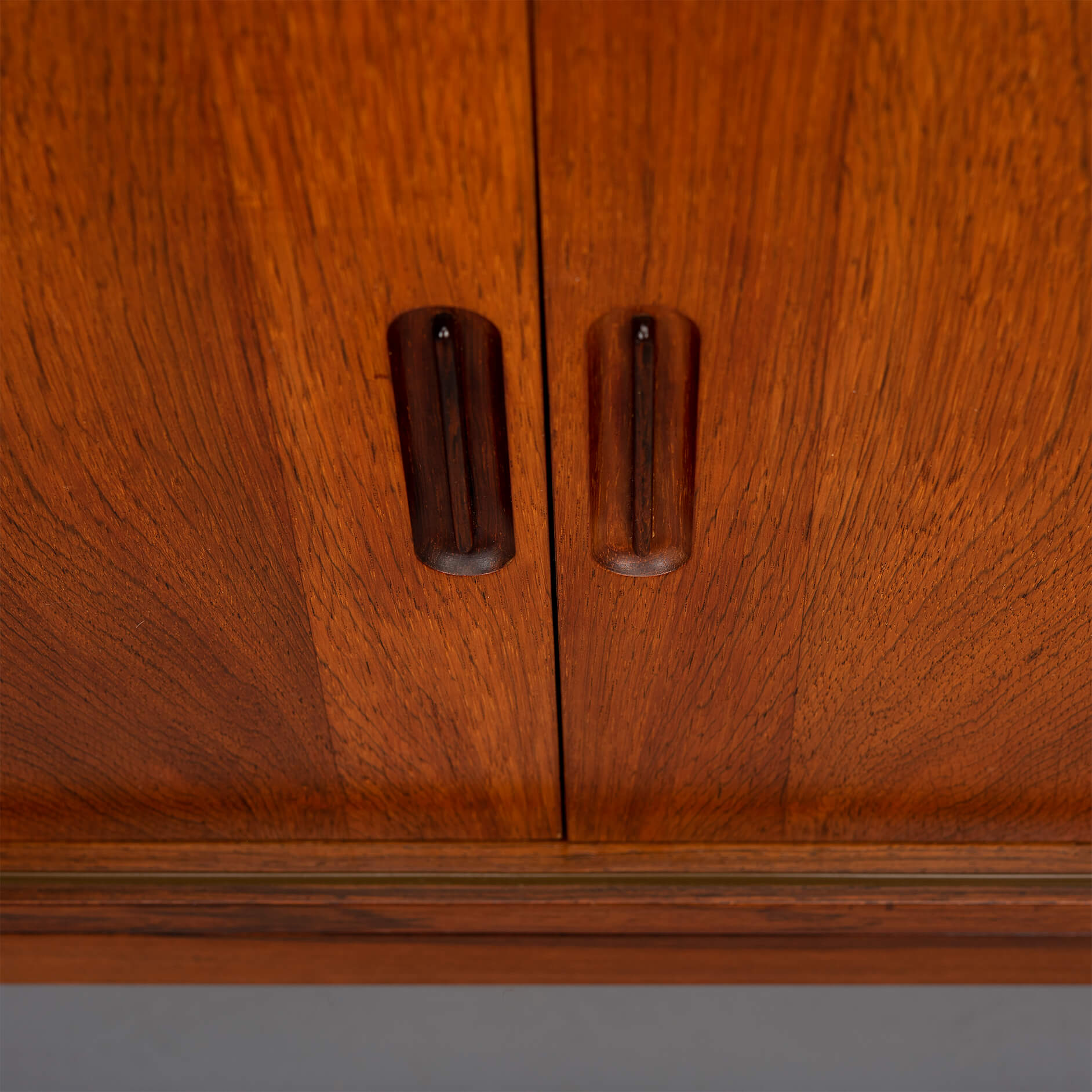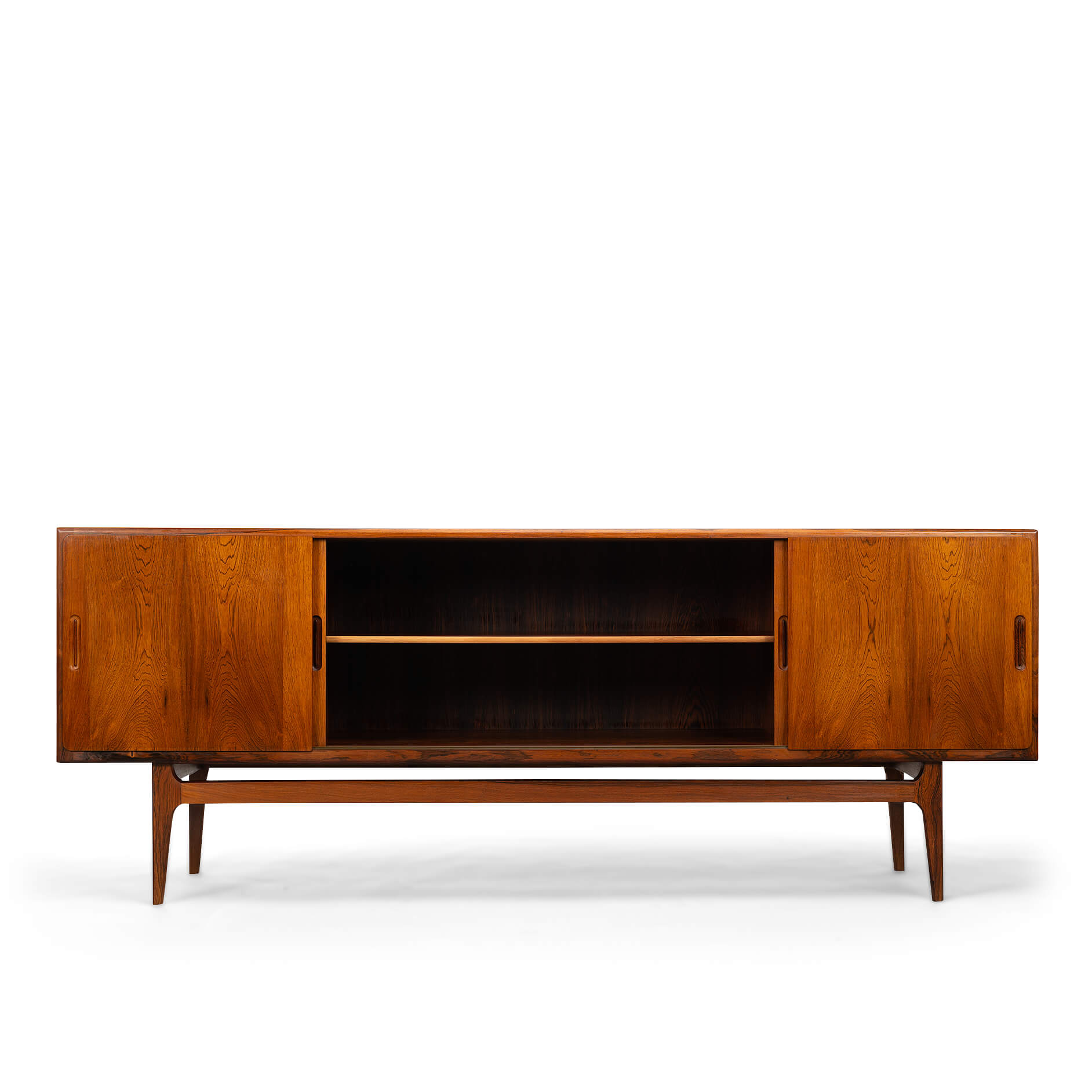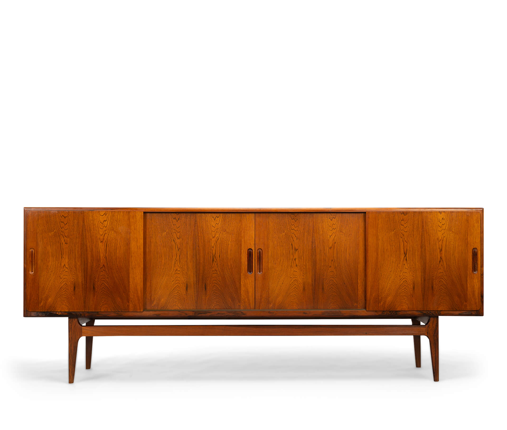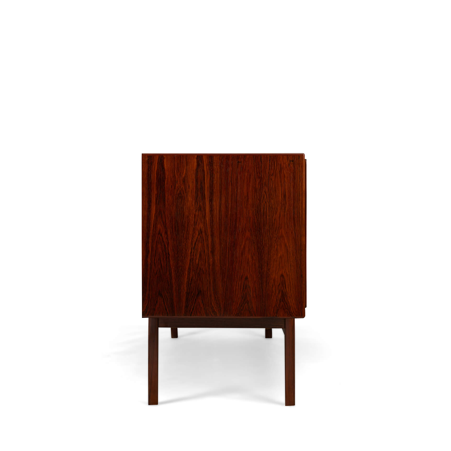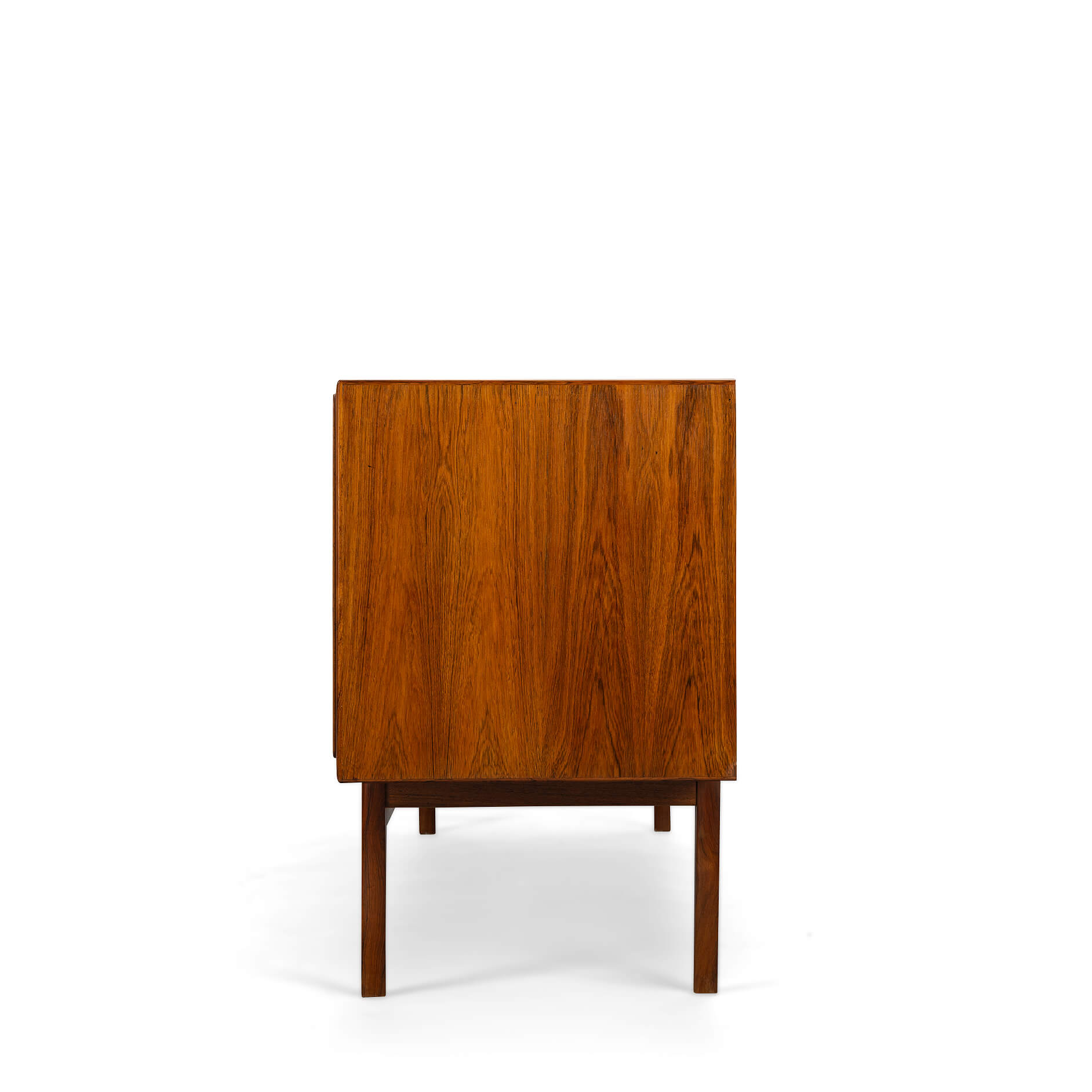 Sleek mid-century modern design! The cabinet has a beautiful subtle drawing of the rosewood or rosewood veneer. It's what we call a low sideboard. The print is the same on all doors. We also see handles that subtly disappear. Unfortunately we have not succeeded in linking this high-quality credenza to a renowned designer. Because you would expect that, because everything about this sideboard is right. The materials used are of a high standard and even the inside of the cabinet is made of rosewood veneer. The base also hints at the higher furniture class. However, due to the lack of a studbook, the price is also more favorable. This sideboard is in very good vintage condition. Only some scratches that actually largely disappear in the rosewood drawing on the top.