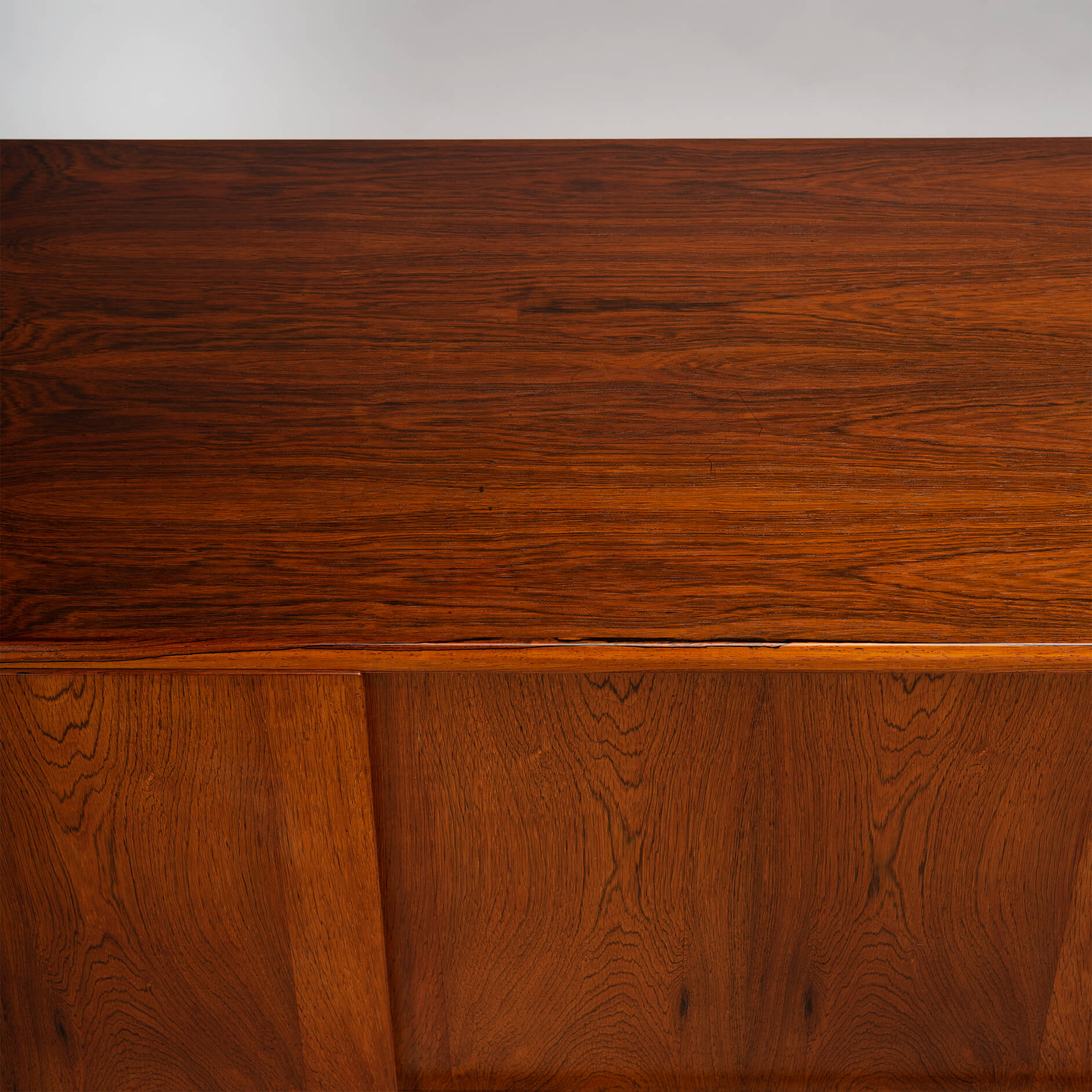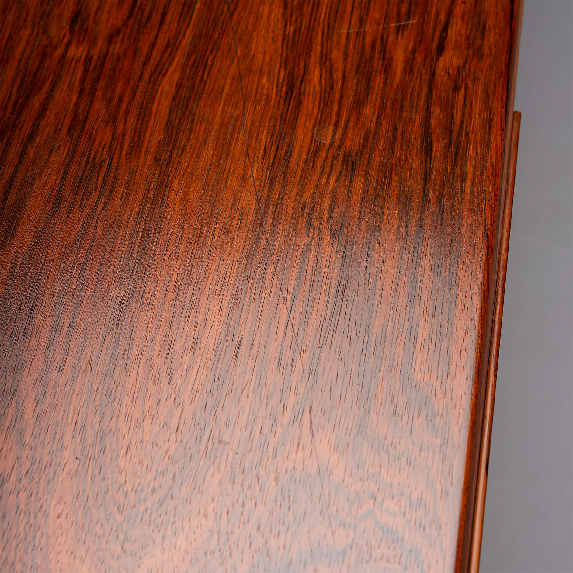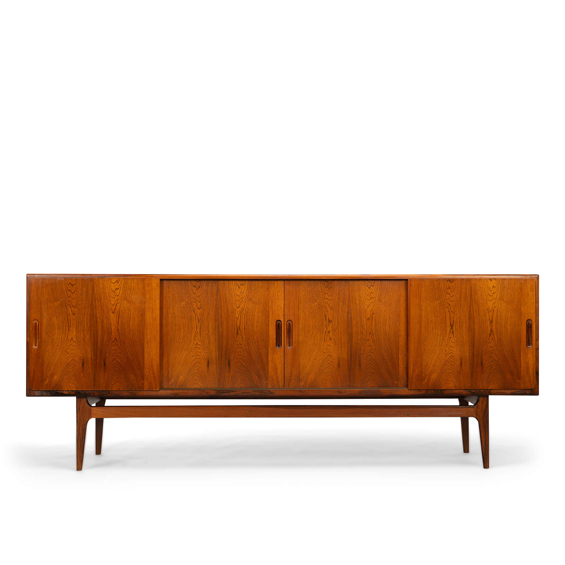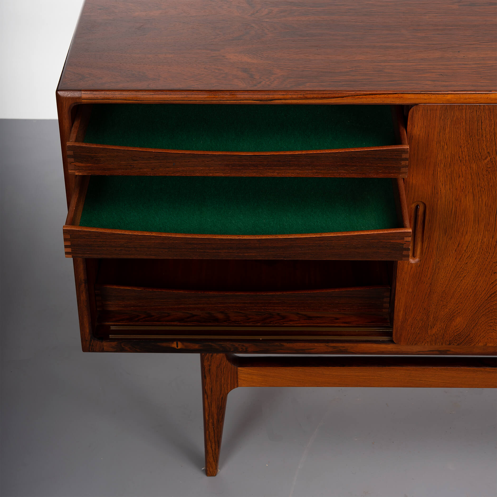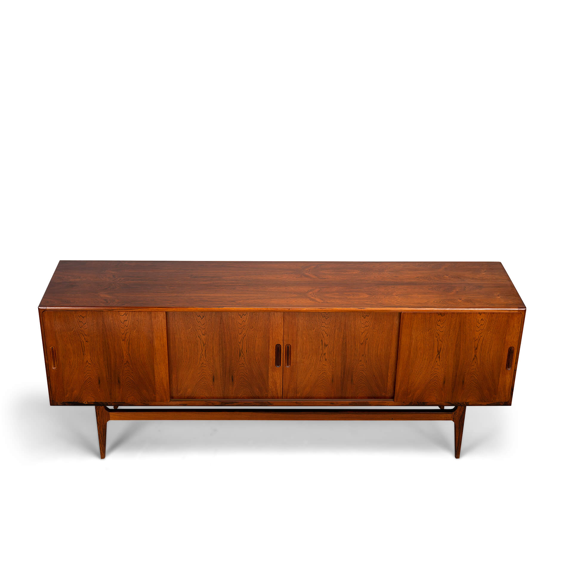 Sleek mid-century modern design! The cabinet has a beautiful subtle drawing of the rosewood or rosewood veneer. It's what we call a low sideboard. The print is the same on all doors. We also see handles that subtly disappear. Unfortunately we have not succeeded in linking this high-quality credenza to a renowned designer. Because you would expect that, because everything about this sideboard is right. The materials used are of a high standard and even the inside of the cabinet is made of rosewood veneer. The base also hints at the higher furniture class. However, due to the lack of a studbook, the price is also more favorable. This sideboard is in very good vintage condition. Only some scratches that actually largely disappear in the rosewood drawing on the top.