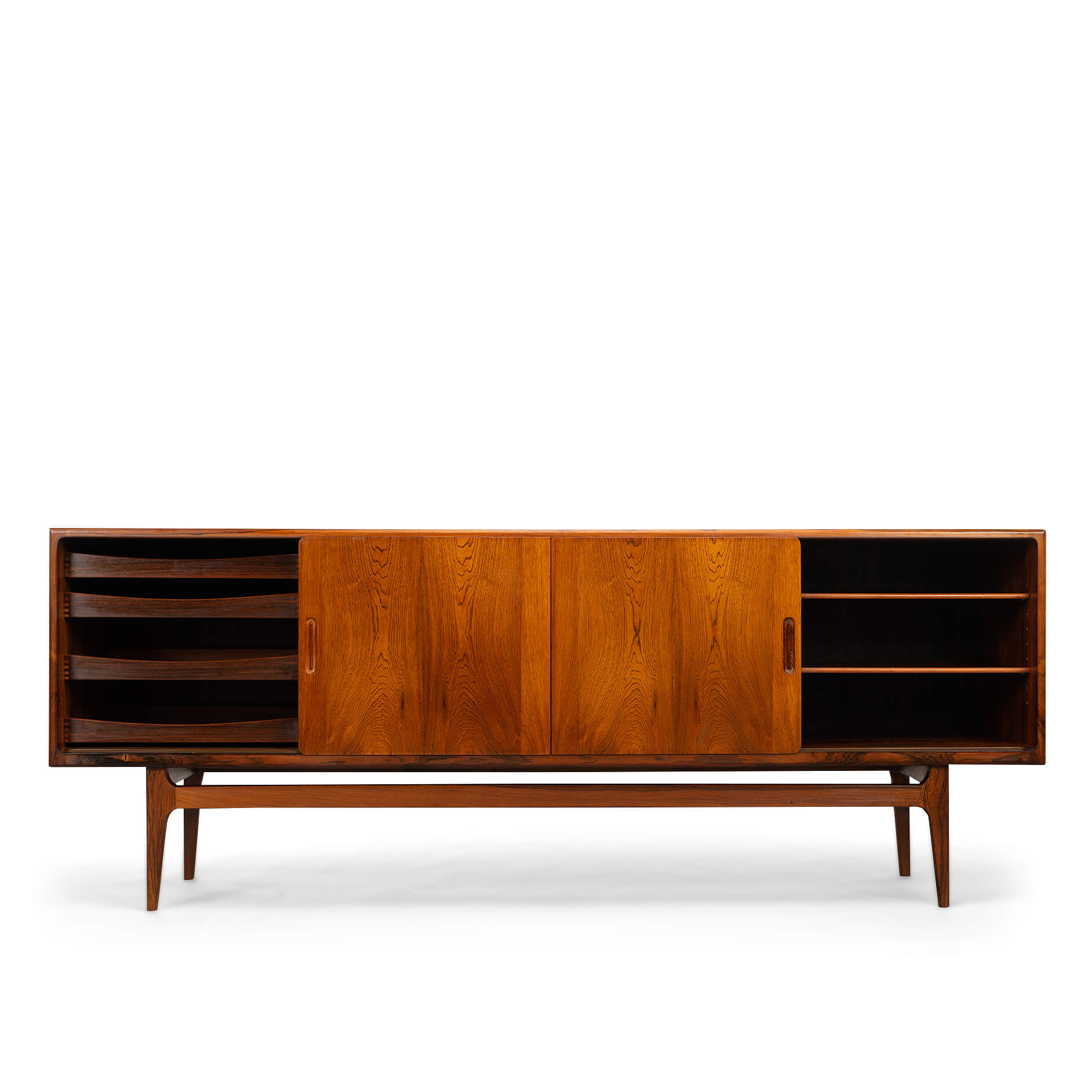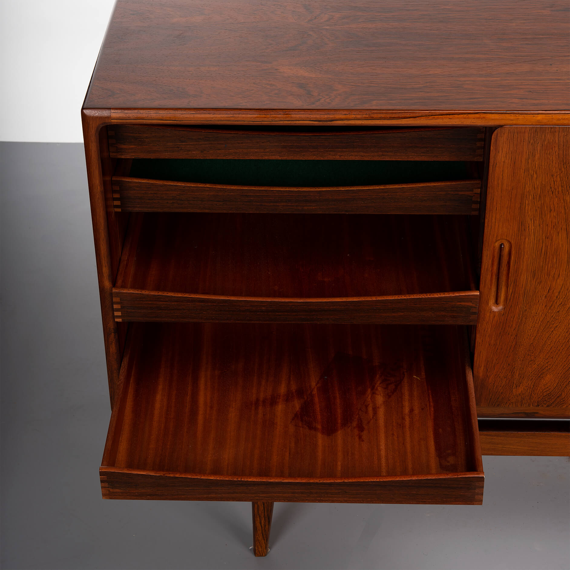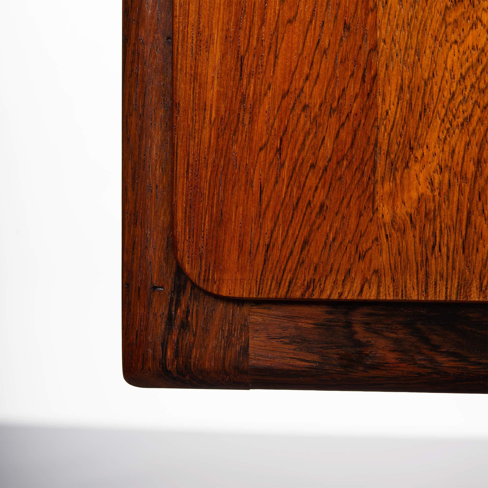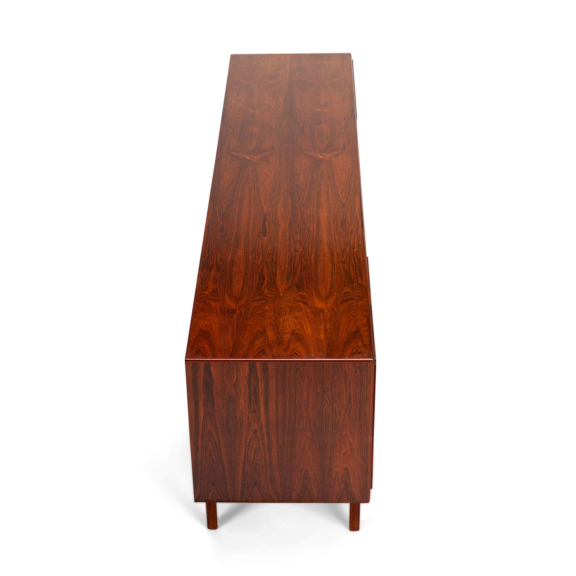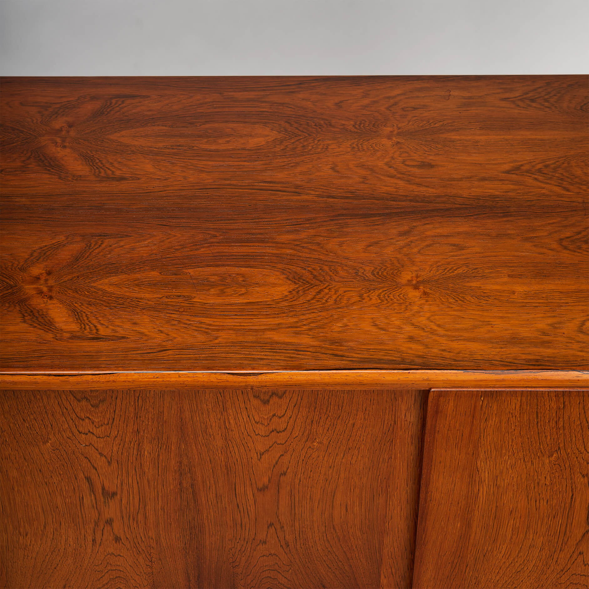 Sleek mid-century modern design! The cabinet has a beautiful subtle drawing of the rosewood or rosewood veneer. It's what we call a low sideboard. The print is the same on all doors. We also see handles that subtly disappear. Unfortunately we have not succeeded in linking this high-quality credenza to a renowned designer. Because you would expect that, because everything about this sideboard is right. The materials used are of a high standard and even the inside of the cabinet is made of rosewood veneer. The base also hints at the higher furniture class. However, due to the lack of a studbook, the price is also more favorable. This sideboard is in very good vintage condition. Only some scratches that actually largely disappear in the rosewood drawing on the top.