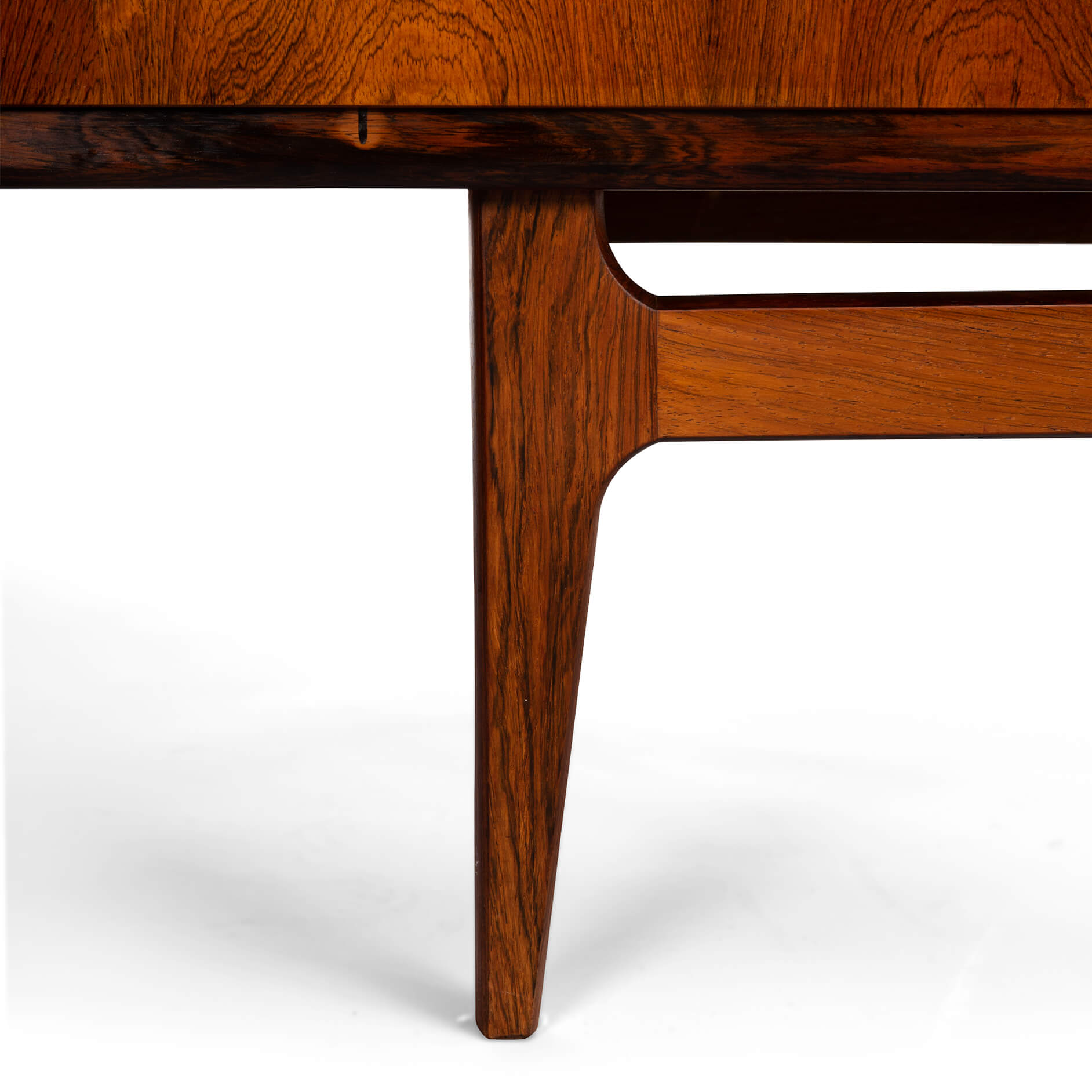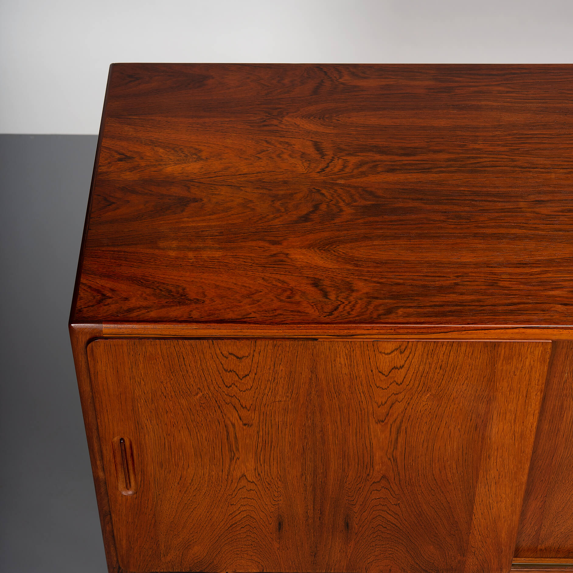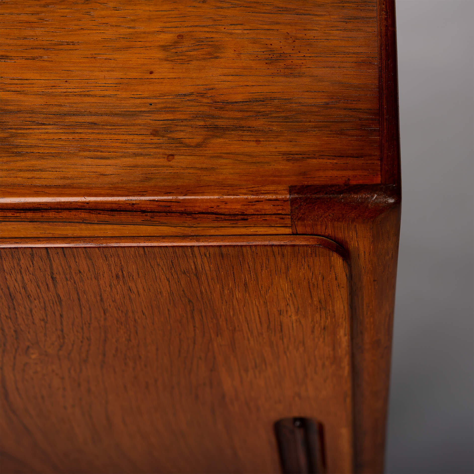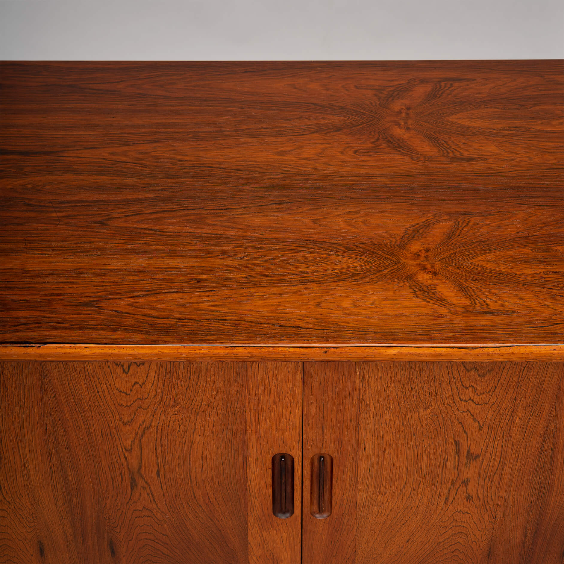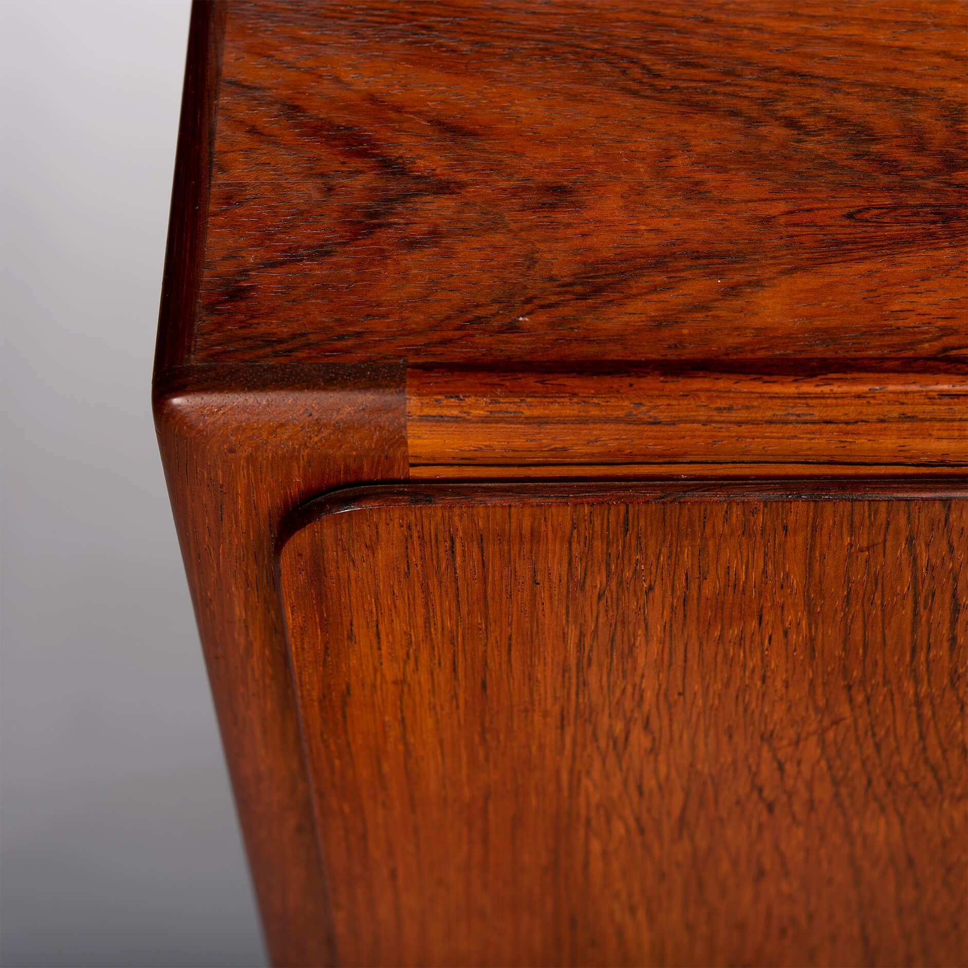Sleek mid-century modern design! The cabinet has a beautiful subtle drawing of the rosewood or rosewood veneer. It's what we call a low sideboard. The print is the same on all doors. We also see handles that subtly disappear. Unfortunately we have not succeeded in linking this high-quality credenza to a renowned designer. Because you would expect that, because everything about this sideboard is right. The materials used are of a high standard and even the inside of the cabinet is made of rosewood veneer. The base also hints at the higher furniture class. However, due to the lack of a studbook, the price is also more favorable. This sideboard is in very good vintage condition. Only some scratches that actually largely disappear in the rosewood drawing on the top.