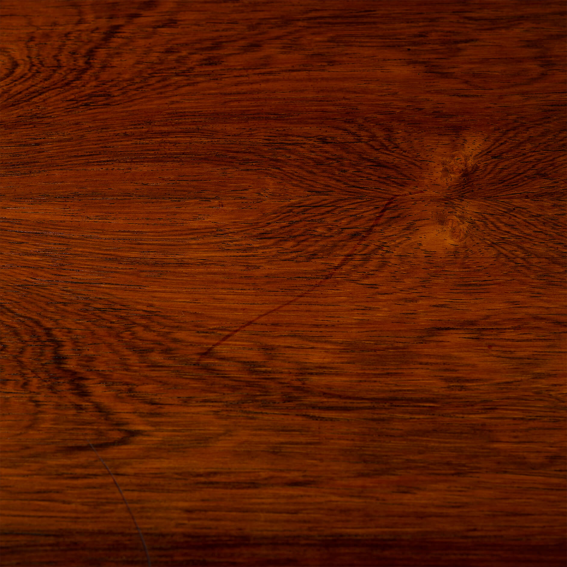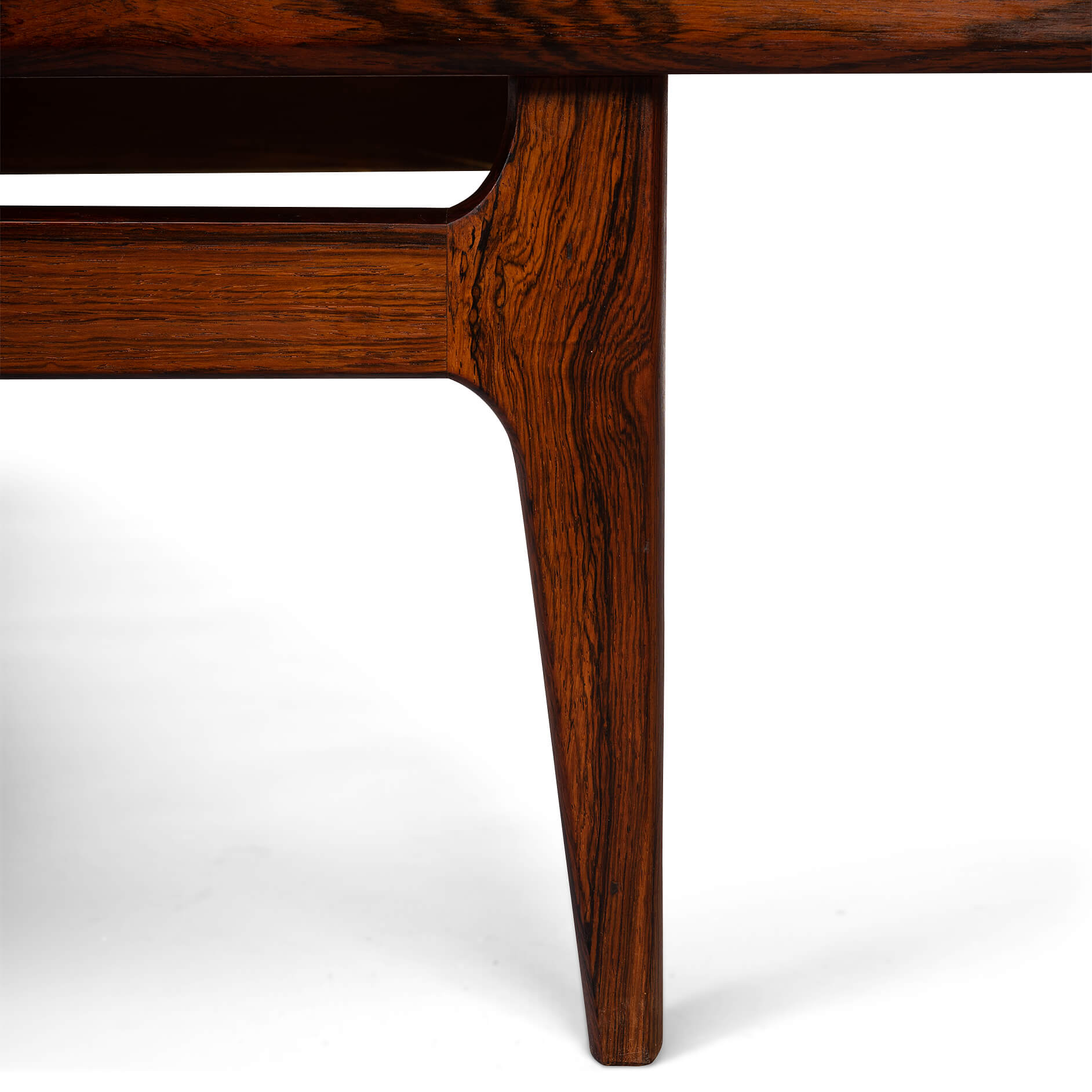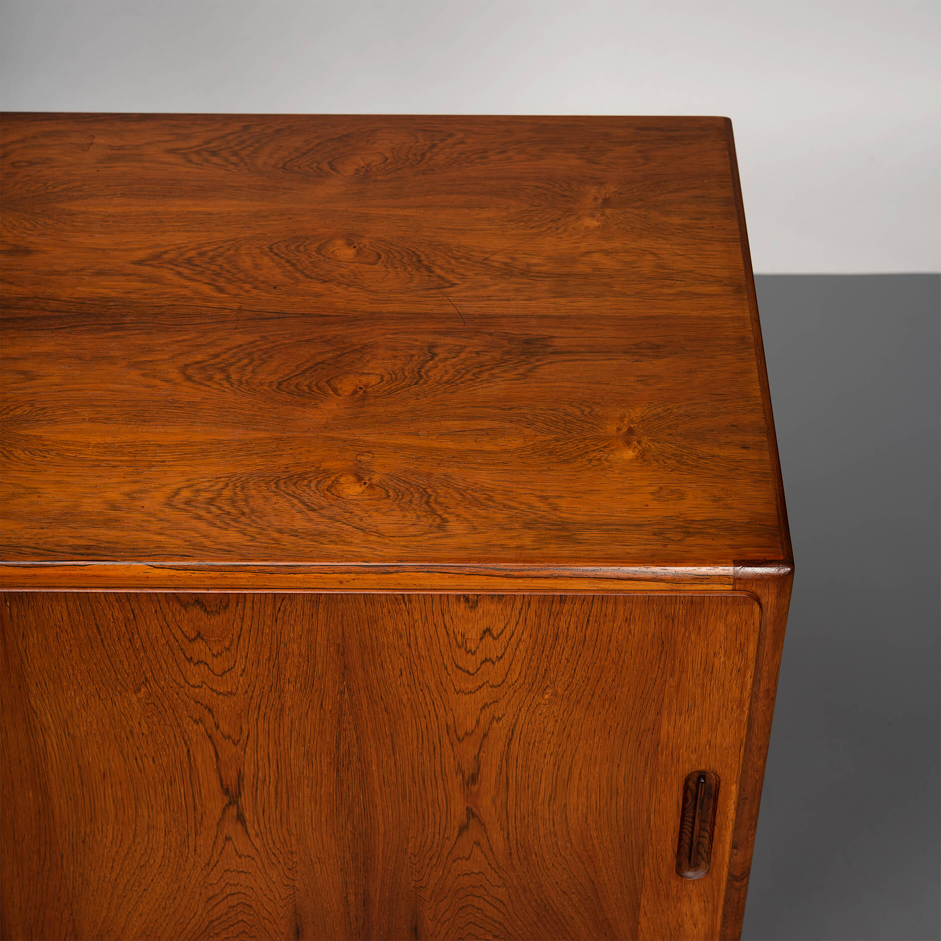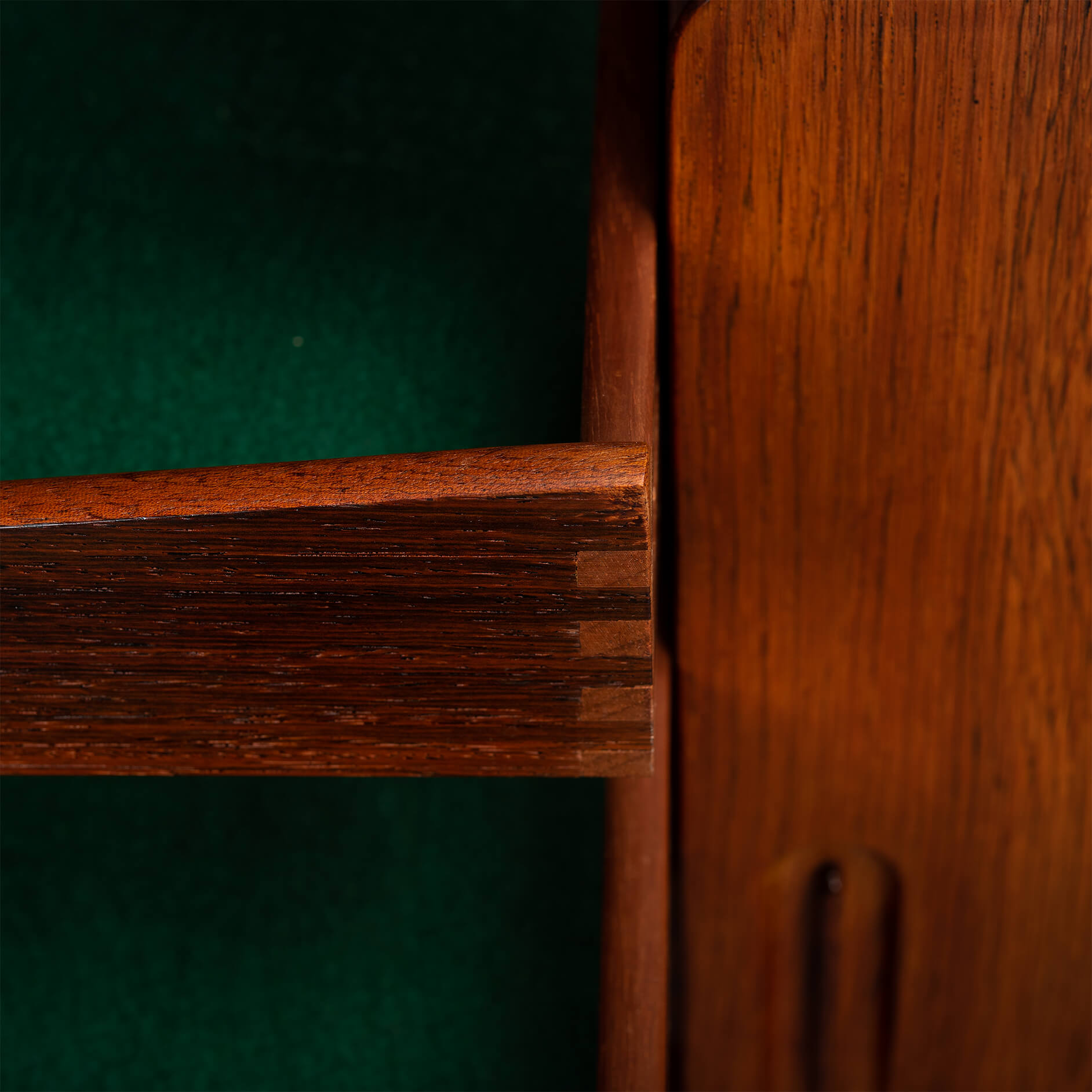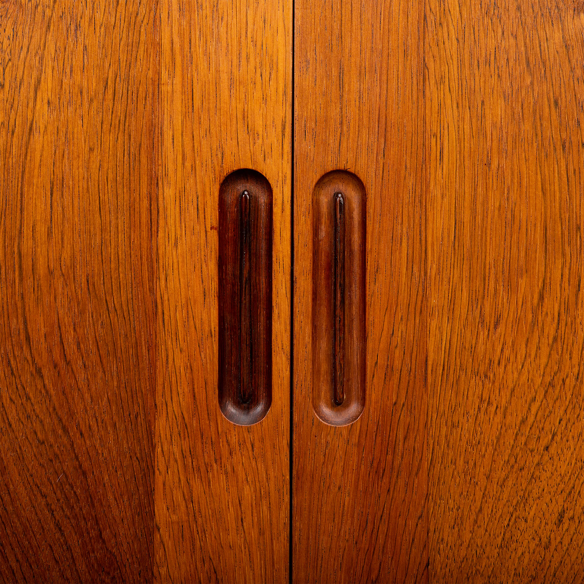 Sleek mid-century modern design! The cabinet has a beautiful subtle drawing of the rosewood or rosewood veneer. It's what we call a low sideboard. The print is the same on all doors. We also see handles that subtly disappear. Unfortunately we have not succeeded in linking this high-quality credenza to a renowned designer. Because you would expect that, because everything about this sideboard is right. The materials used are of a high standard and even the inside of the cabinet is made of rosewood veneer. The base also hints at the higher furniture class. However, due to the lack of a studbook, the price is also more favorable. This sideboard is in very good vintage condition. Only some scratches that actually largely disappear in the rosewood drawing on the top.