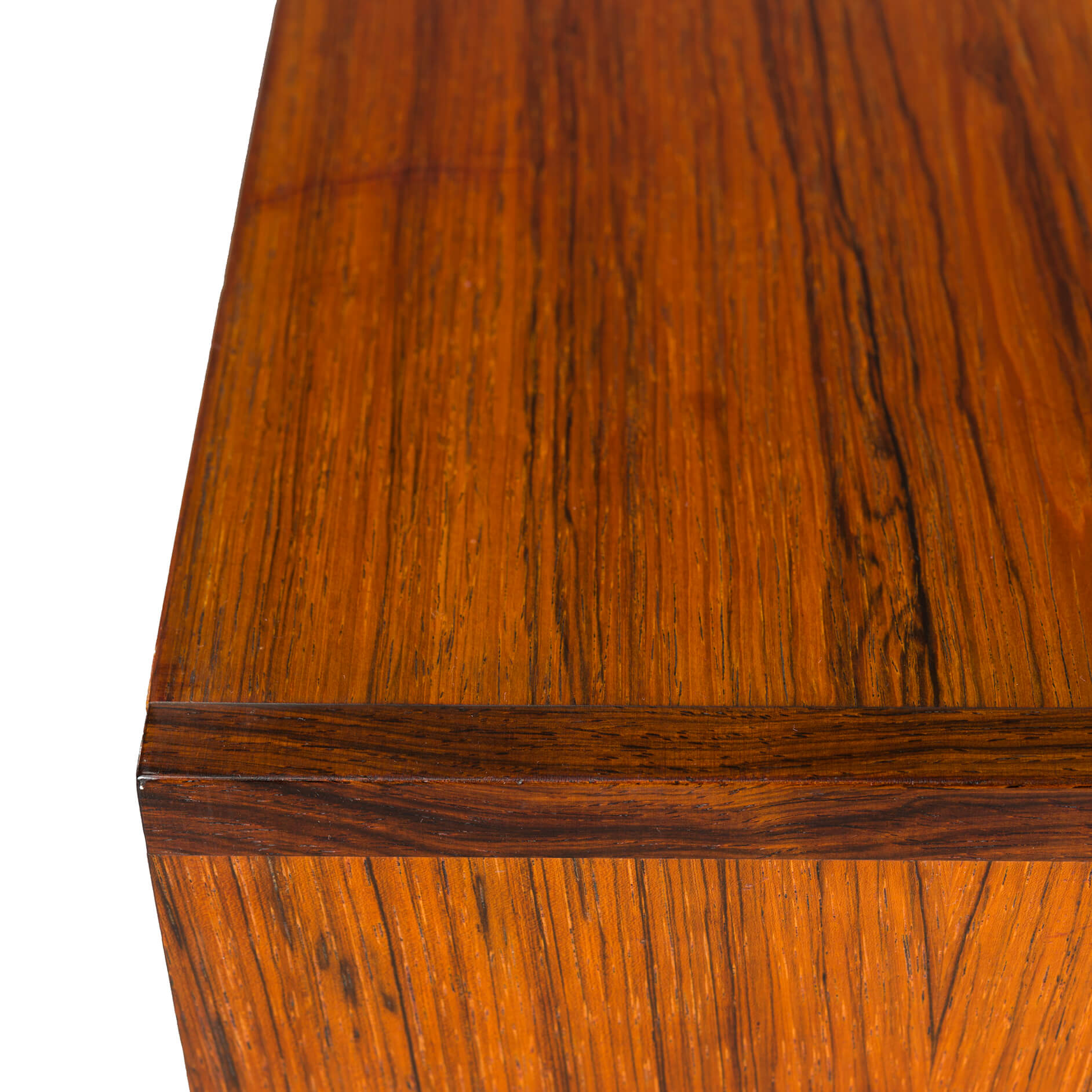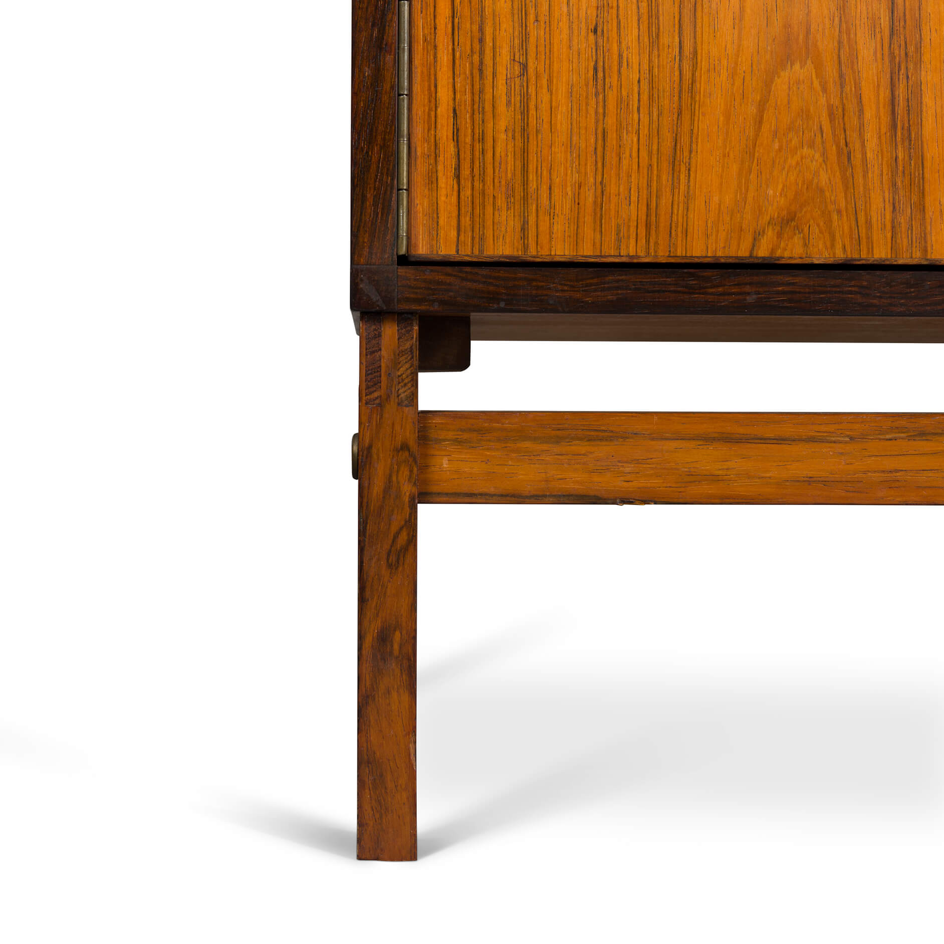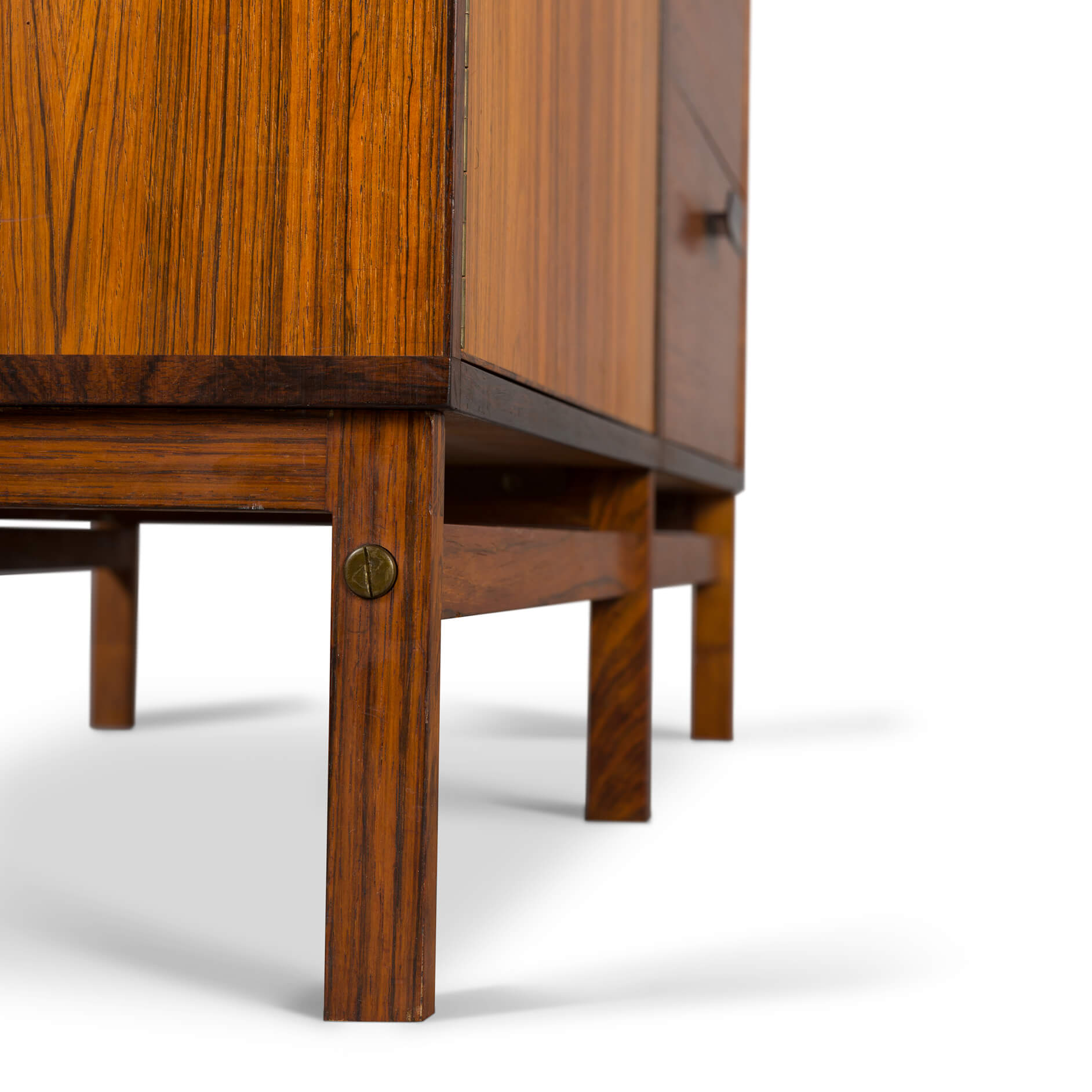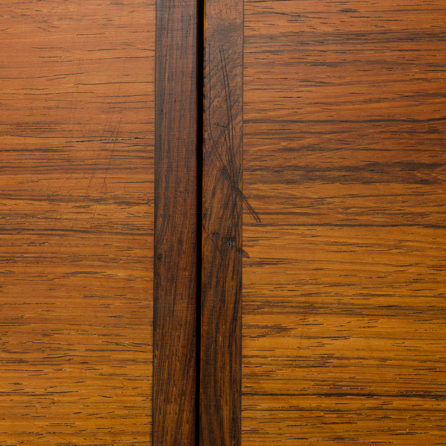 The solid rosewood base can be detached and has nice construction details. This sideboard would be a great addition to any modern interior. It is in good vintage condition. Though it has some scratches on the top. See detailed picture. But we think they give this sideboard character and a story! On the back of the cabinet the B&L stamp and a made in Denmark sign is clearly visible.