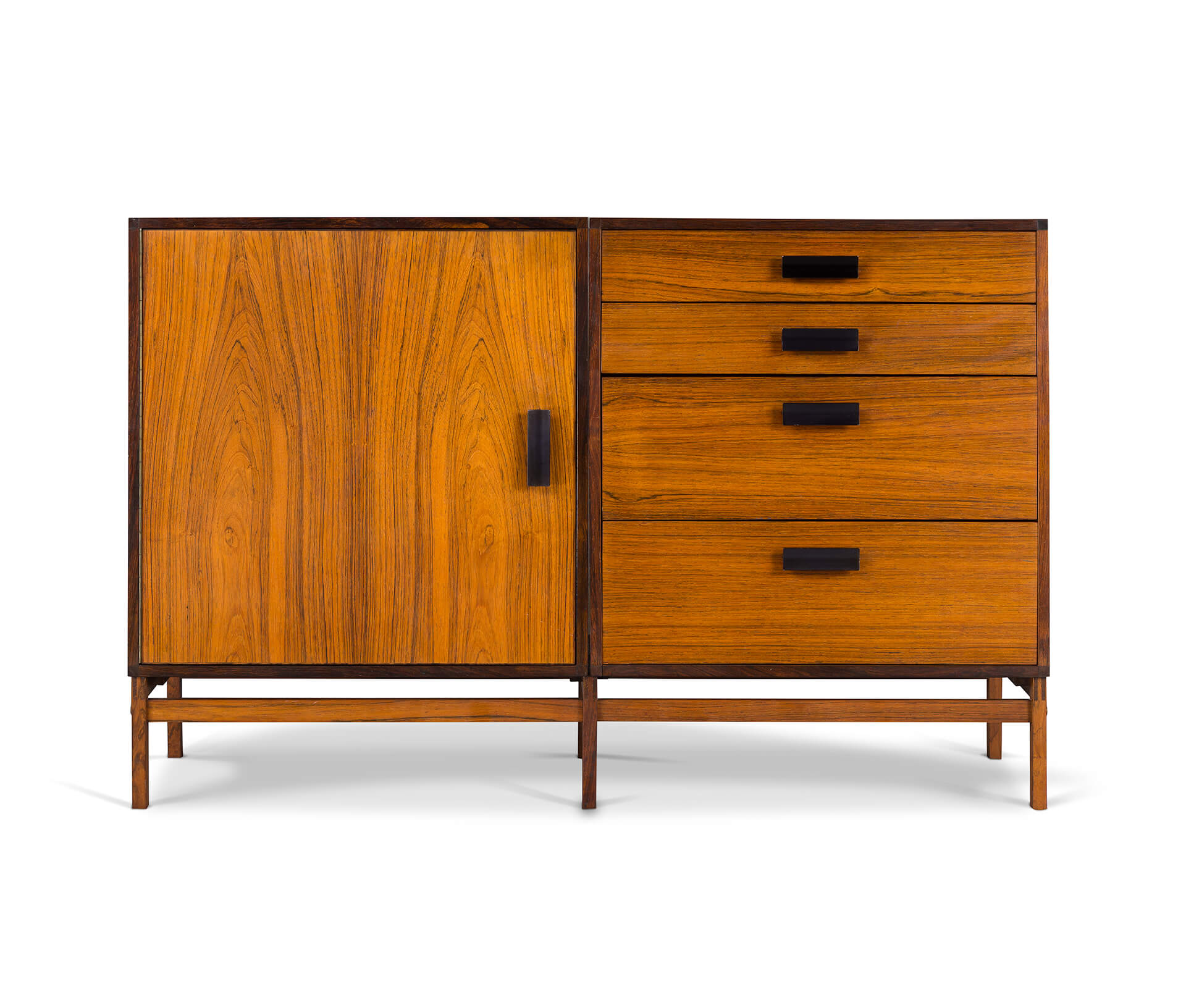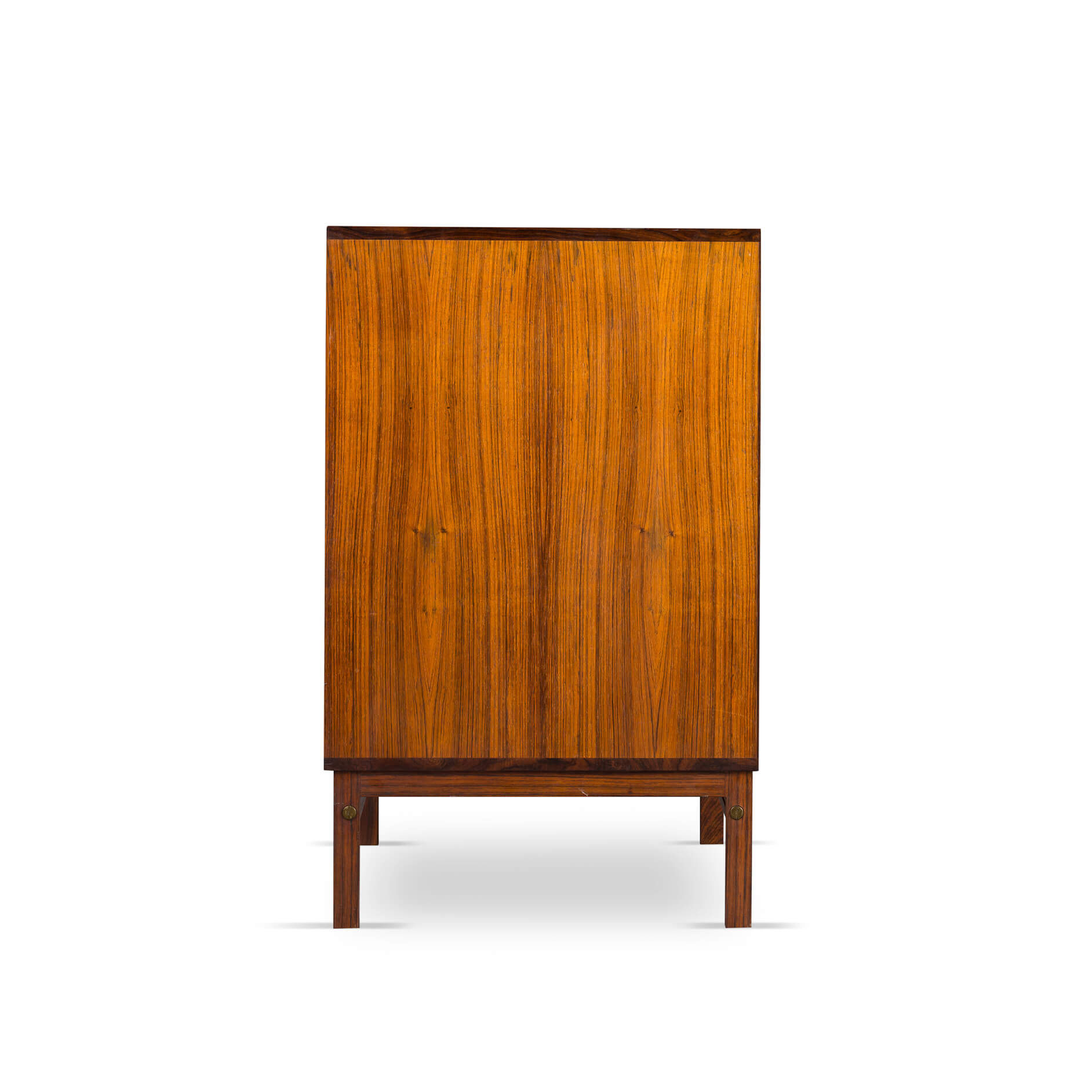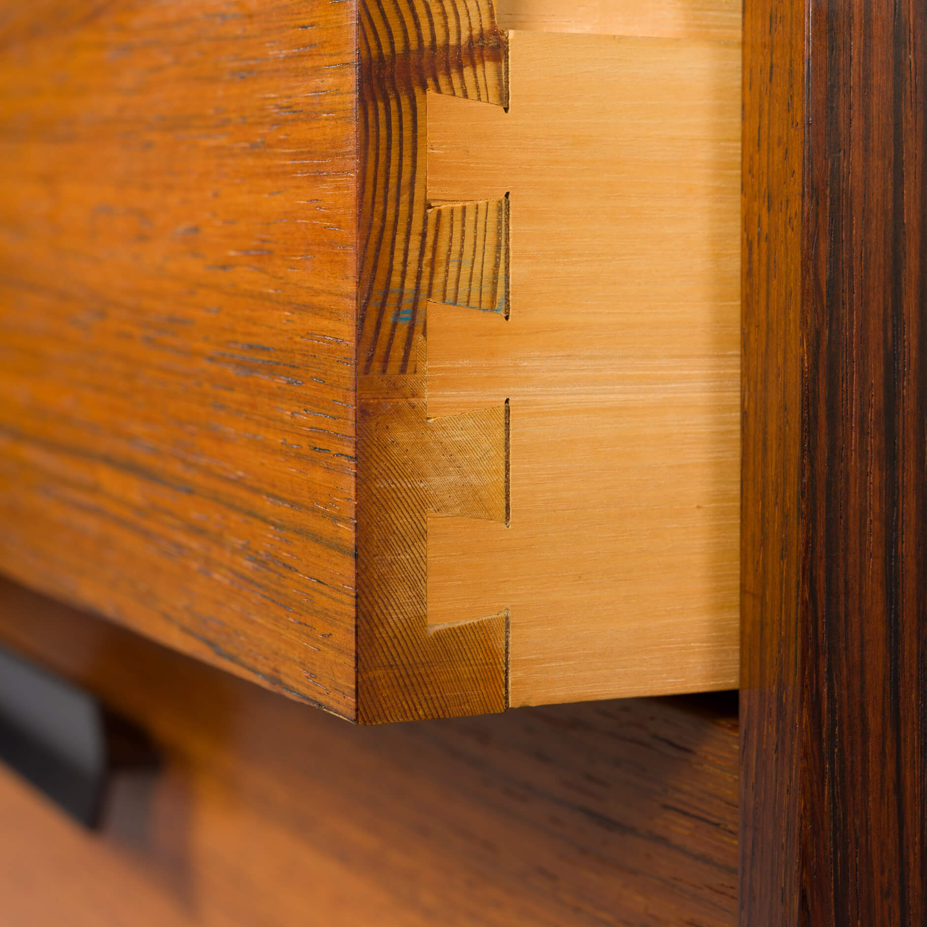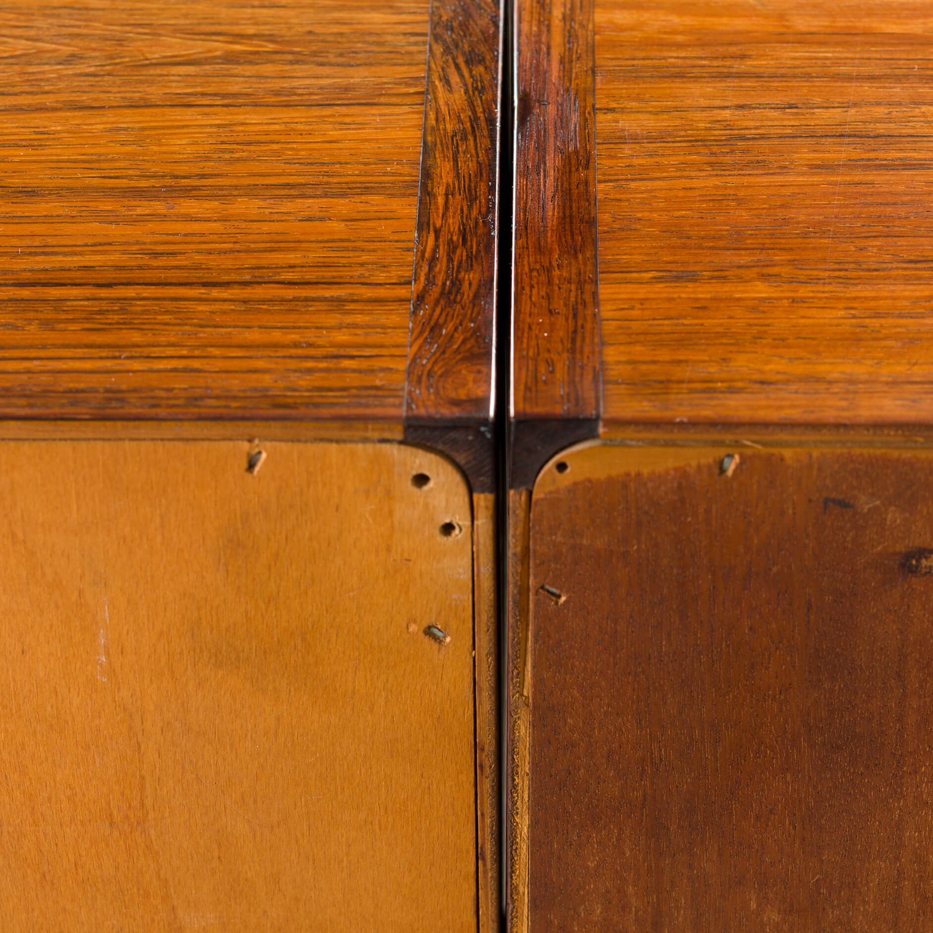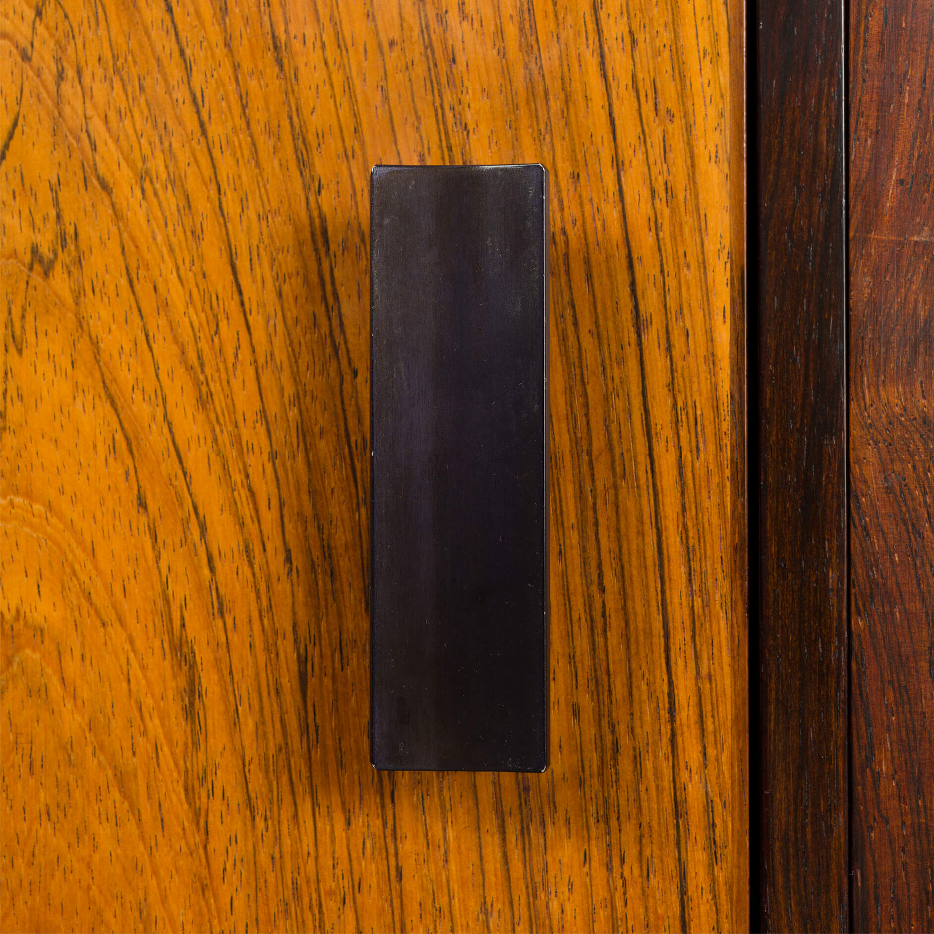 The solid rosewood base can be detached and has nice construction details. This sideboard would be a great addition to any modern interior. It is in good vintage condition. Though it has some scratches on the top. See detailed picture. But we think they give this sideboard character and a story! On the back of the cabinet the B&L stamp and a made in Denmark sign is clearly visible.