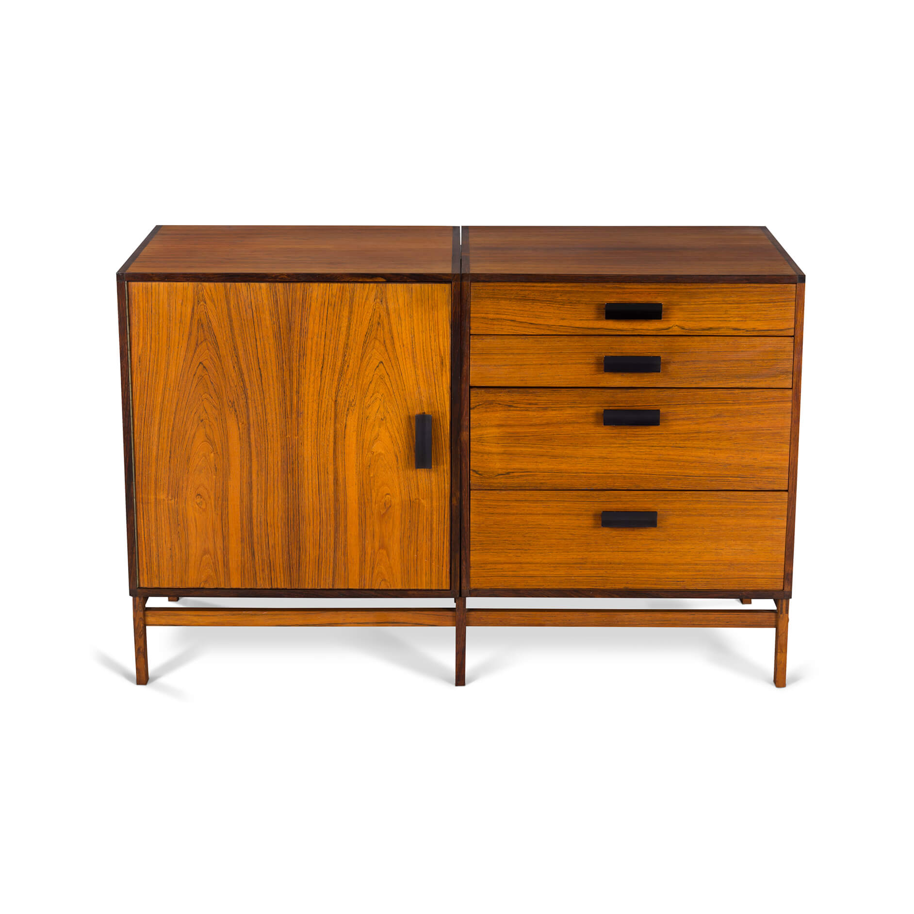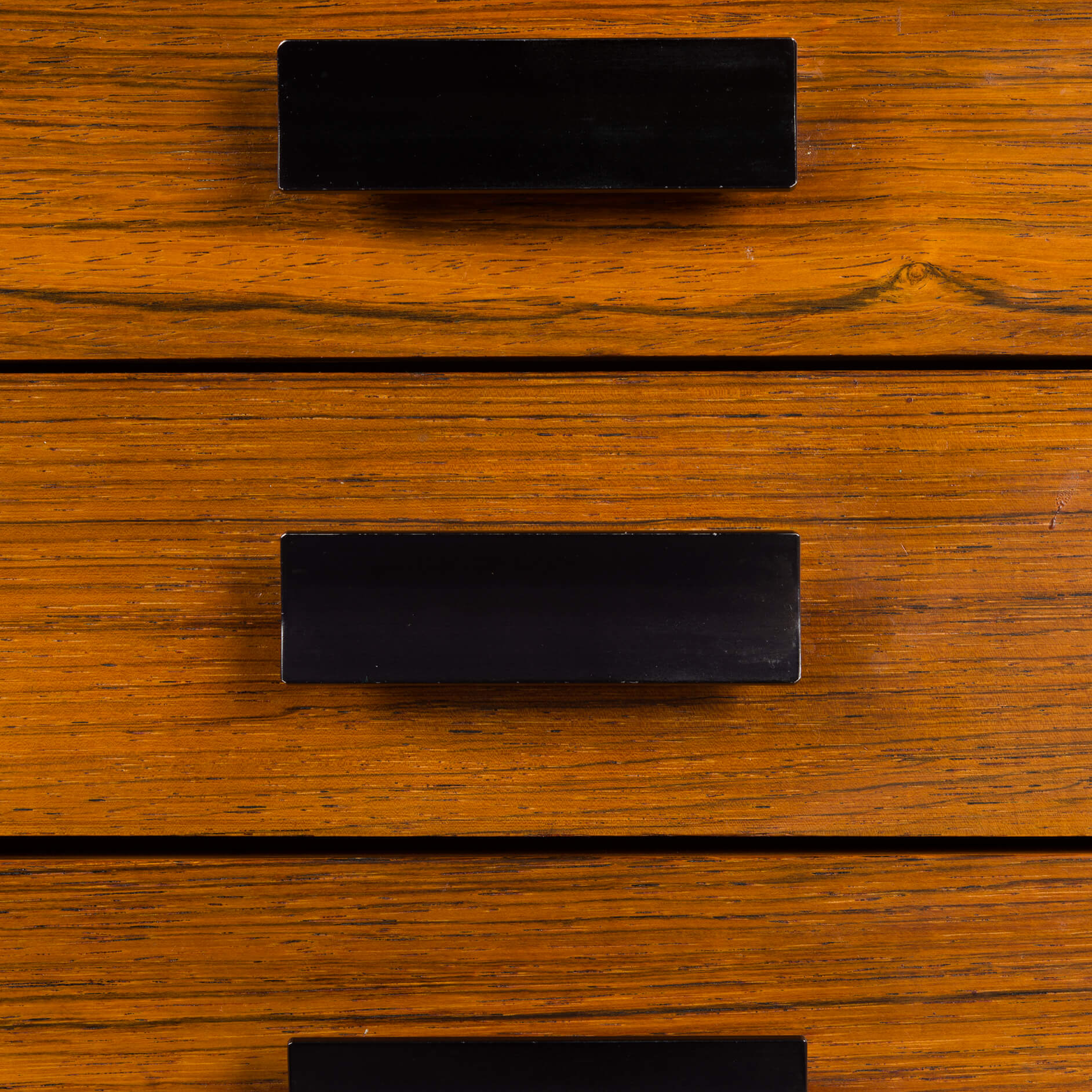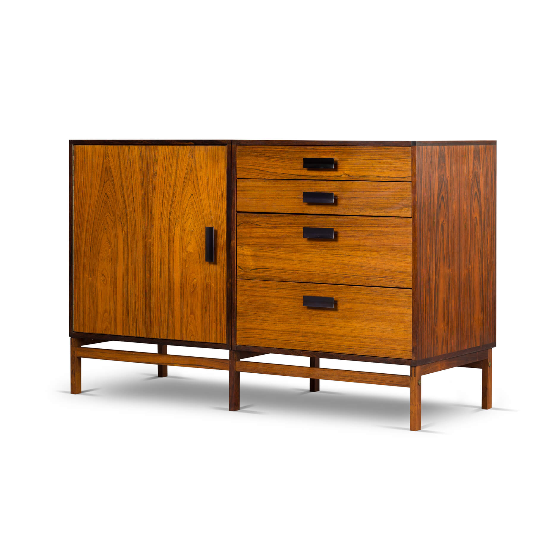 A fabulous rosewood credenza manufactured in Denmark by B&L. A calm rosewood pattern covers the entire exterior. Tons of storage resides behind the door in the form of two shelves and the other part has four drawers in two different sizes. The two top drawers have been finished with green felt. The green felt on both drawers has seen better days. All grips on drawers and door are made of coated aluminum and the screws that tie up the base are made out of bronze.