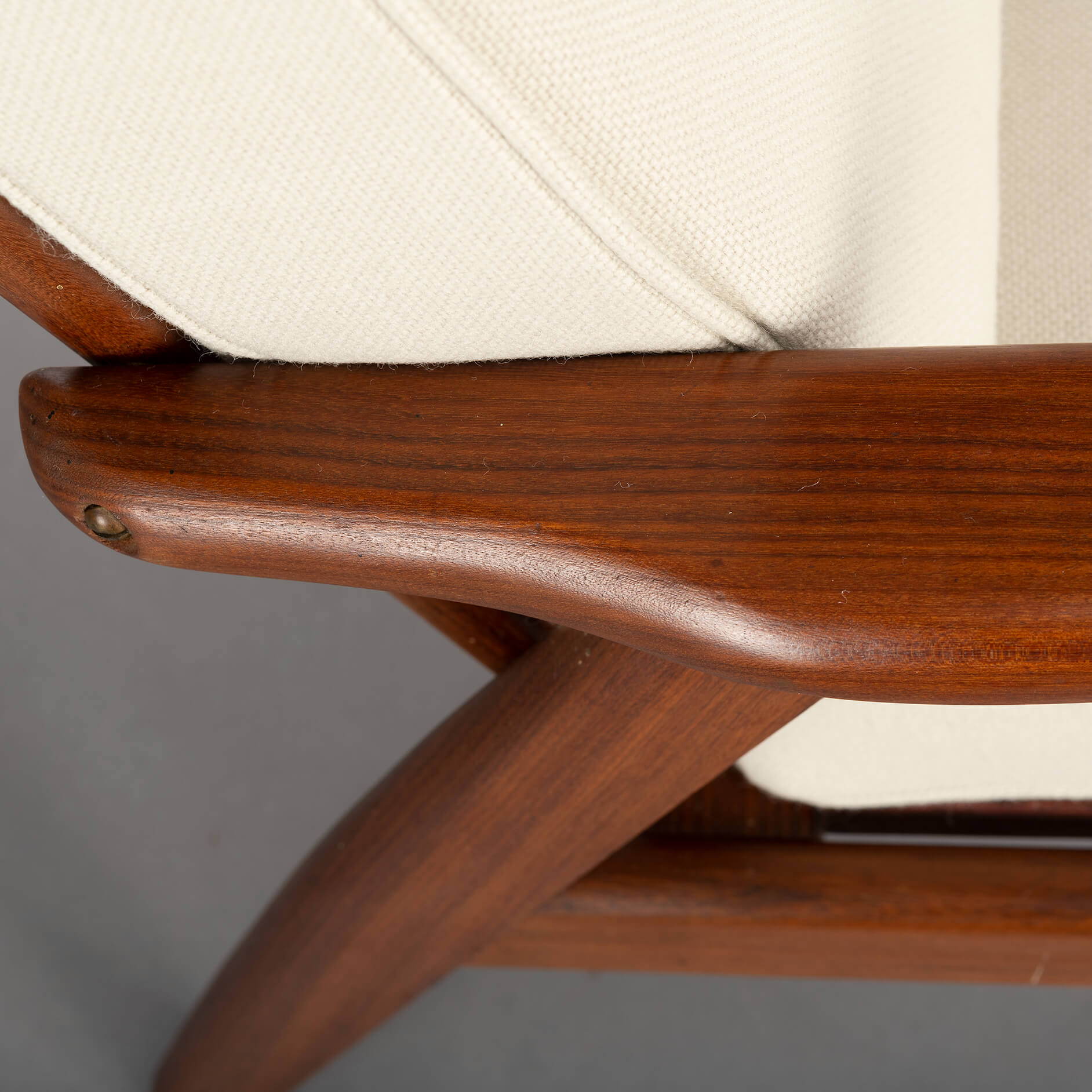 Danish vintage lounge man-chair (also for women) from the mid-1950s. Dark stained teak wood was used for the frame of this chair. Underneath the new cushions (Ploegwool 09) there are some repairs done to give this chair another 60 years of life.