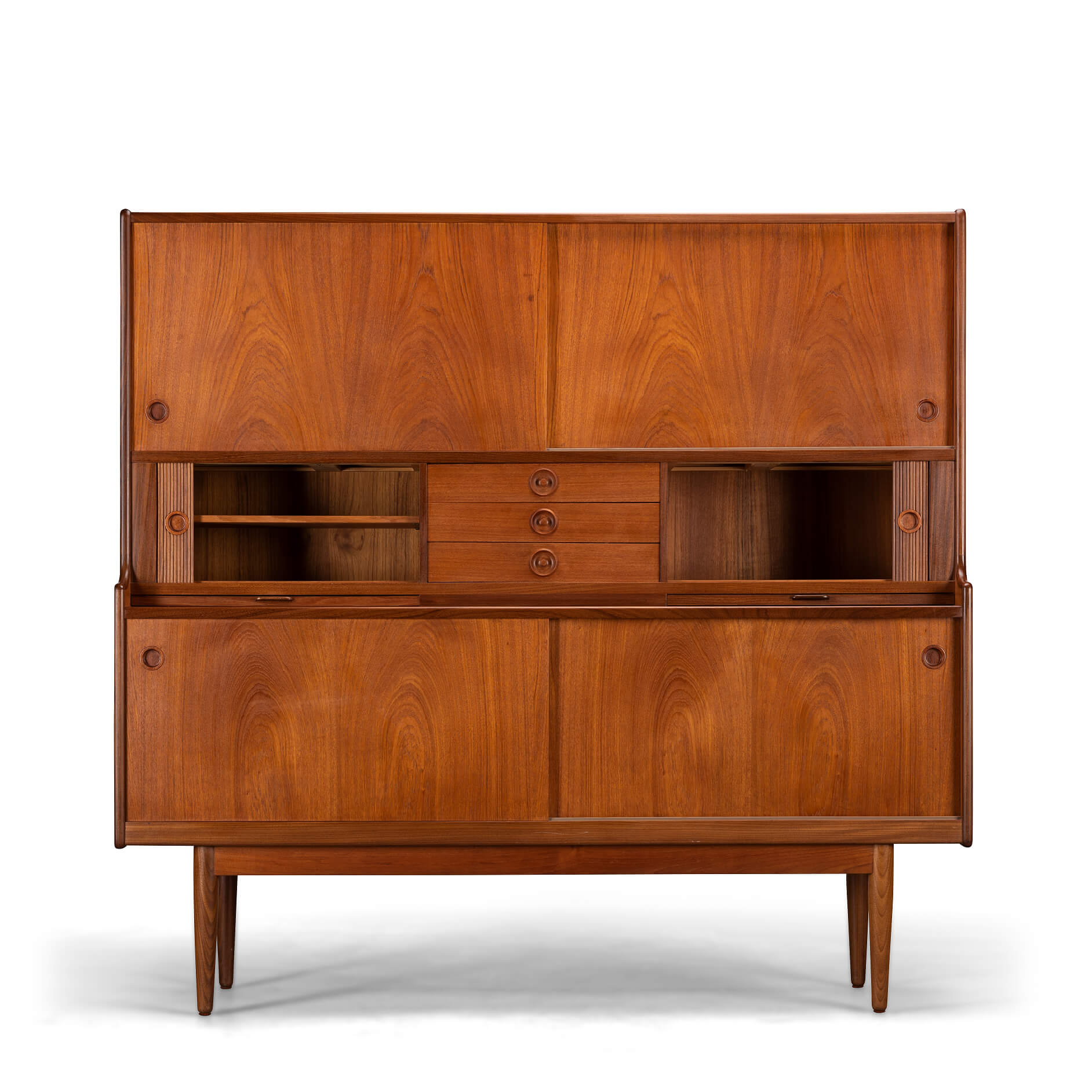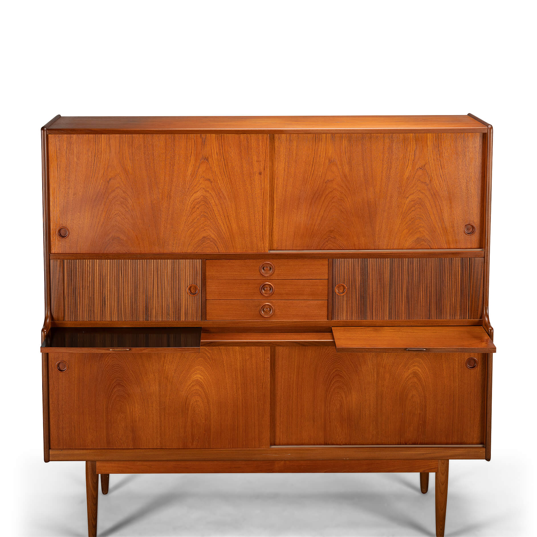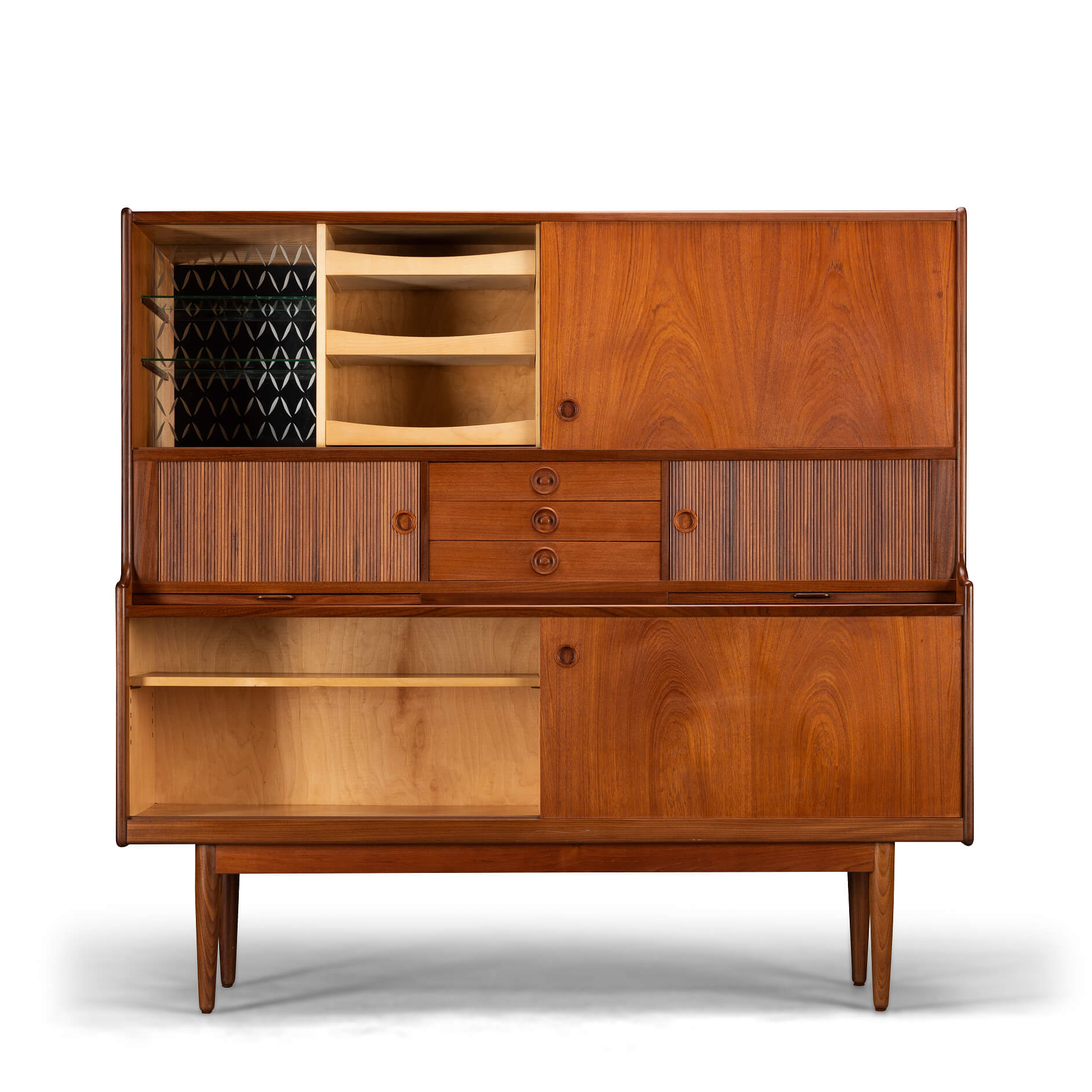 Storage Galore on this teak highboard made by J. Skaaning & Søn and designed by Johannes Andersen in the early 60s. It comes with all you covet in a vintage high board such as shelves, a glass lined and mirror equipped wopping bar section, pull out bar extenders lined in black melamine on the bar side, tambour doors for that extra bit of much needed mid century vibe, and not to forget a good array of external (3 of them) and green felted internal drawers. Check our detailed pictures for visuals on all of those. With all those features it does make the cabinet a heavy hitter so do watch your back if you move it! With about 60 years of use on the Clock you will find some use wear but the use has been very mild and thus we give this piece the very good vintage condition mark.