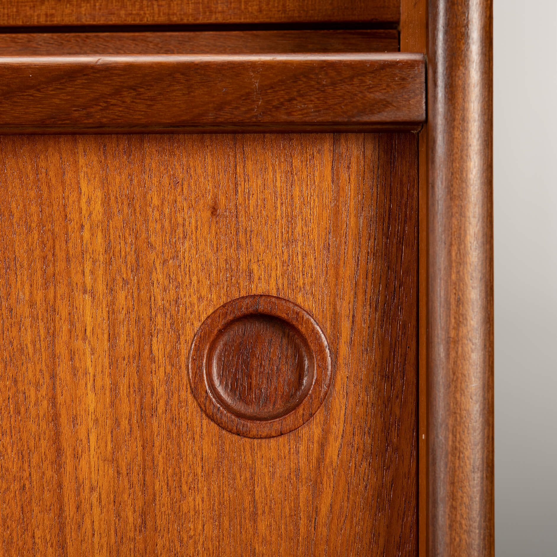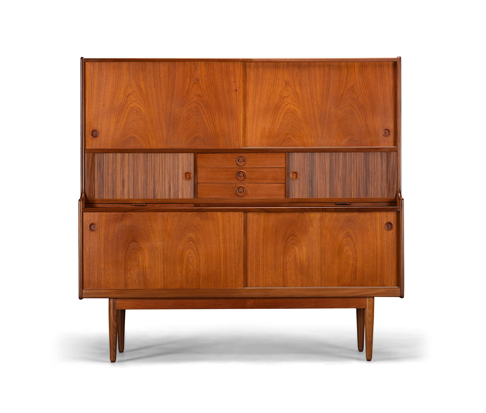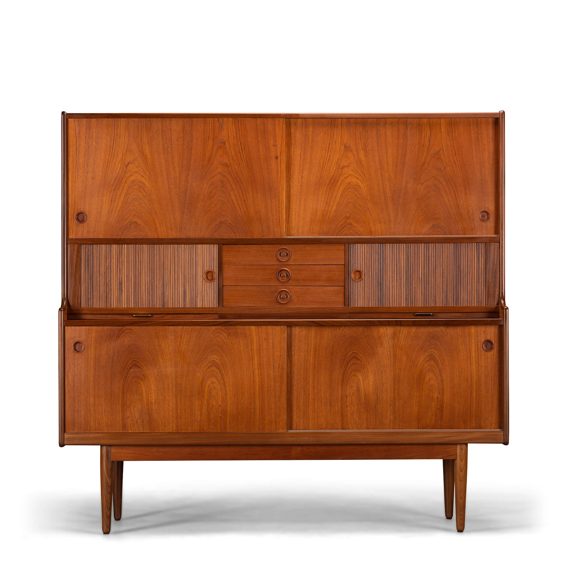 Storage Galore on this teak highboard made by J. Skaaning & Søn and designed by Johannes Andersen in the early 60s. It comes with all you covet in a vintage high board such as shelves, a glass lined and mirror equipped wopping bar section, pull out bar extenders lined in black melamine on the bar side, tambour doors for that extra bit of much needed mid century vibe, and not to forget a good array of external (3 of them) and green felted internal drawers. Check our detailed pictures for visuals on all of those. With all those features it does make the cabinet a heavy hitter so do watch your back if you move it! With about 60 years of use on the Clock you will find some use wear but the use has been very mild and thus we give this piece the very good vintage condition mark.