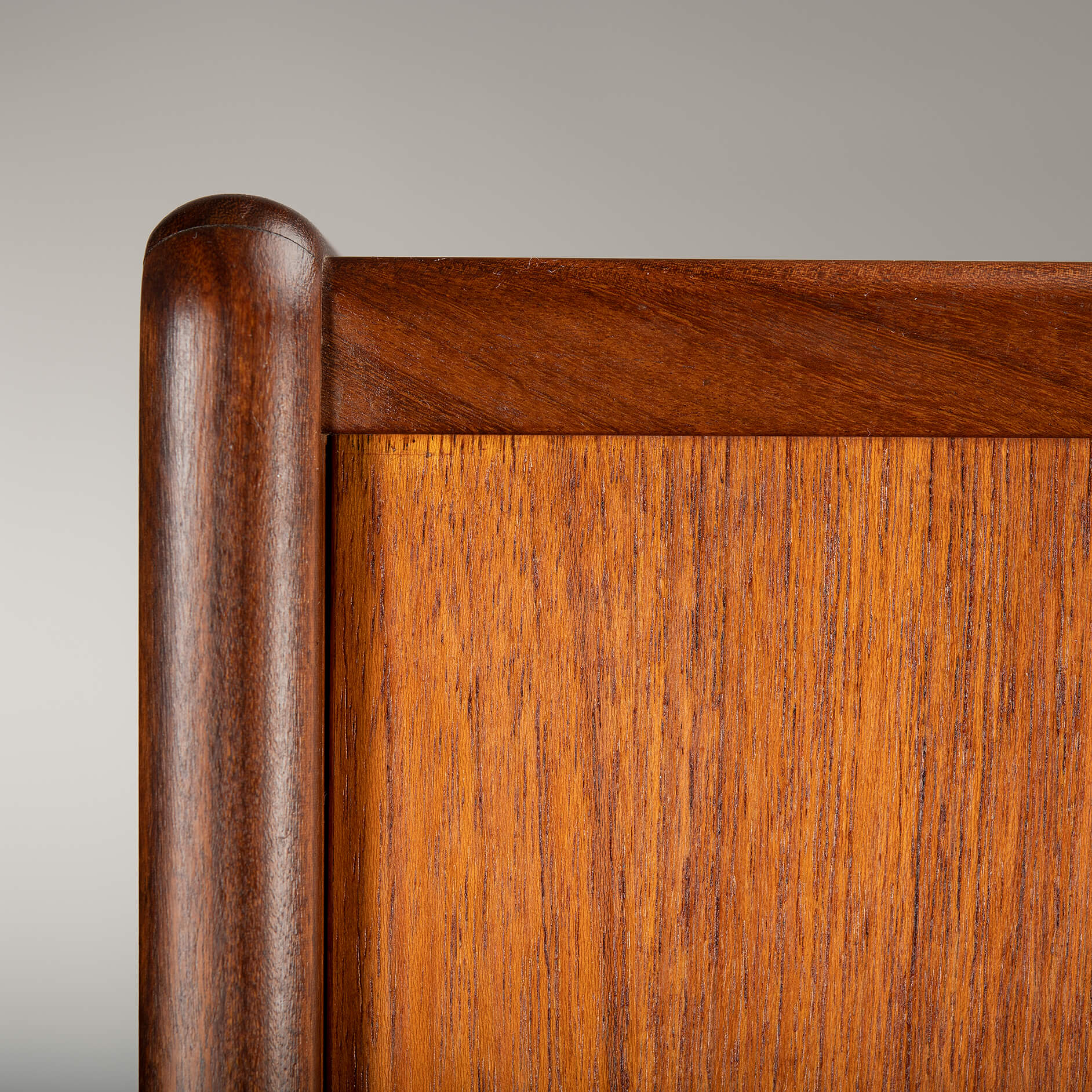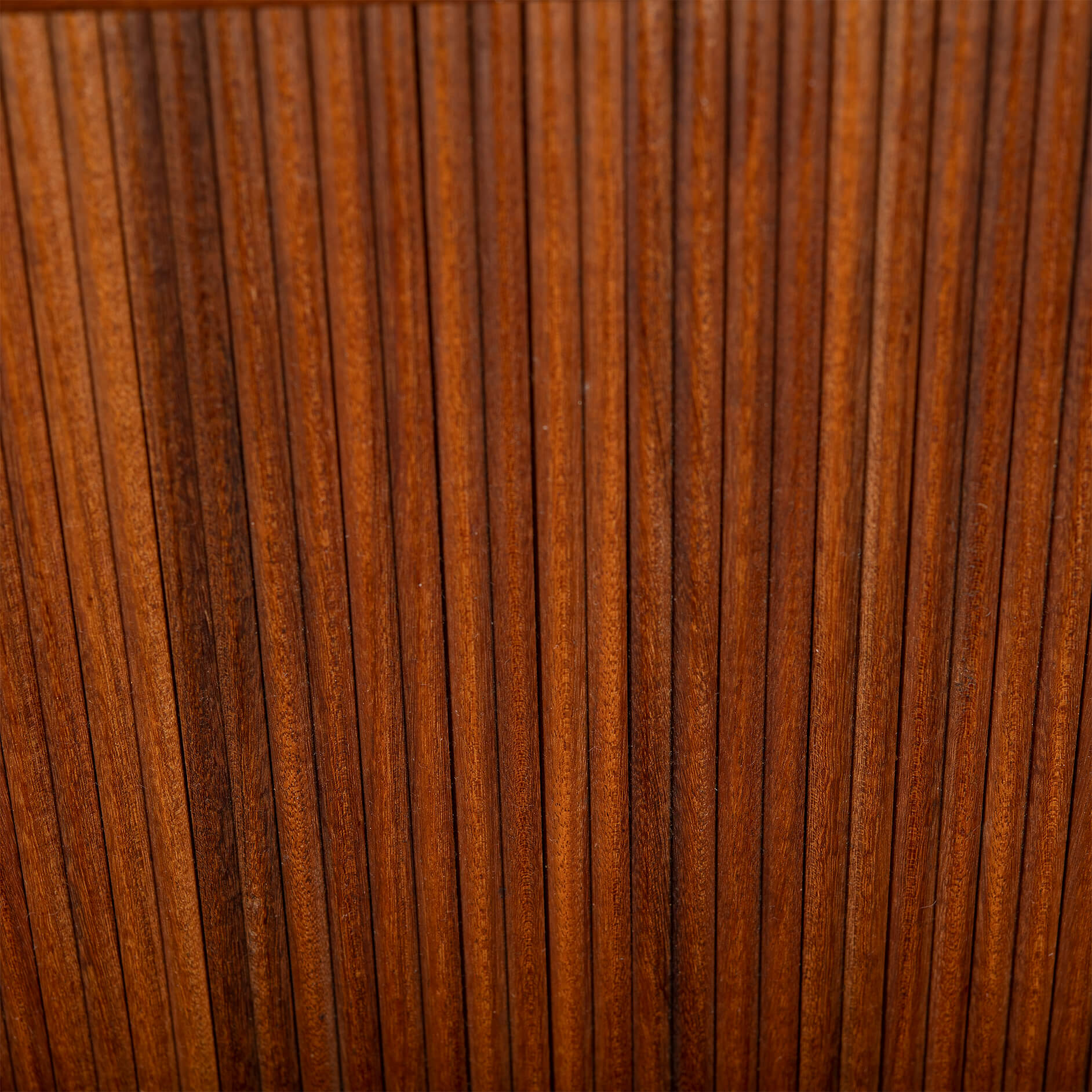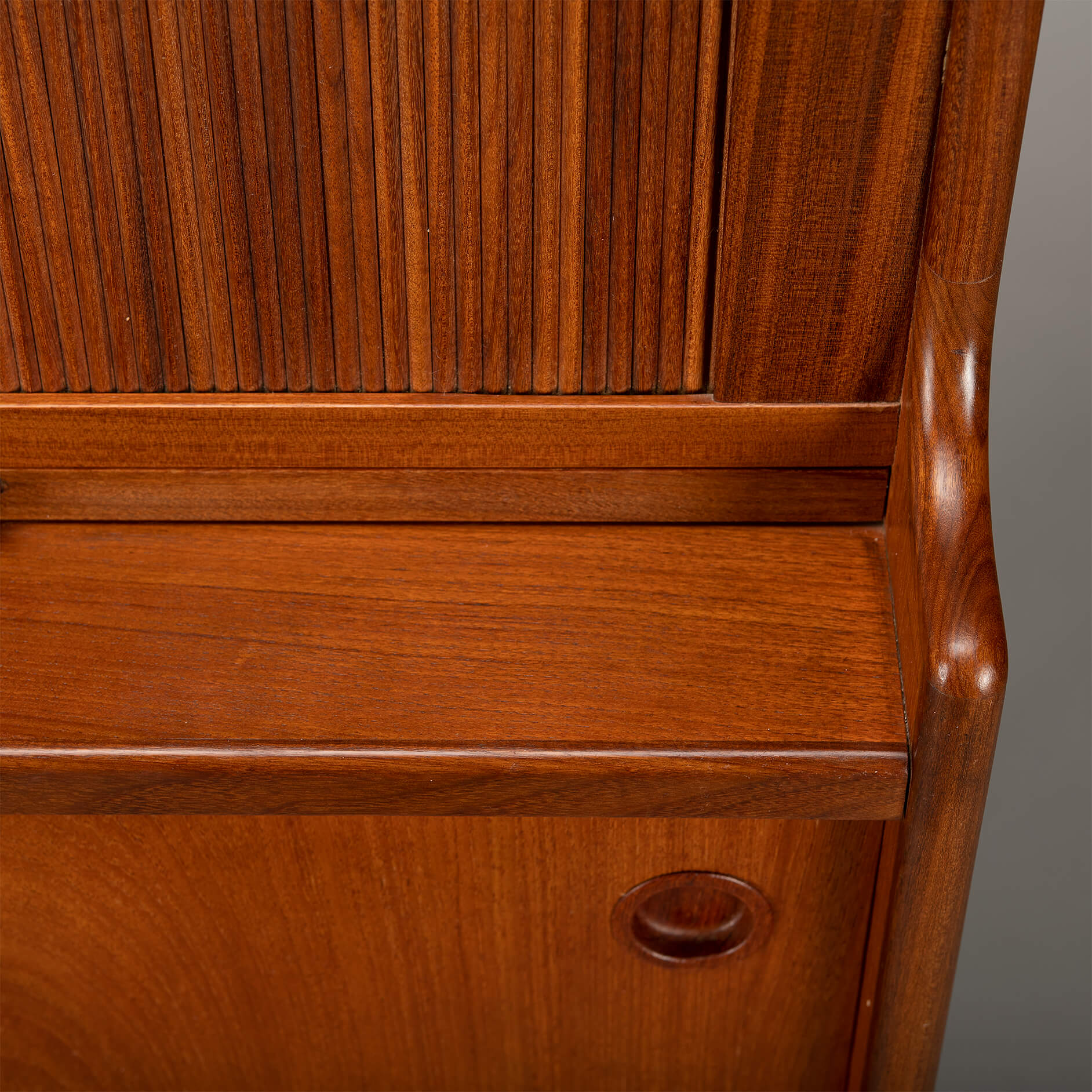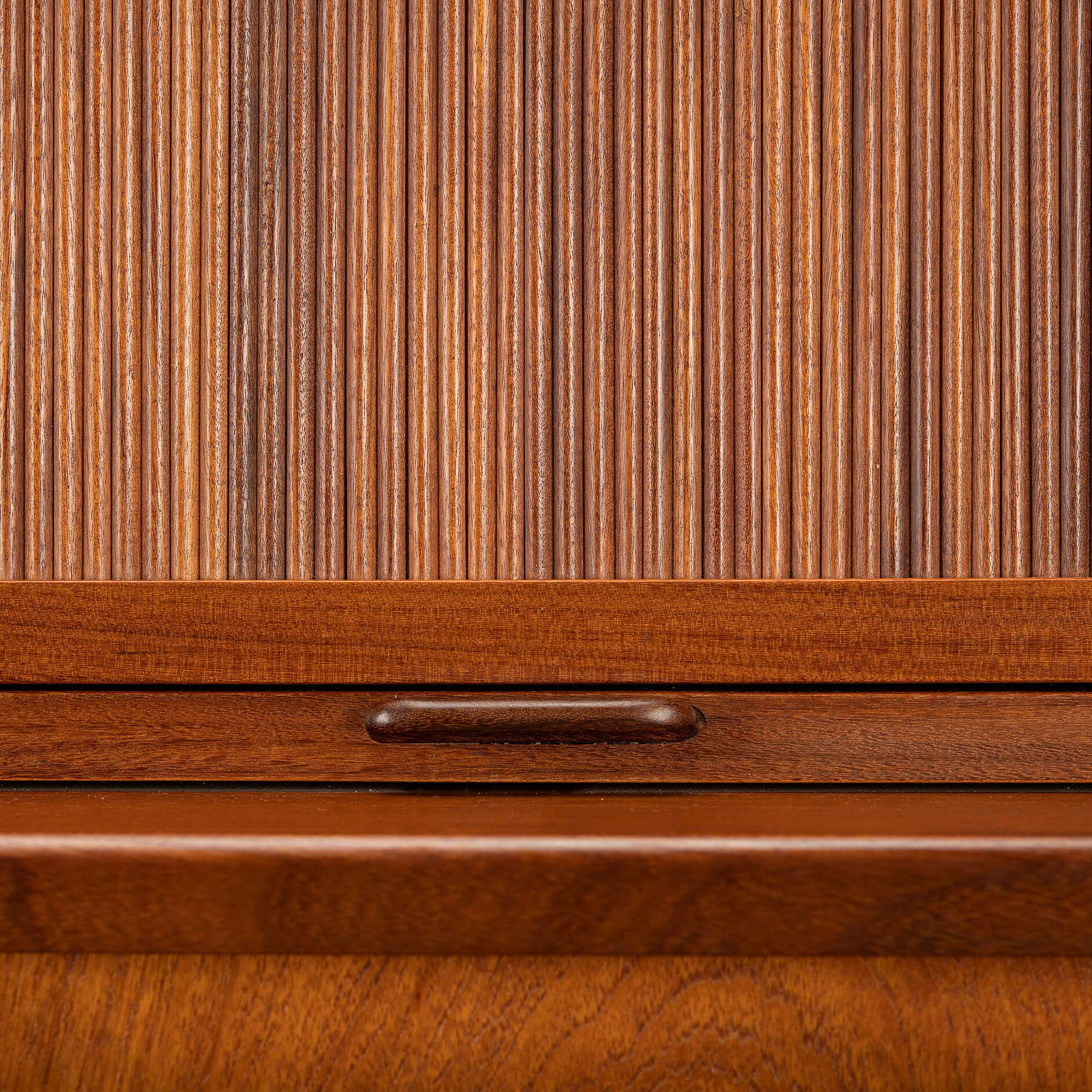 The tambour doors show a reflection of the photo flash light. Because they are rounded ribbons of solid wood. See the up close pictures we took from a different angle. The color is the Same as the rest of the cabinet.