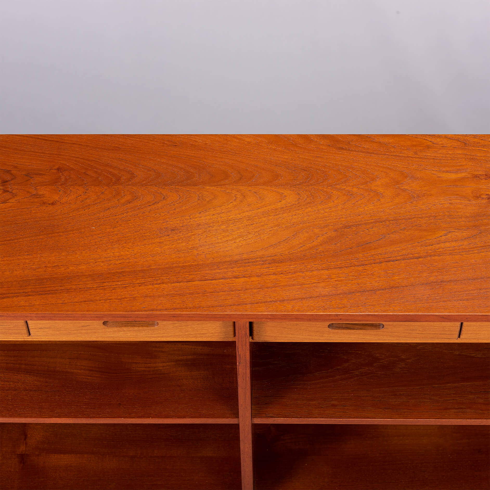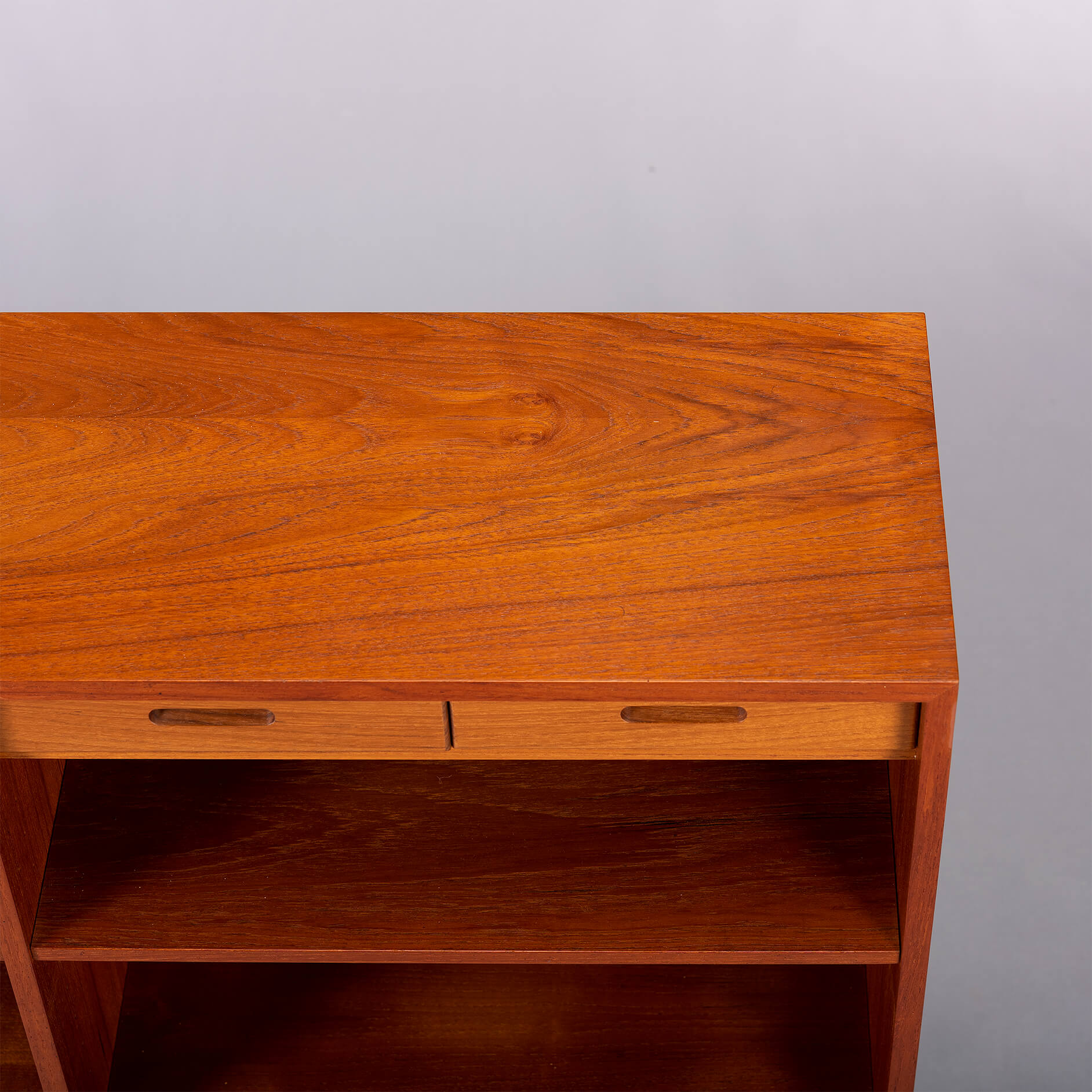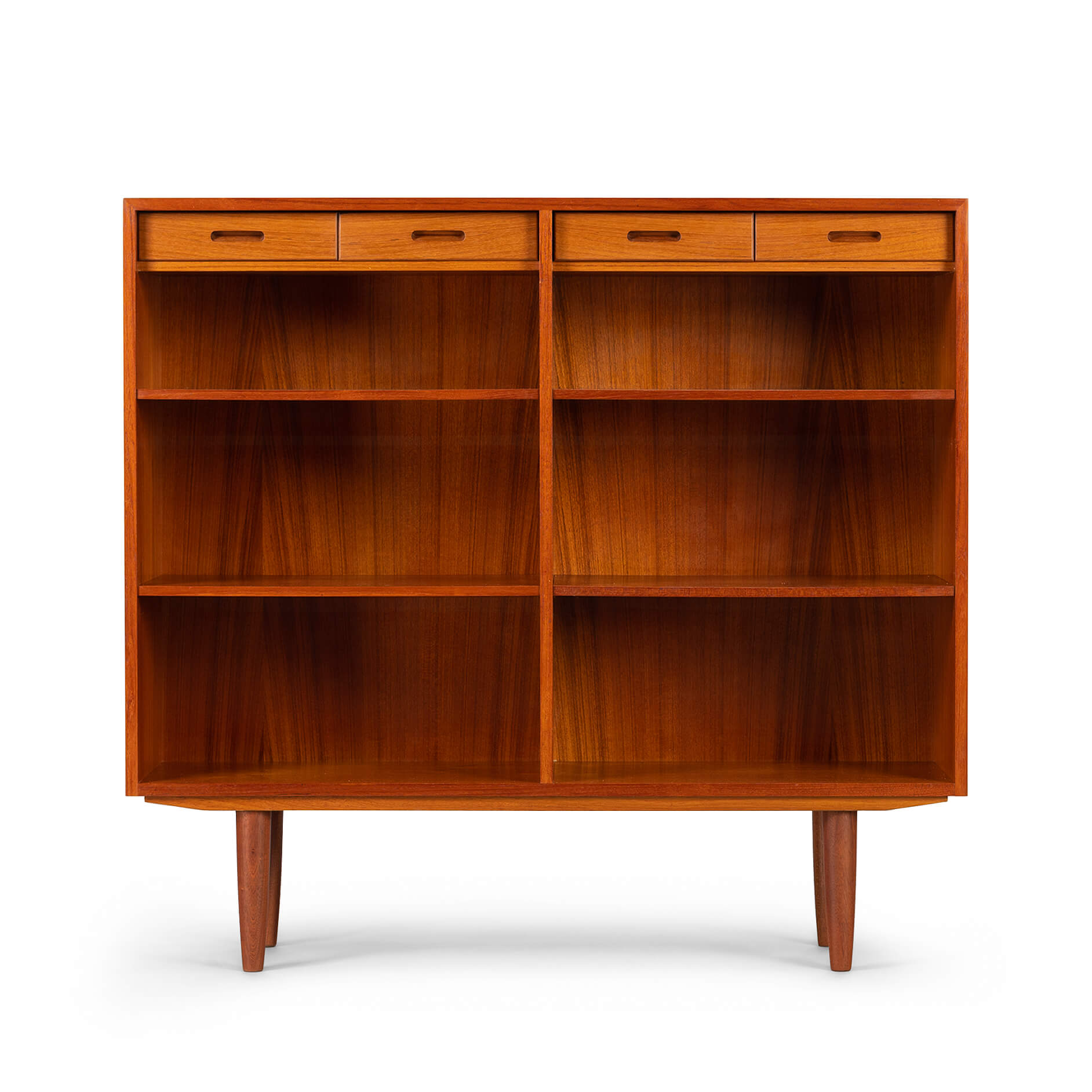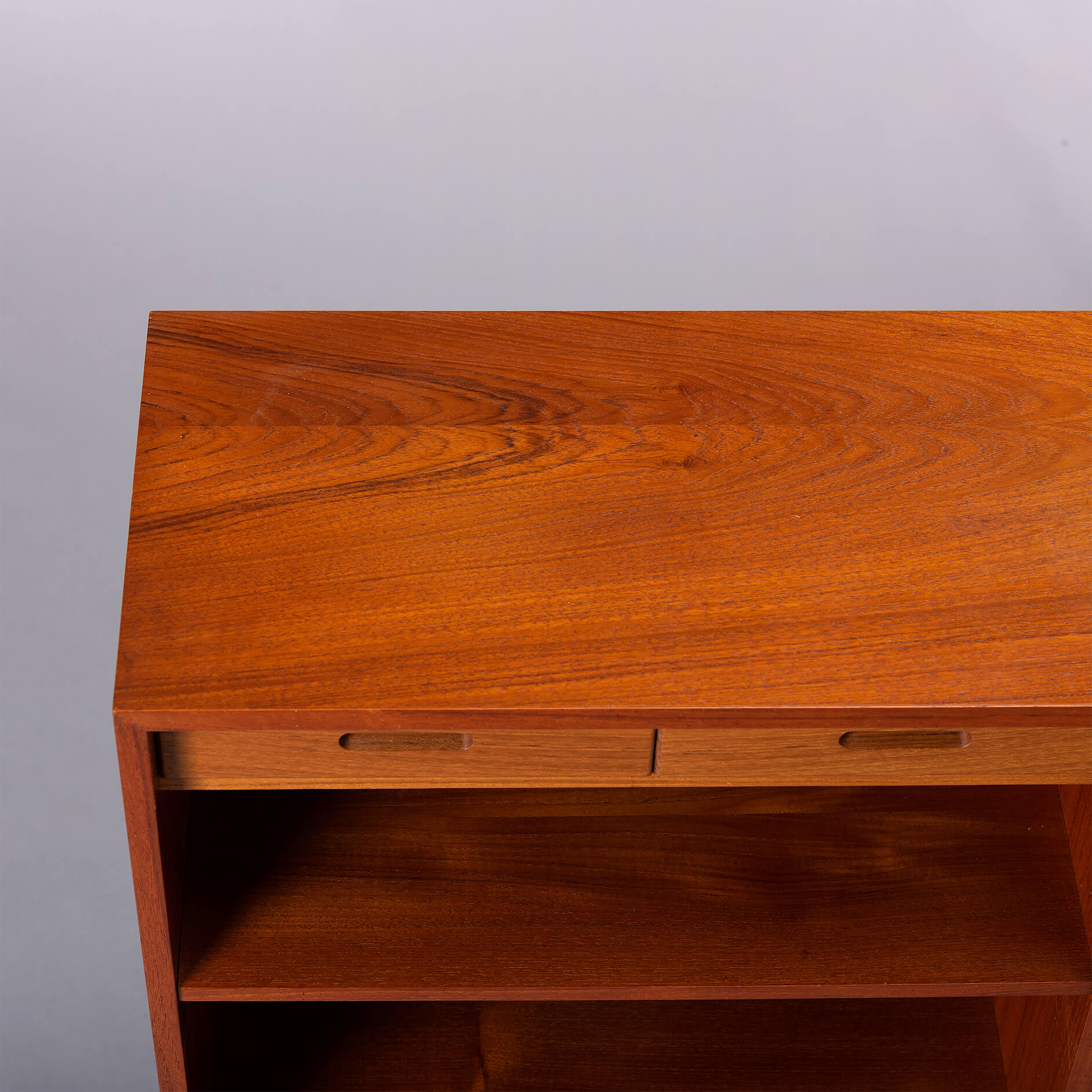 Nice elegant bookcase in teak by design of Kaj Winding for Poul Jeppesens Møbelfabrik from the 60s. Four truly beautifully crafted hardwood drawers with signature Winding grips line the top of the bookcase which further comprises four height adjustable shelves.