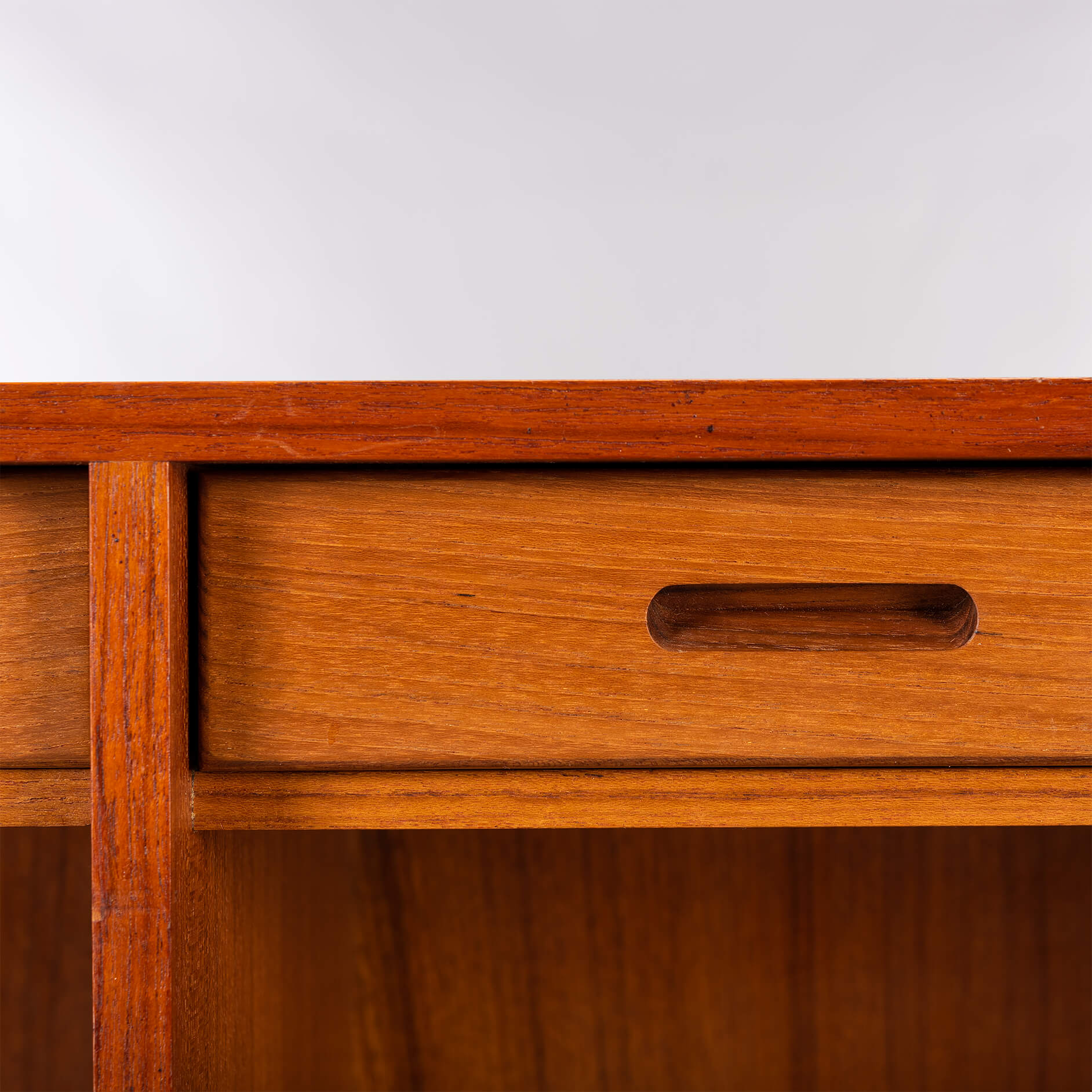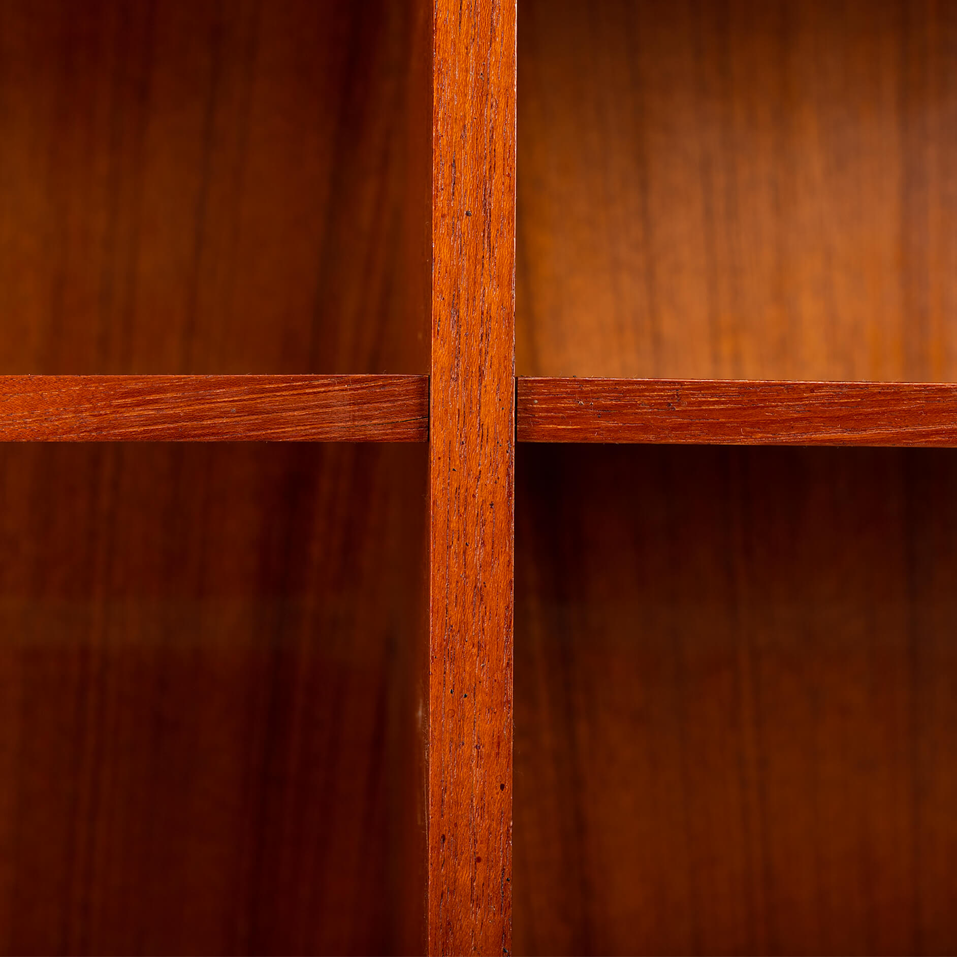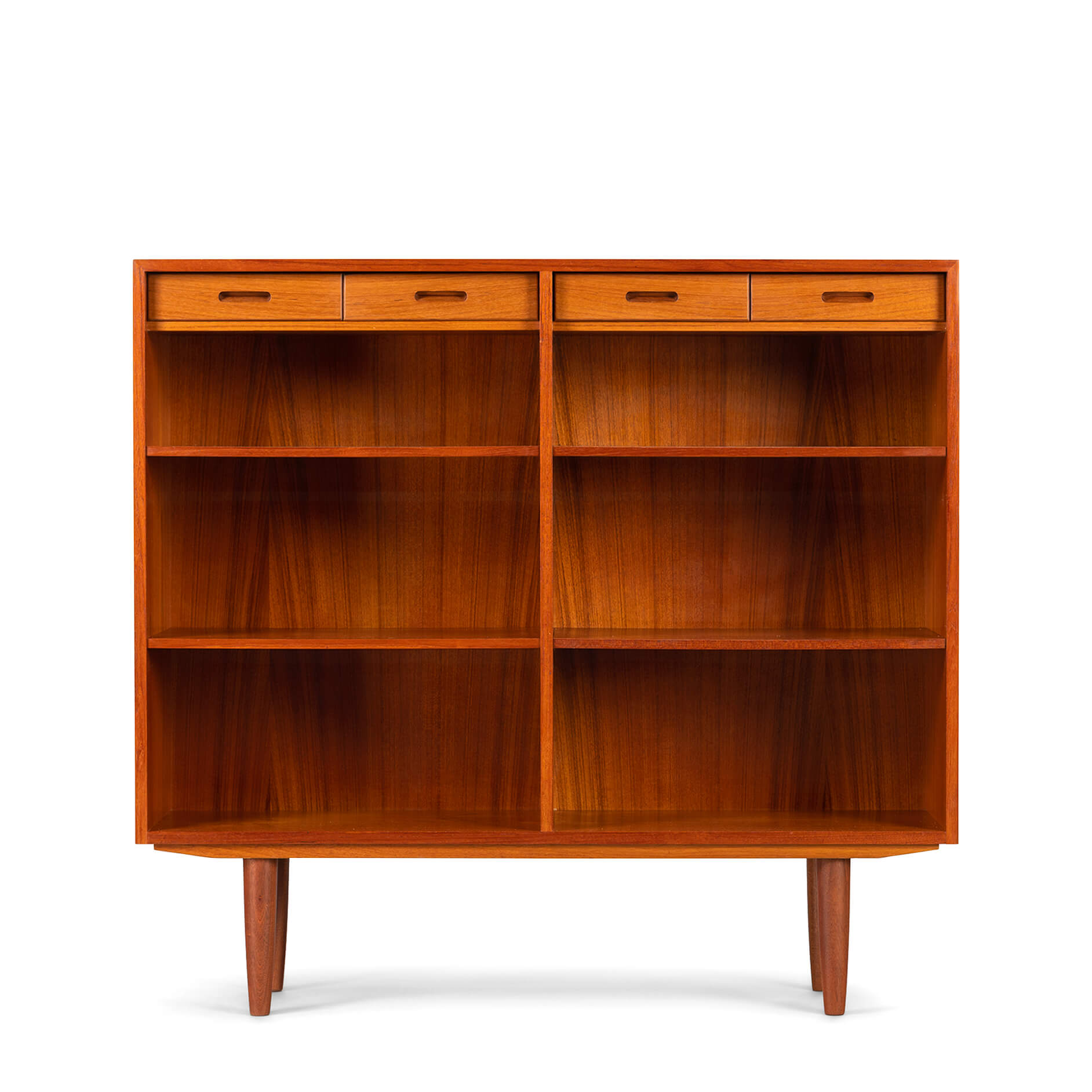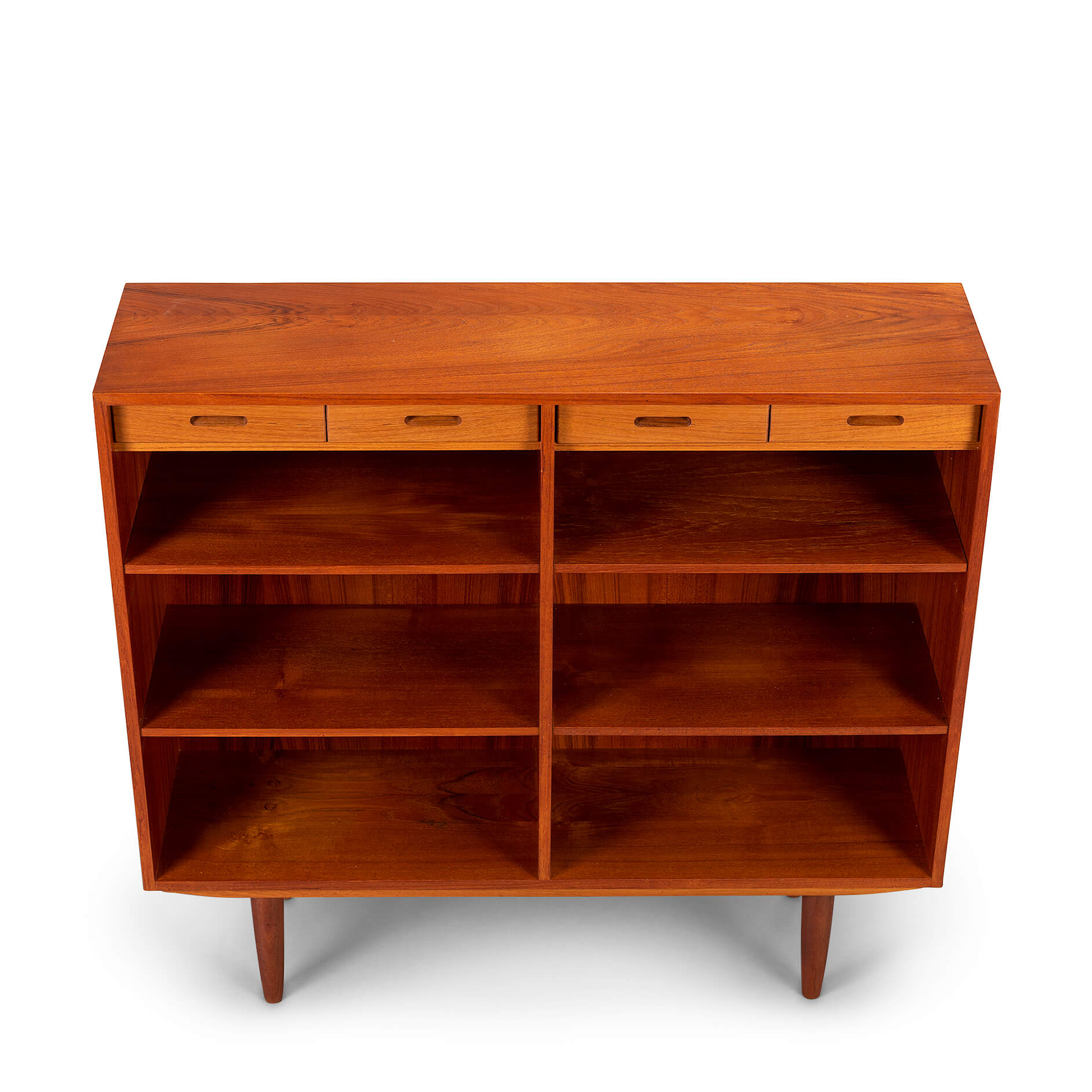 Nice elegant bookcase in teak by design of Kaj Winding for Poul Jeppesens Møbelfabrik from the 60s. Four truly beautifully crafted hardwood drawers with signature Winding grips line the top of the bookcase which further comprises four height adjustable shelves.