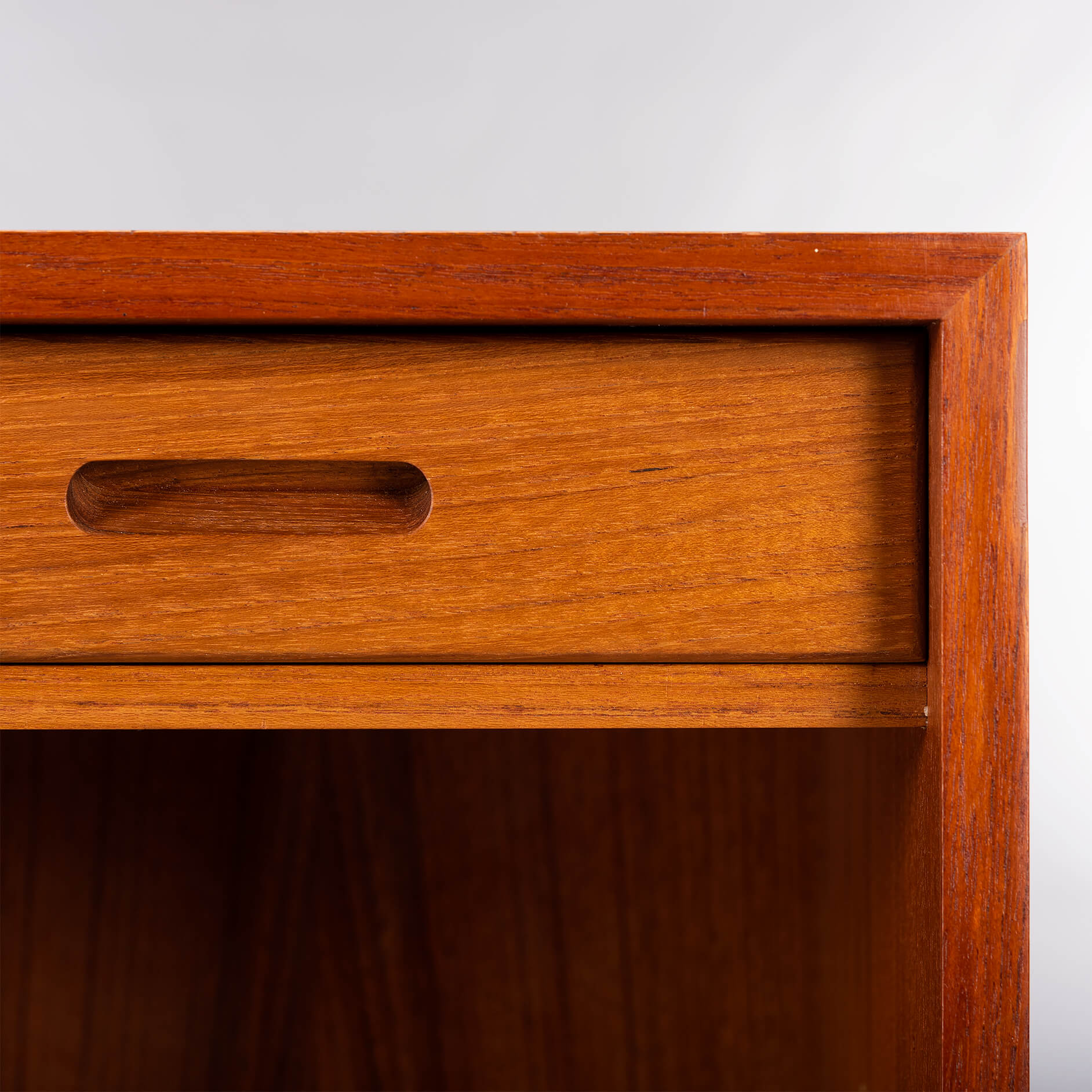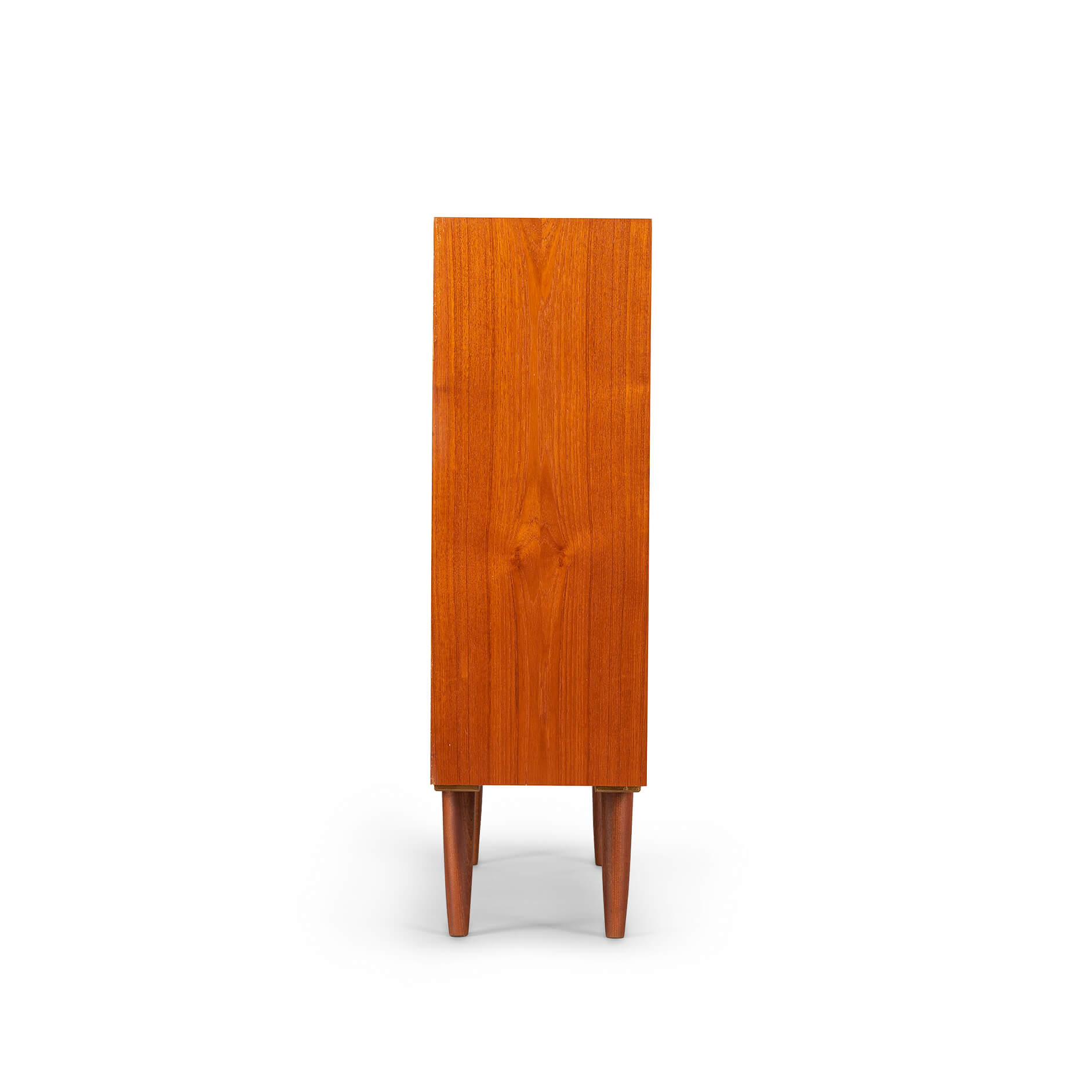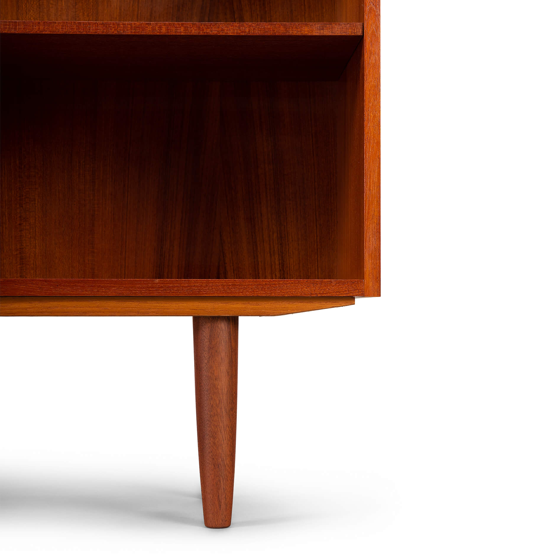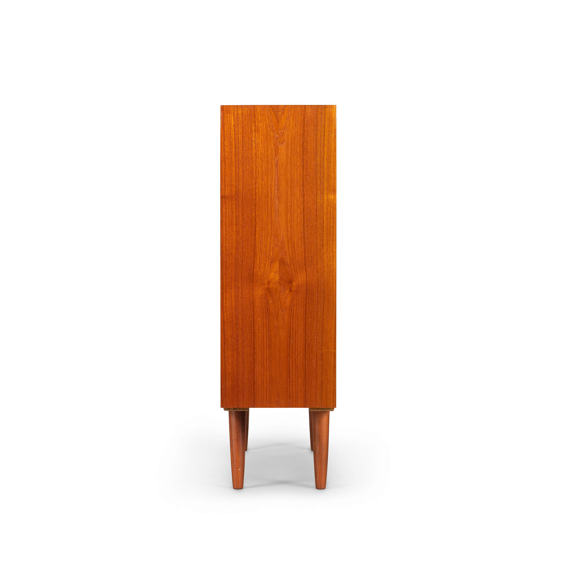 Nice elegant bookcase in teak by design of Kaj Winding for Poul Jeppesens Møbelfabrik from the 60s. Four truly beautifully crafted hardwood drawers with signature Winding grips line the top of the bookcase which further comprises four height adjustable shelves.