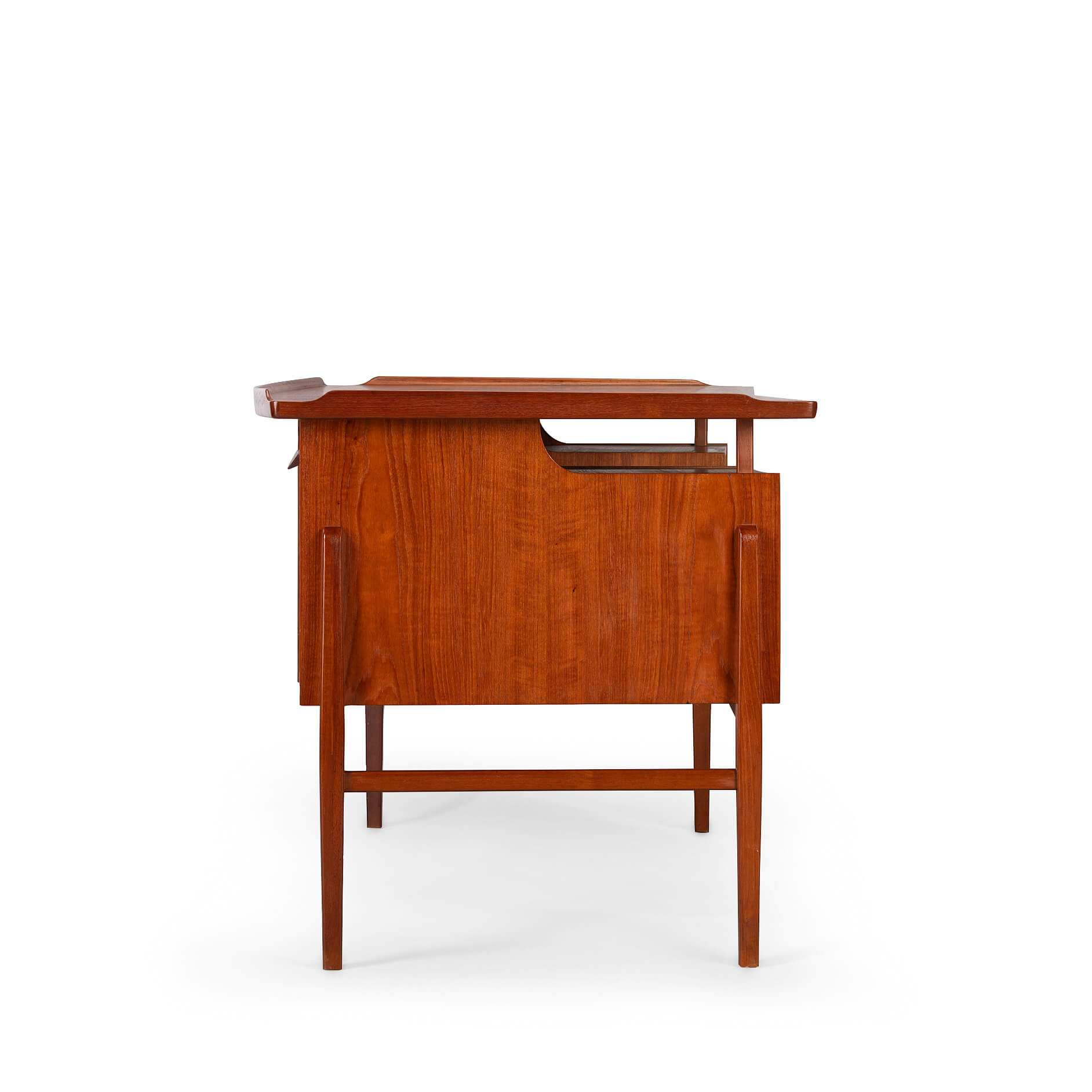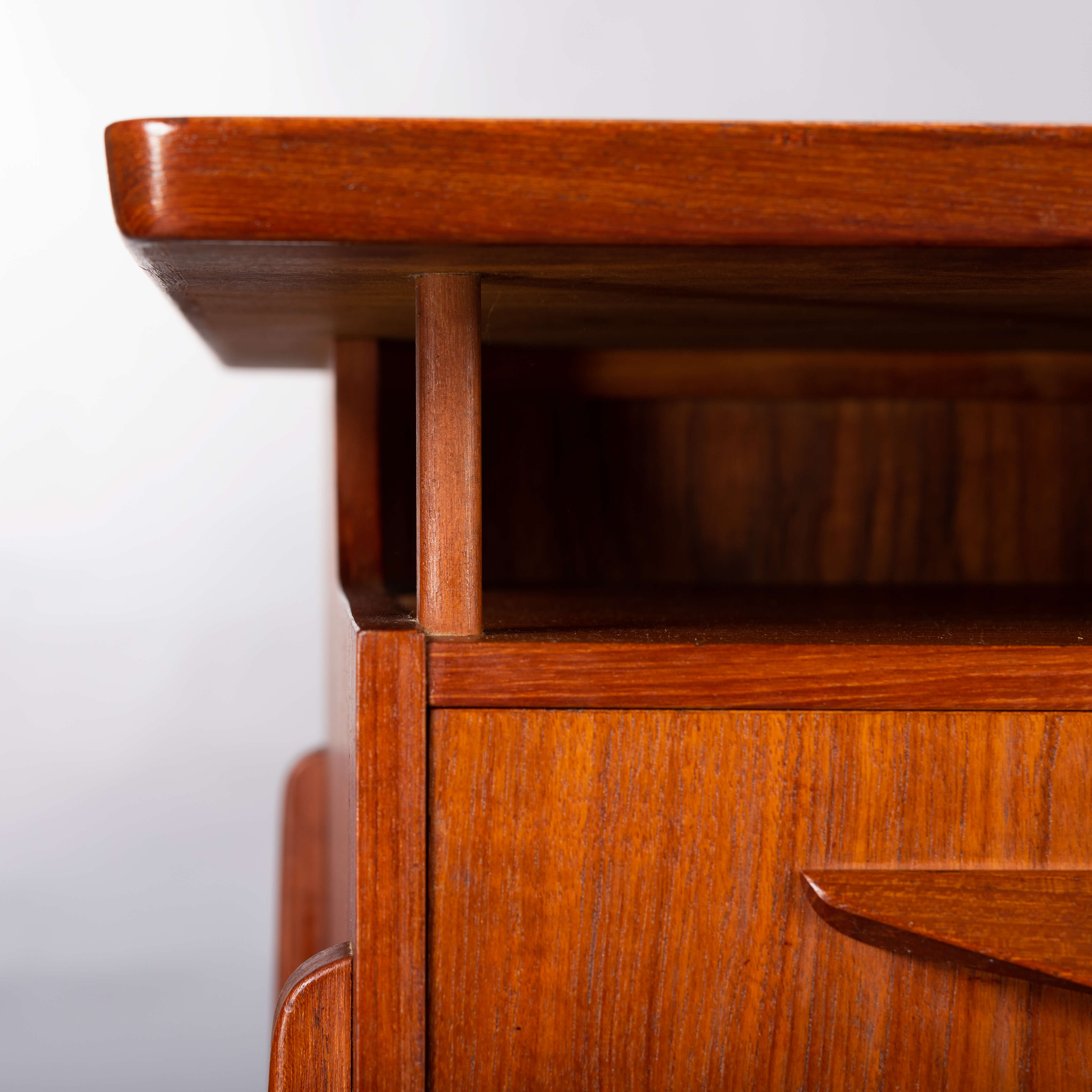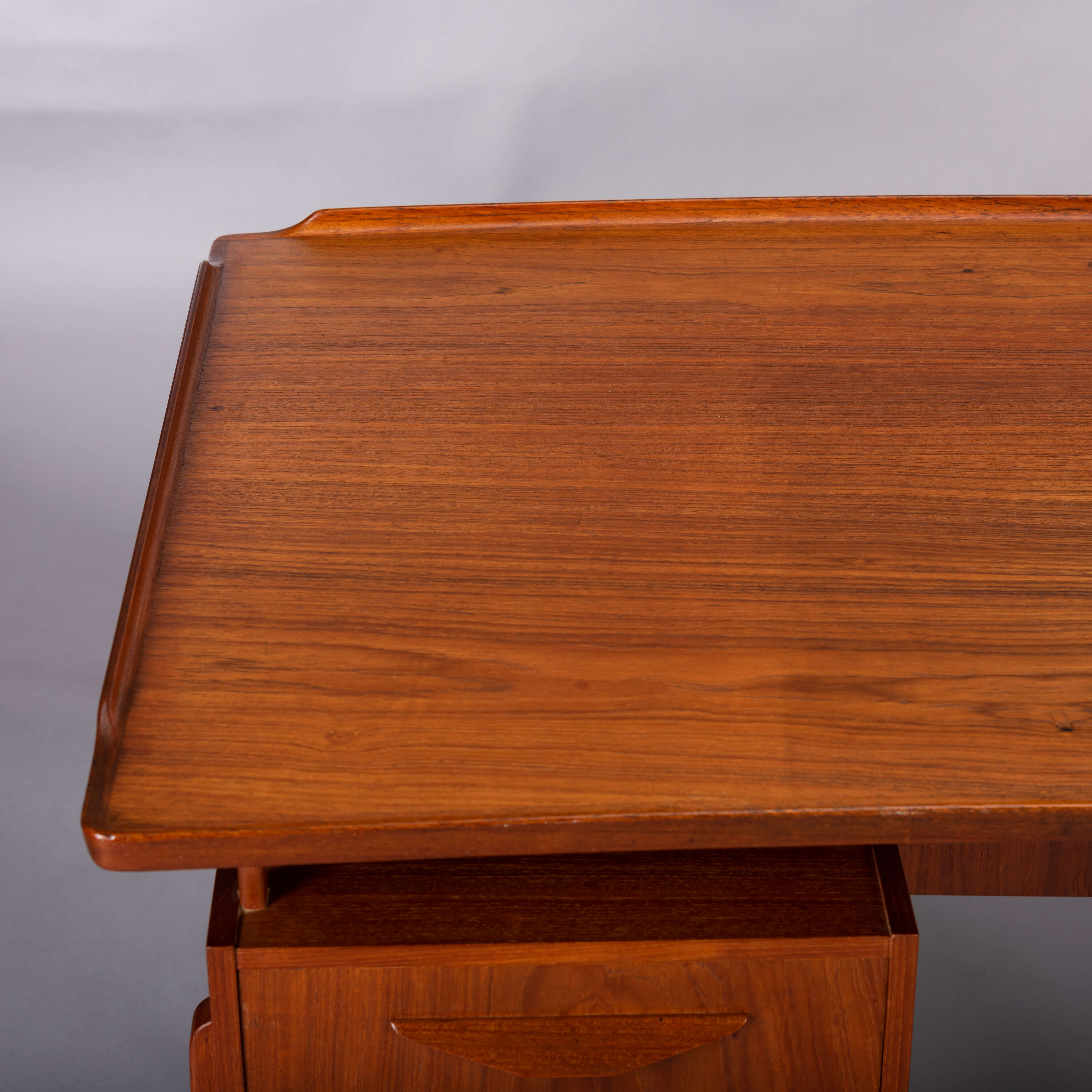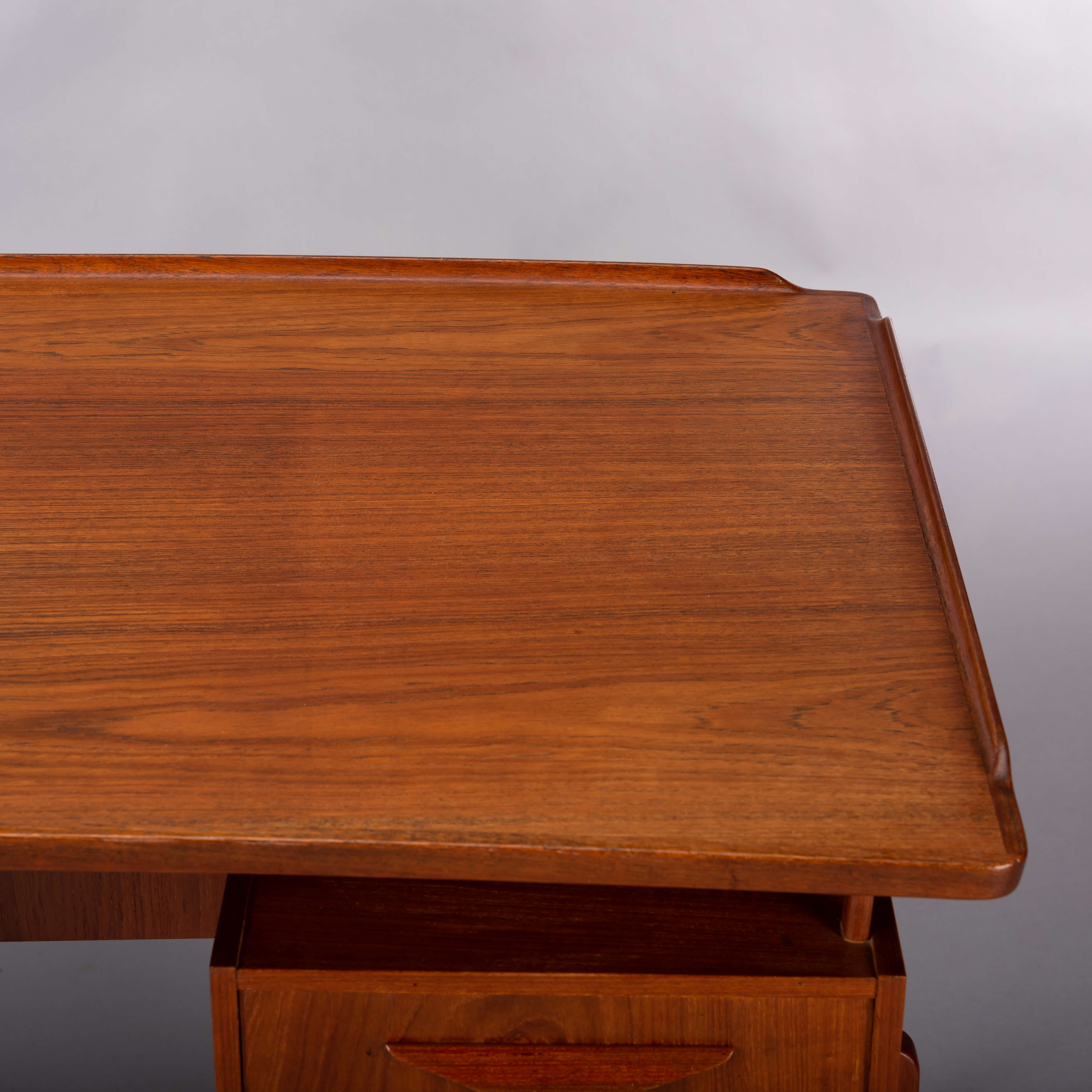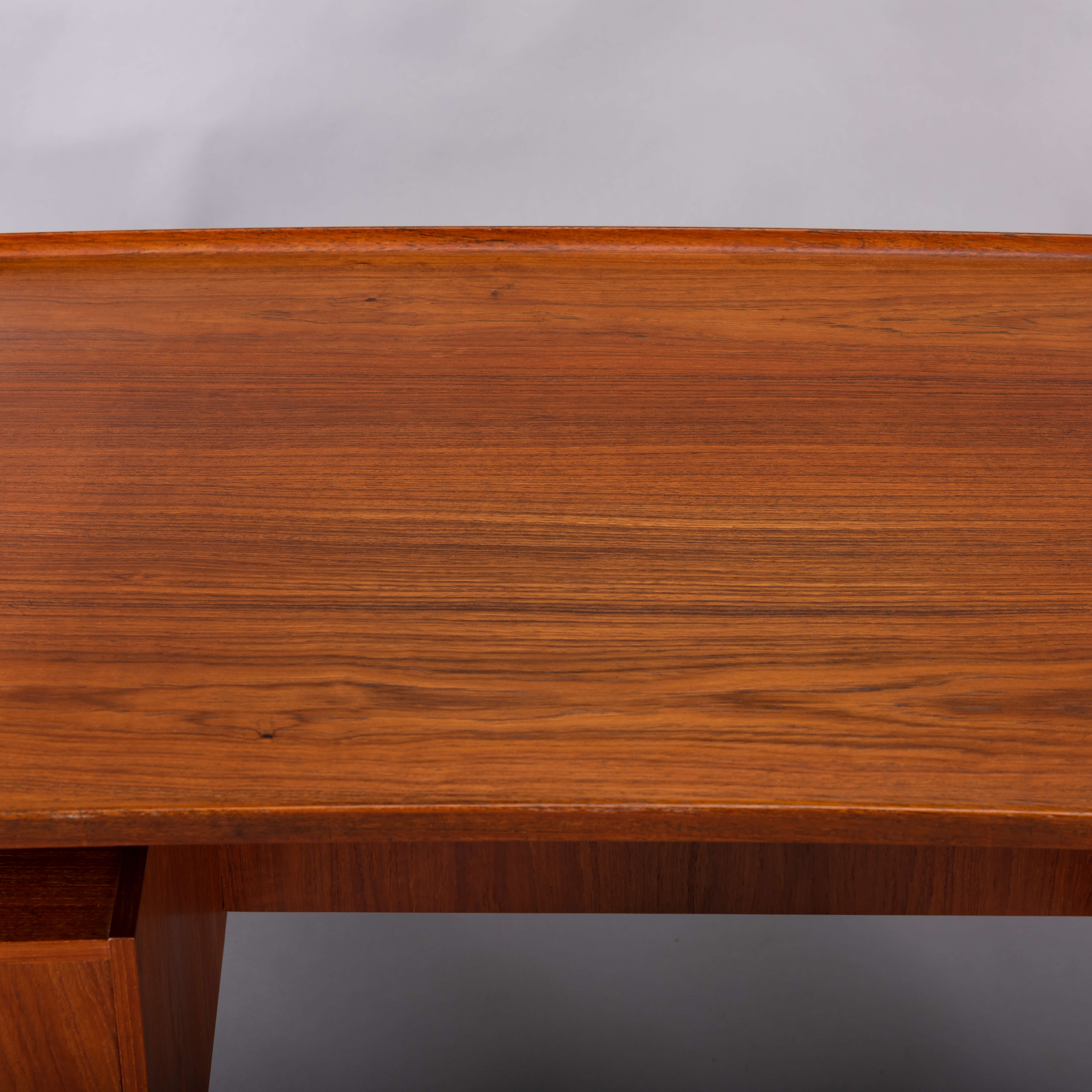 This fab mid century desk in teak veneer from the mid sixties is from Denmark. We have revived the piece with a new coat of hard oil. Some discolouration due to the underlay on the top of the desk doesn't distract too much actually. Nice raised edge prevent papers and pens to fall. It does remind of an Arne Vodder desk but it is not. Two three drawer blocks on the front and two compartments on the back that can be closed with a drop down. Special twist is the left back side which is fully finished on the inside as bar section. On the right one small shelf is missing inside the cabinet. The legs of the desk are of solid teak and nicely cut.