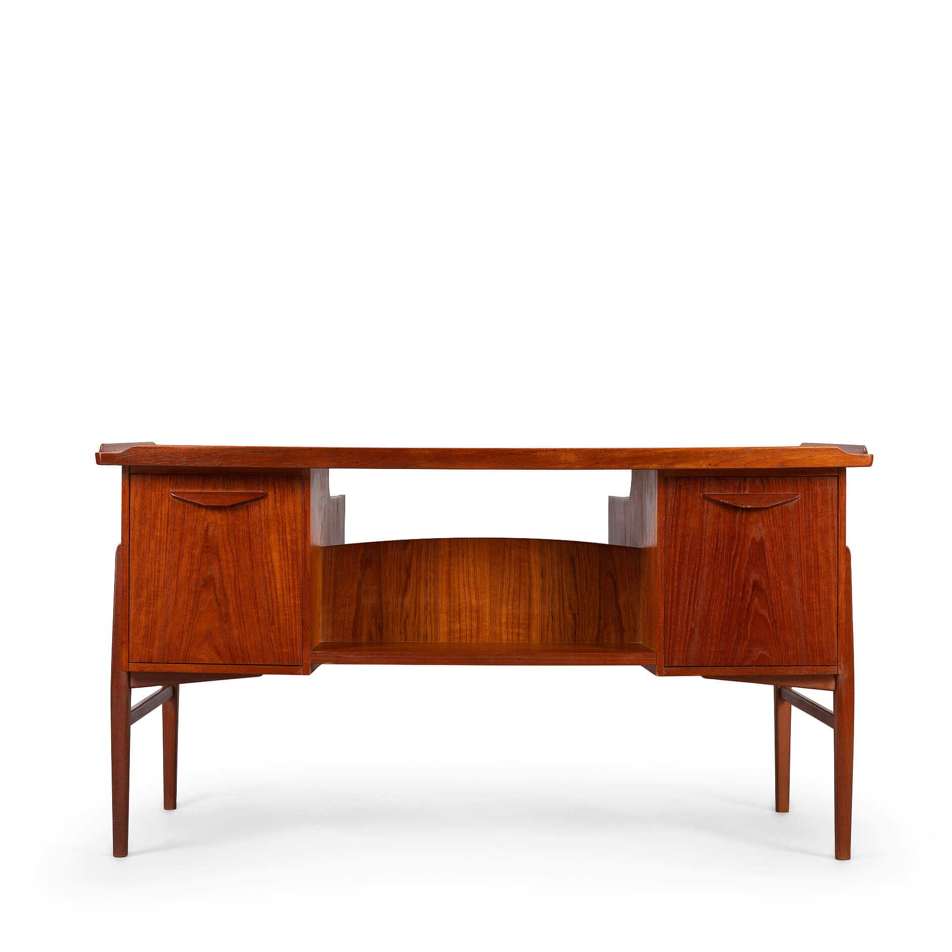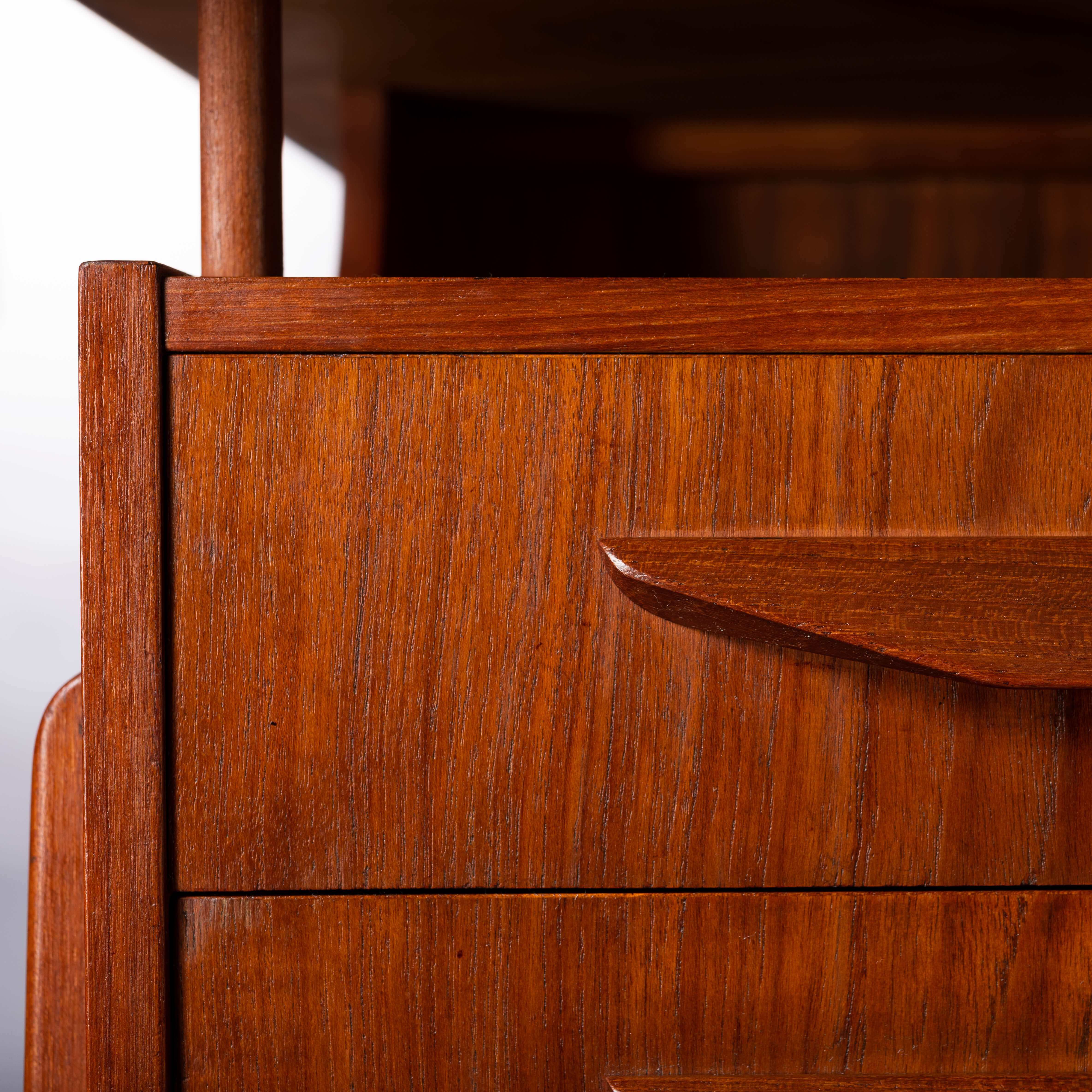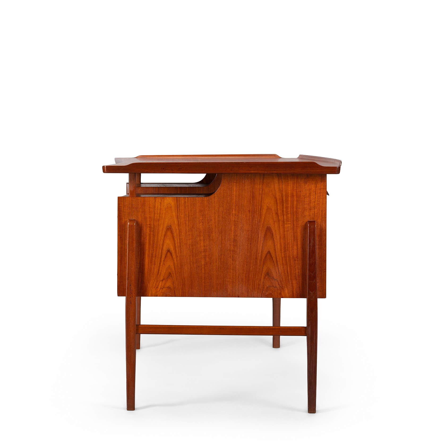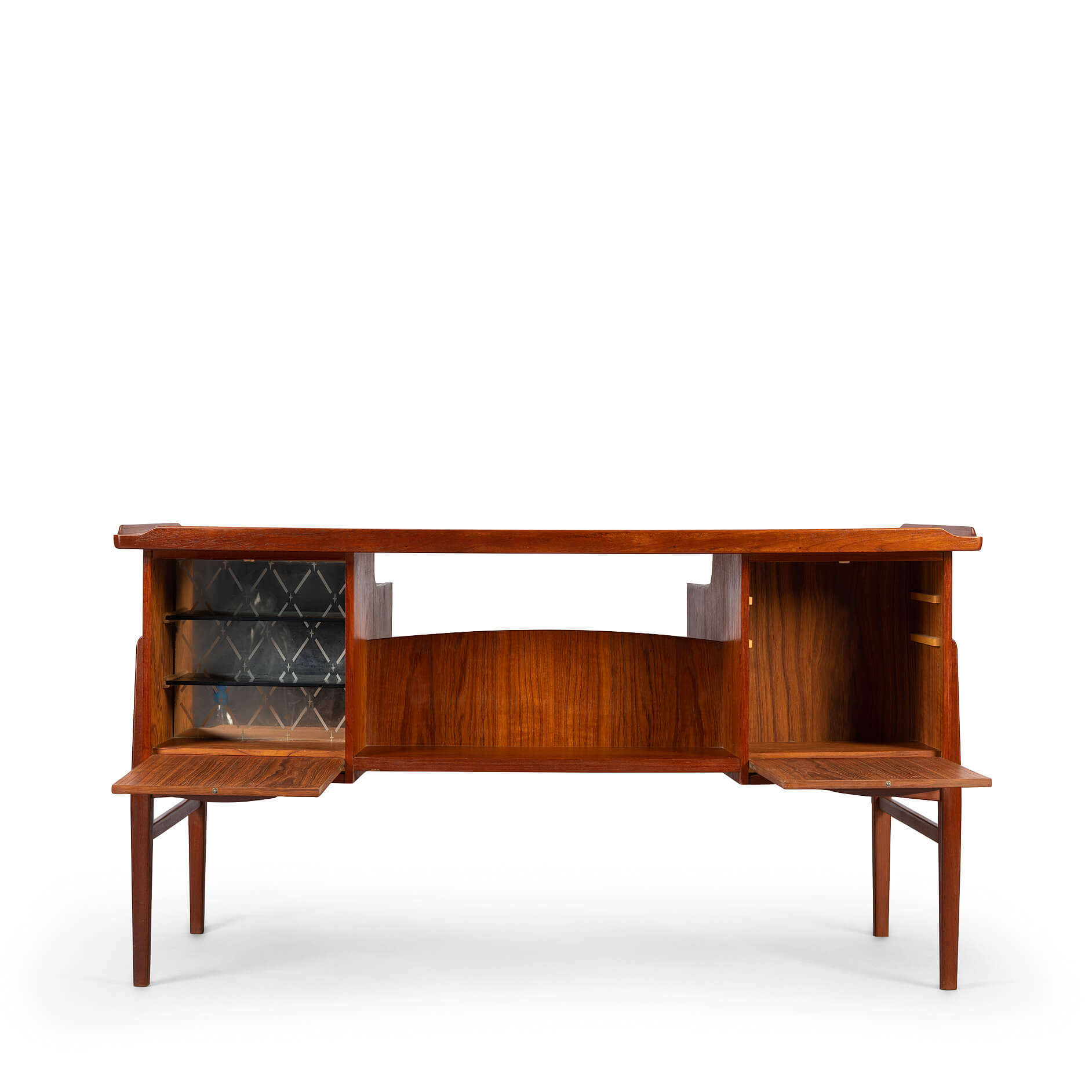 This fab mid century desk in teak veneer from the mid sixties is from Denmark. We have revived the piece with a new coat of hard oil. Some discolouration due to the underlay on the top of the desk doesn't distract too much actually. Nice raised edge prevent papers and pens to fall. It does remind of an Arne Vodder desk but it is not. Two three drawer blocks on the front and two compartments on the back that can be closed with a drop down. Special twist is the left back side which is fully finished on the inside as bar section. On the right one small shelf is missing inside the cabinet. The legs of the desk are of solid teak and nicely cut.