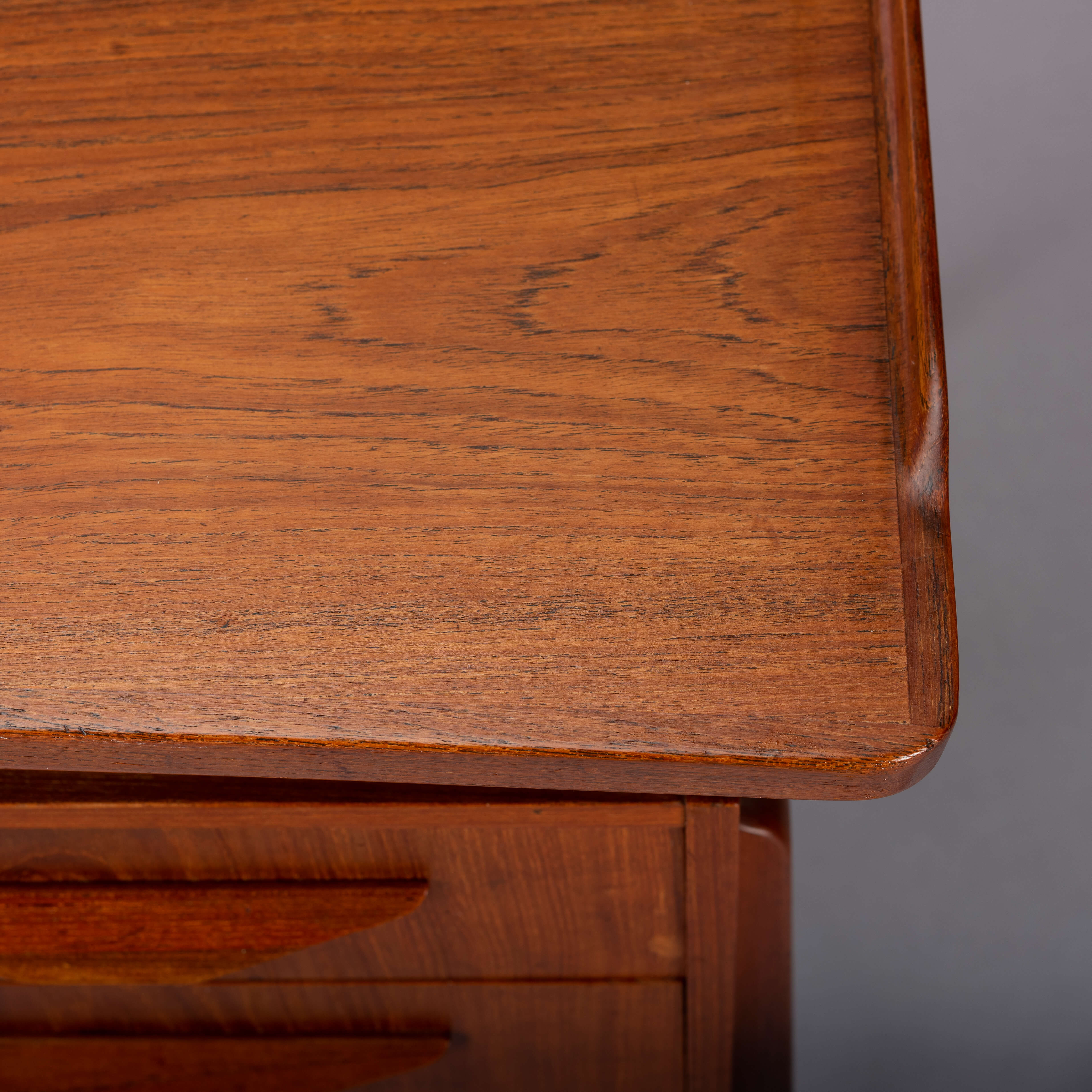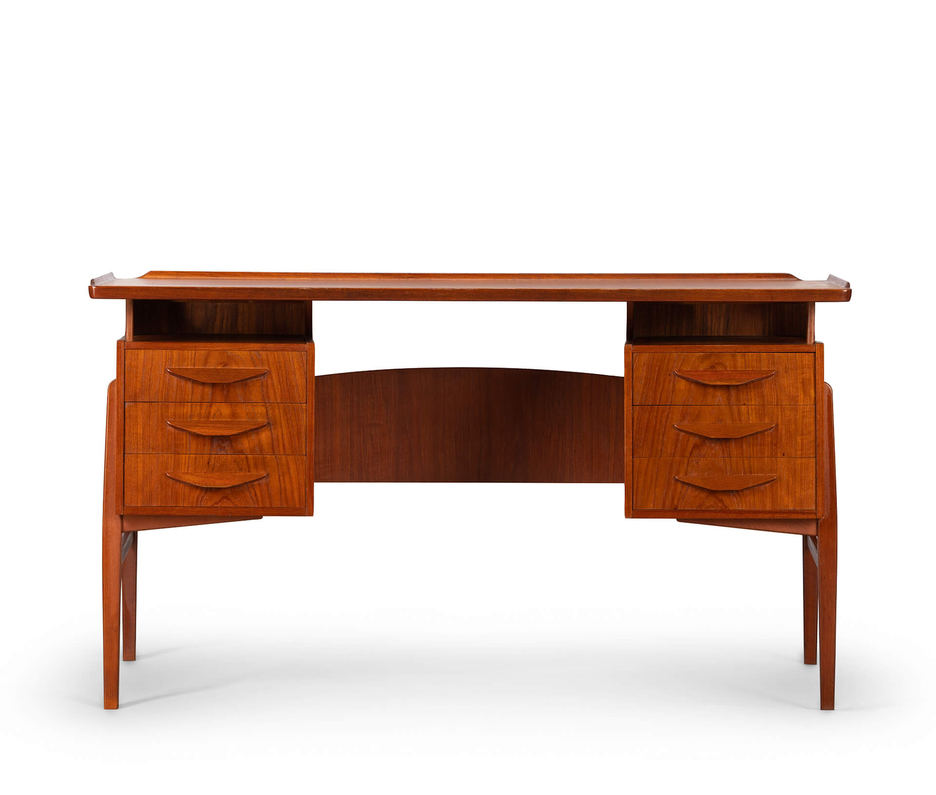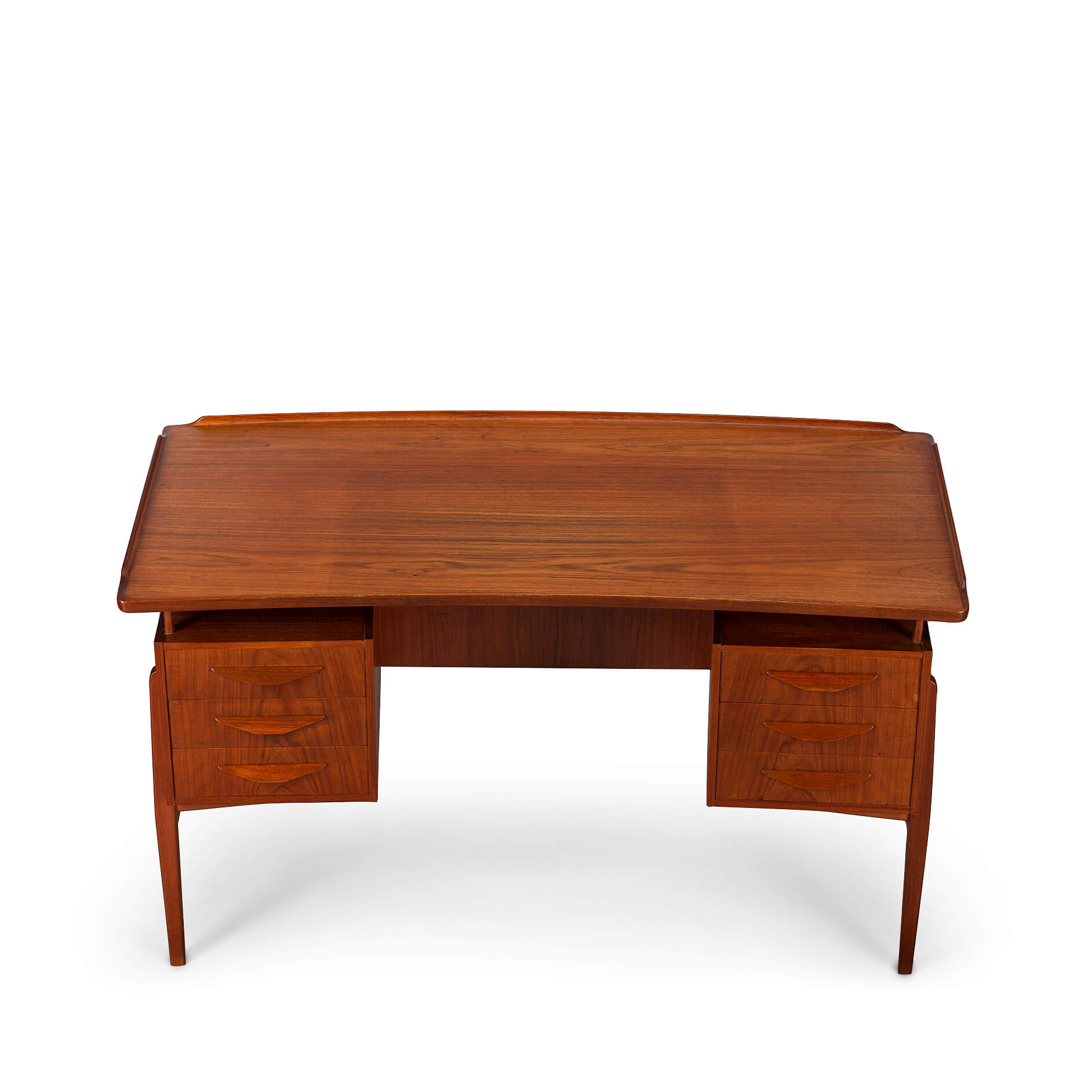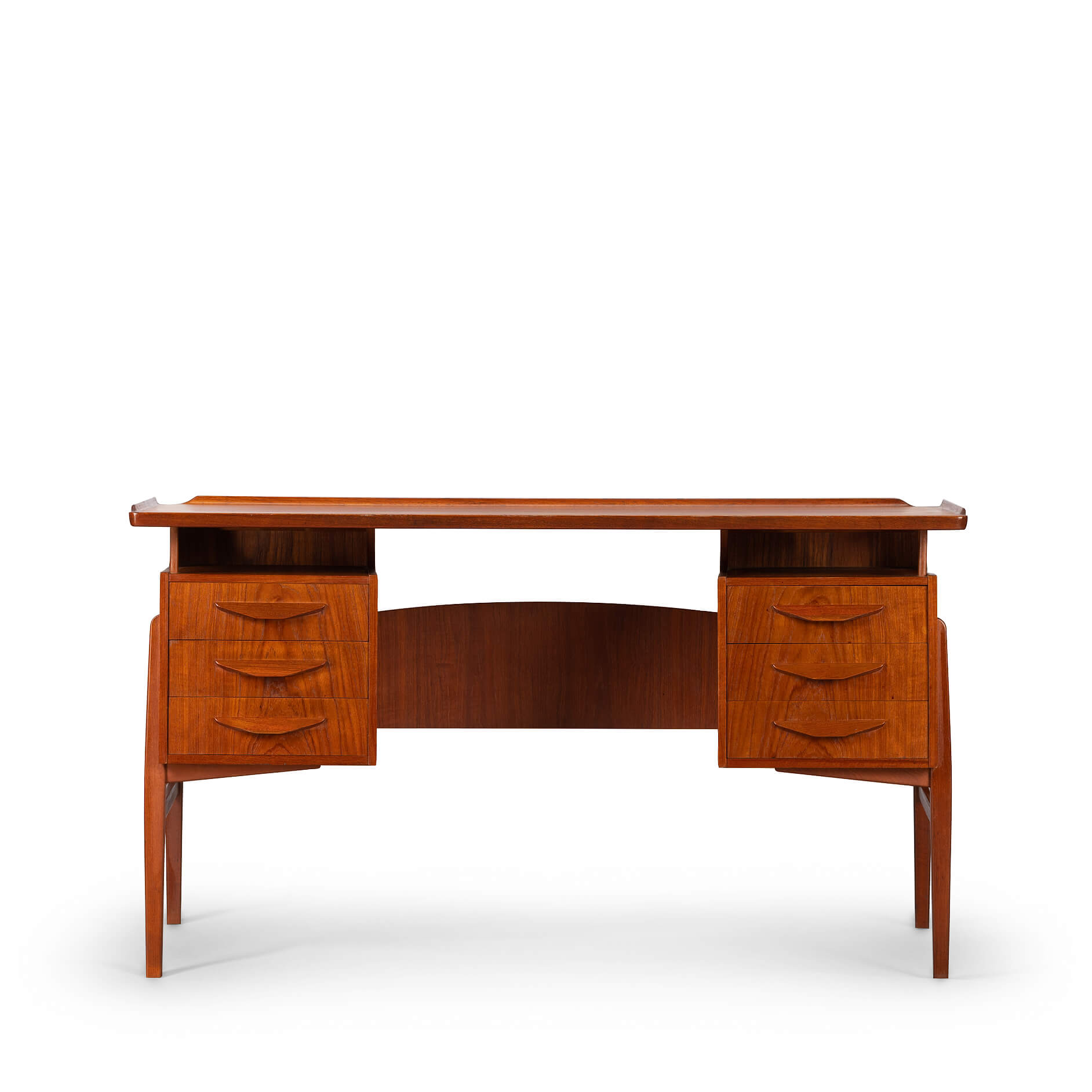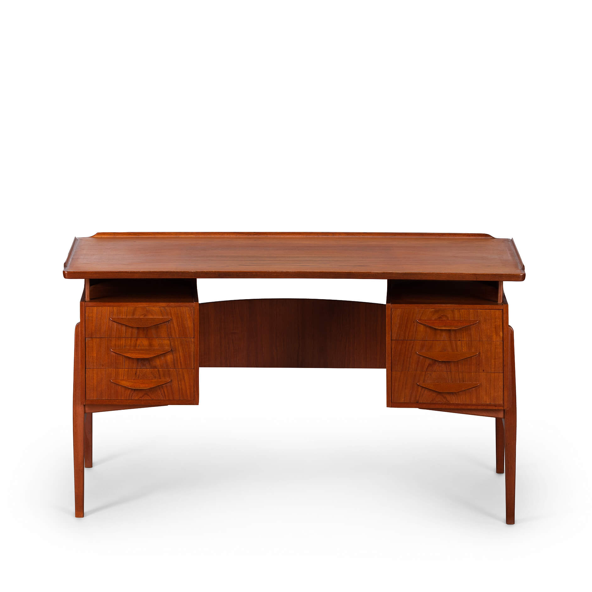 This fab mid century desk in teak veneer from the mid sixties is from Denmark. We have revived the piece with a new coat of hard oil. Some discolouration due to the underlay on the top of the desk doesn't distract too much actually. Nice raised edge prevent papers and pens to fall. It does remind of an Arne Vodder desk but it is not. Two three drawer blocks on the front and two compartments on the back that can be closed with a drop down. Special twist is the left back side which is fully finished on the inside as bar section. On the right one small shelf is missing inside the cabinet. The legs of the desk are of solid teak and nicely cut.