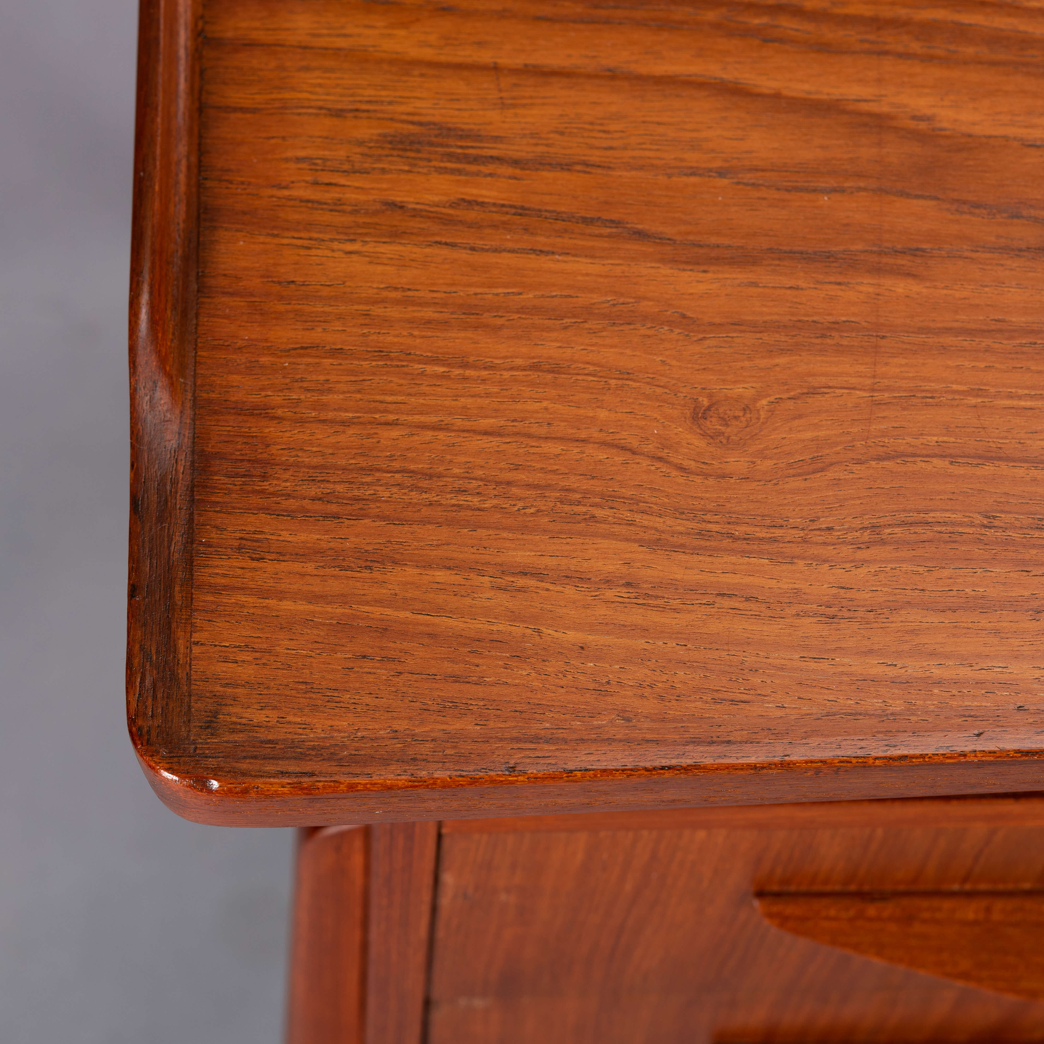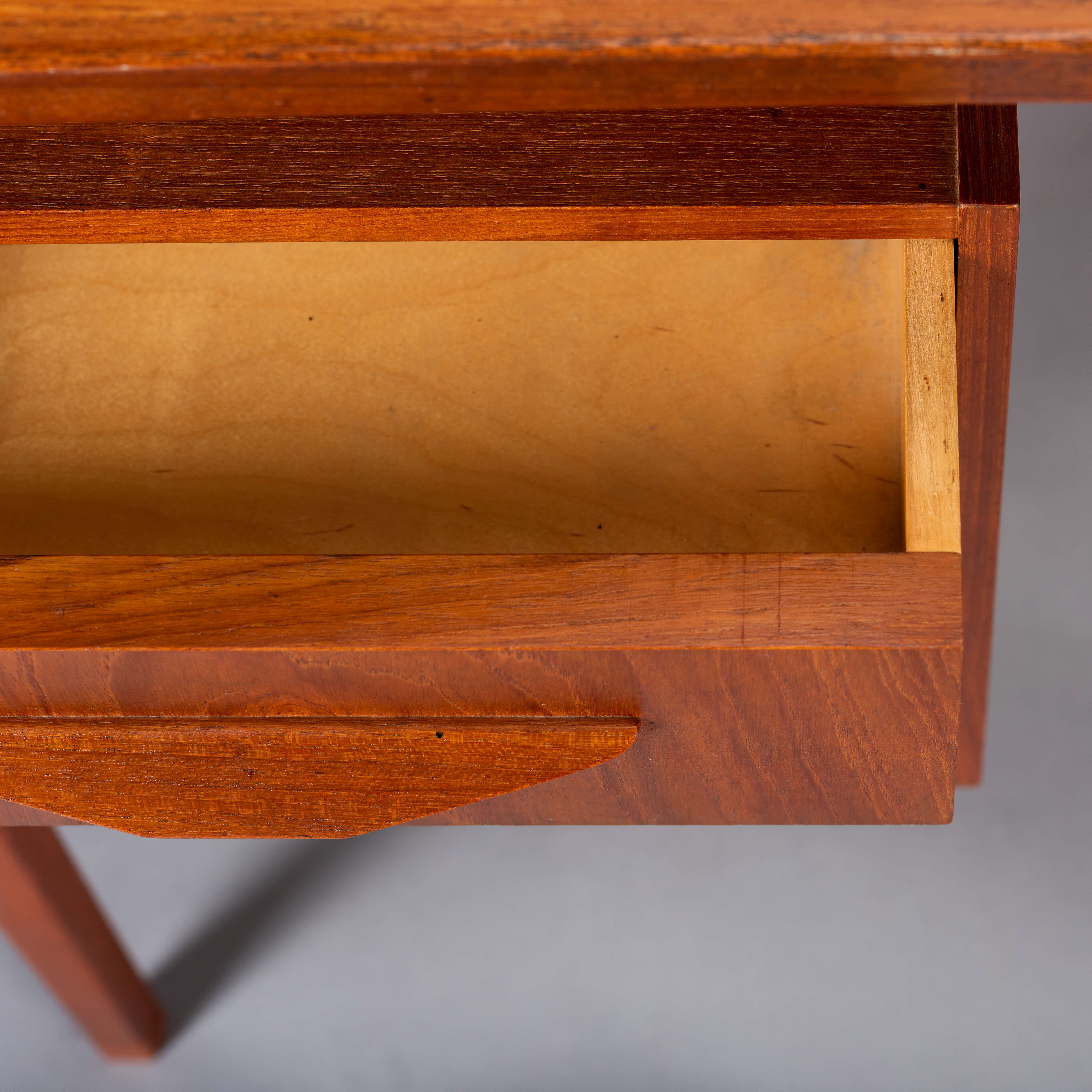 This desk has aged for over 50 years and has some discolourations and scuff marks. Also the drawer are used in those 50 years and have some wear. Overall however the desk is in a good vintage condition with the reoiled top