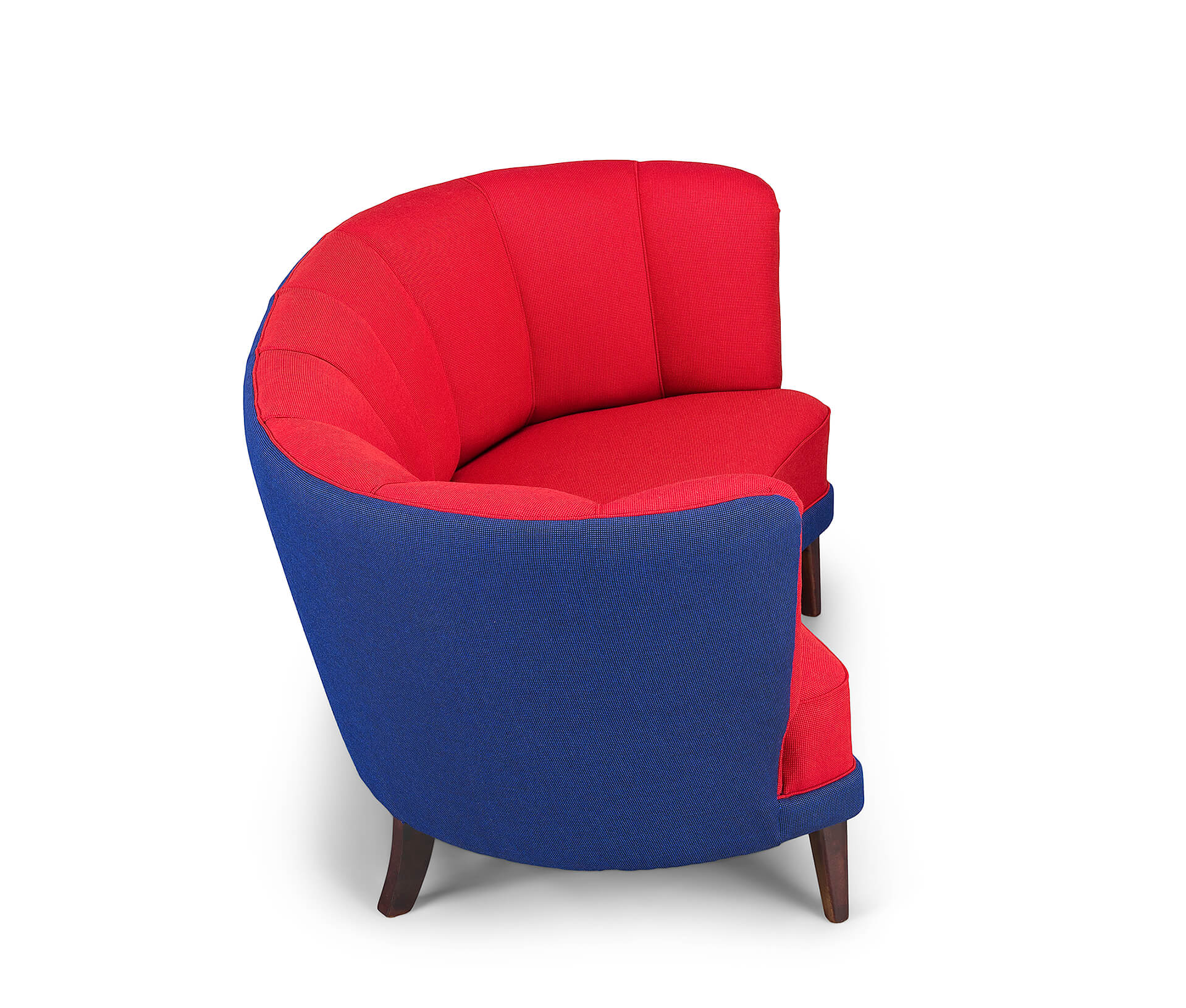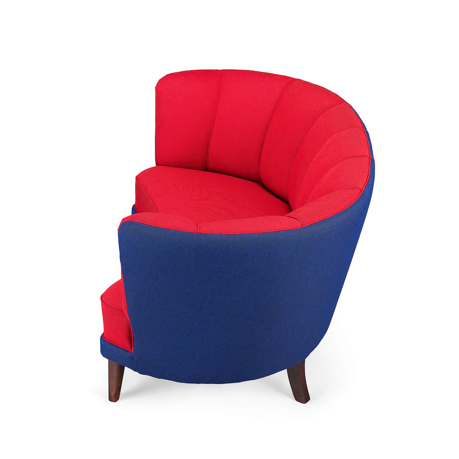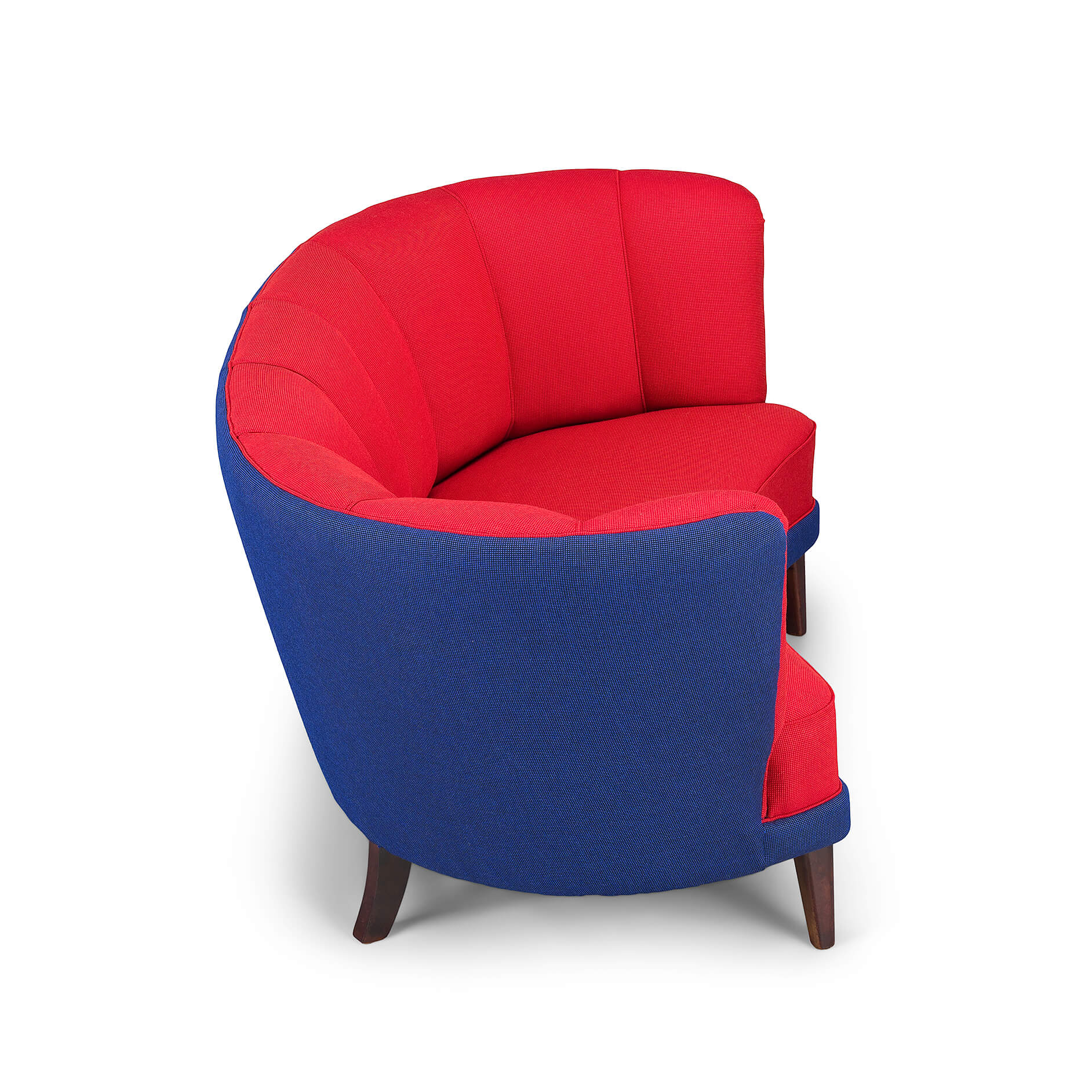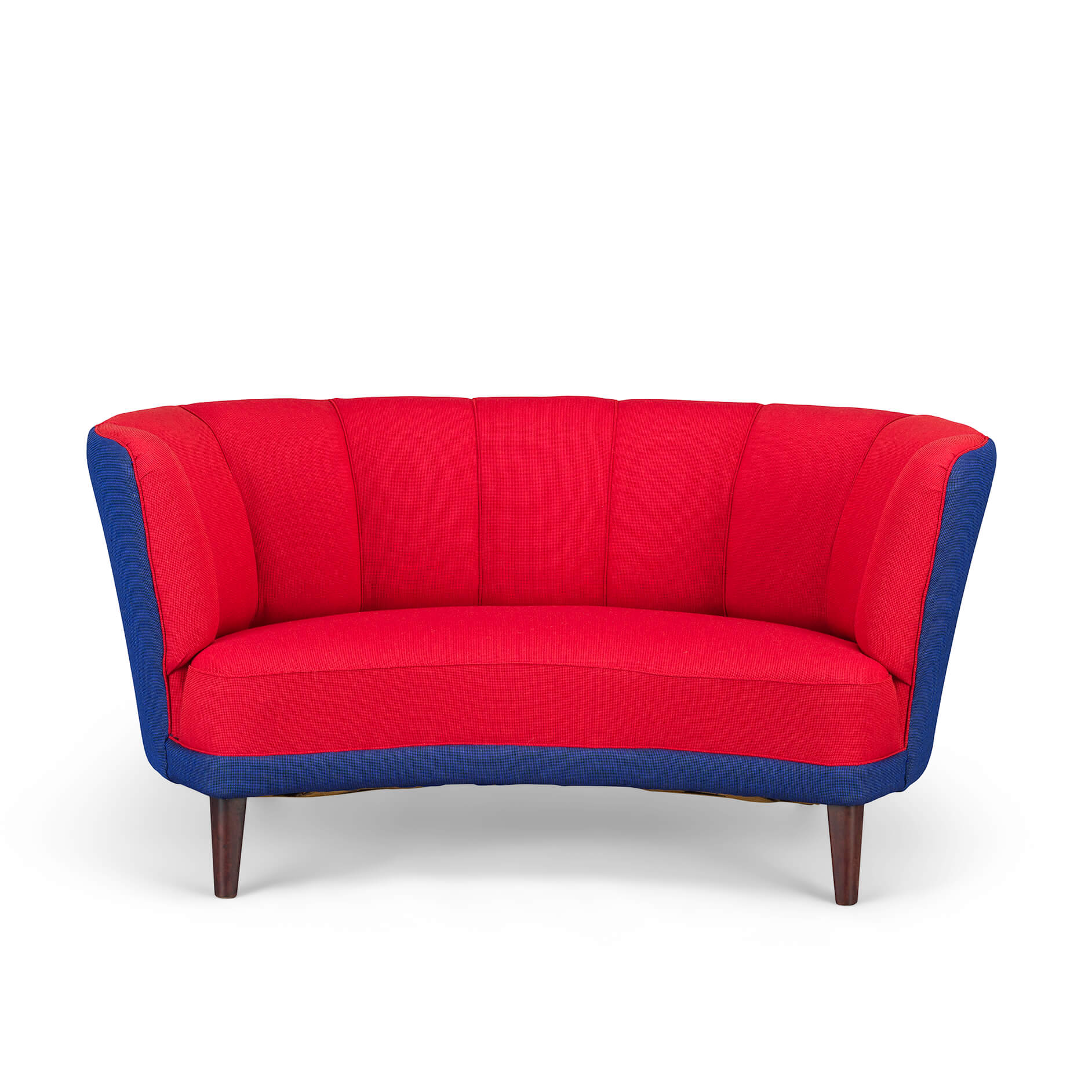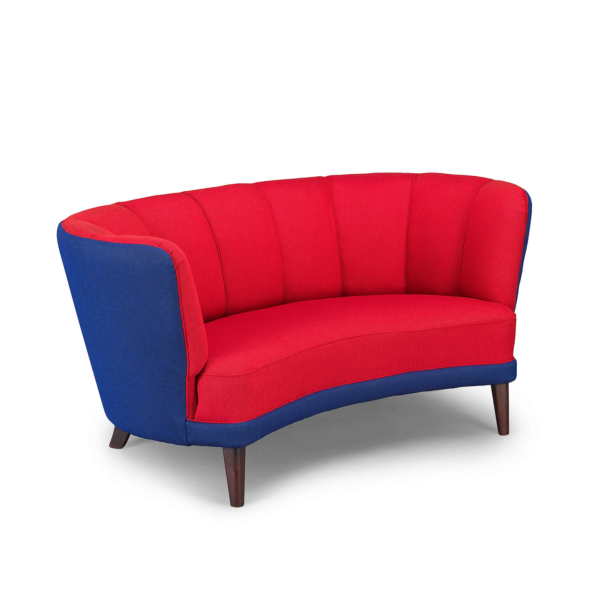 Exuberant Danish Banana Sofa by Slagelse Møbelvaerk in vibrant red and violet blue wool. This mid century sofa is a late 1950s or early 1960s sofa by Slagelse Møbelvaerk, made in the manner of Modernist Danish architect, Flemming Lassen. The voluptuous curves of the sofa draw you inside, embracing and comforting you. The sofa has tinted oak legs and is fully reupholstered with new De Ploeg Accent uni Fabric: color numbers 16-44 en 21-11. The foam and springs are also renewed. As it stands 60 years from its creation it is again in an excellent vintage condition.