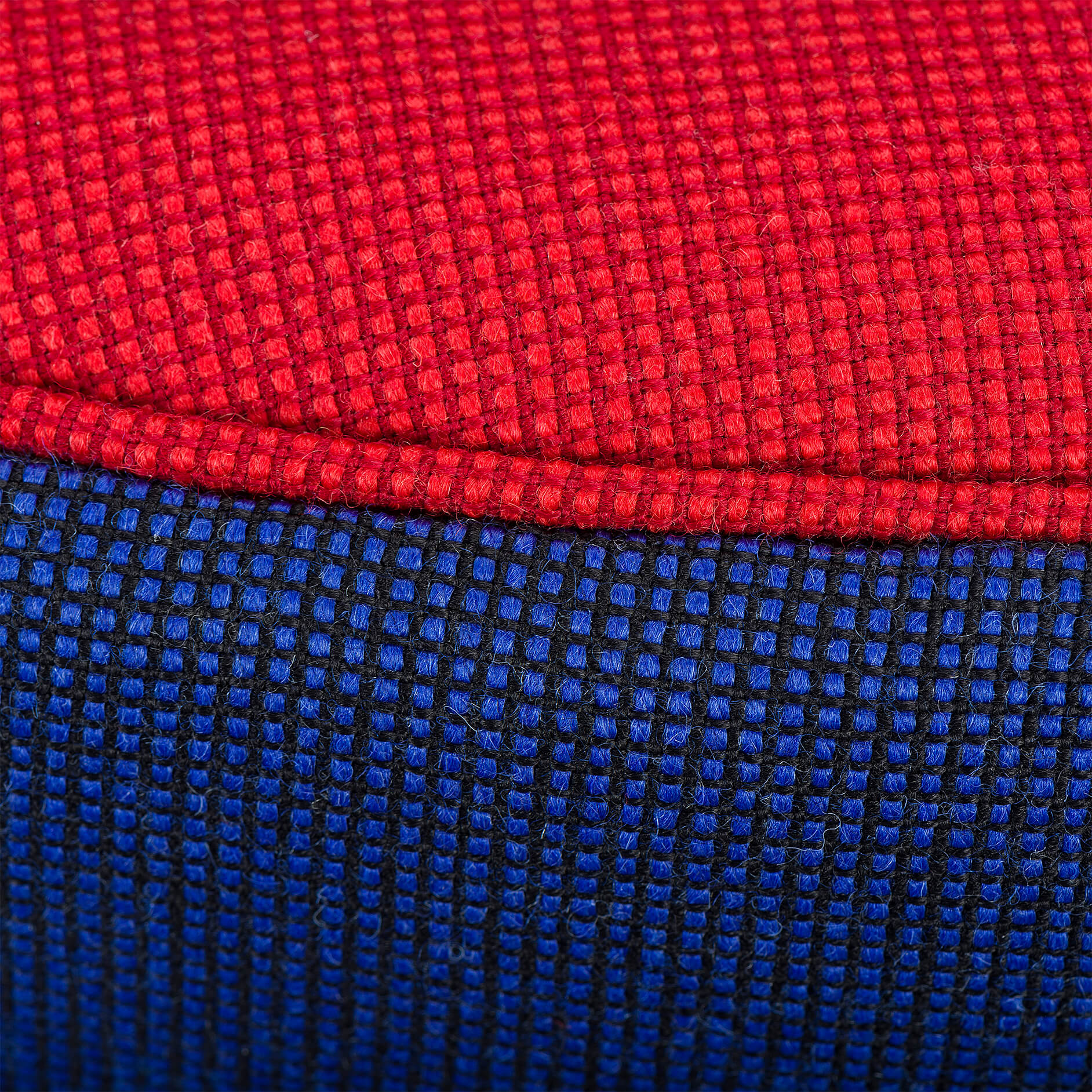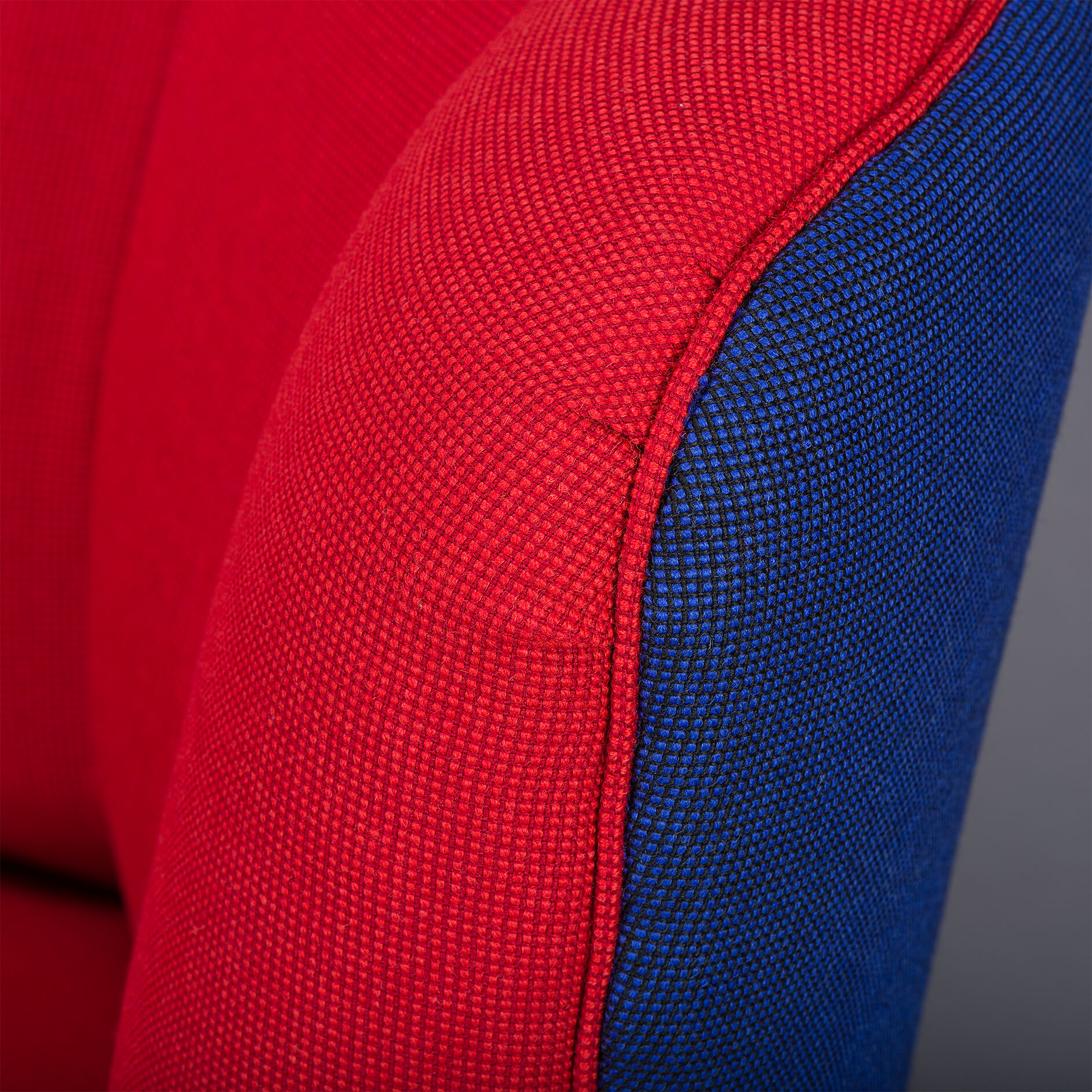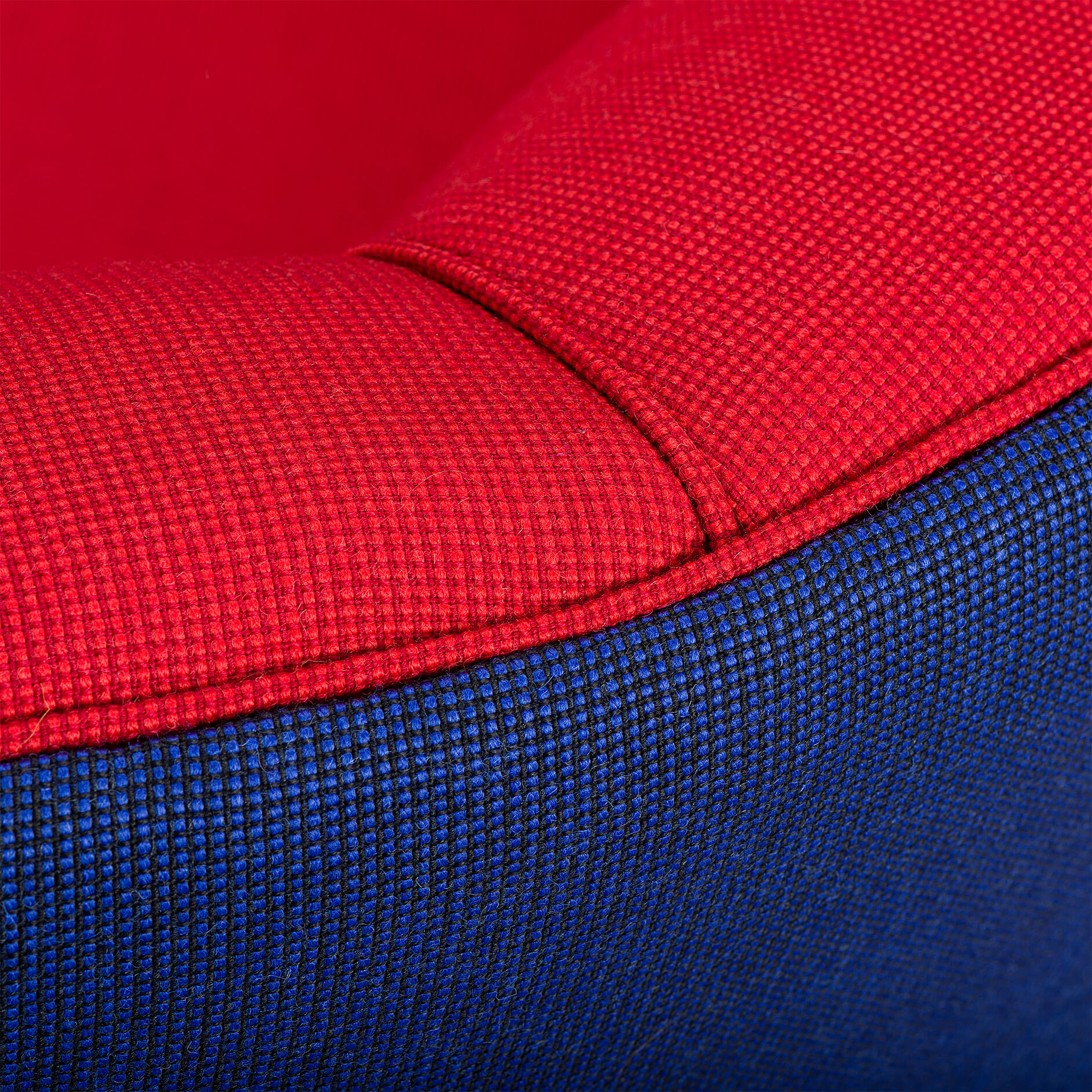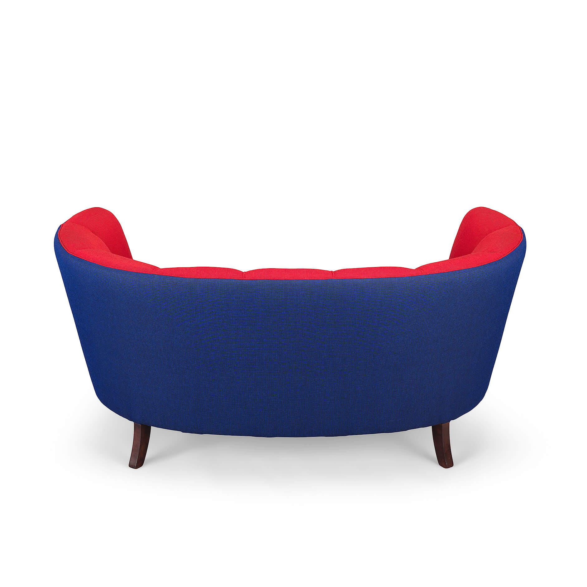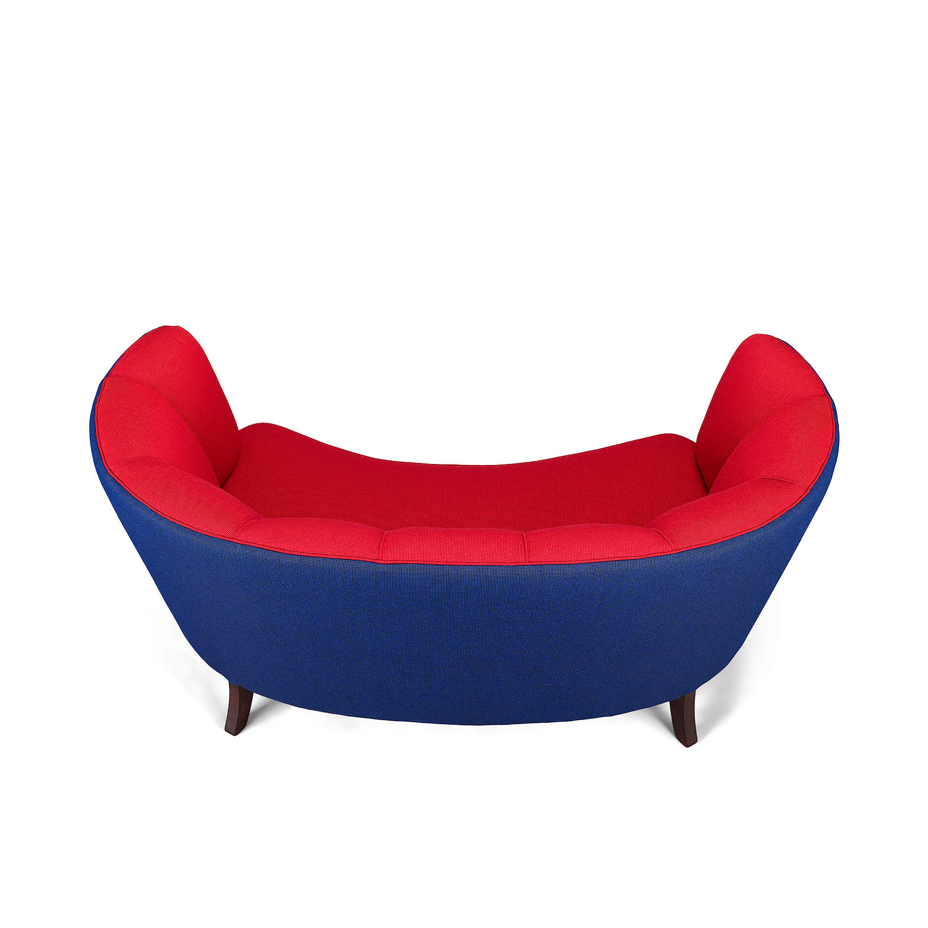 Exuberant Danish Banana Sofa by Slagelse Møbelvaerk in vibrant red and violet blue wool. This mid century sofa is a late 1950s or early 1960s sofa by Slagelse Møbelvaerk, made in the manner of Modernist Danish architect, Flemming Lassen. The voluptuous curves of the sofa draw you inside, embracing and comforting you. The sofa has tinted oak legs and is fully reupholstered with new De Ploeg Accent uni Fabric: color numbers 16-44 en 21-11. The foam and springs are also renewed. As it stands 60 years from its creation it is again in an excellent vintage condition.