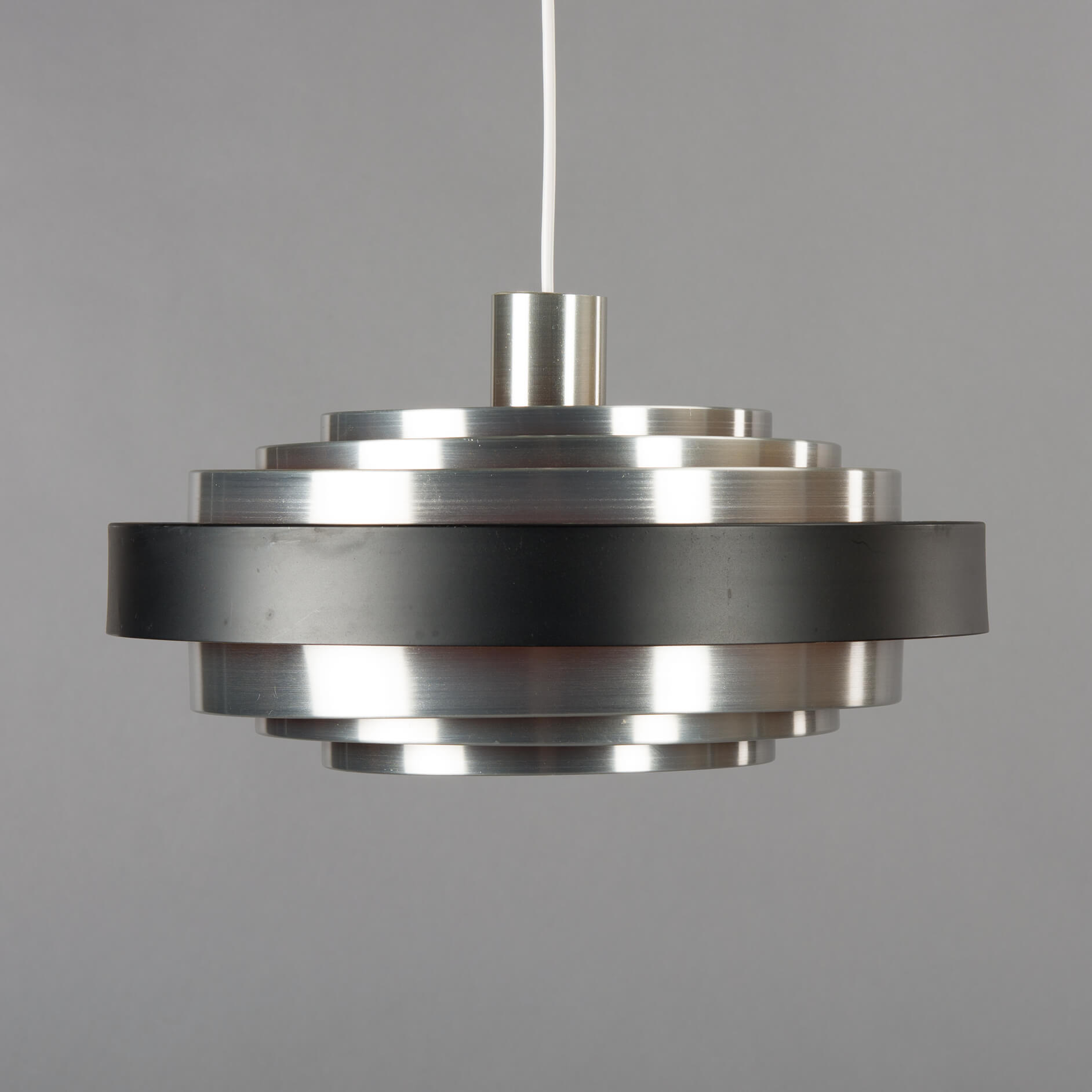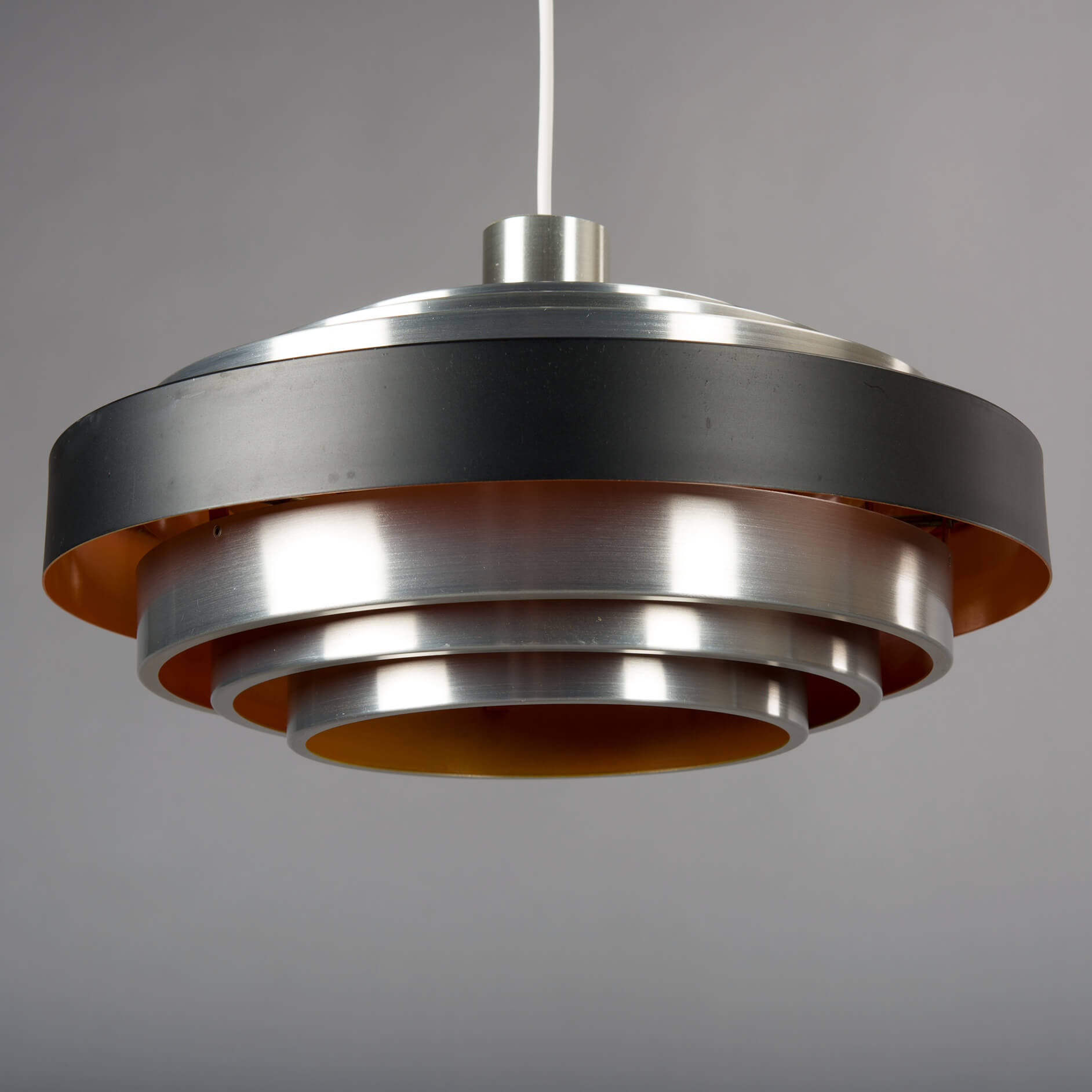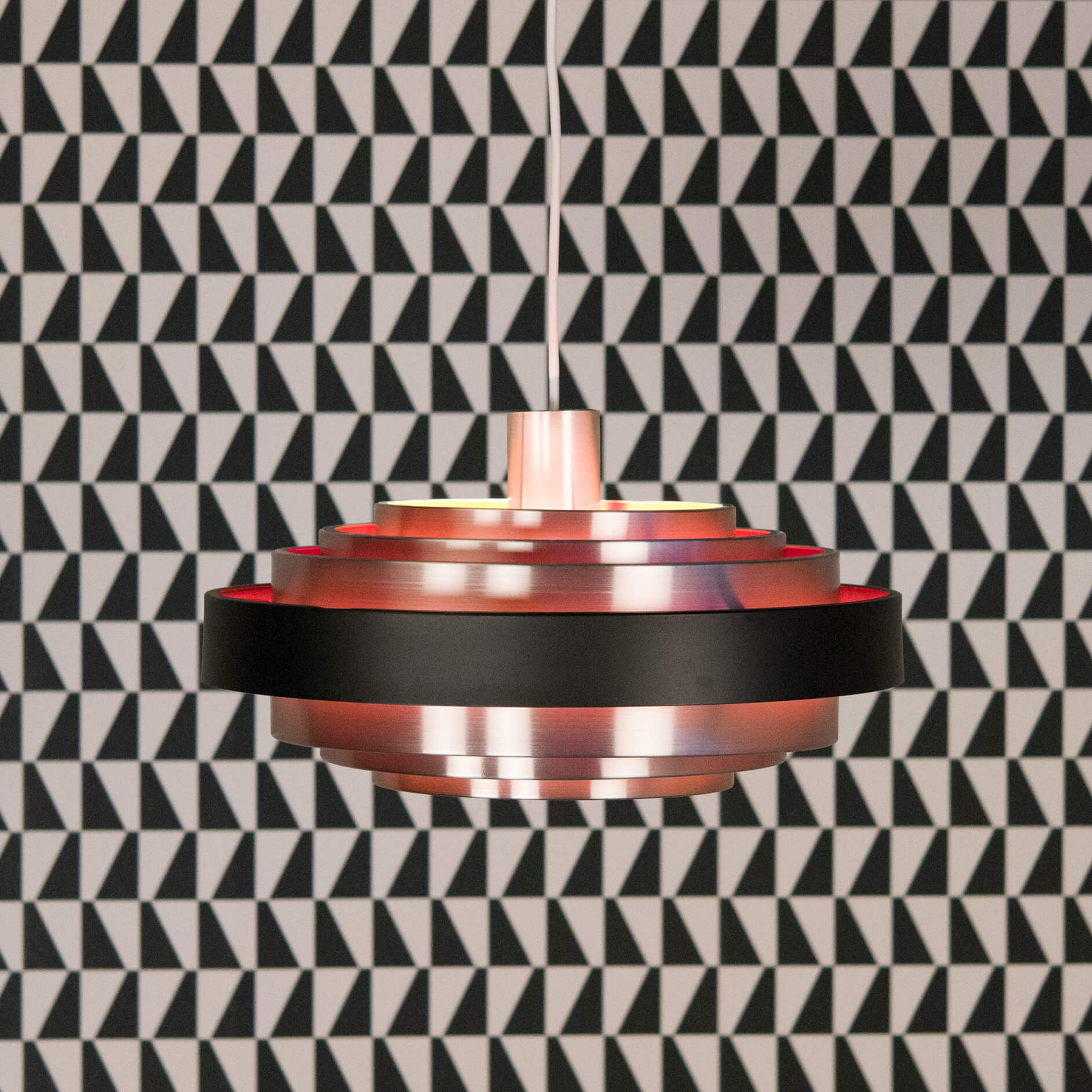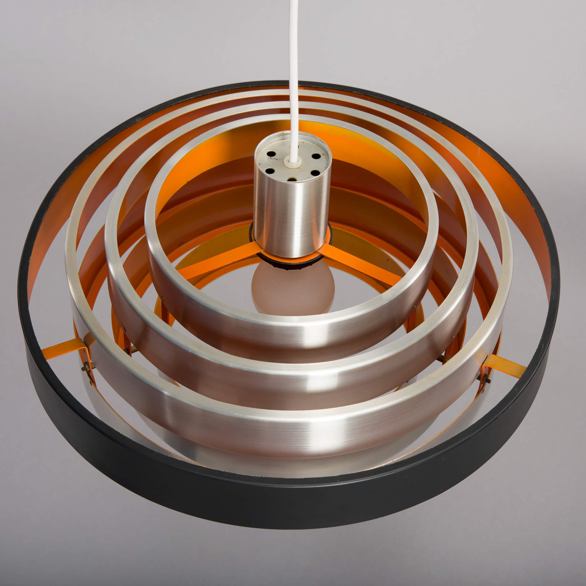 The lamp consists of seven rings. The 'Ultra' was made in various combinations of colors and materials. This one is aluminum with one big black ring. The inside is orange wich creates a beautiful warm light.
