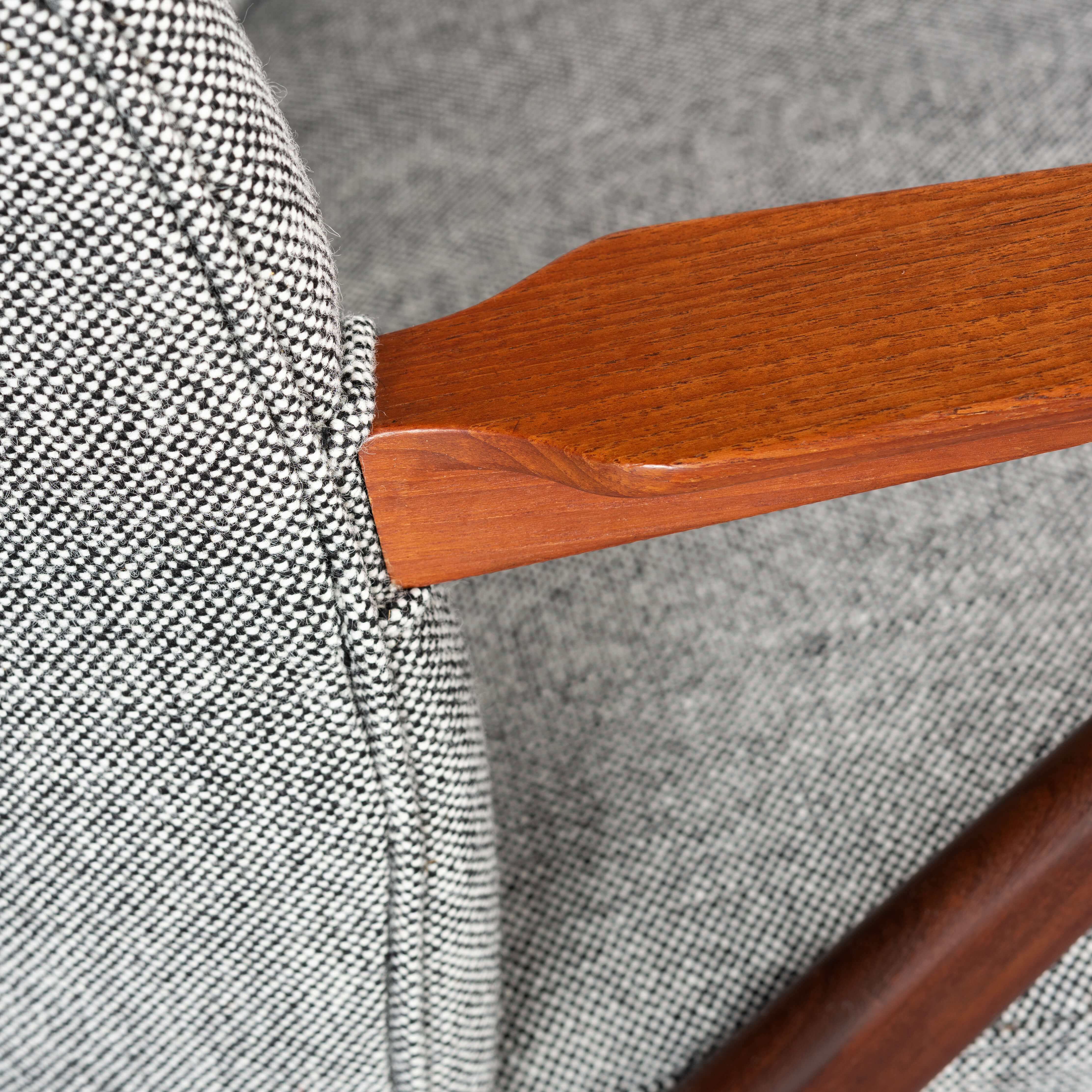 Stunning pair of fully reupholstered Danish lounge chairs designed by Kurt Olsen and made by Slagelse from the mid sixties. Armrests and legs are made from solid teak and to reupholster a Kvadrat Hallingdal 65 wool has been selected. This Kvadrat fabric was designed by Nanna Ditzel (one of the most well known Danish midcentury designers) and comprises wool and viscose. Either way, it totally adds to the vibe and comfort these chairs breathe and really completes the aesthetic, they are spot on!
