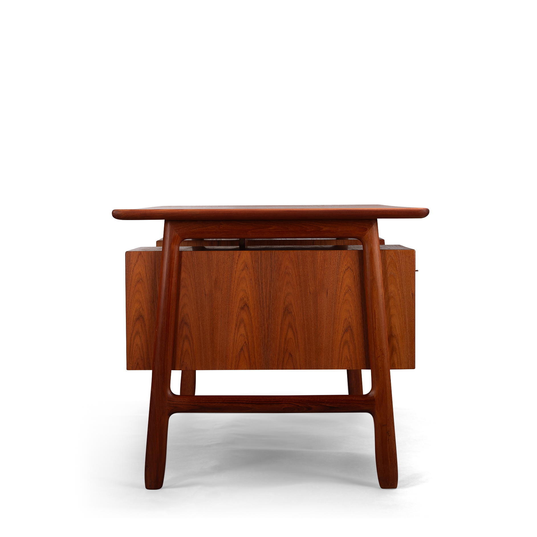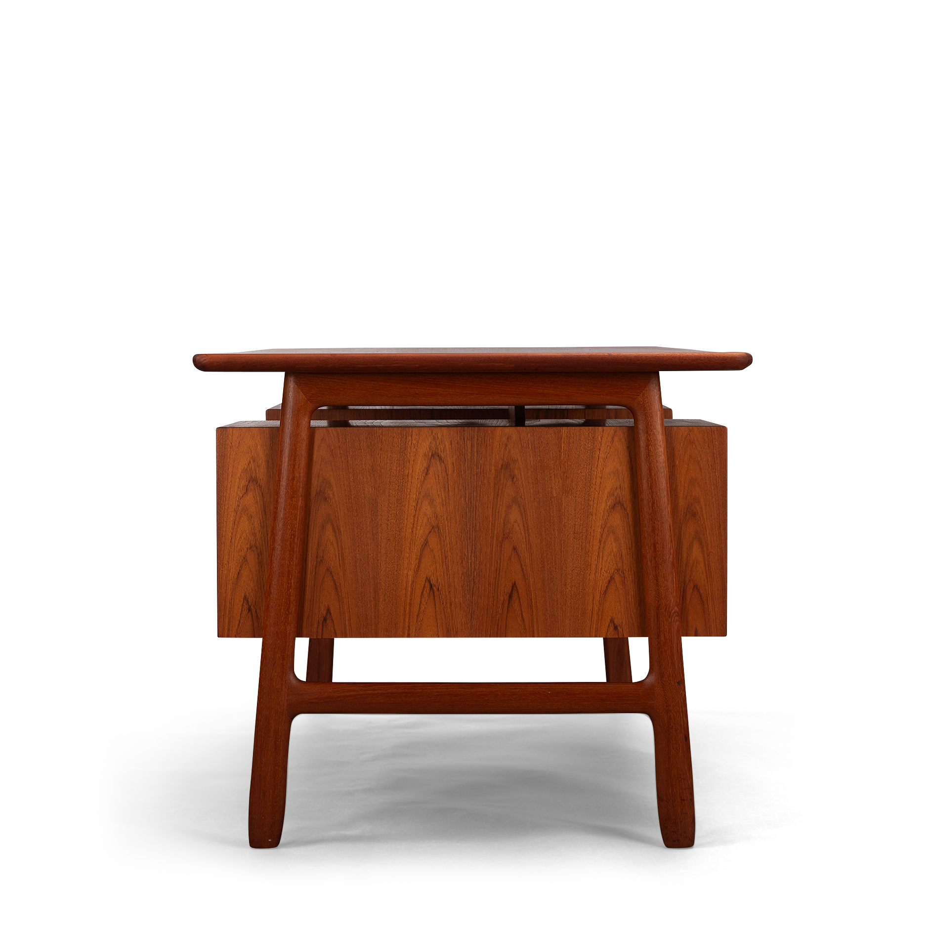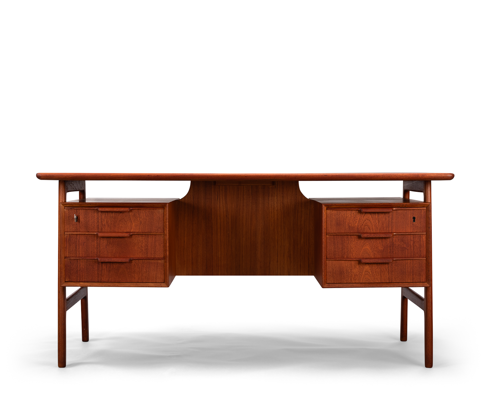 Splendid midcentury Danish modern ''model 75'' executive desk designed by Gunni Omann for Omann Jun Møbelfabrik in the 1950s. This refinished vintage desk features six drawers with elegant sculpted wood pulls. Additional storage space is found on the backside with two open bookshelves and a fall-front compartment. Solid teak legs support a floating tabletop allowing for additional storage space underneath the leaf of the desk.