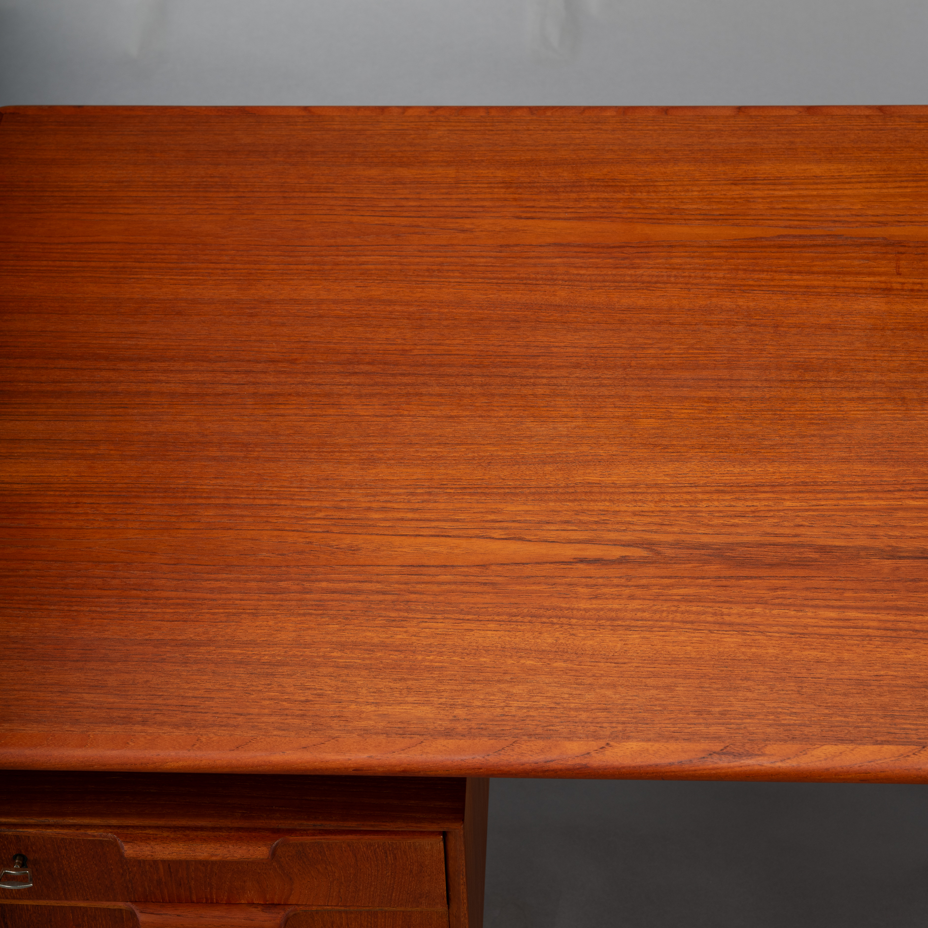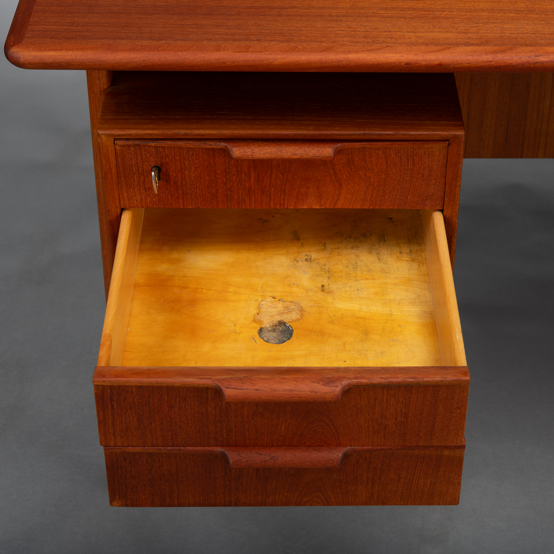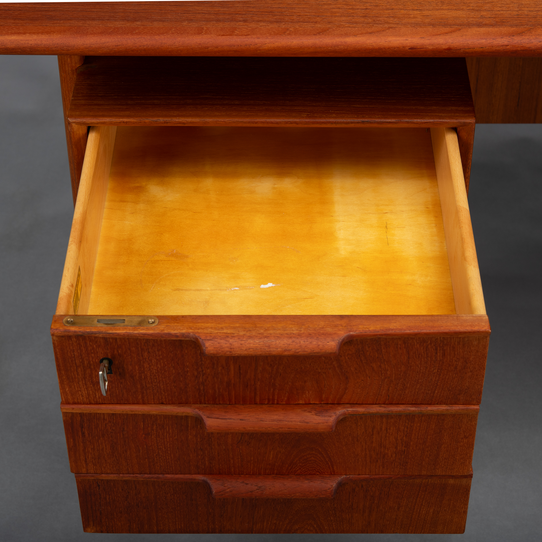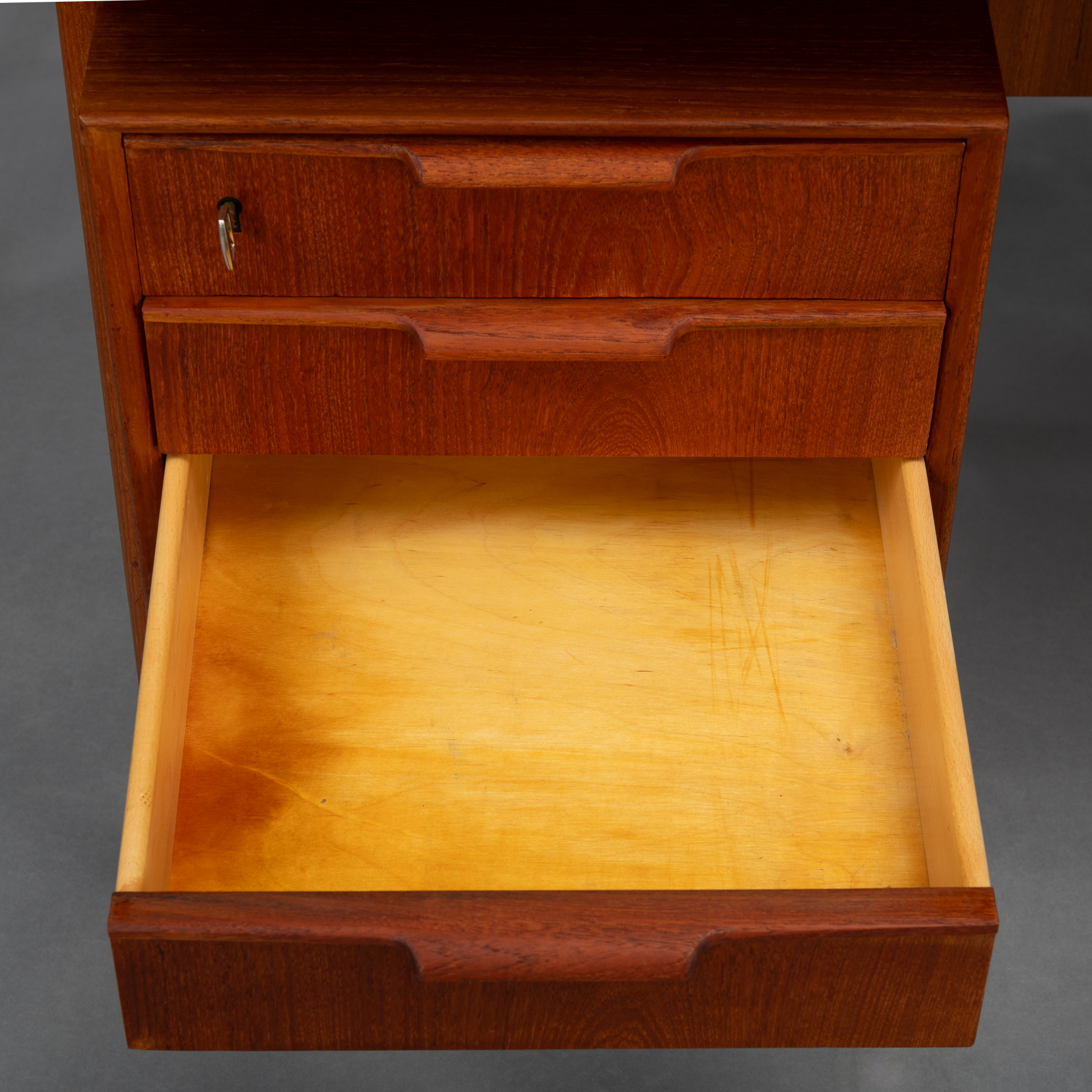 Constructed of solid teak with teak veneers more that half a century ago it shows minor signs of age and use. It is really in very good vintage condition. Only a stripe of coloring on the leaf, see photo. The desk comes fully assembled with keys included.