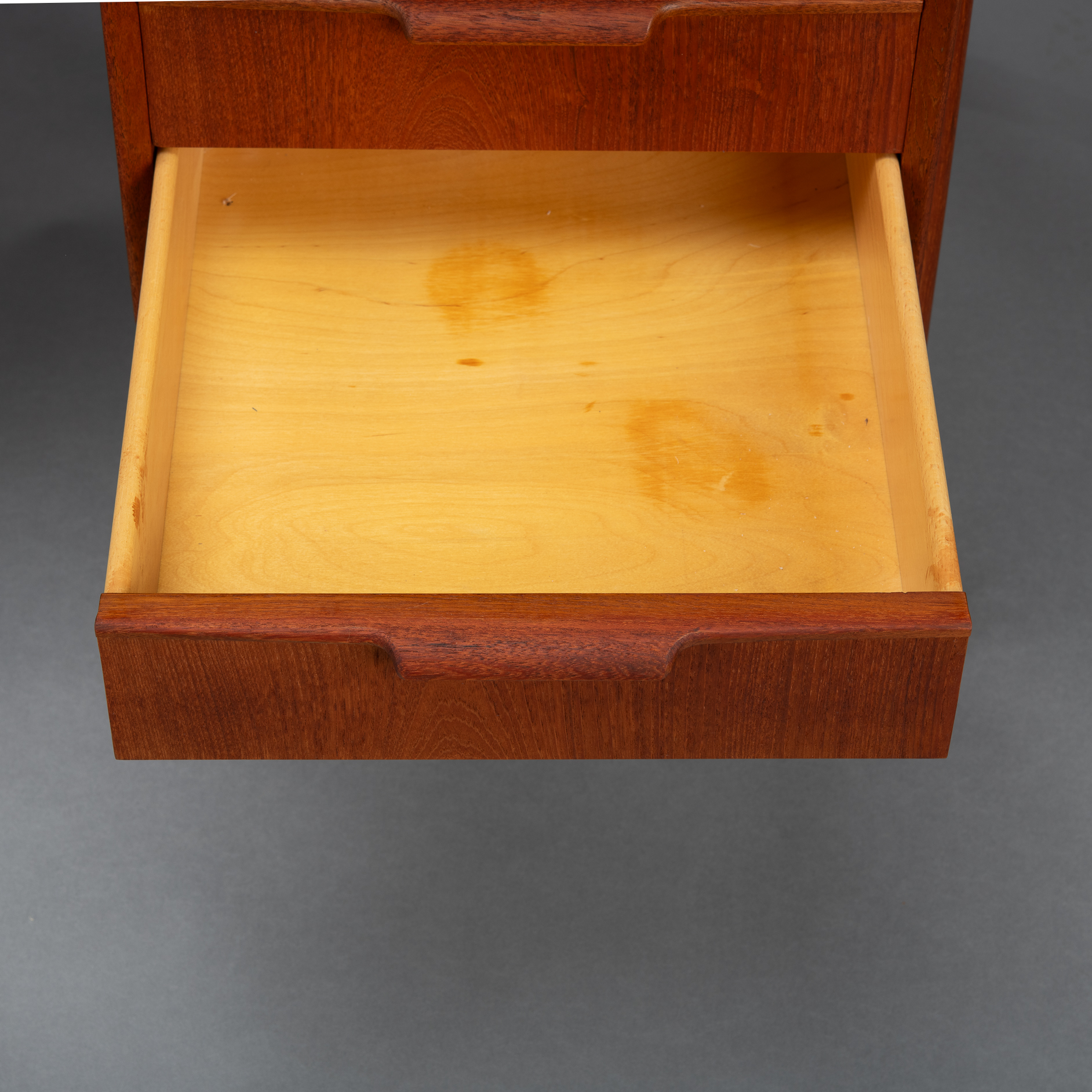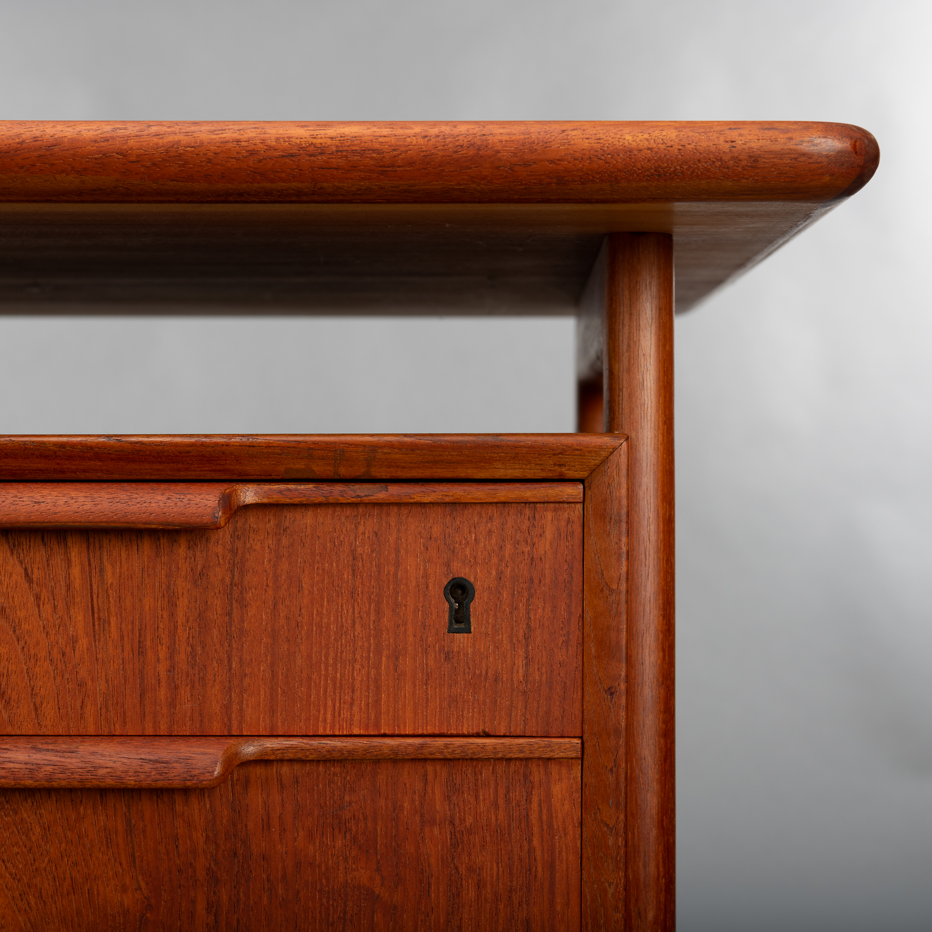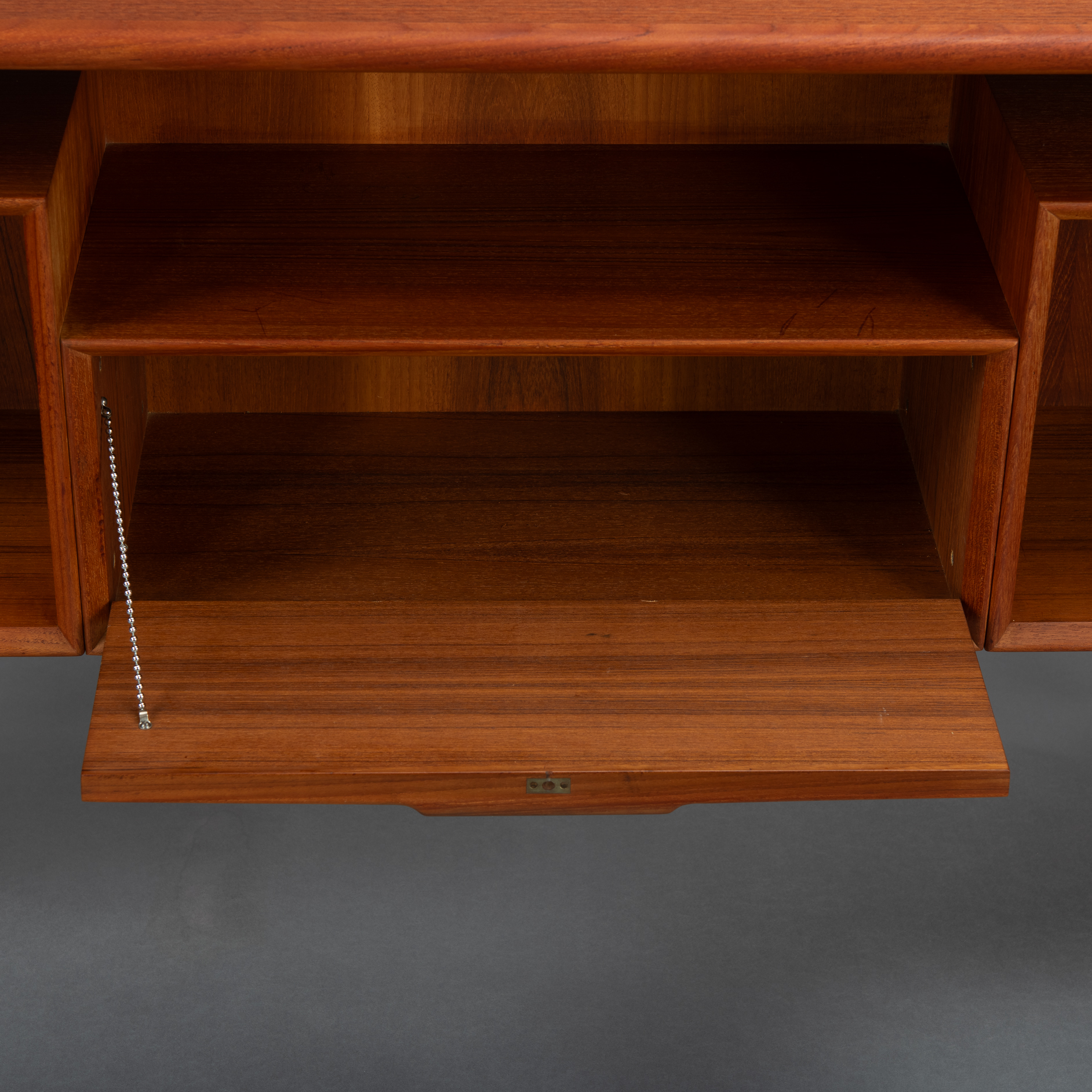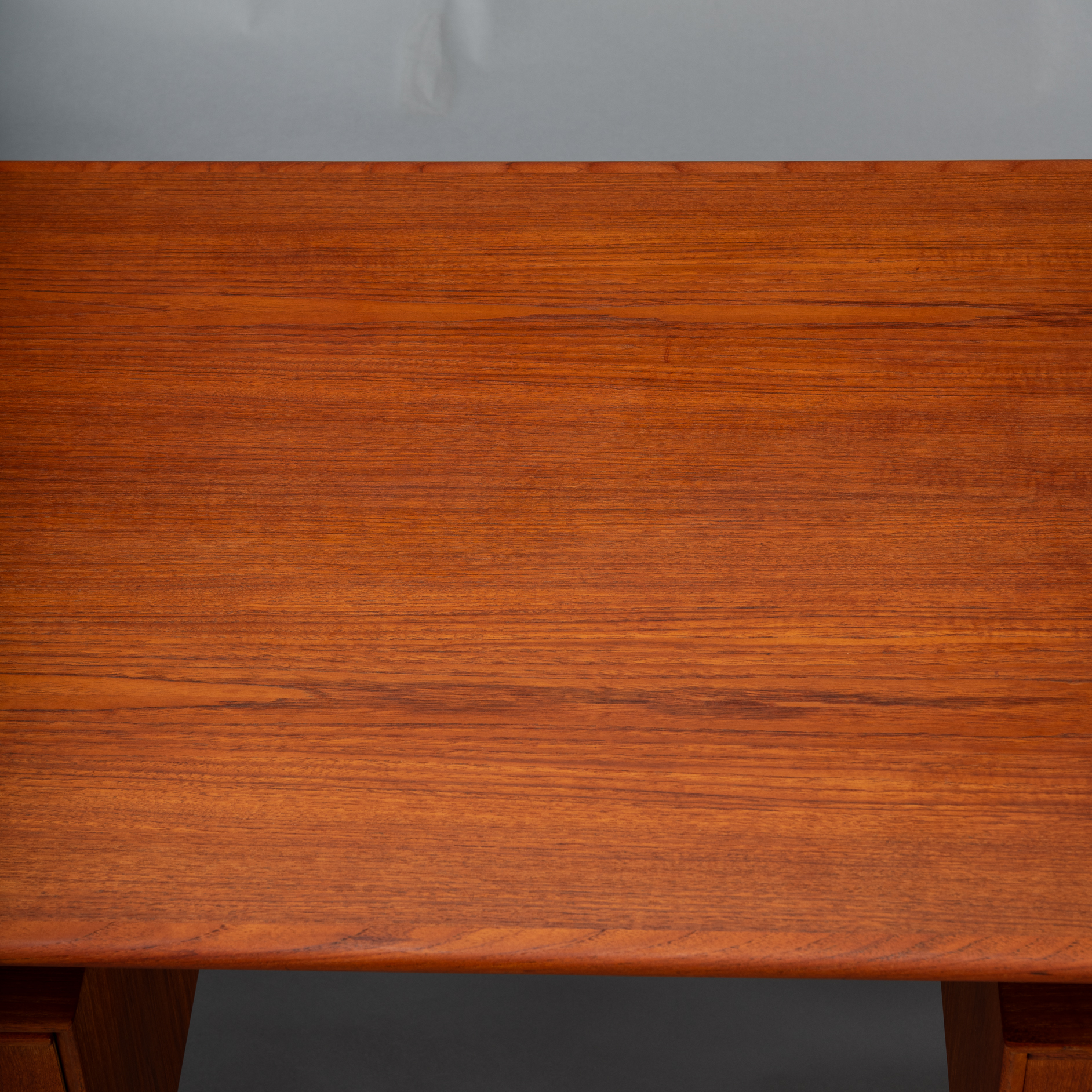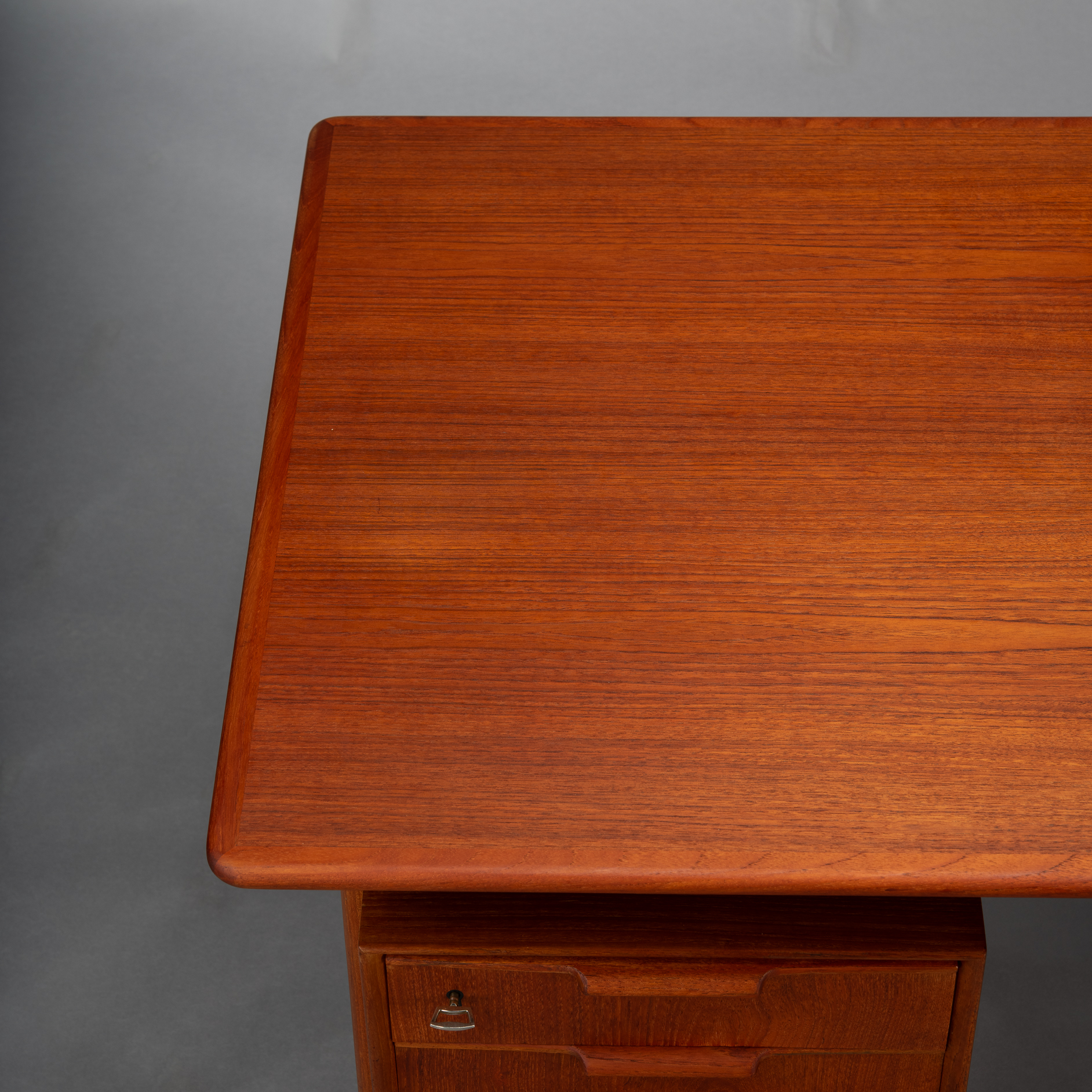 Constructed of solid teak with teak veneers more that half a century ago it shows minor signs of age and use. It is really in very good vintage condition. Only a stripe of coloring on the leaf, see photo. The desk comes fully assembled with keys included.