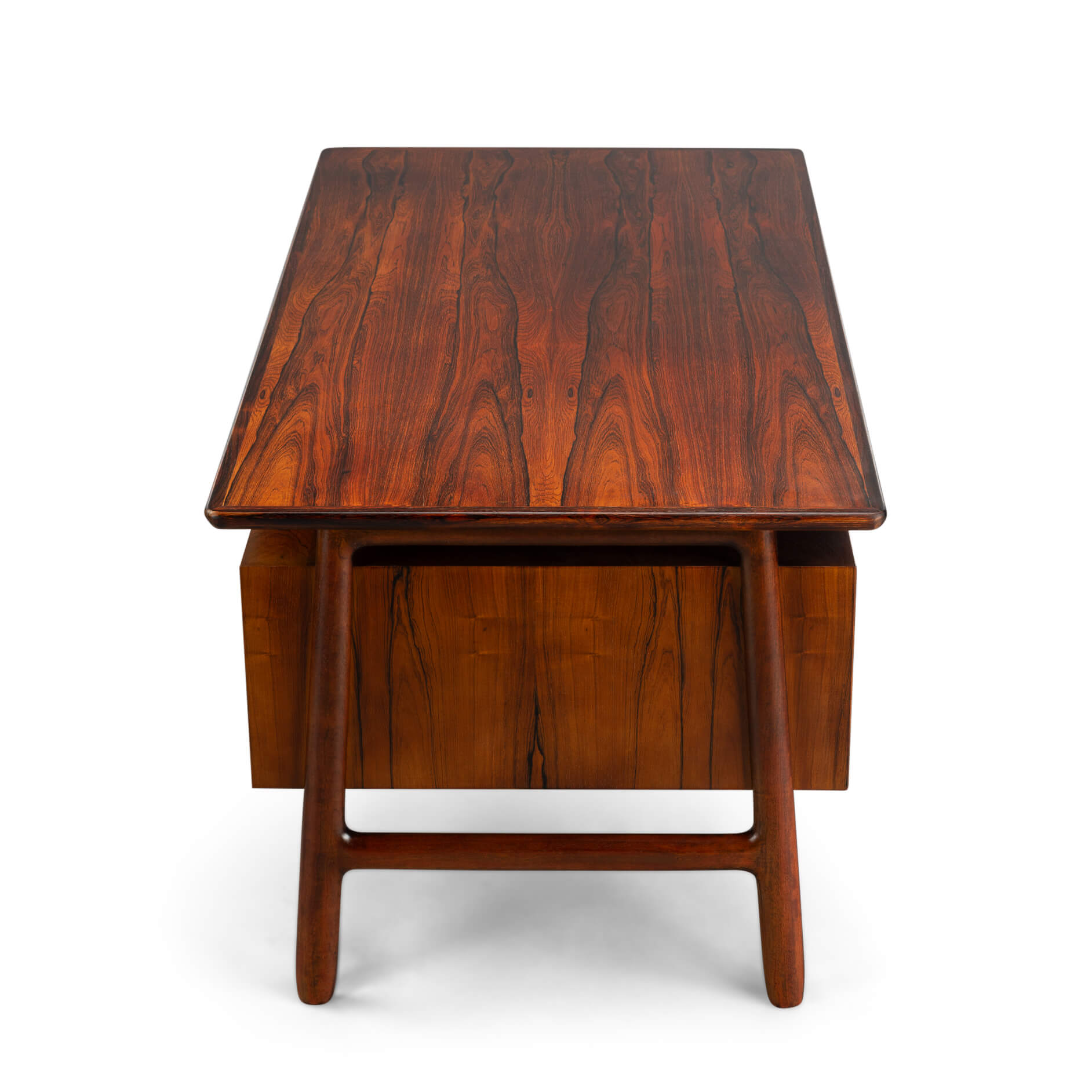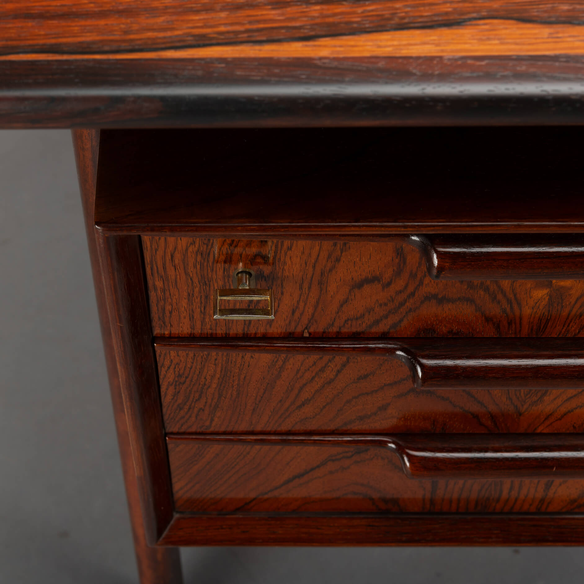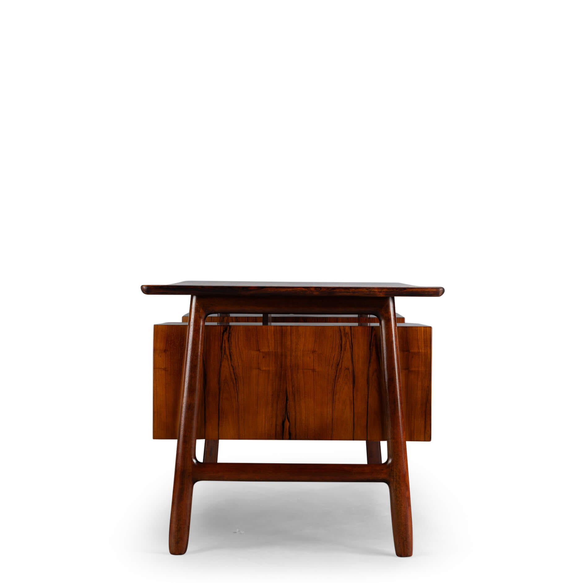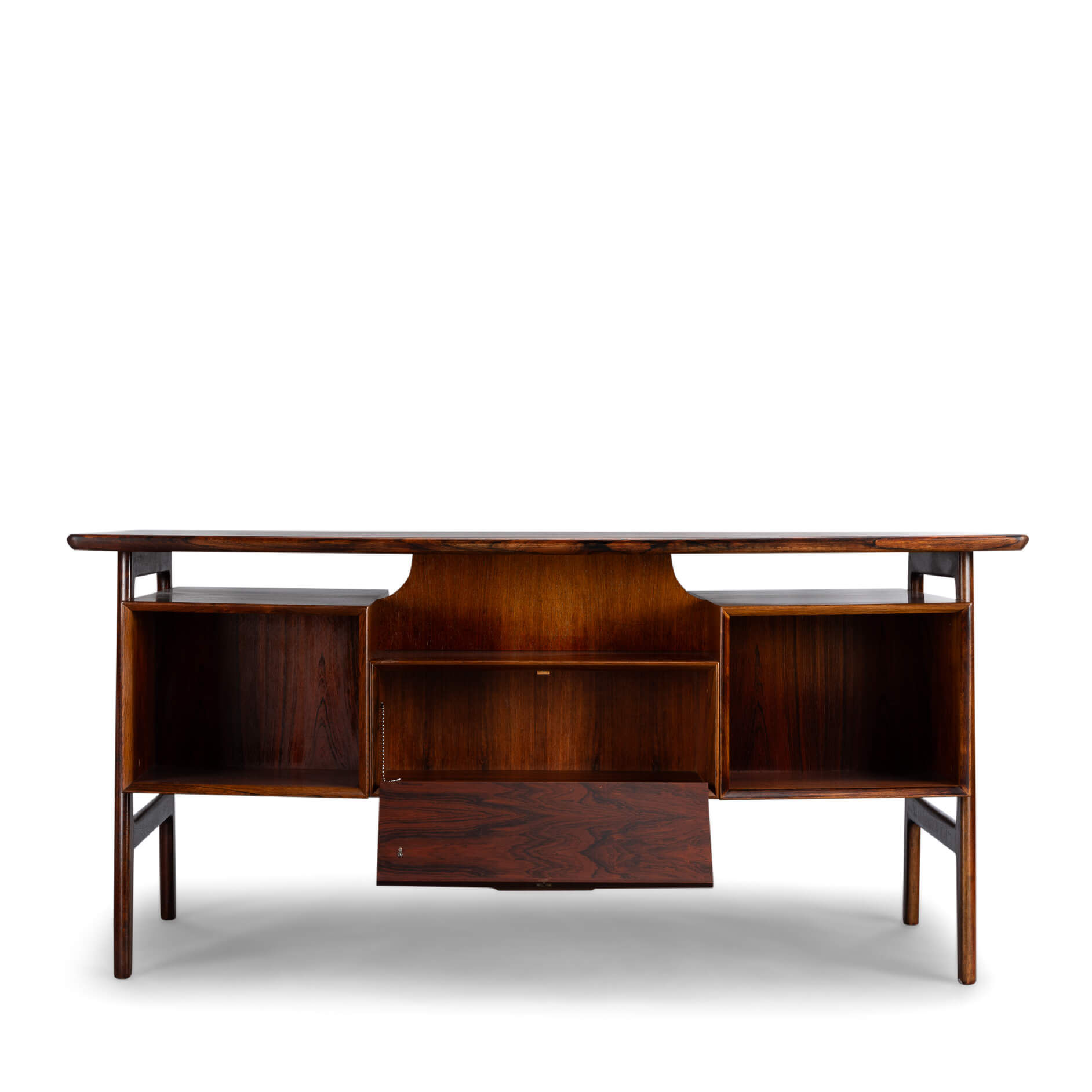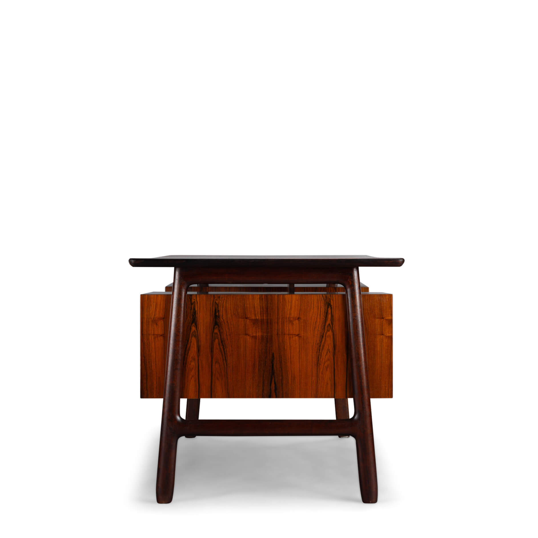 Splendid midcentury Danish modern ''model 75'' executive desk designed by Gunni Omann for Omann Jun Møbelfabrik in the 1950s. This refinished vintage desk features six drawers with elegant sculpted wood pulls. Additional storage space is found on the backside with two open bookshelves and a fall-front compartment. Solid rosewood legs support a floating tabletop allowing for additional storage space underneath the leaf of the desk.