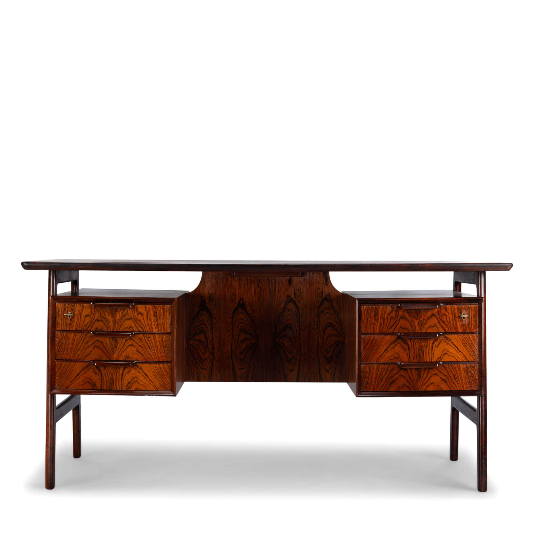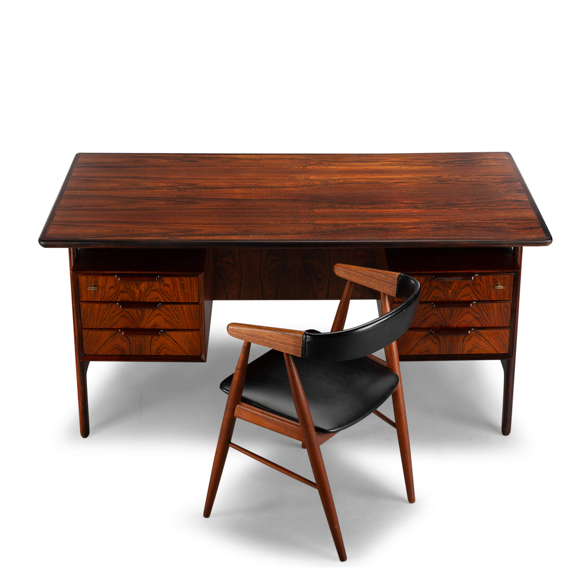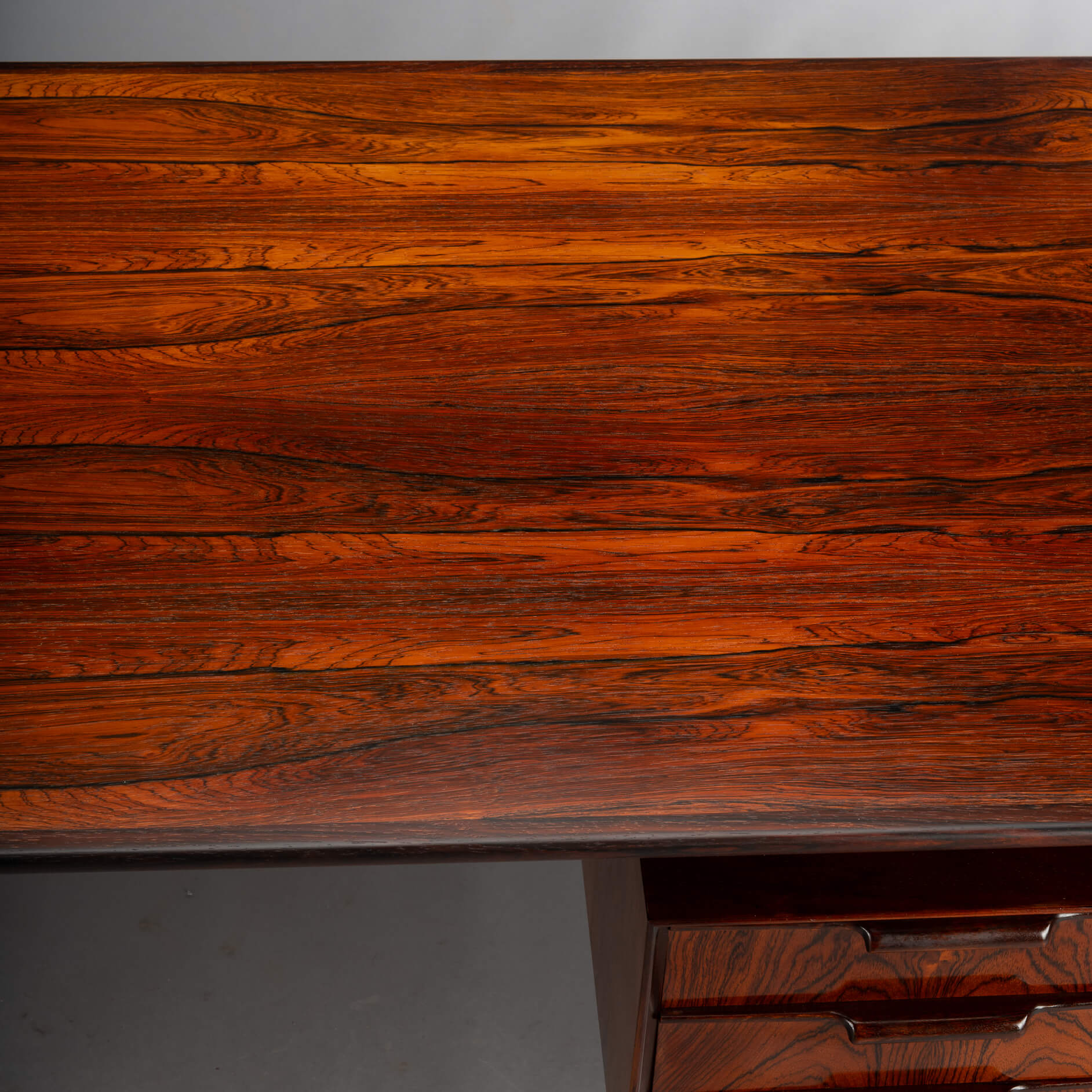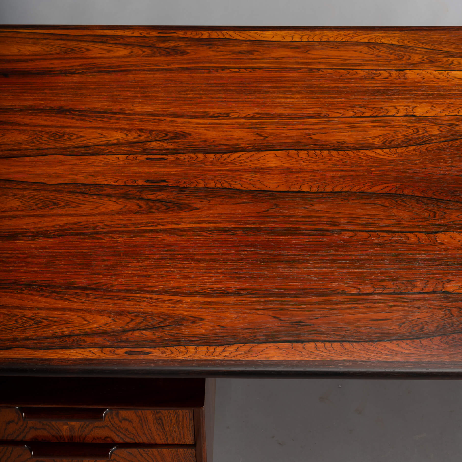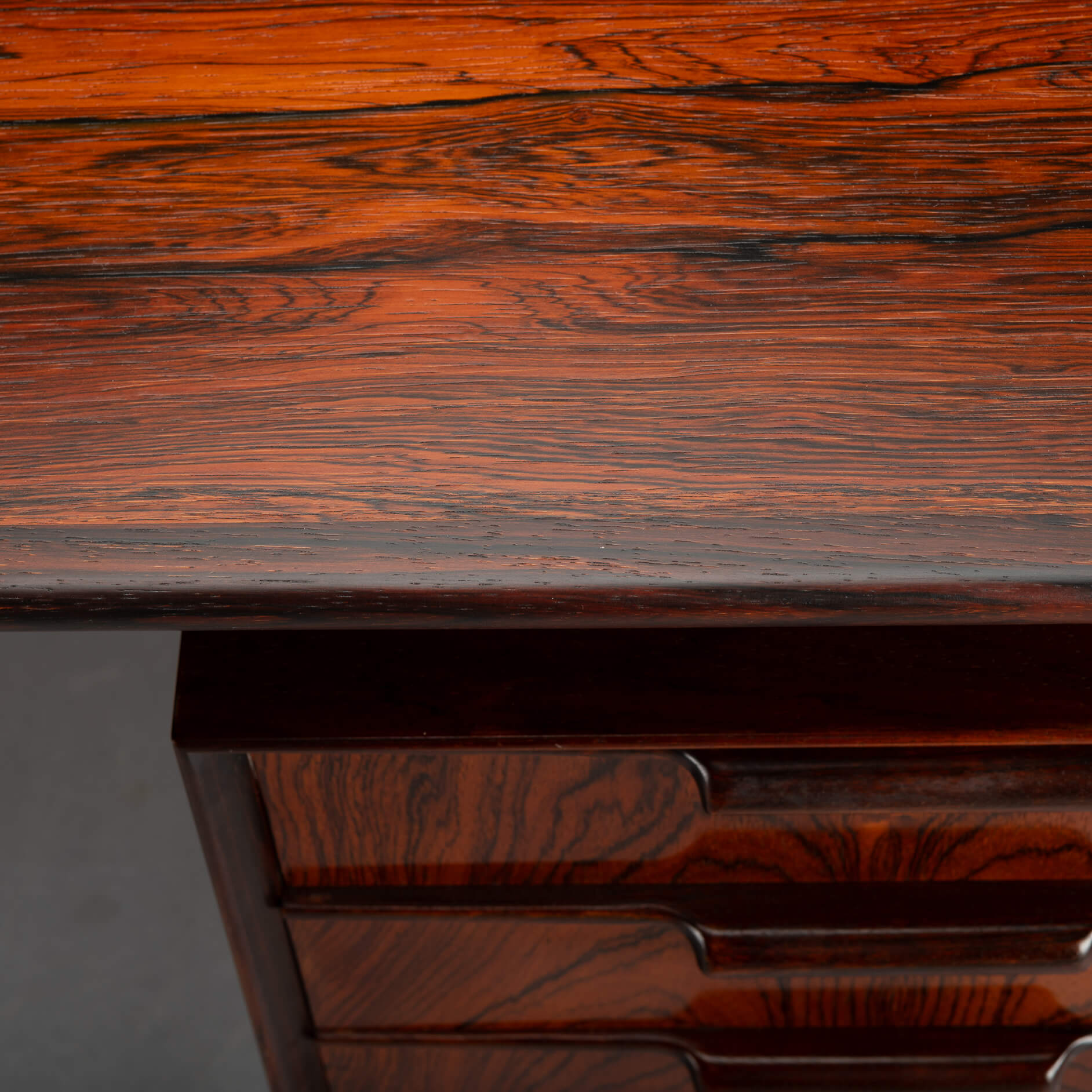 Splendid midcentury Danish modern ''model 75'' executive desk designed by Gunni Omann for Omann Jun Møbelfabrik in the 1950s. This refinished vintage desk features six drawers with elegant sculpted wood pulls. Additional storage space is found on the backside with two open bookshelves and a fall-front compartment. Solid rosewood legs support a floating tabletop allowing for additional storage space underneath the leaf of the desk.