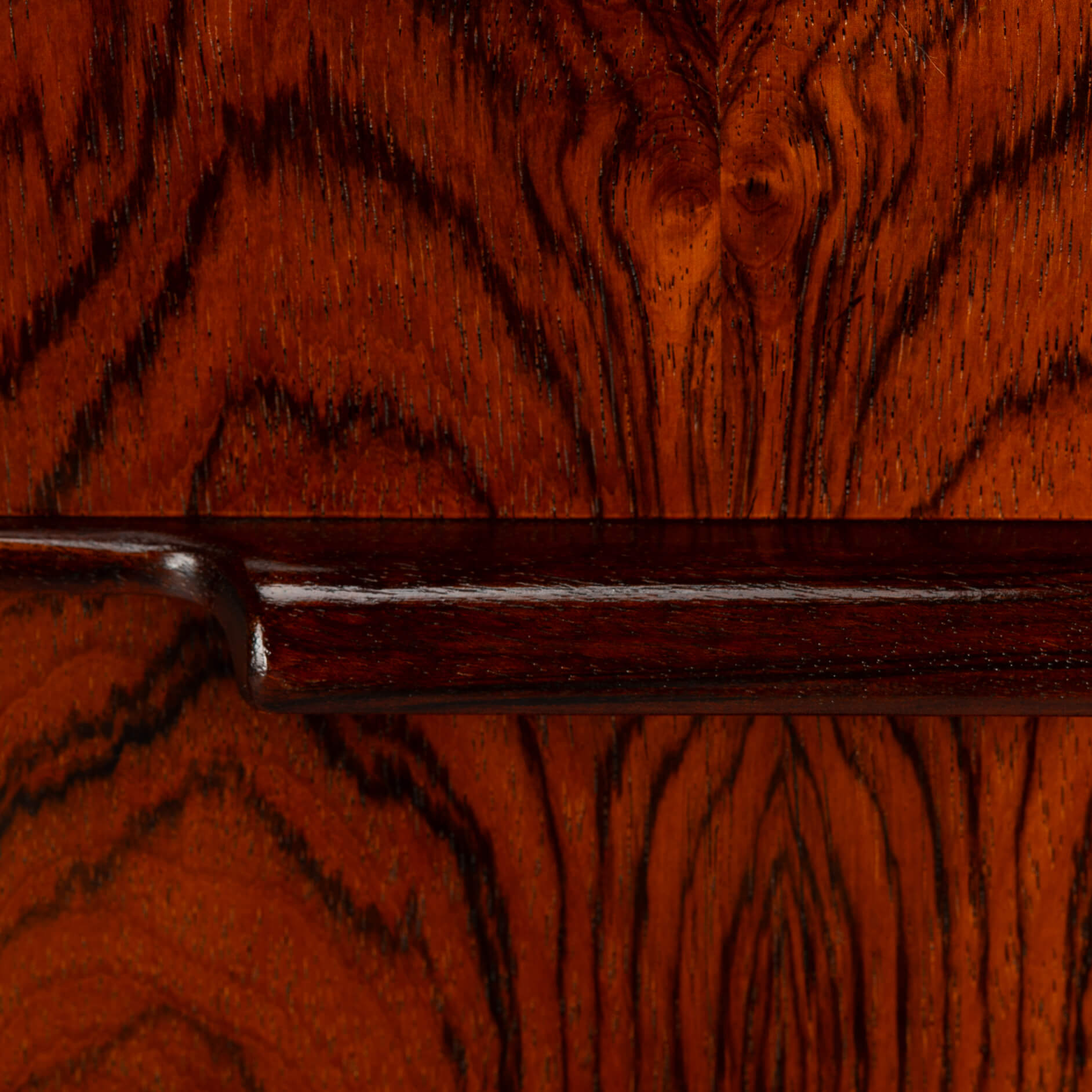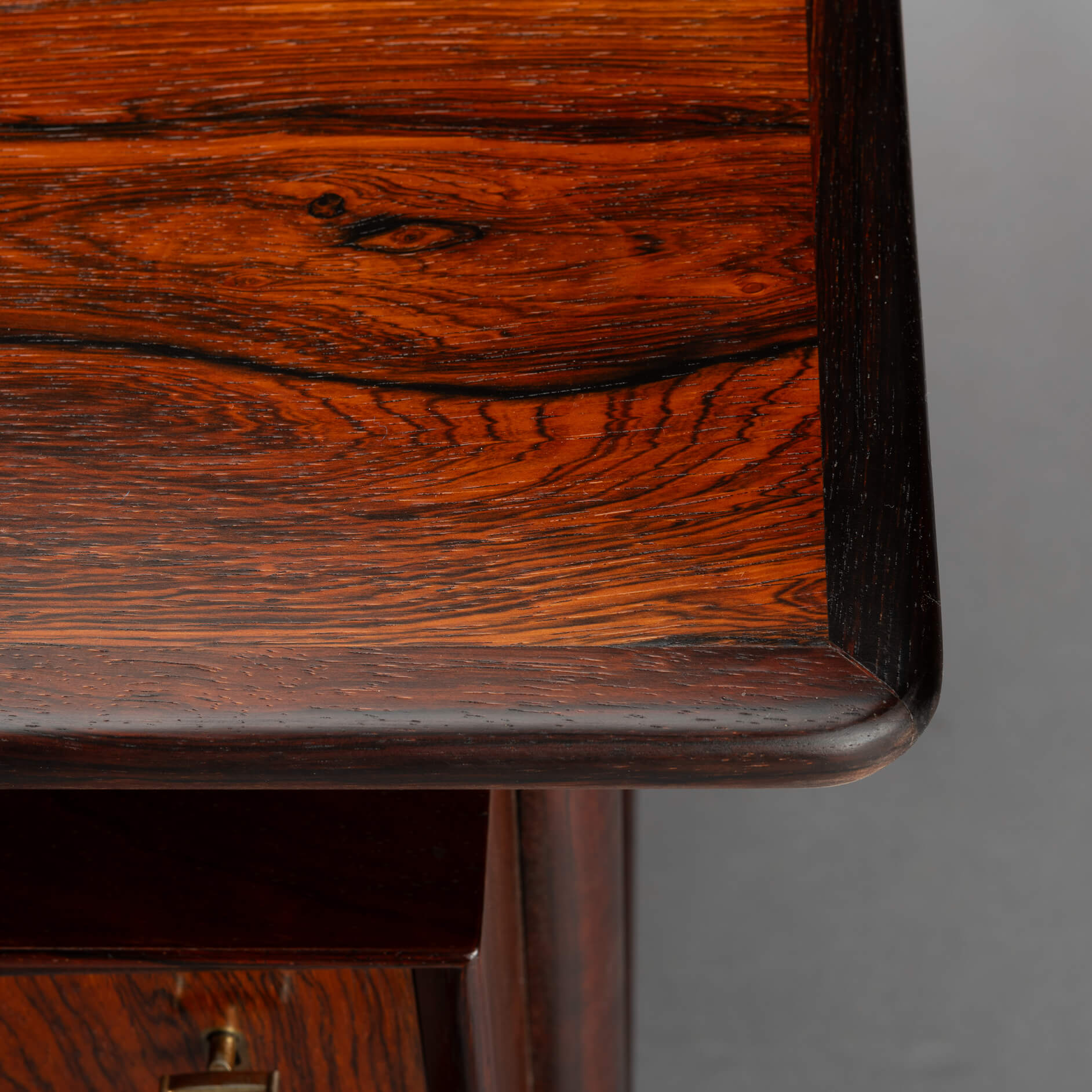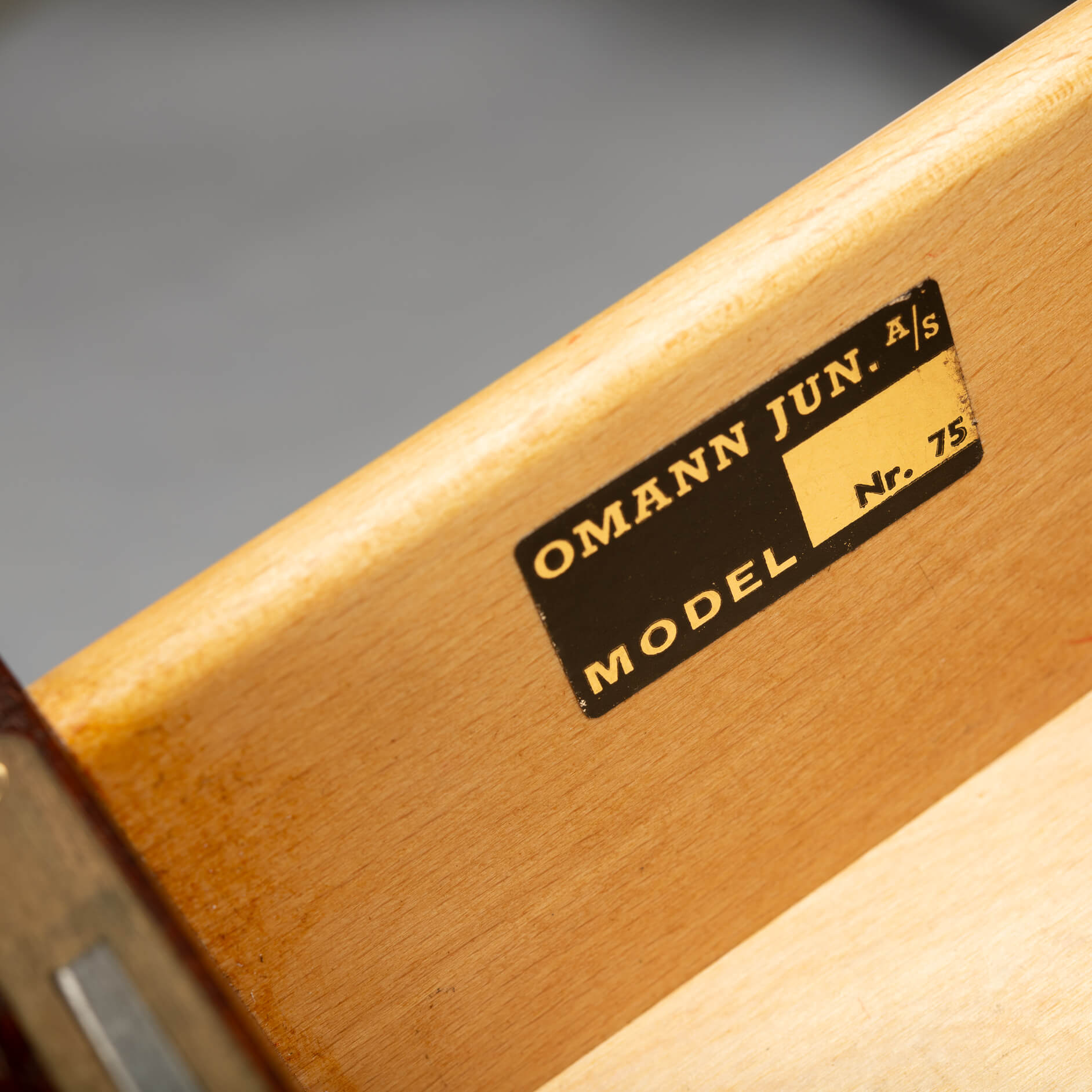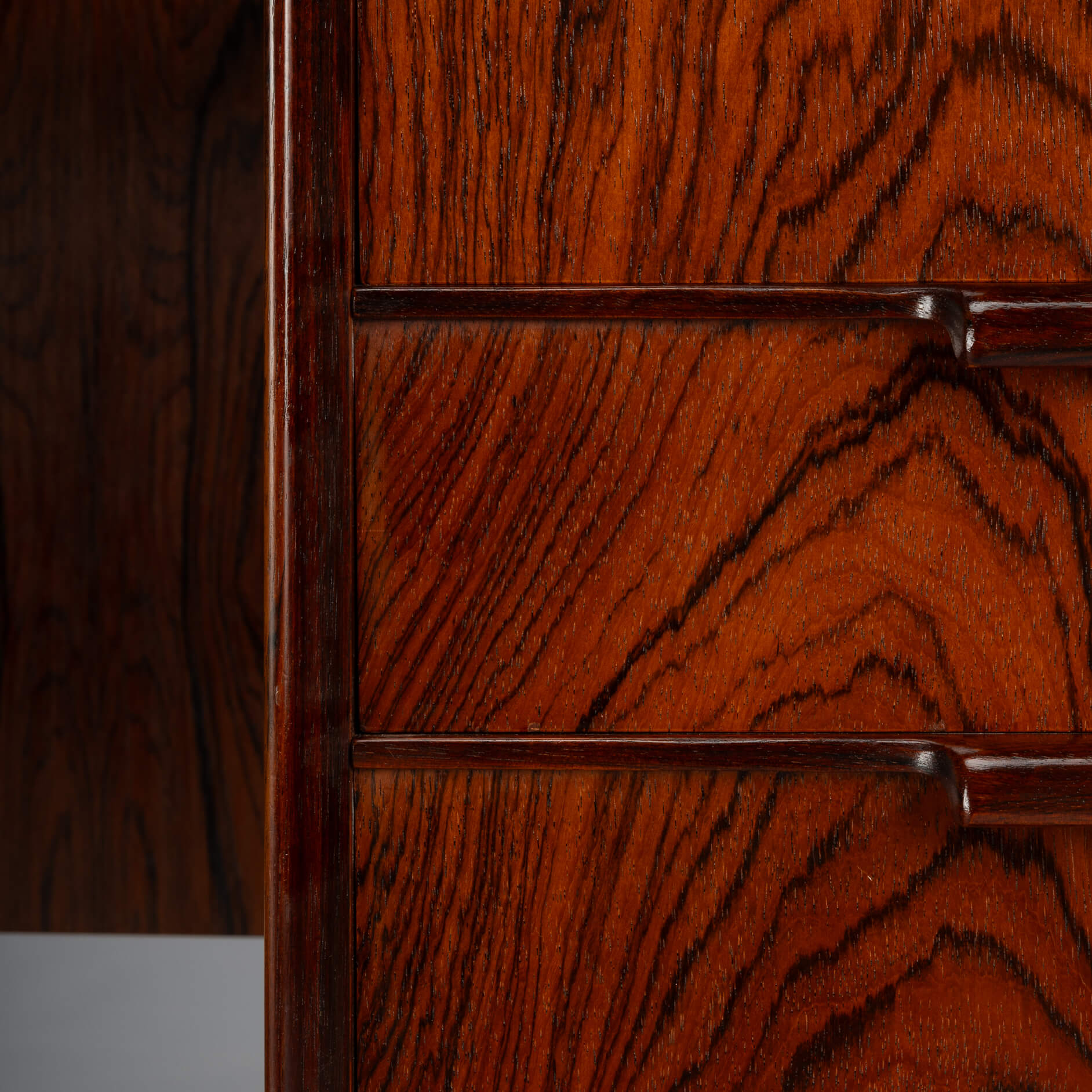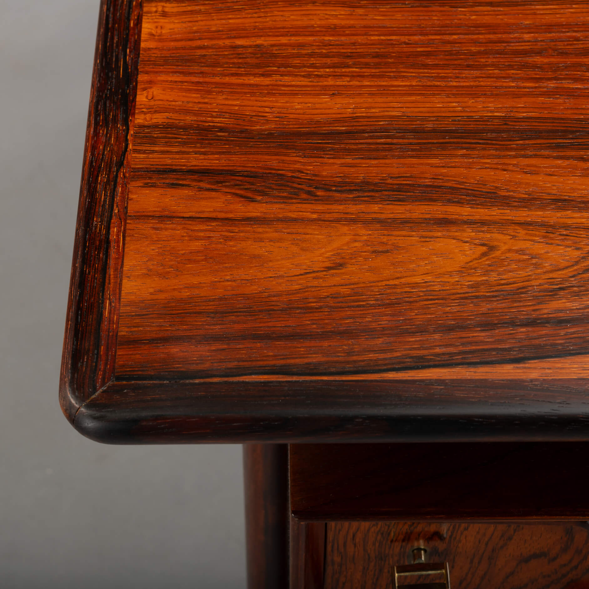 Splendid midcentury Danish modern ''model 75'' executive desk designed by Gunni Omann for Omann Jun Møbelfabrik in the 1950s. This refinished vintage desk features six drawers with elegant sculpted wood pulls. Additional storage space is found on the backside with two open bookshelves and a fall-front compartment. Solid rosewood legs support a floating tabletop allowing for additional storage space underneath the leaf of the desk.