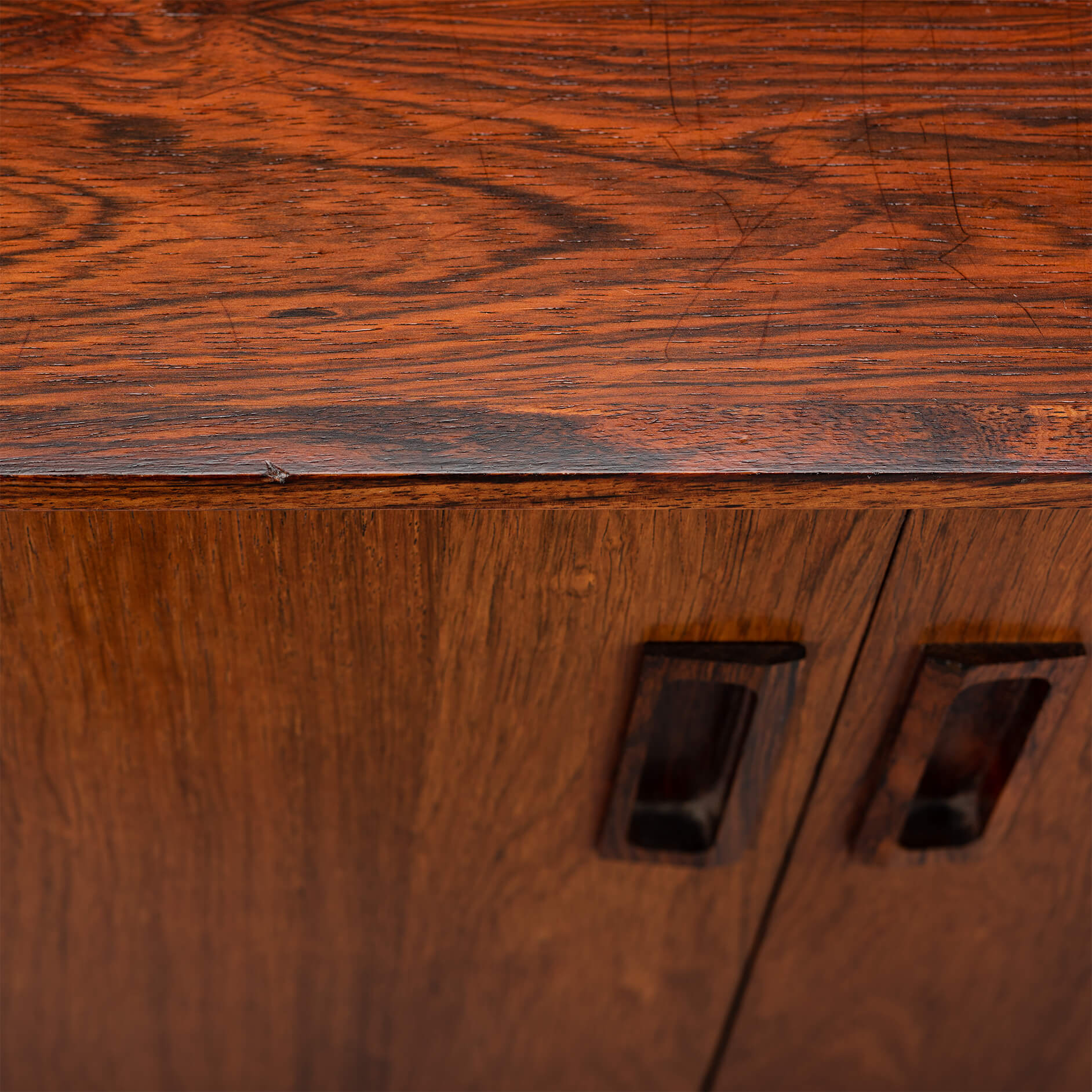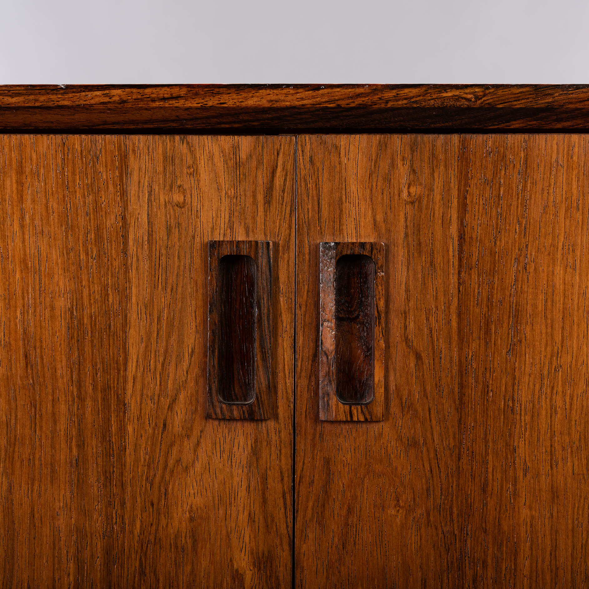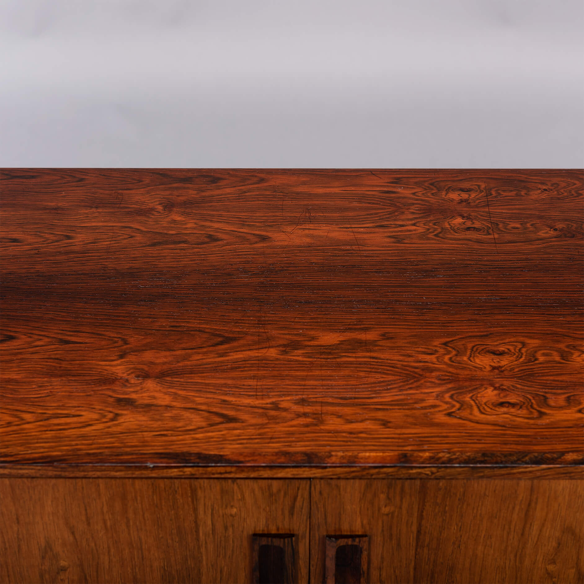 This sideboard from the early 60s is still in fully original condition with nicely cut grips on the doors. This sideboard is in good vintage condition with despite of the refinishing still some visible vintage marks on the top.