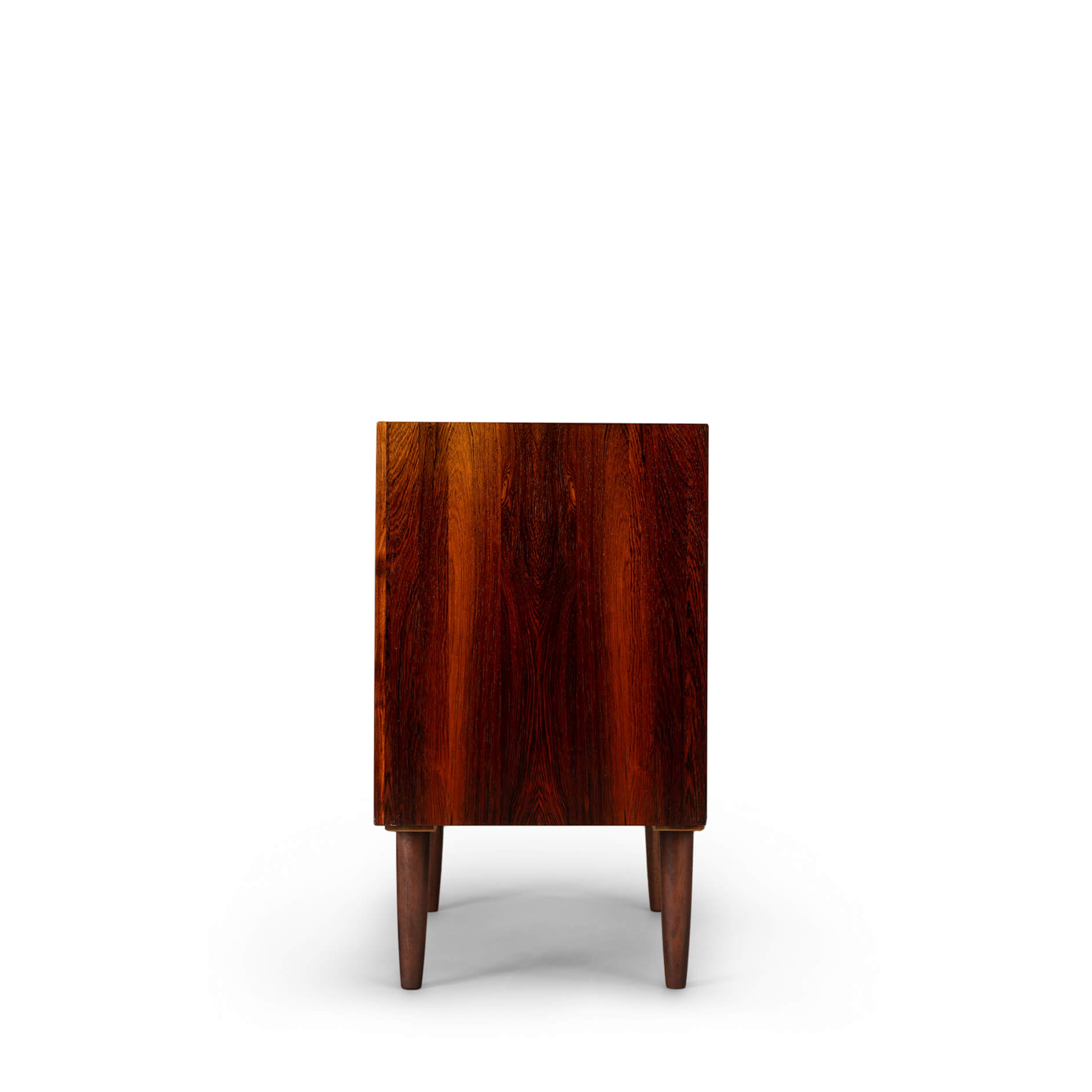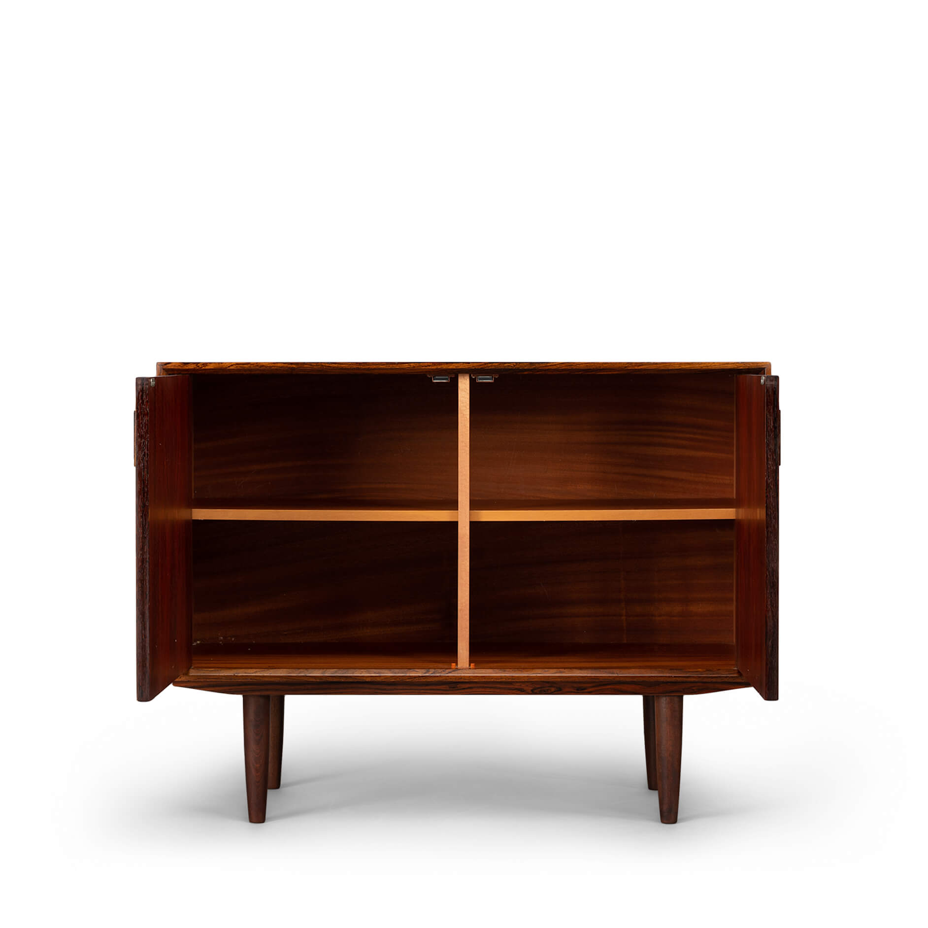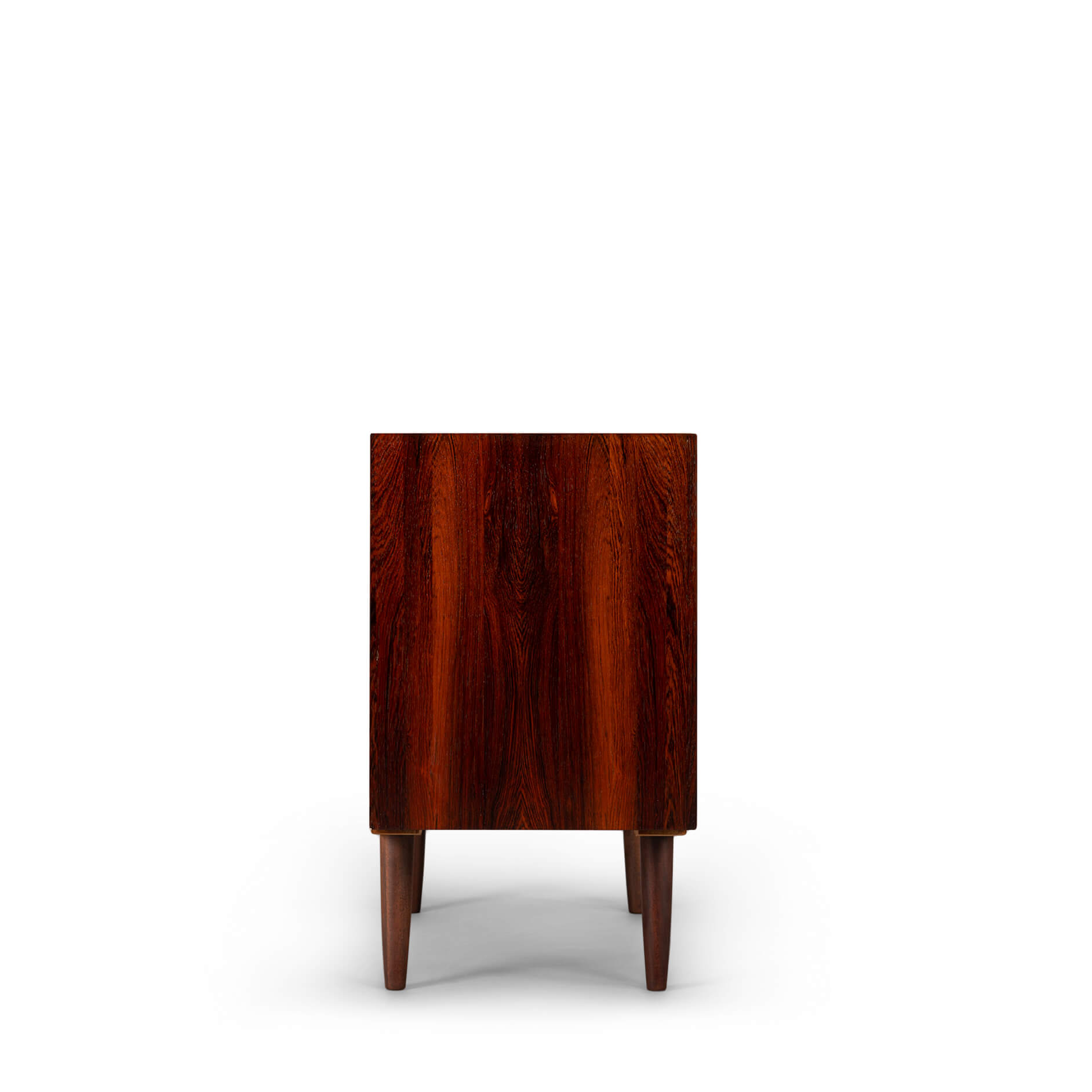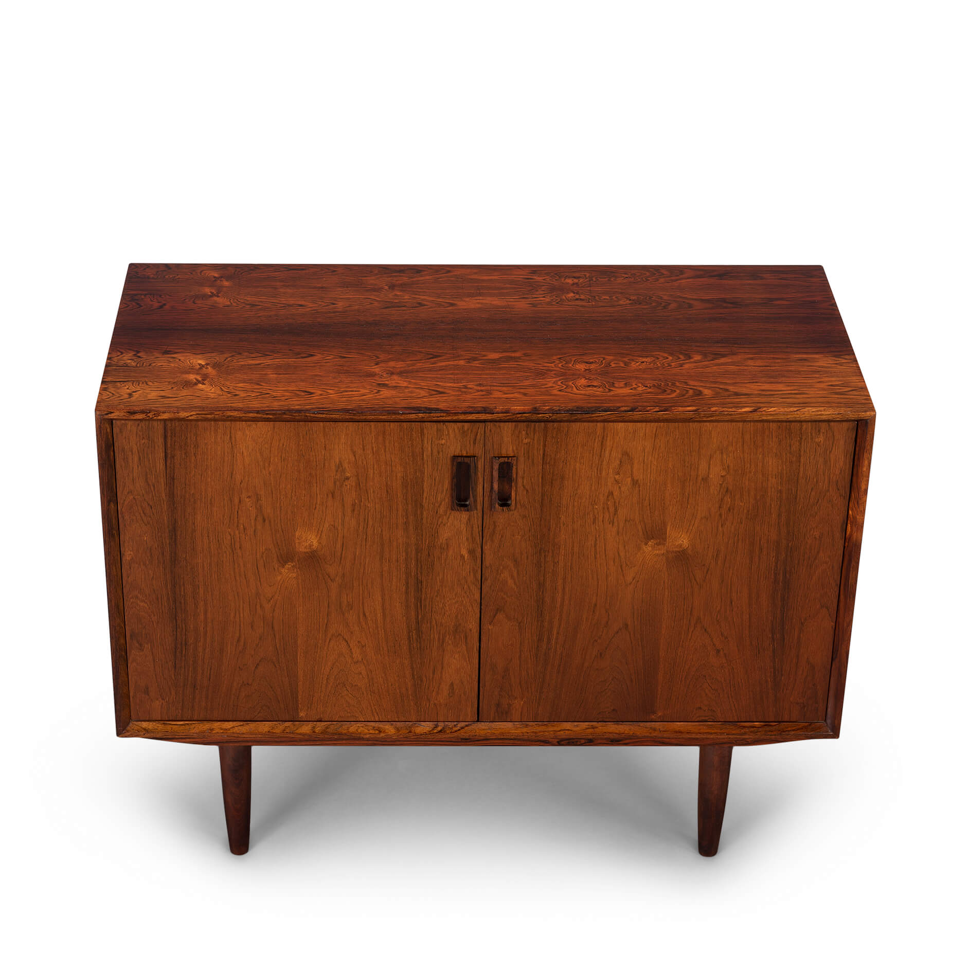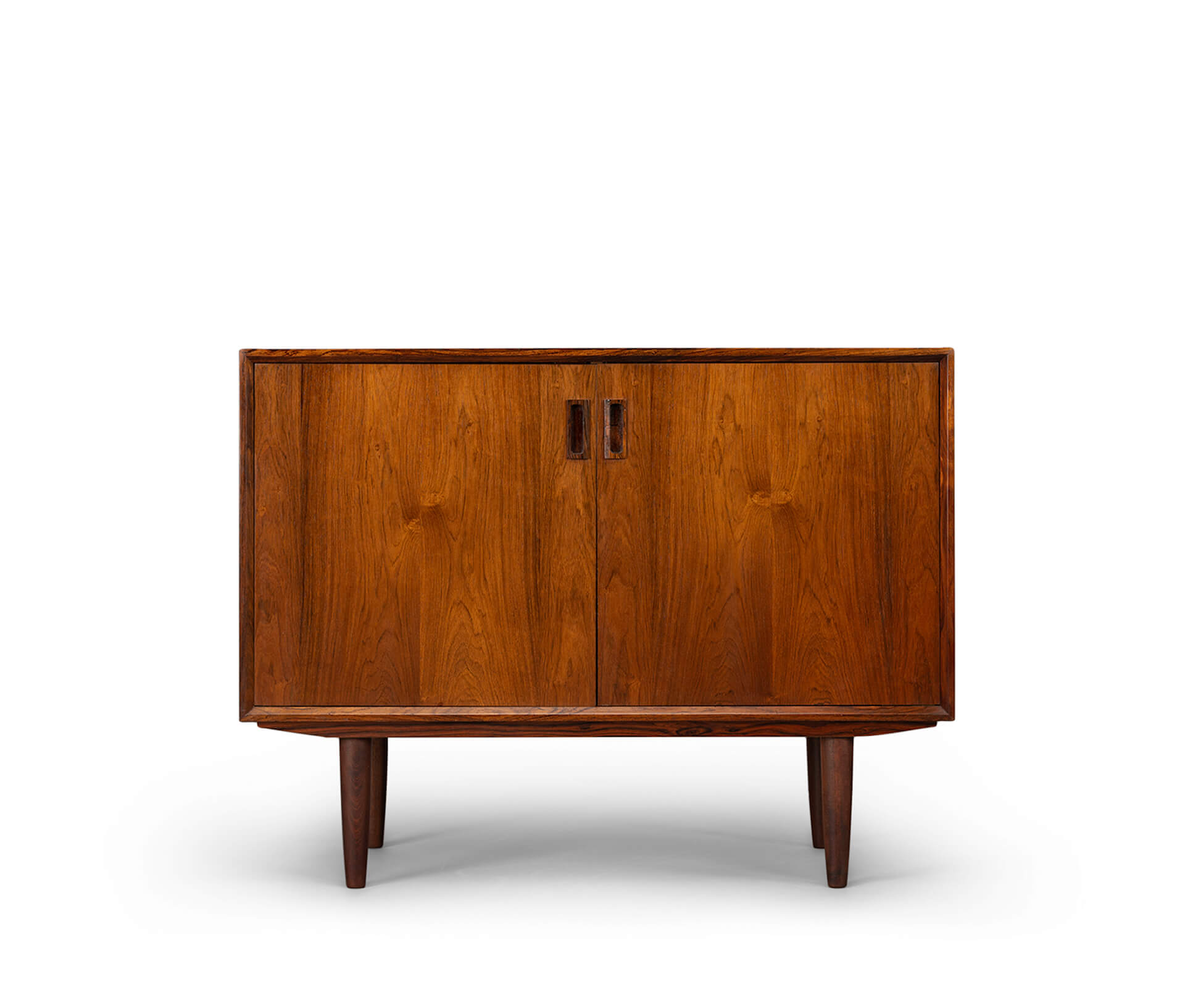 This elegantly designed credenza by Johannes Sorth voor Bornholm Møbelfabrik, clearly marked on the back side of the chest. This sideboard provides for good storage and is made with a nice rosewood veneer. Simple design with only 1 shelve behind the two doors.