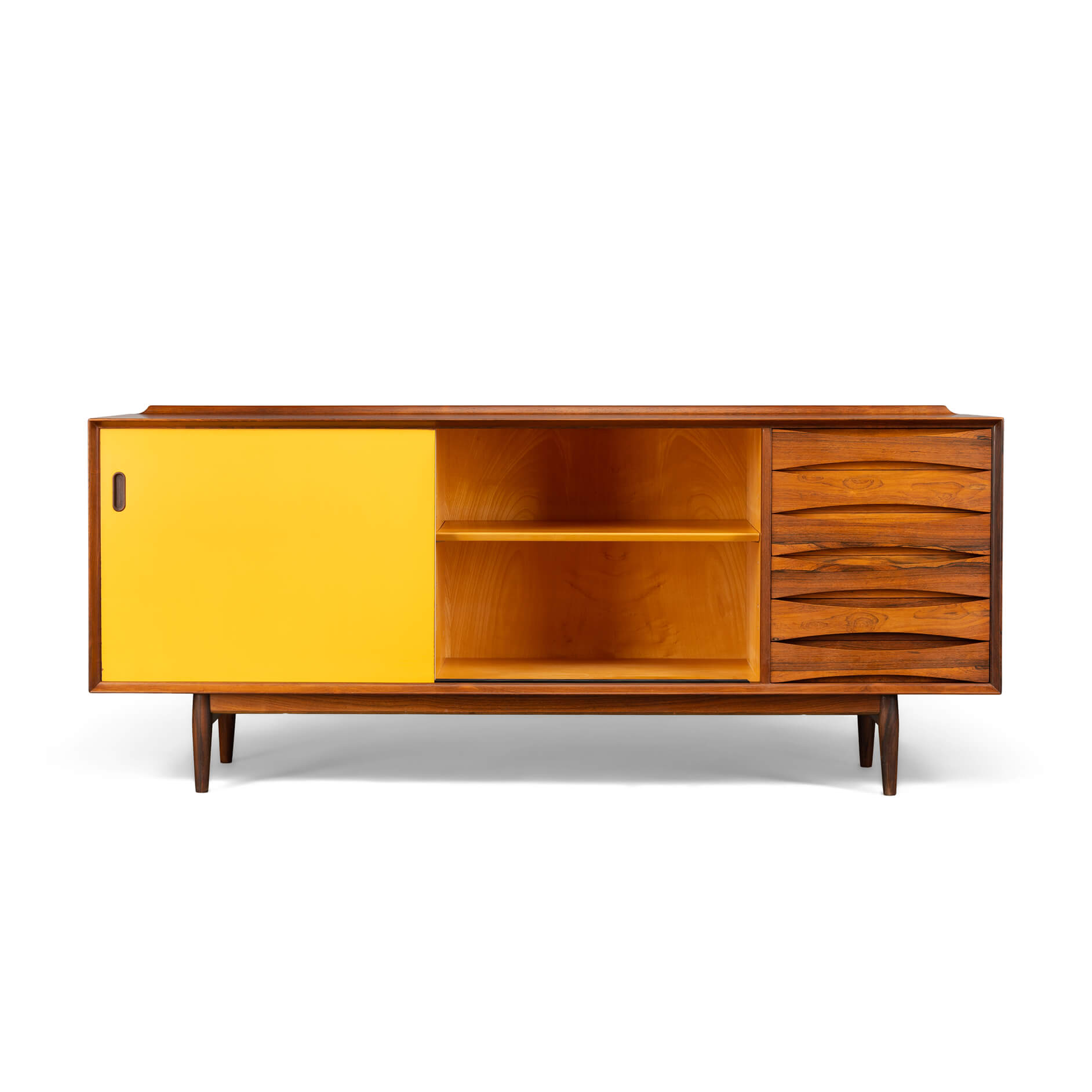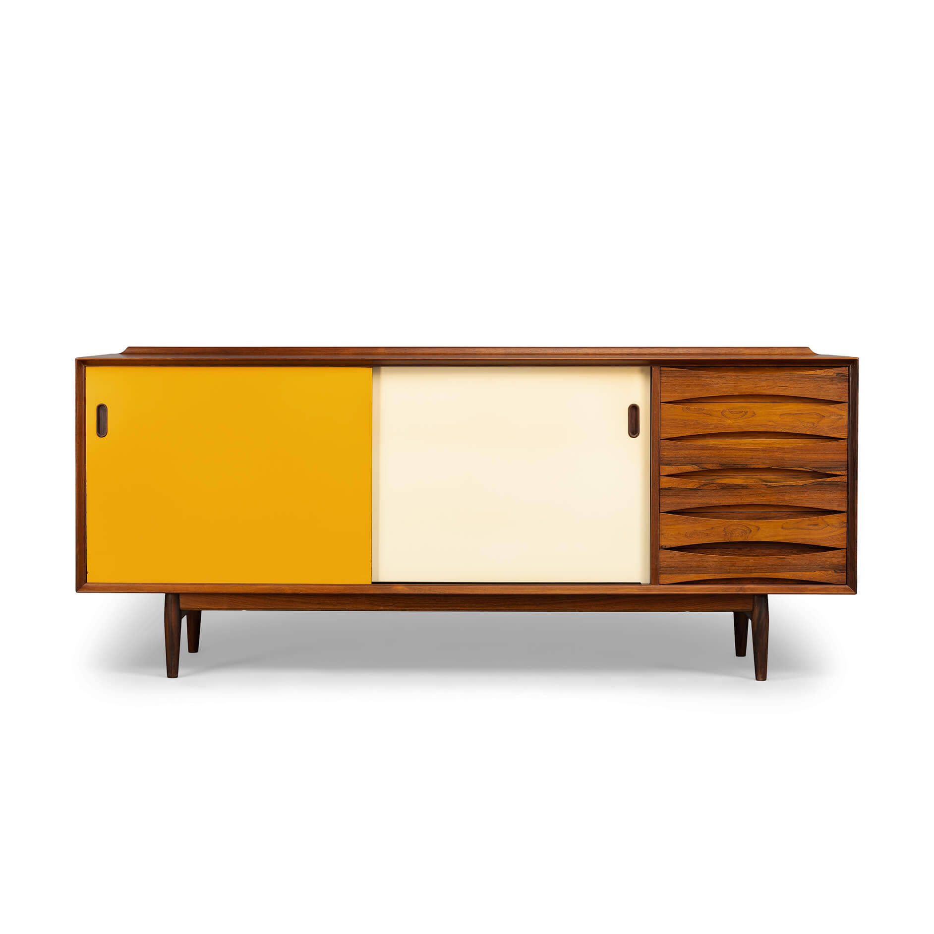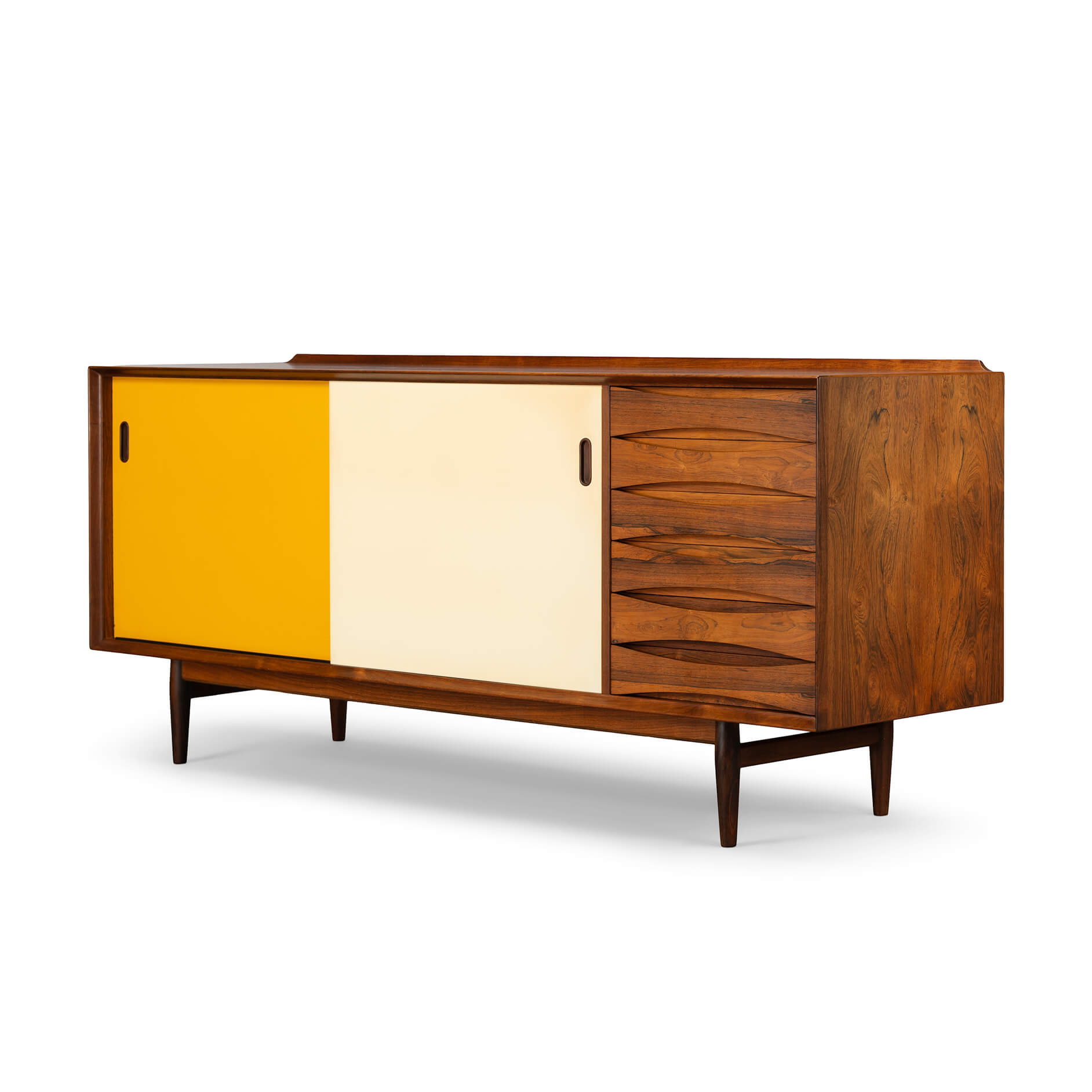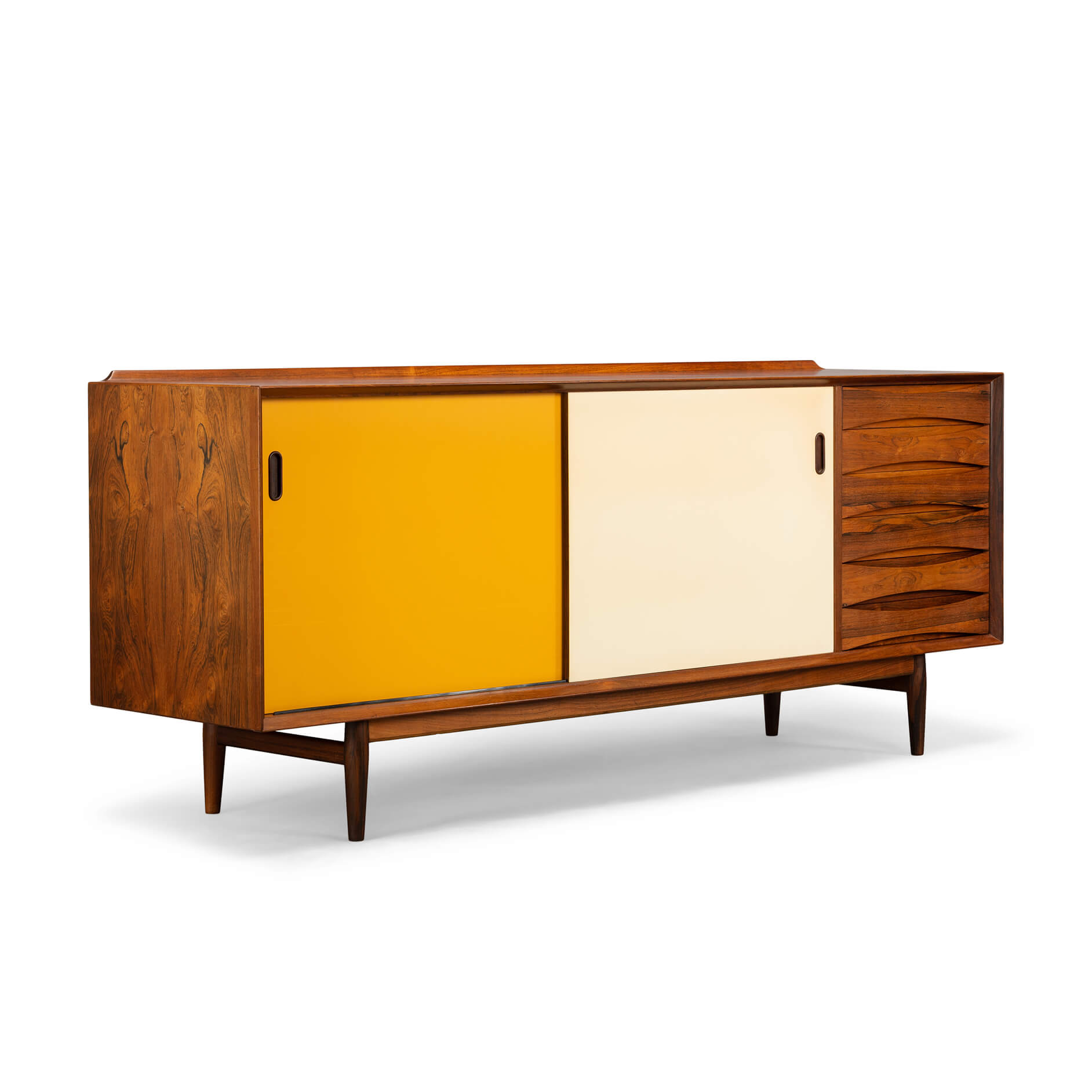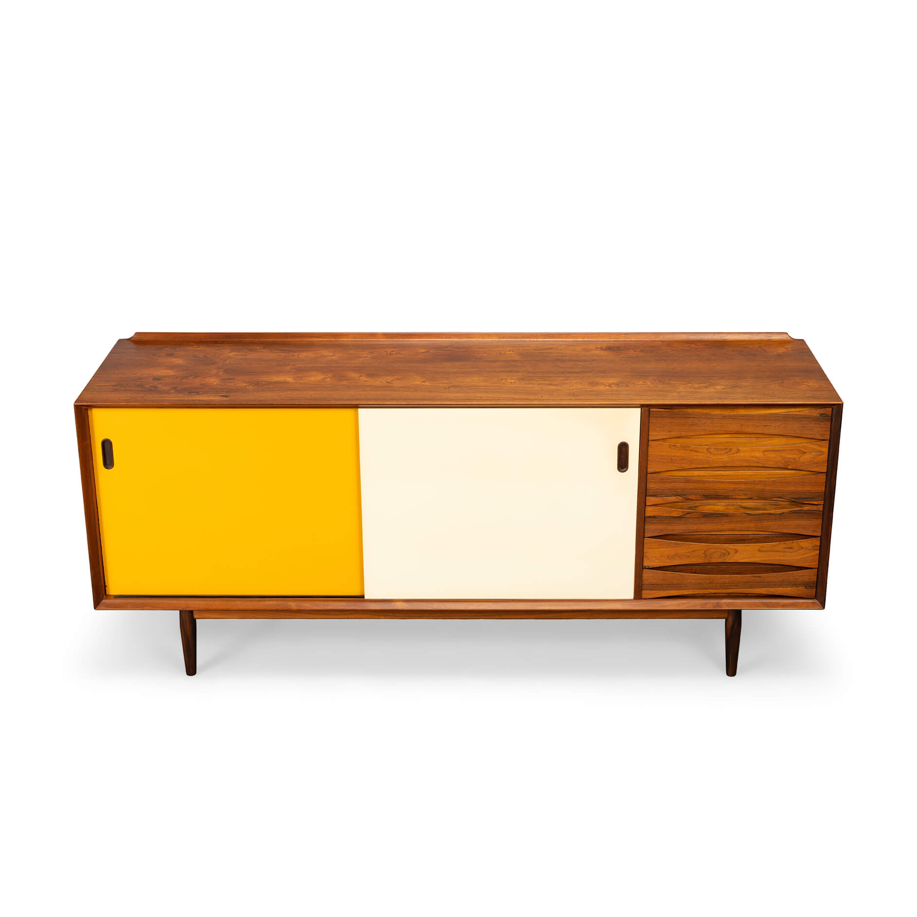 This model OS29 sideboard in rosewood by Arne Vodder for Sibast møbelfabrik is the epitomy of high end Danish design cabinettry. A design icon and highly desireable collectors piece for all of you who love the Mid Century Modern era. Recognizable as a Vodder from afar with white and yellow sliding doors that can be reversed to a full rosewood look and the renowned style of drawer fronts. The uplifted long end of the top and beautiful joinery on the faceted face of the front bezel. Vodder really arrived in the premier league of Denmark's designers with this sideboard design and became renowned all over the globe.