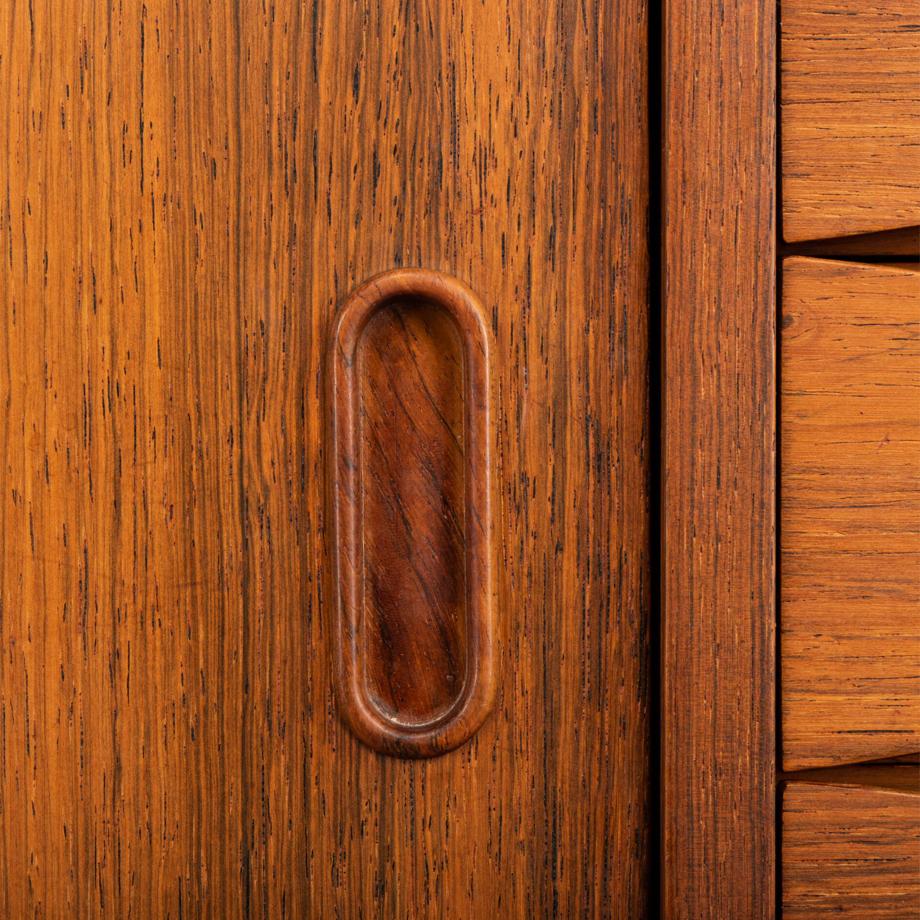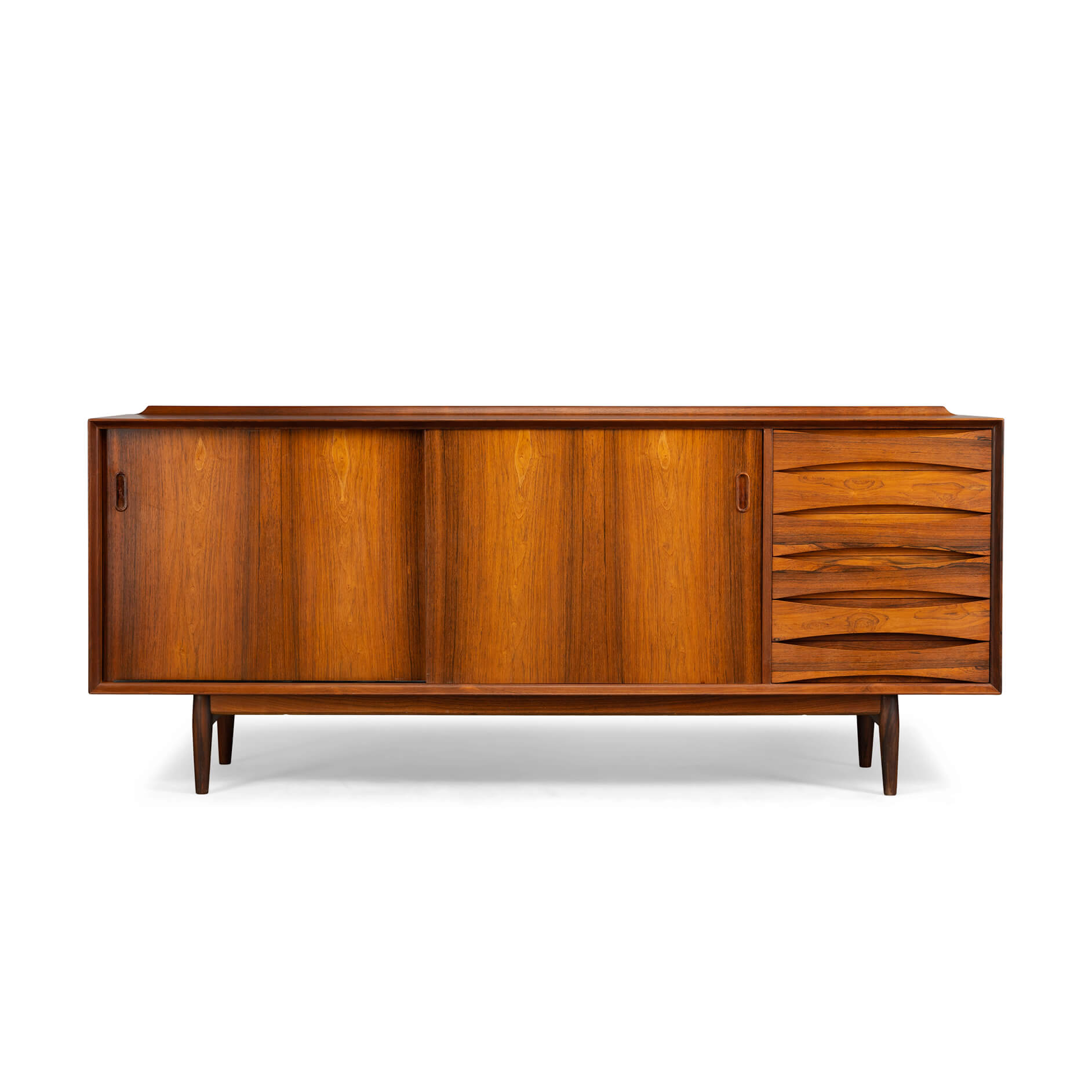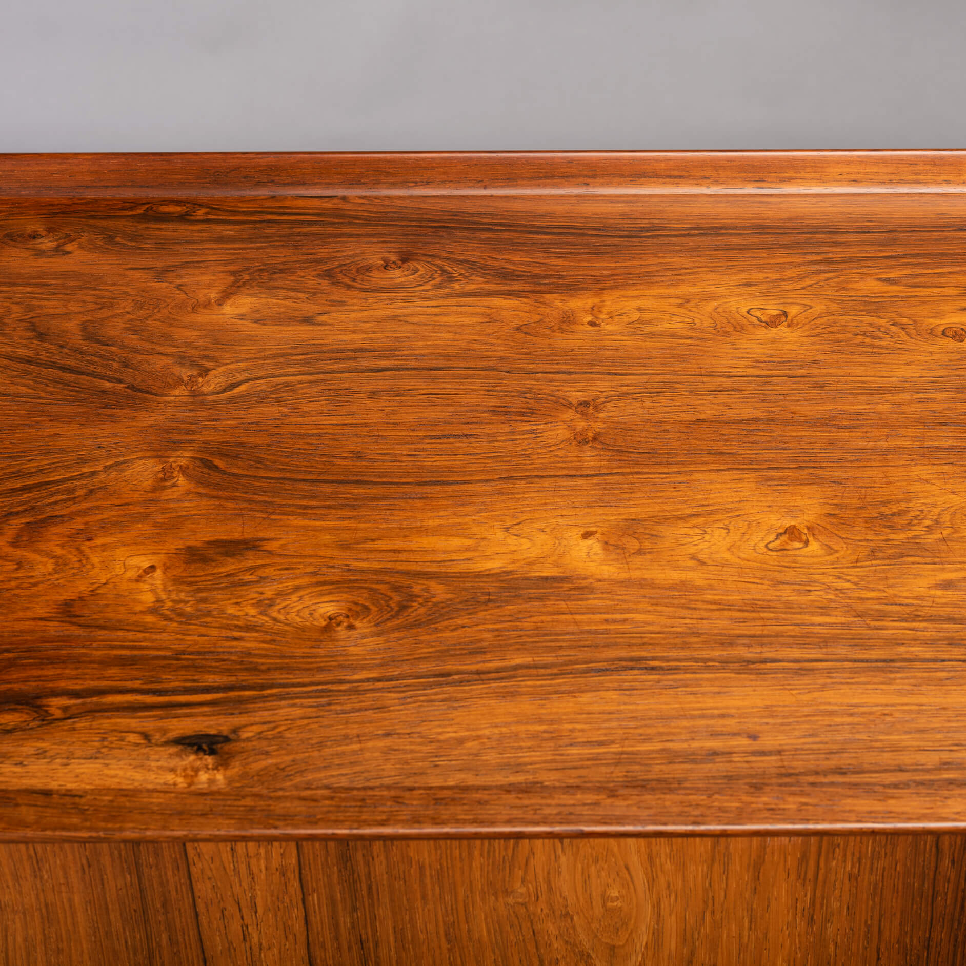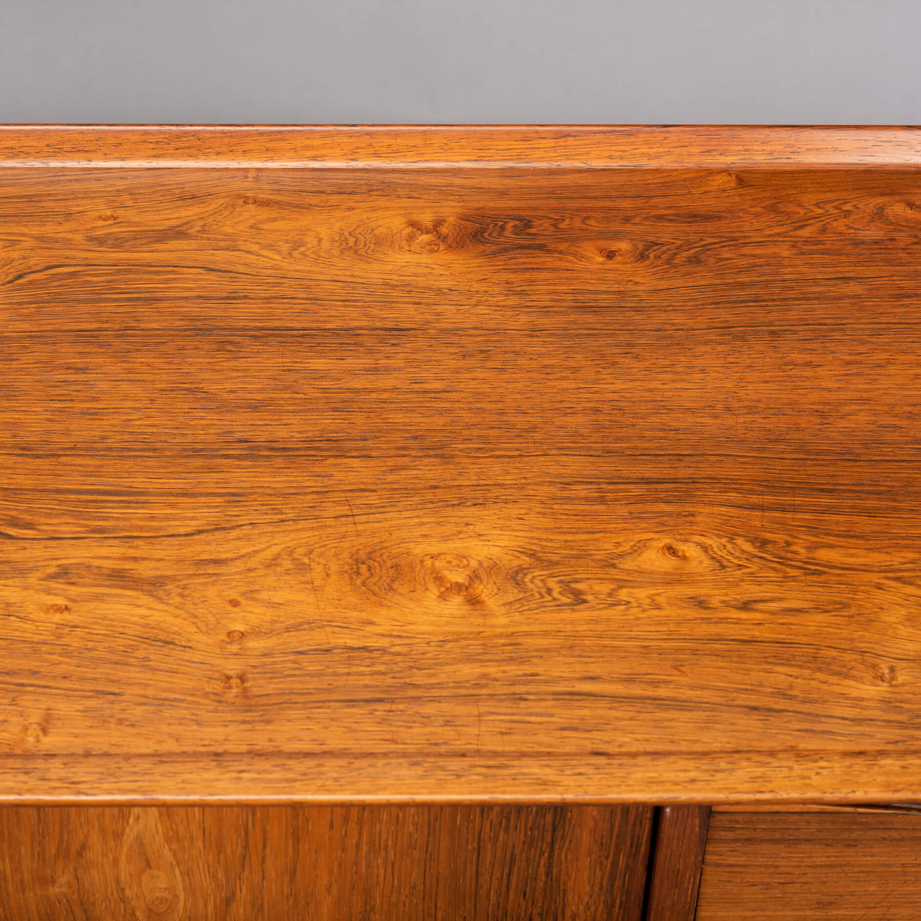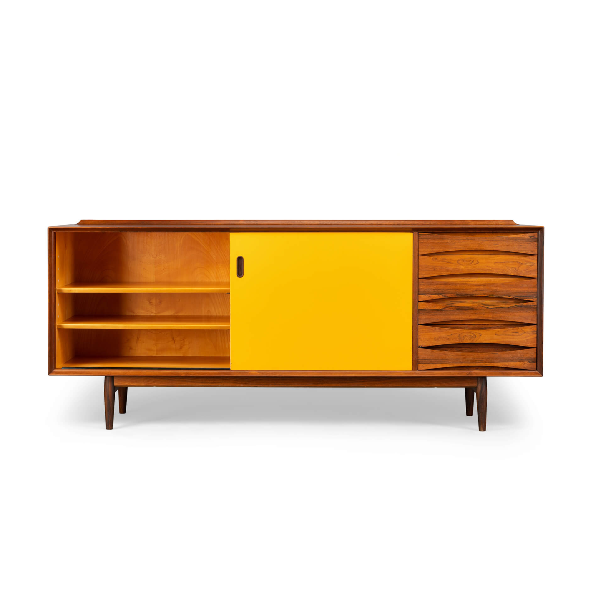 This model OS29 sideboard in rosewood by Arne Vodder for Sibast møbelfabrik is the epitomy of high end Danish design cabinettry. A design icon and highly desireable collectors piece for all of you who love the Mid Century Modern era. Recognizable as a Vodder from afar with white and yellow sliding doors that can be reversed to a full rosewood look and the renowned style of drawer fronts. The uplifted long end of the top and beautiful joinery on the faceted face of the front bezel. Vodder really arrived in the premier league of Denmark's designers with this sideboard design and became renowned all over the globe.