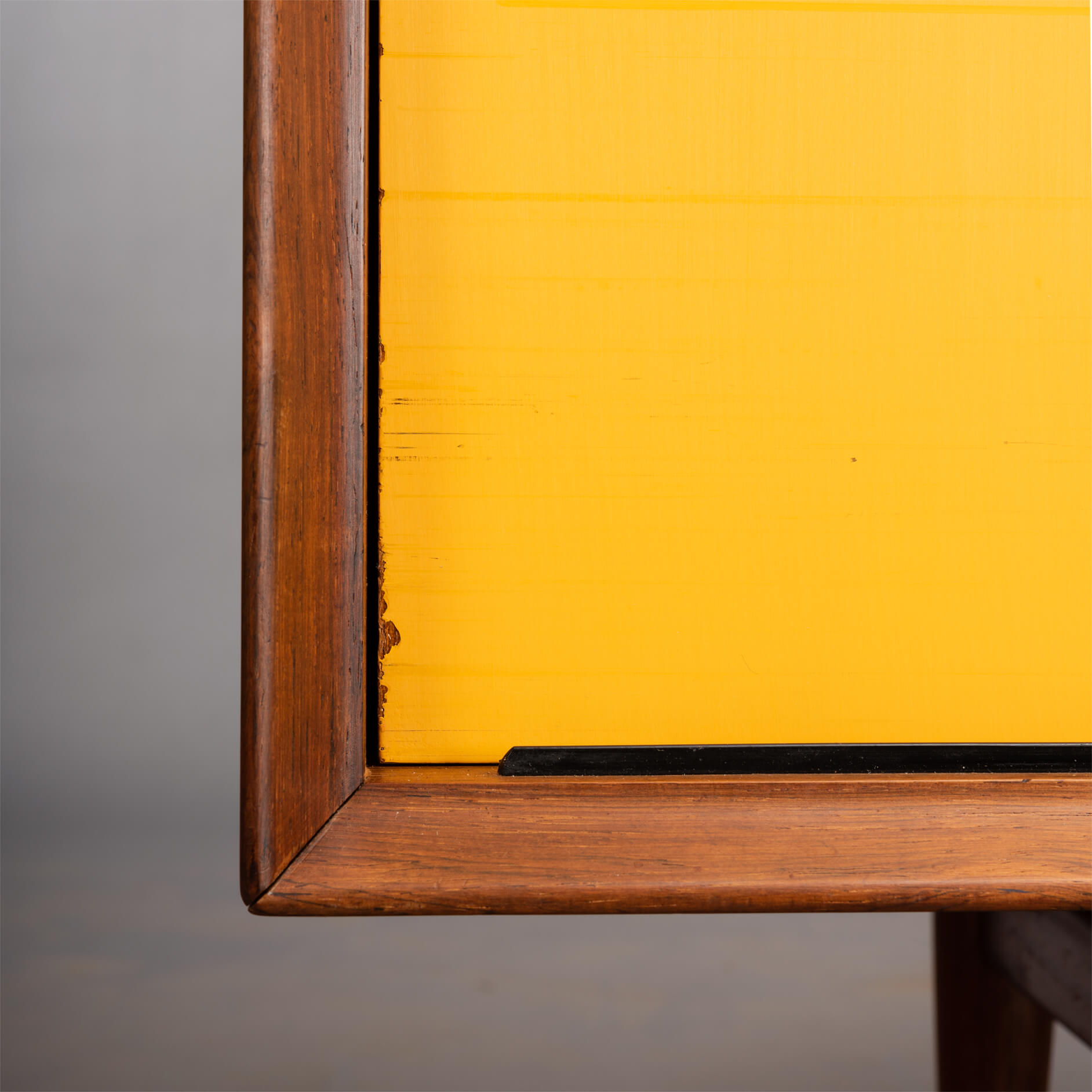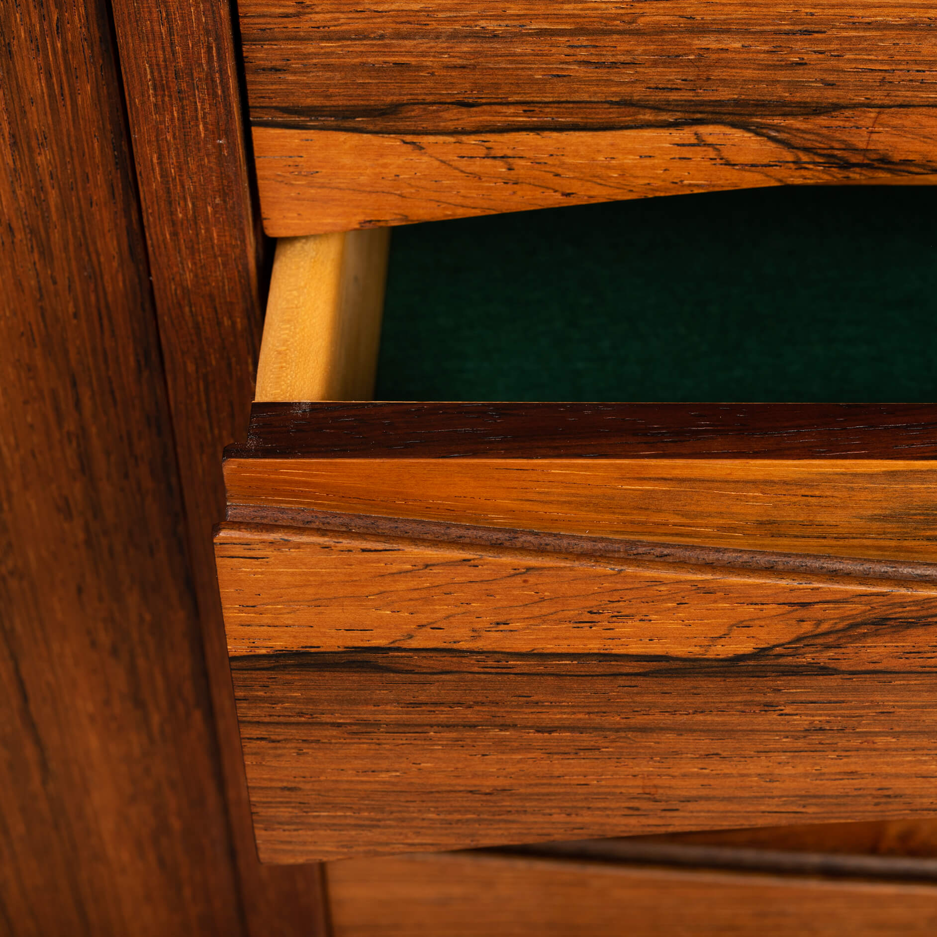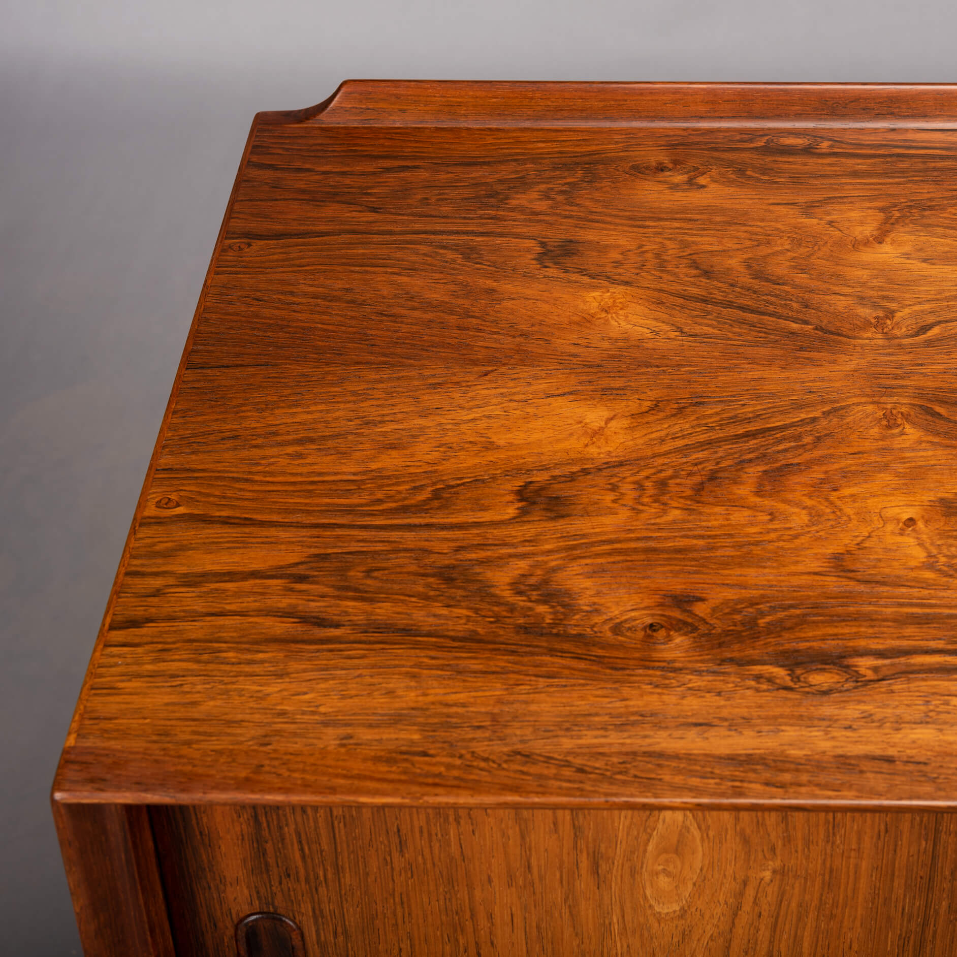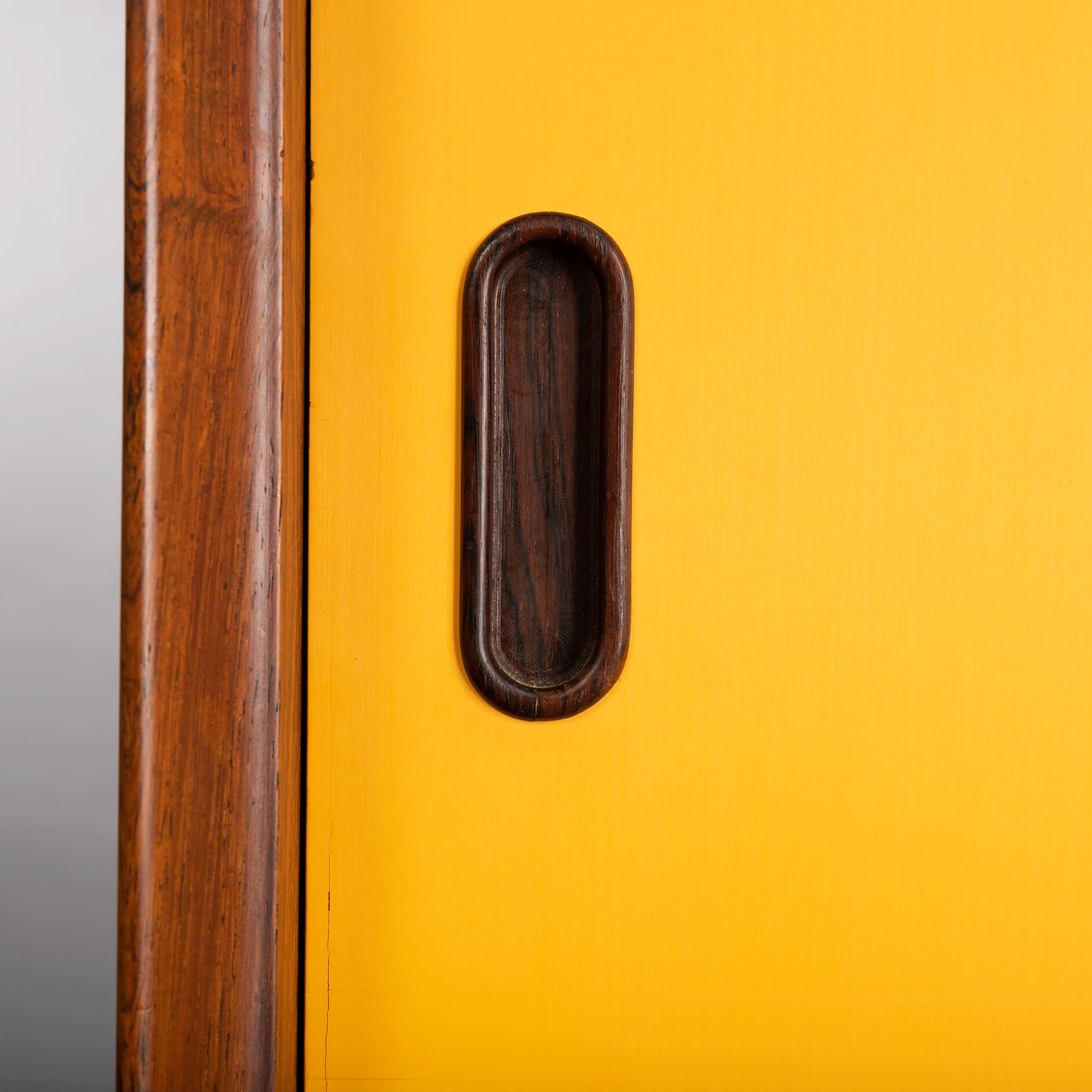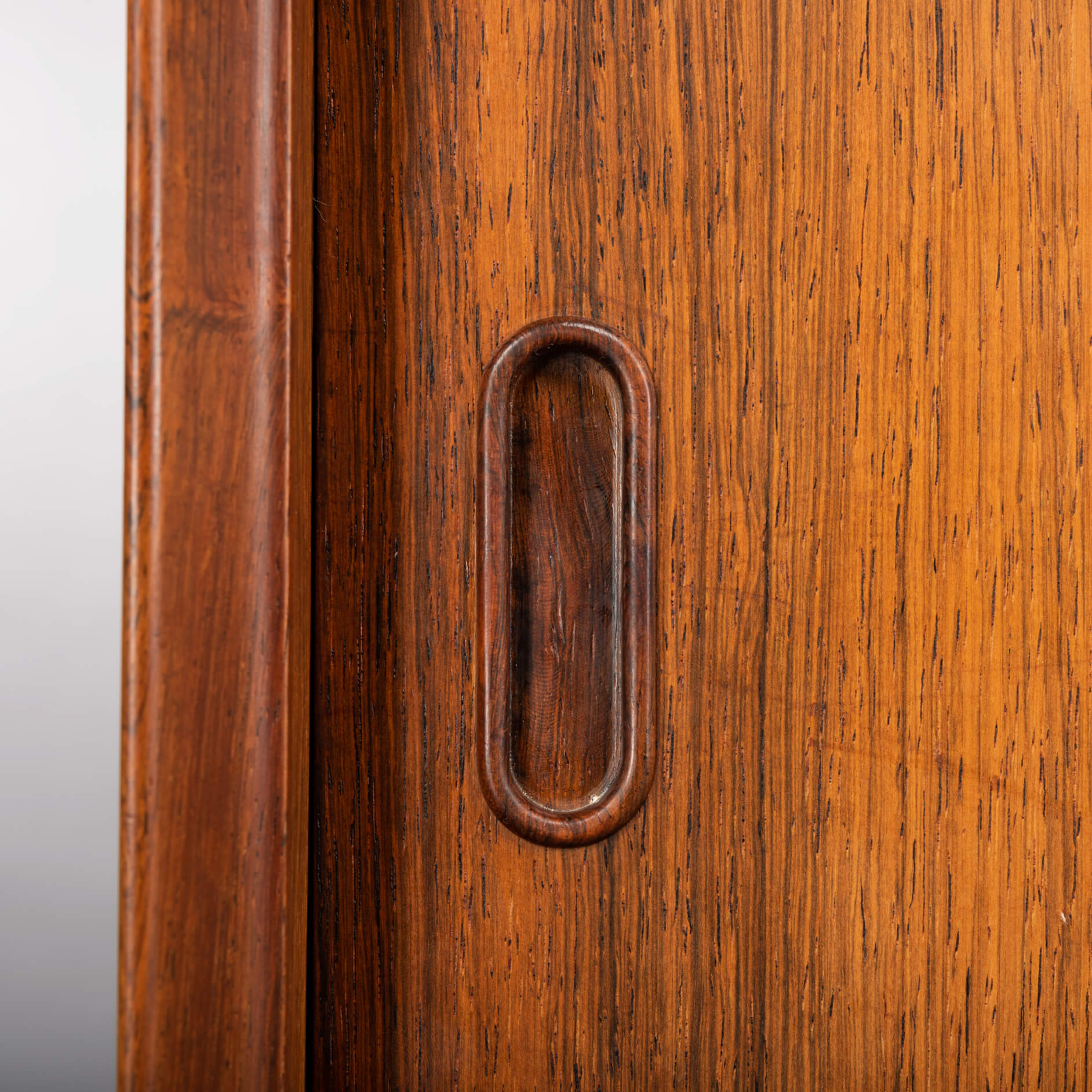 This model OS29 sideboard in rosewood by Arne Vodder for Sibast møbelfabrik is the epitomy of high end Danish design cabinettry. A design icon and highly desireable collectors piece for all of you who love the Mid Century Modern era. Recognizable as a Vodder from afar with white and yellow sliding doors that can be reversed to a full rosewood look and the renowned style of drawer fronts. The uplifted long end of the top and beautiful joinery on the faceted face of the front bezel. Vodder really arrived in the premier league of Denmark's designers with this sideboard design and became renowned all over the globe.