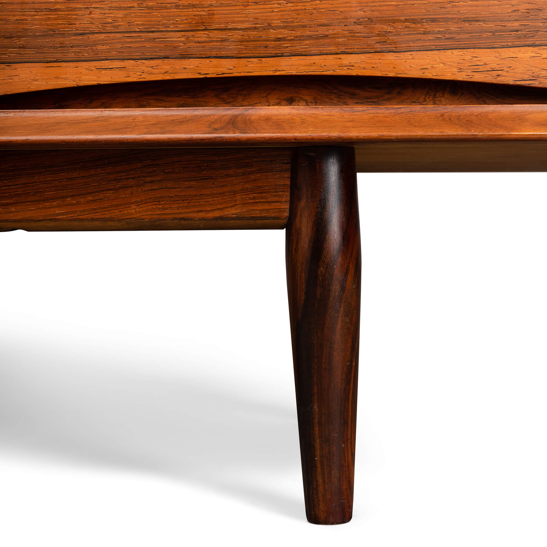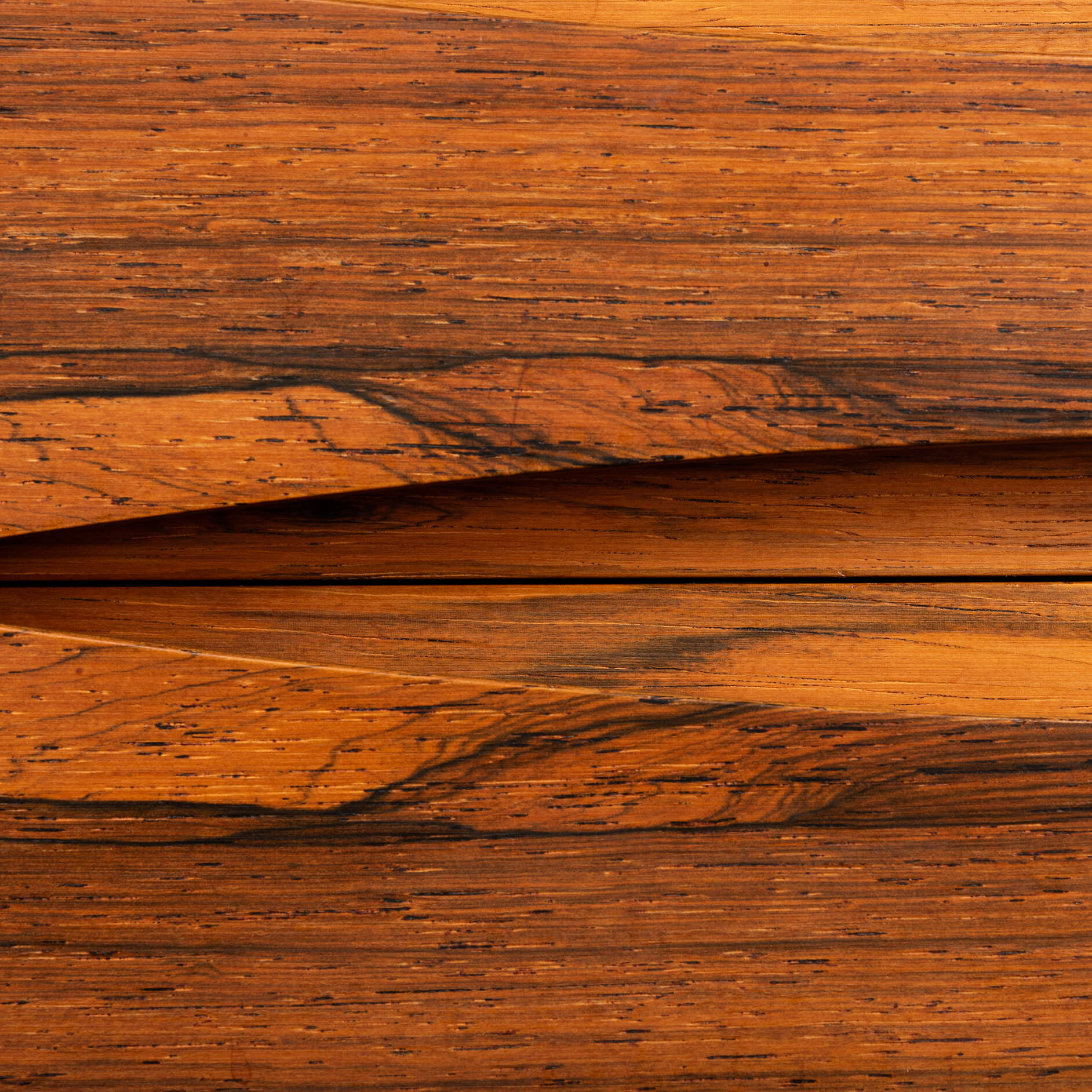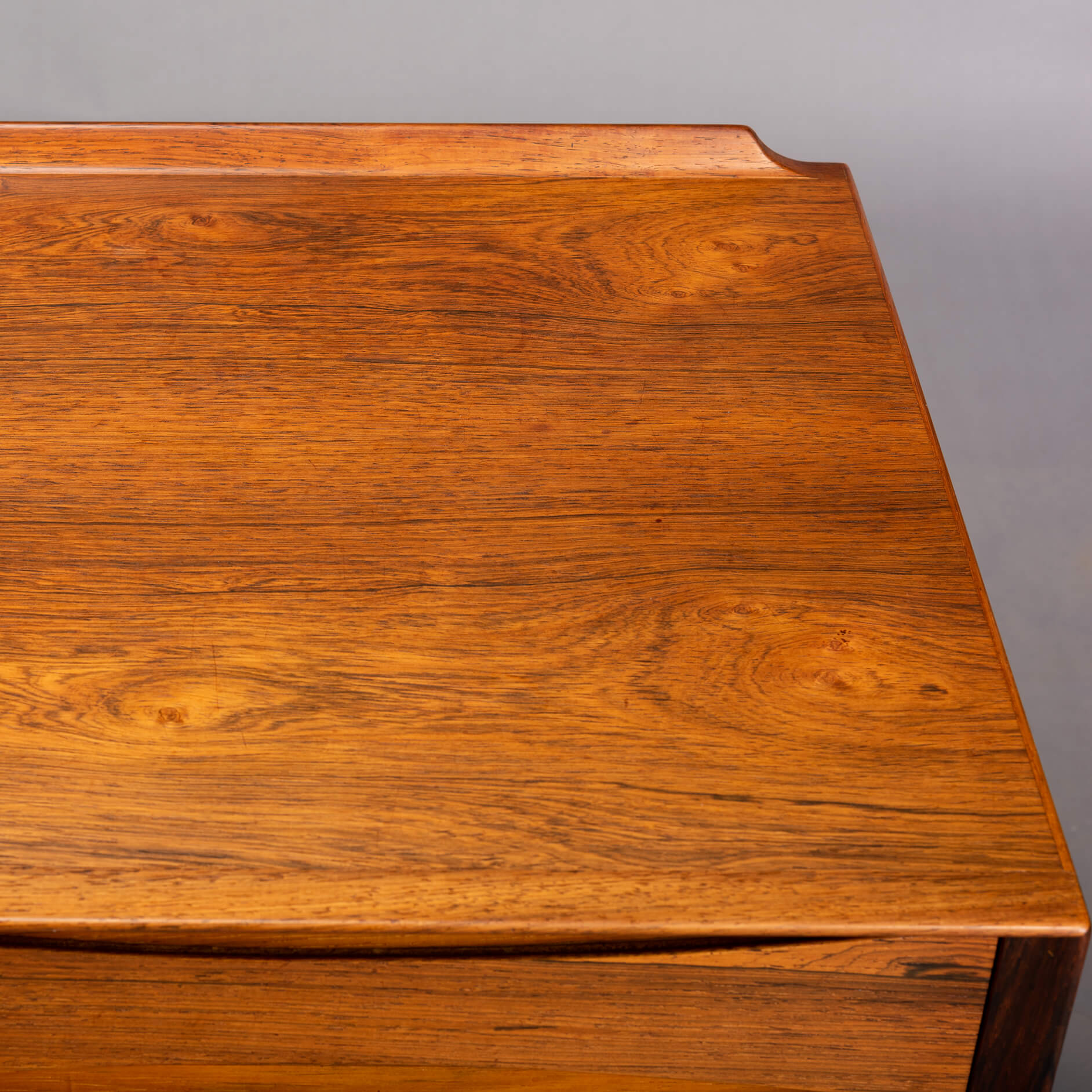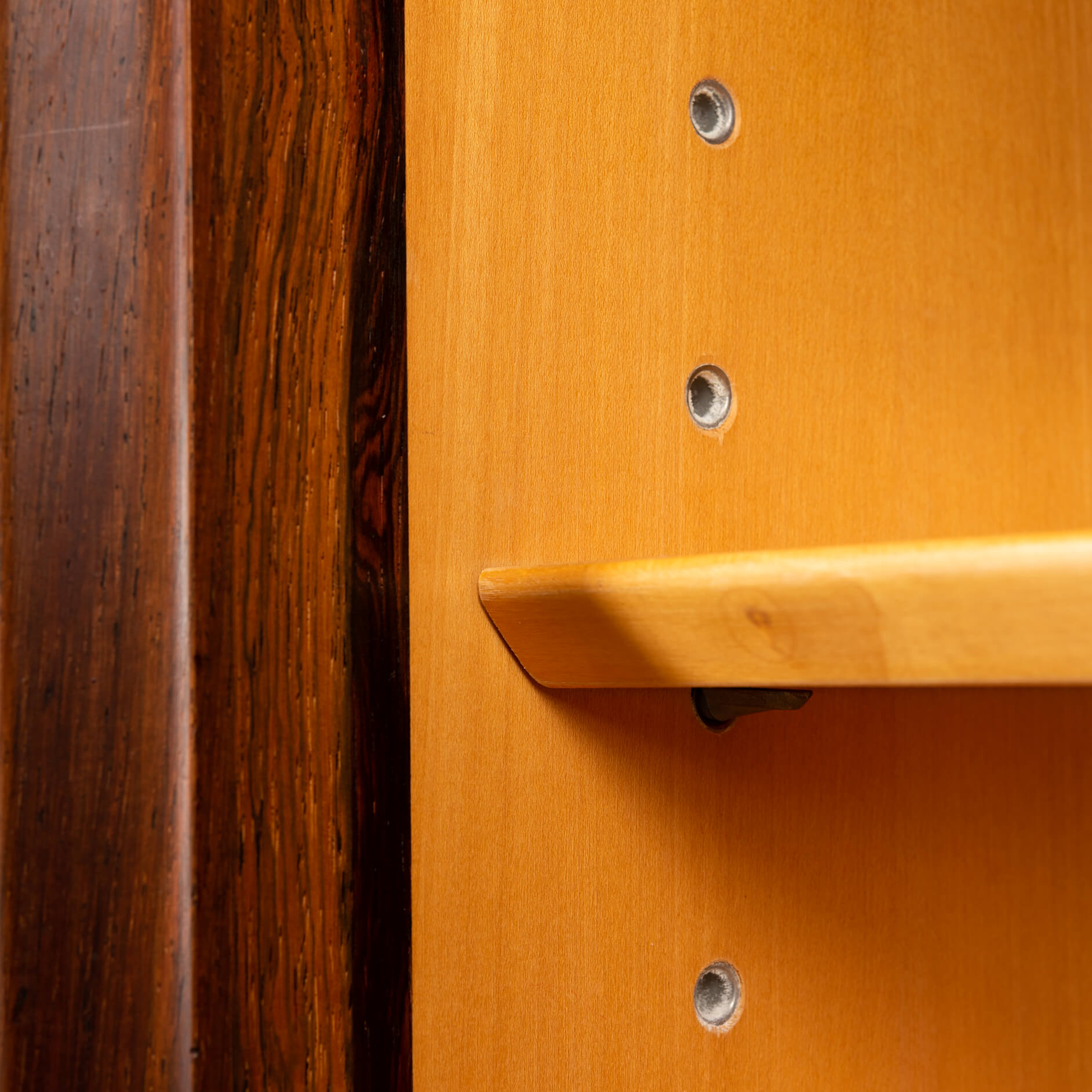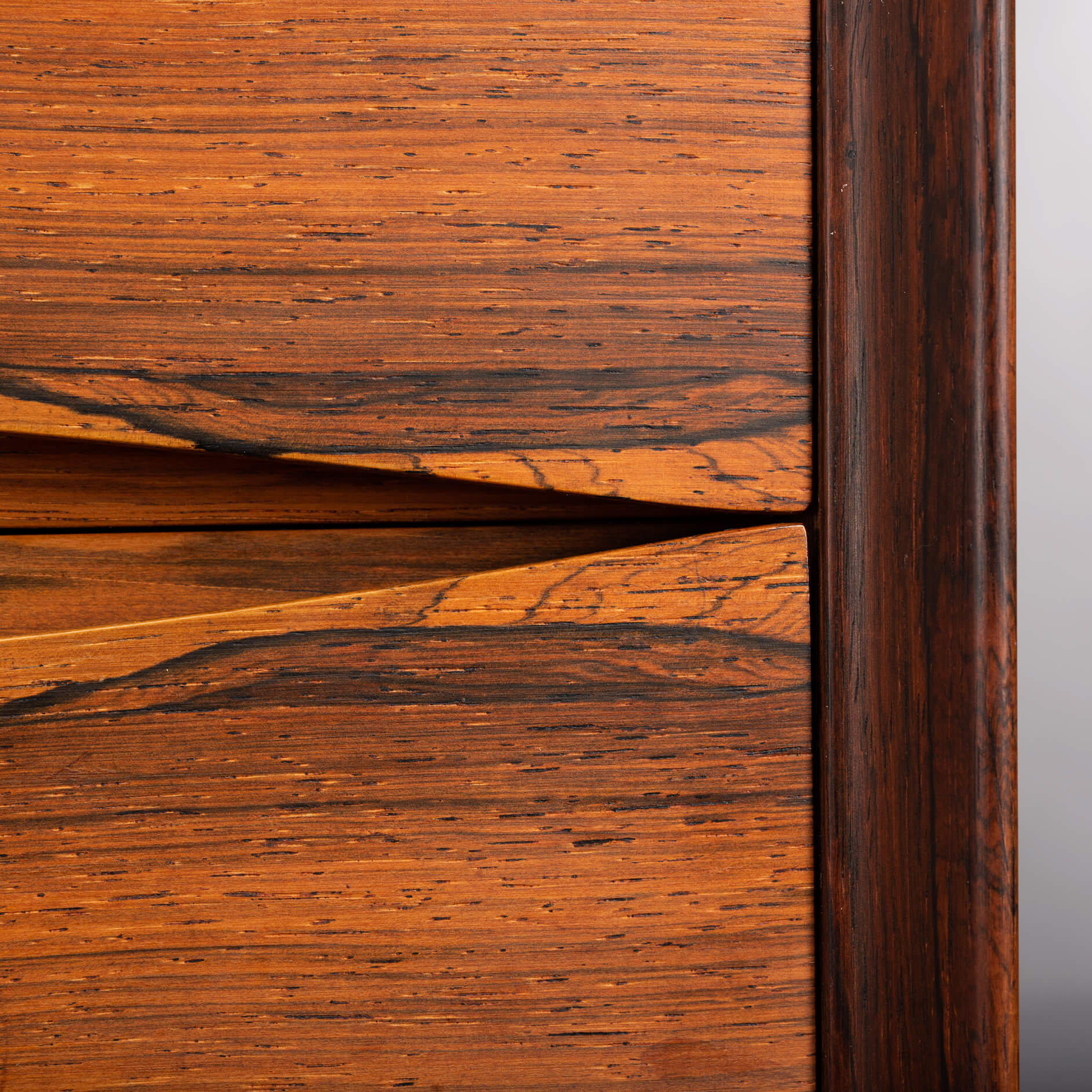 This model OS29 sideboard in rosewood by Arne Vodder for Sibast møbelfabrik is the epitomy of high end Danish design cabinettry. A design icon and highly desireable collectors piece for all of you who love the Mid Century Modern era. Recognizable as a Vodder from afar with white and yellow sliding doors that can be reversed to a full rosewood look and the renowned style of drawer fronts. The uplifted long end of the top and beautiful joinery on the faceted face of the front bezel. Vodder really arrived in the premier league of Denmark's designers with this sideboard design and became renowned all over the globe.