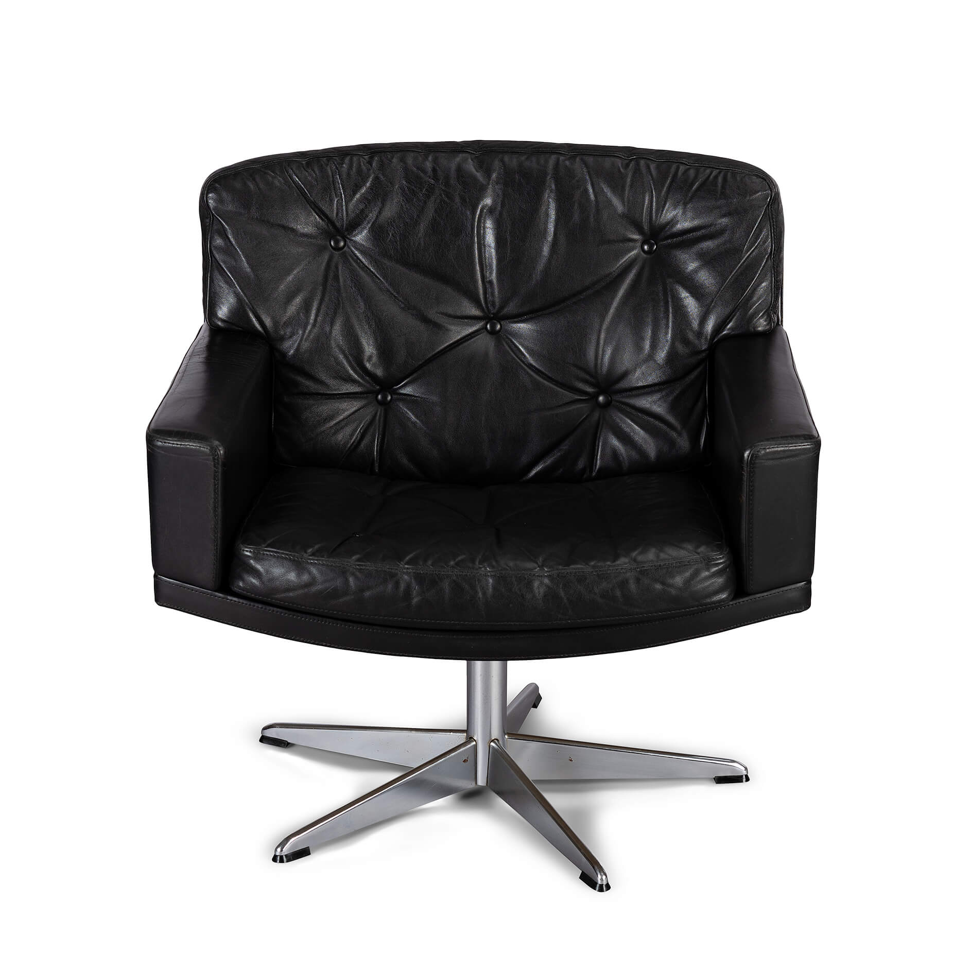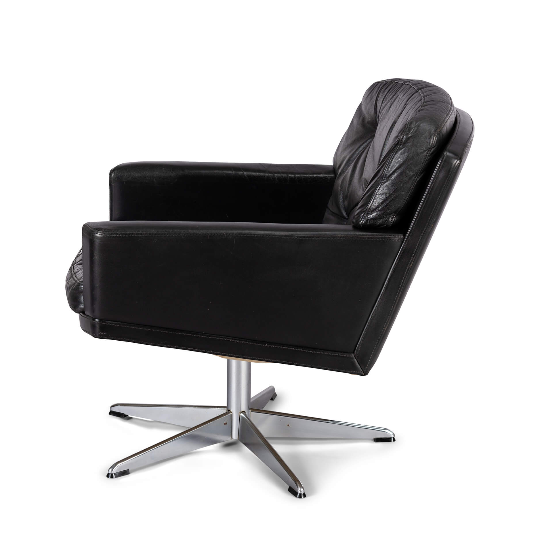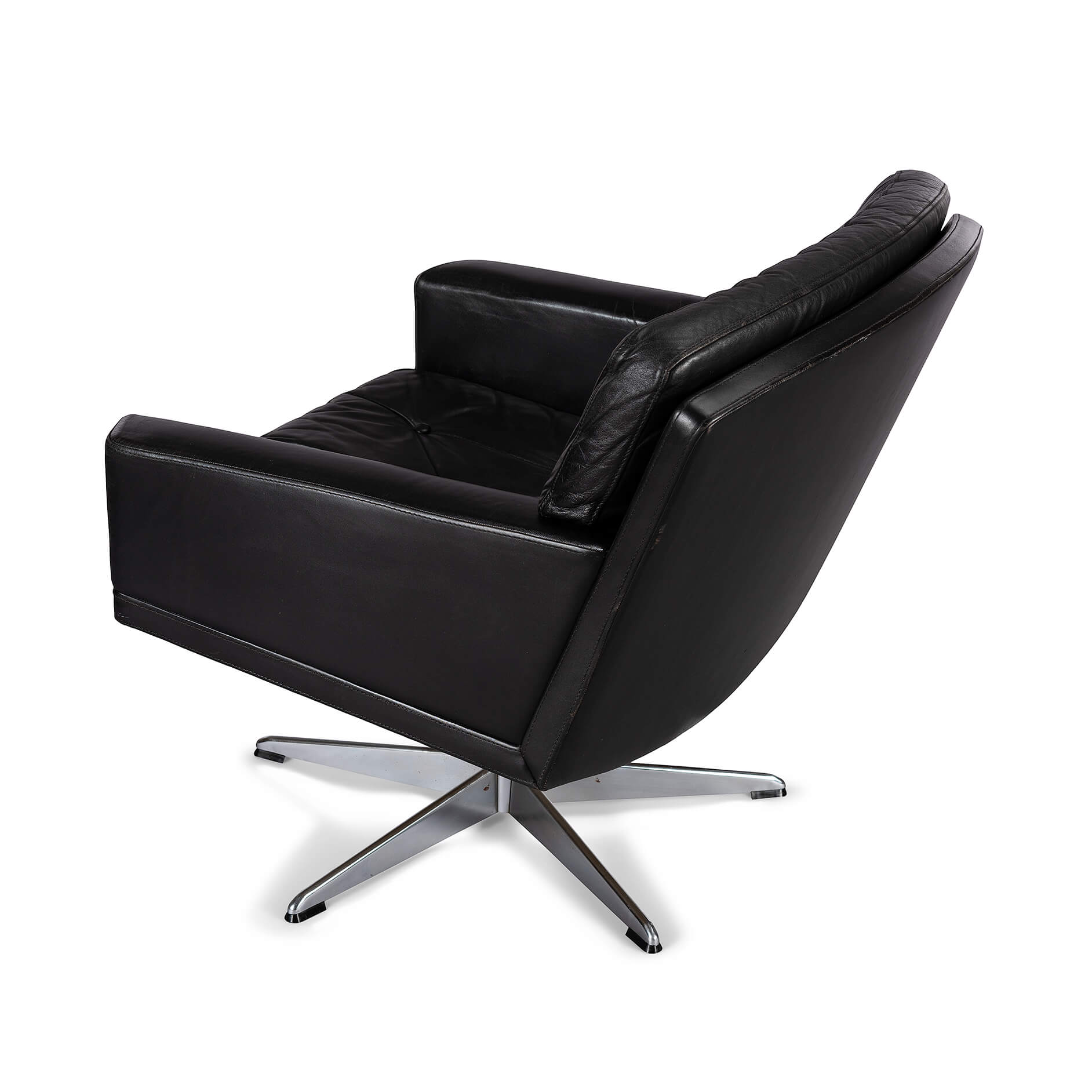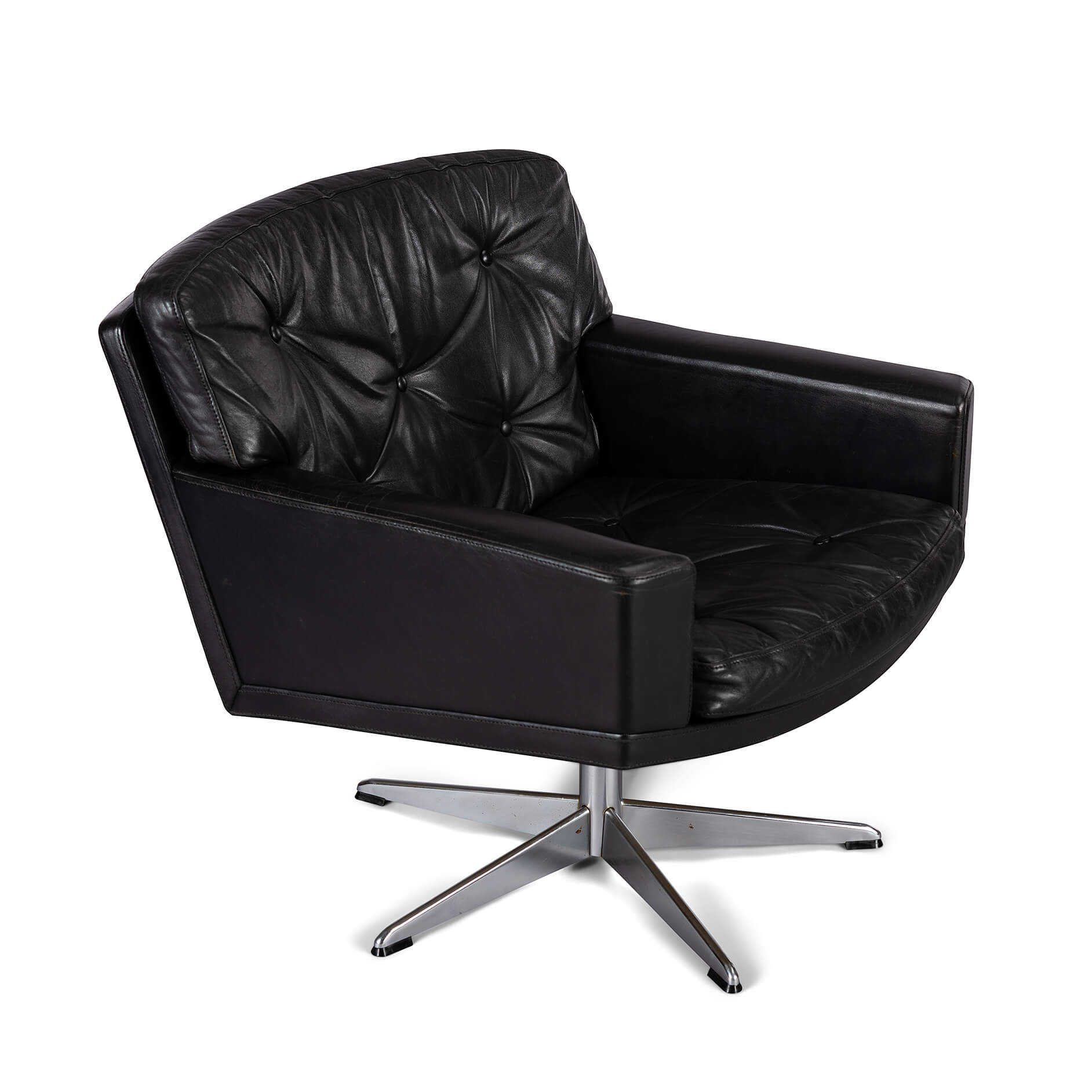 Midcentury modern black leather and chromed metal Danish 'Mama' swivel chair that will make Lita Ford drool. A four person 'room for everyone' sofa is also separately available. All is still in fully original condition and upholstery. The leather is in remarkable condition with just the right vintage patina everyone covets. The chair is super heavy duty, robust and enormously comfortable.