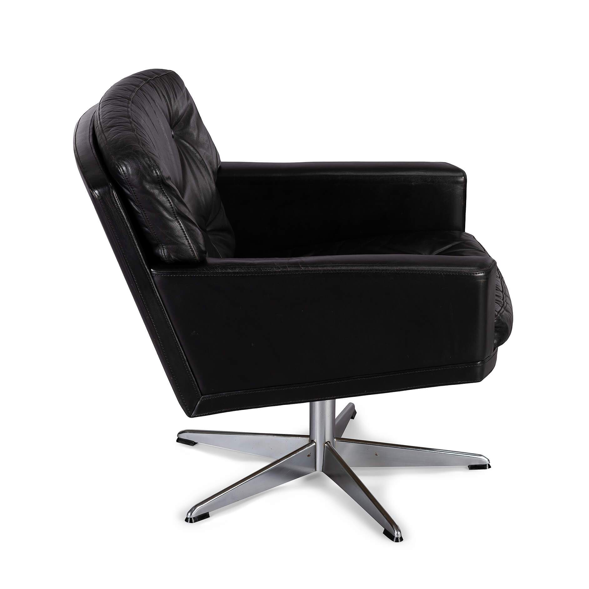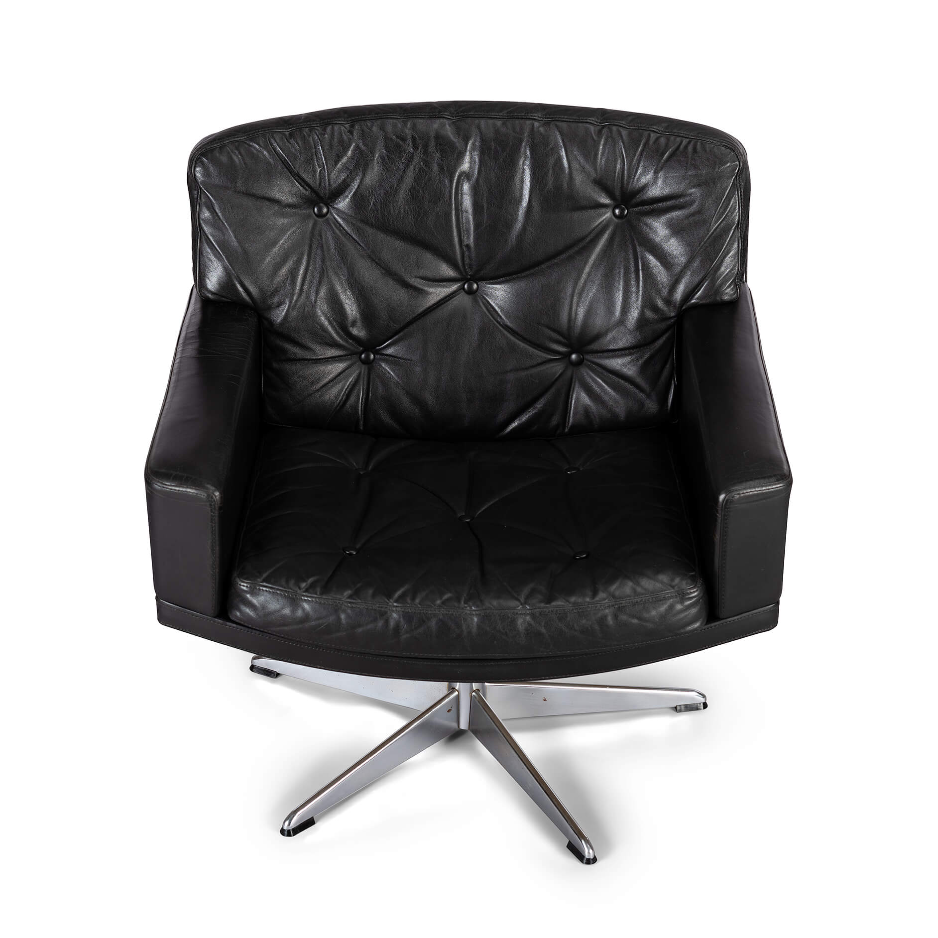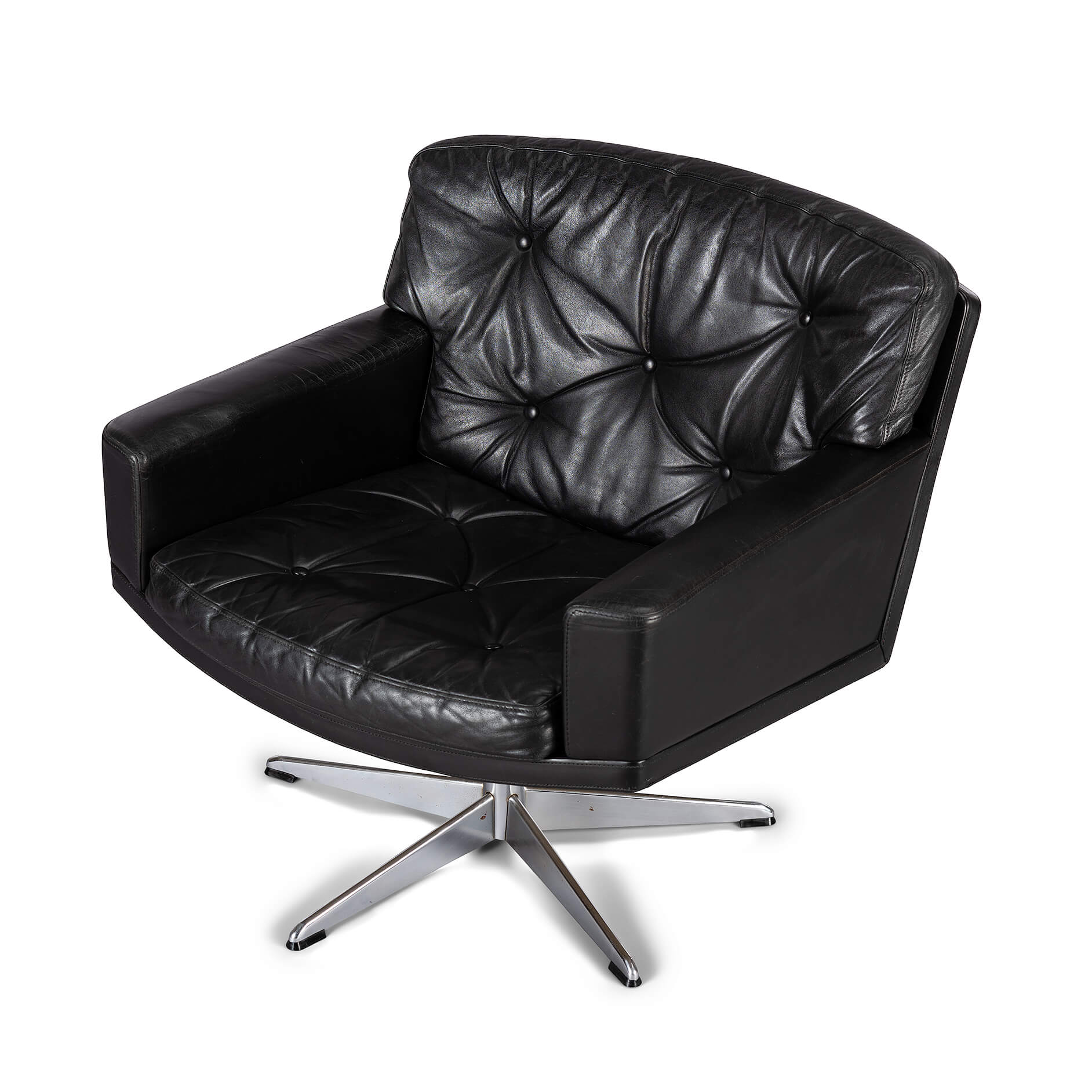 Midcentury modern black leather and chromed metal Danish 'Mama' swivel chair that will make Lita Ford drool. A four person 'room for everyone' sofa is also separately available. All is still in fully original condition and upholstery. The leather is in remarkable condition with just the right vintage patina everyone covets. The chair is super heavy duty, robust and enormously comfortable.