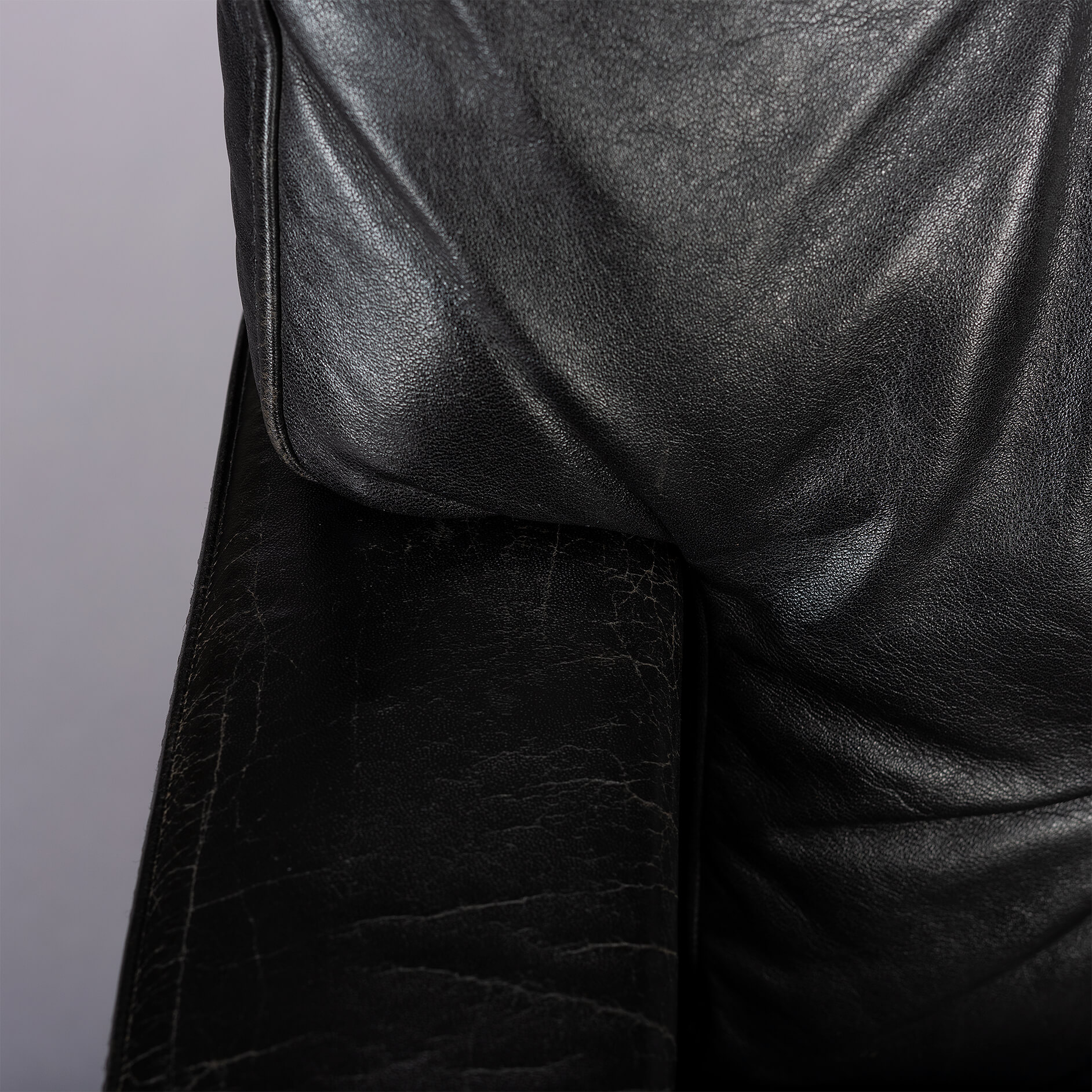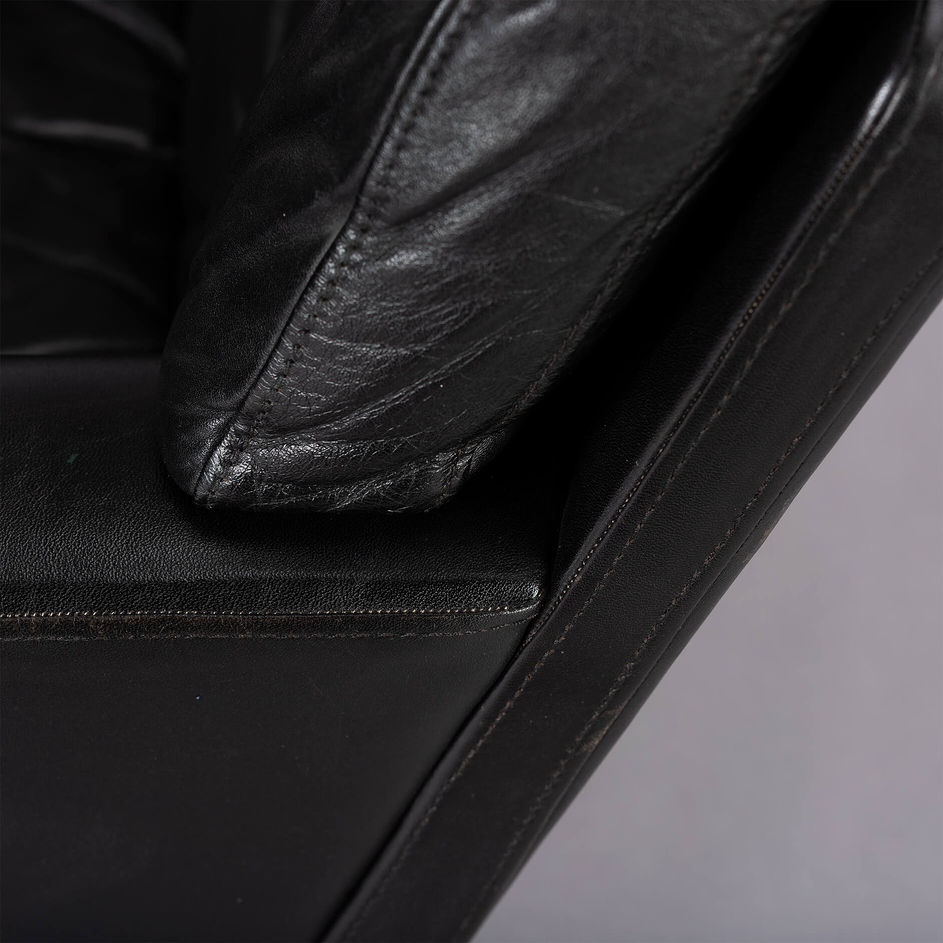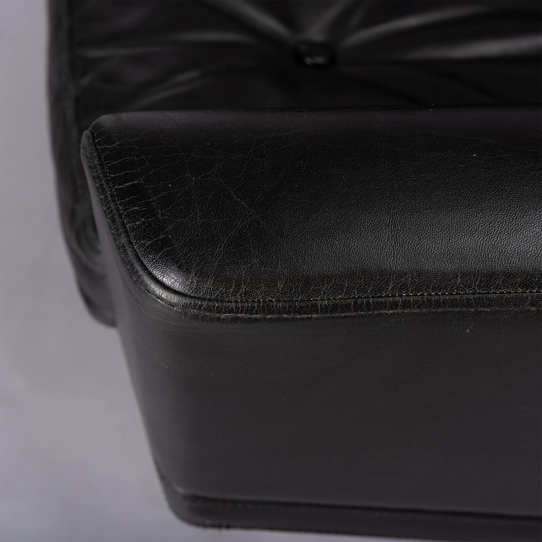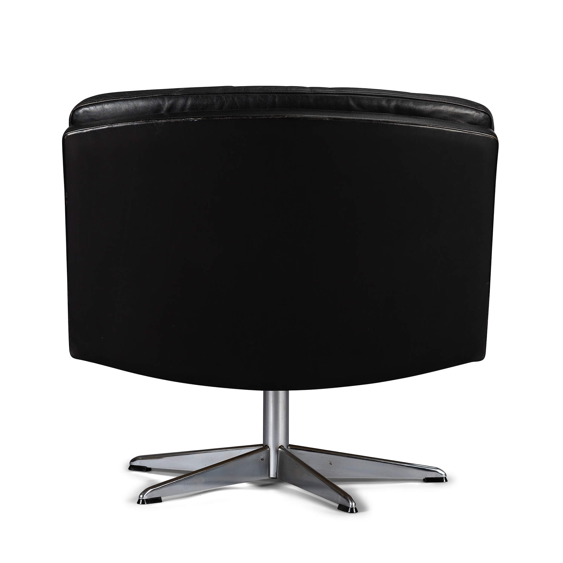 Midcentury modern black leather and chromed metal Danish 'Mama' swivel chair that will make Lita Ford drool. A four person 'room for everyone' sofa is also separately available. All is still in fully original condition and upholstery. The leather is in remarkable condition with just the right vintage patina everyone covets. The chair is super heavy duty, robust and enormously comfortable.