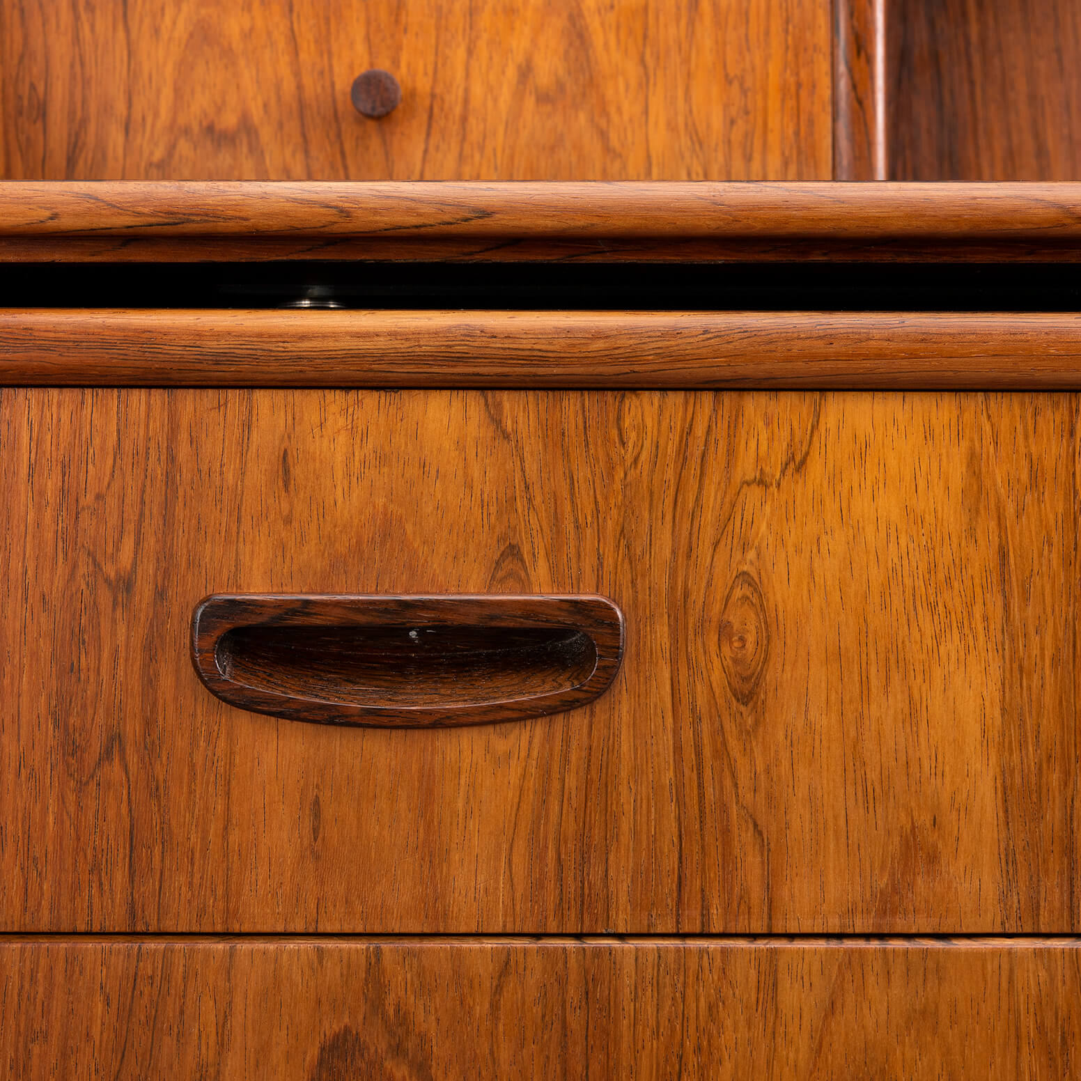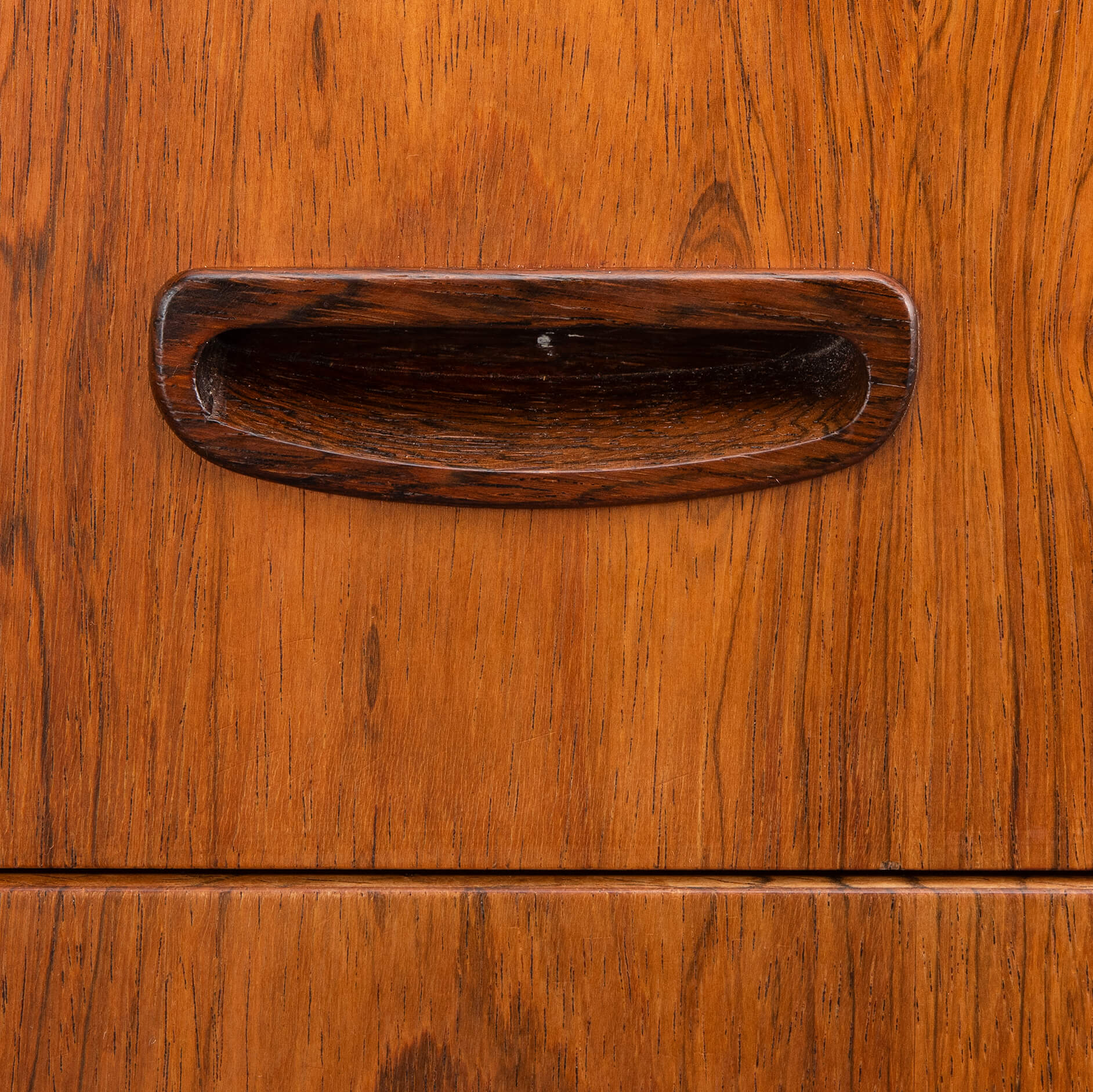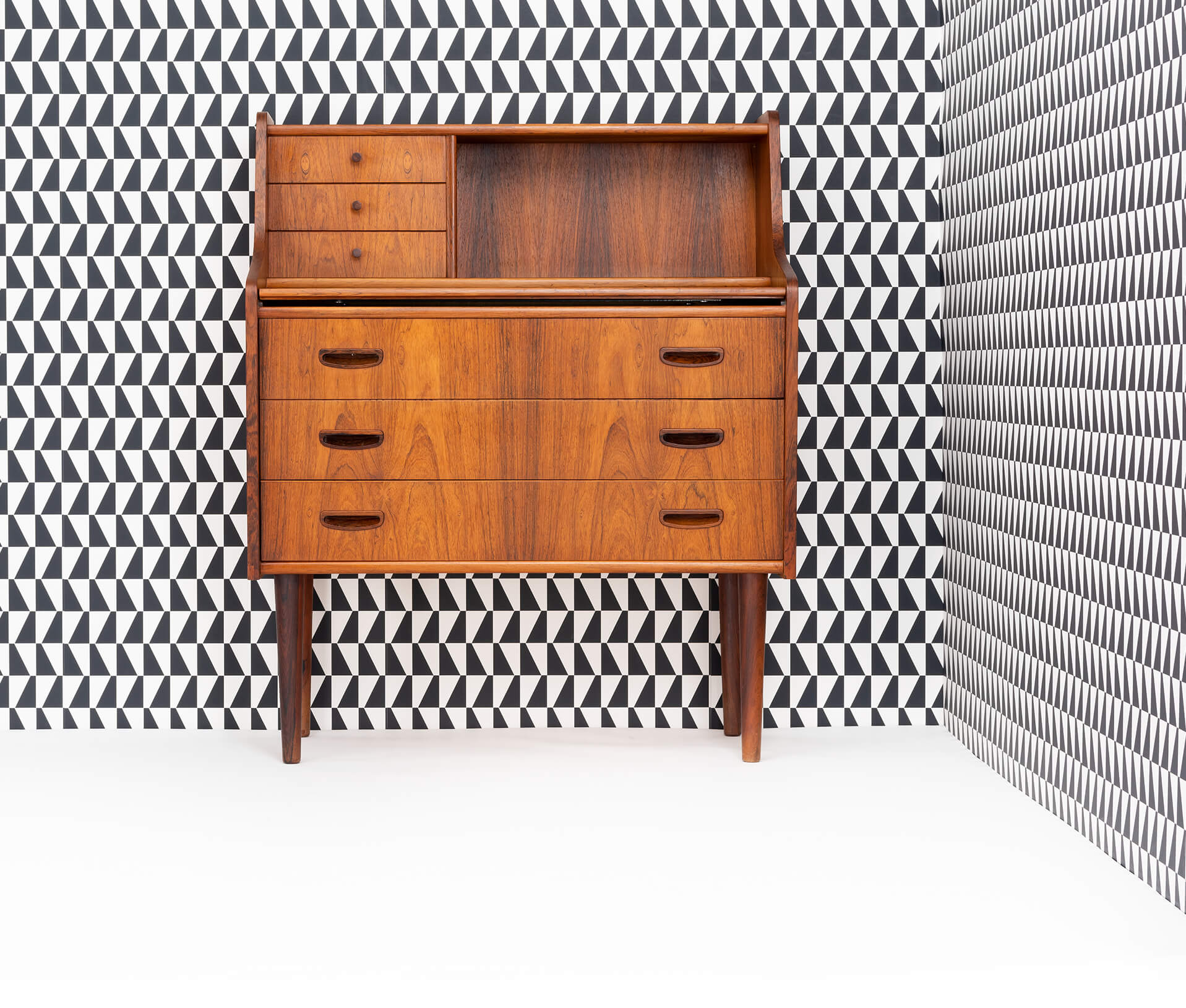 Super stylish! Everything is spot on with this Danish writing desk. Made out of a lovely rosewood veneer and maticuloulsy worked in every detail. Patterning of the veneer is subtle and are topped off with subtly cut solid rosewood knobs on the drawer block.