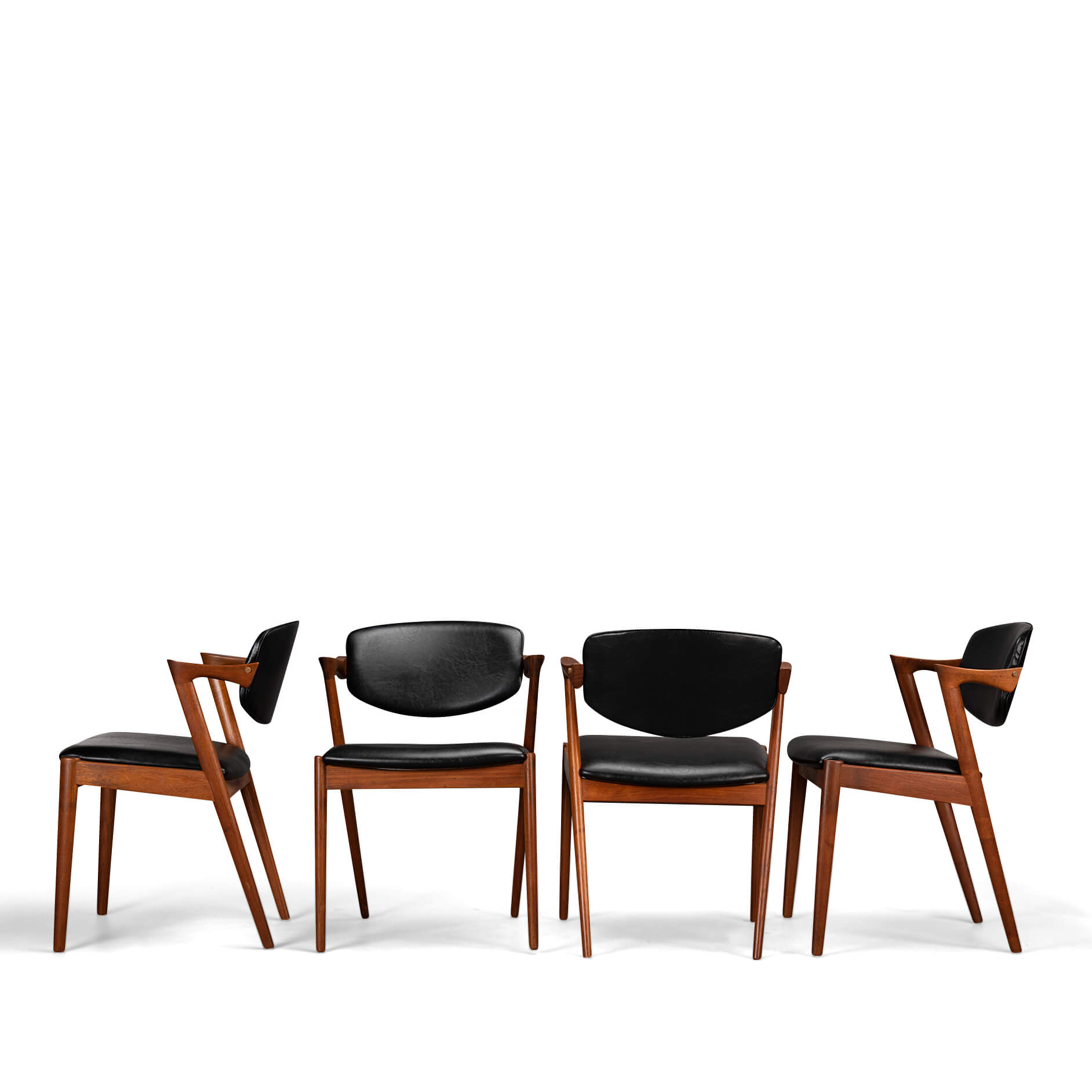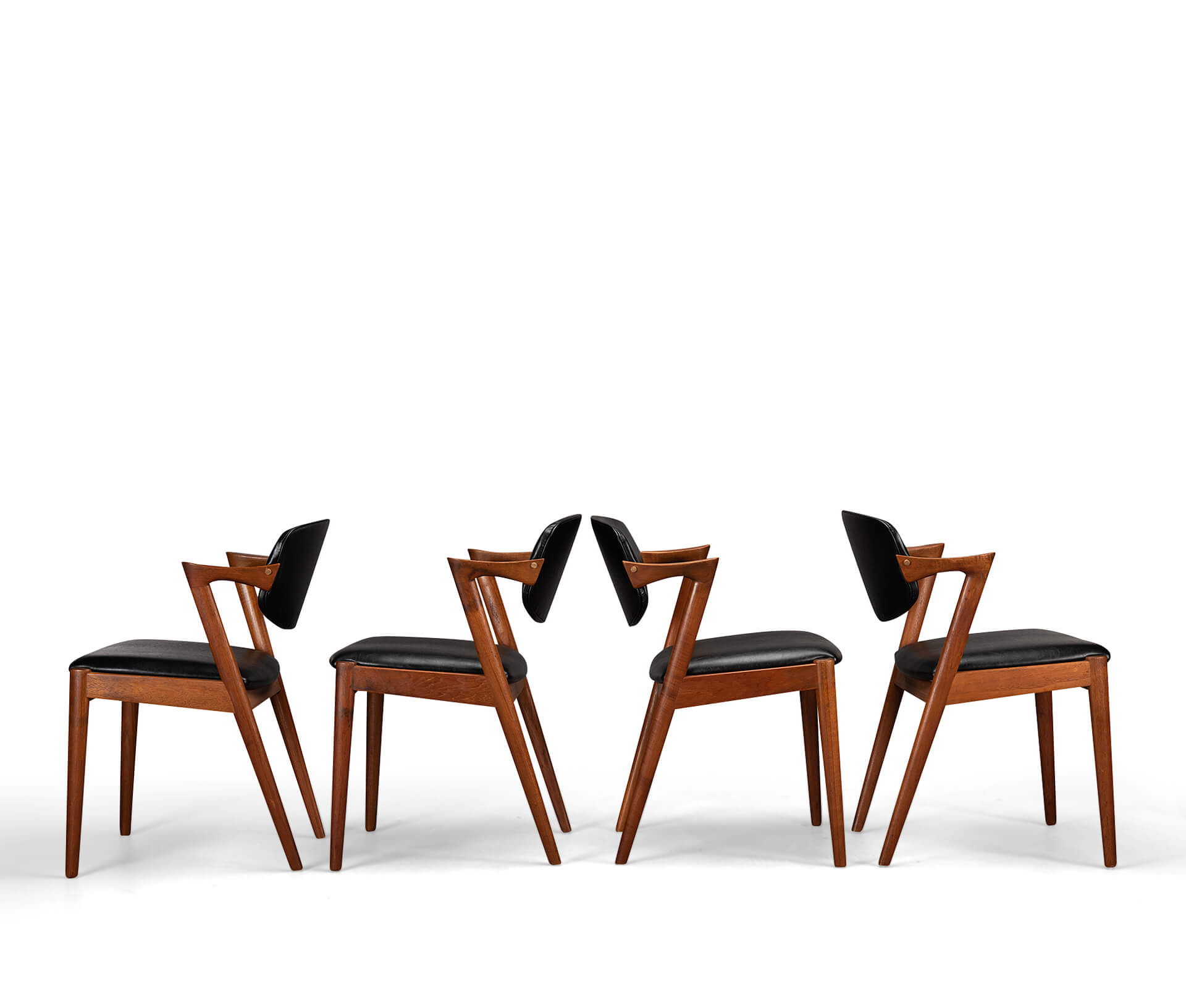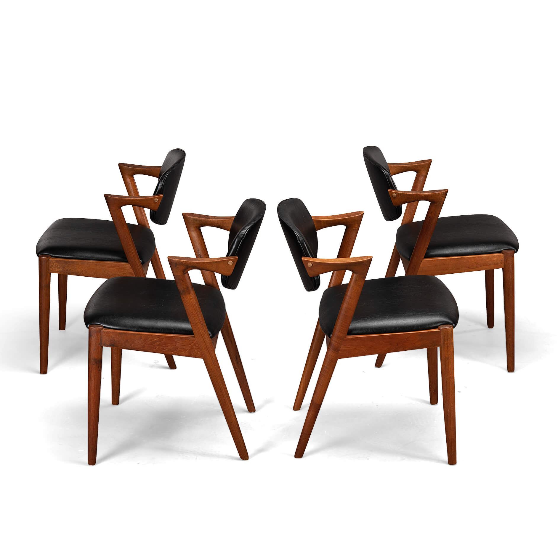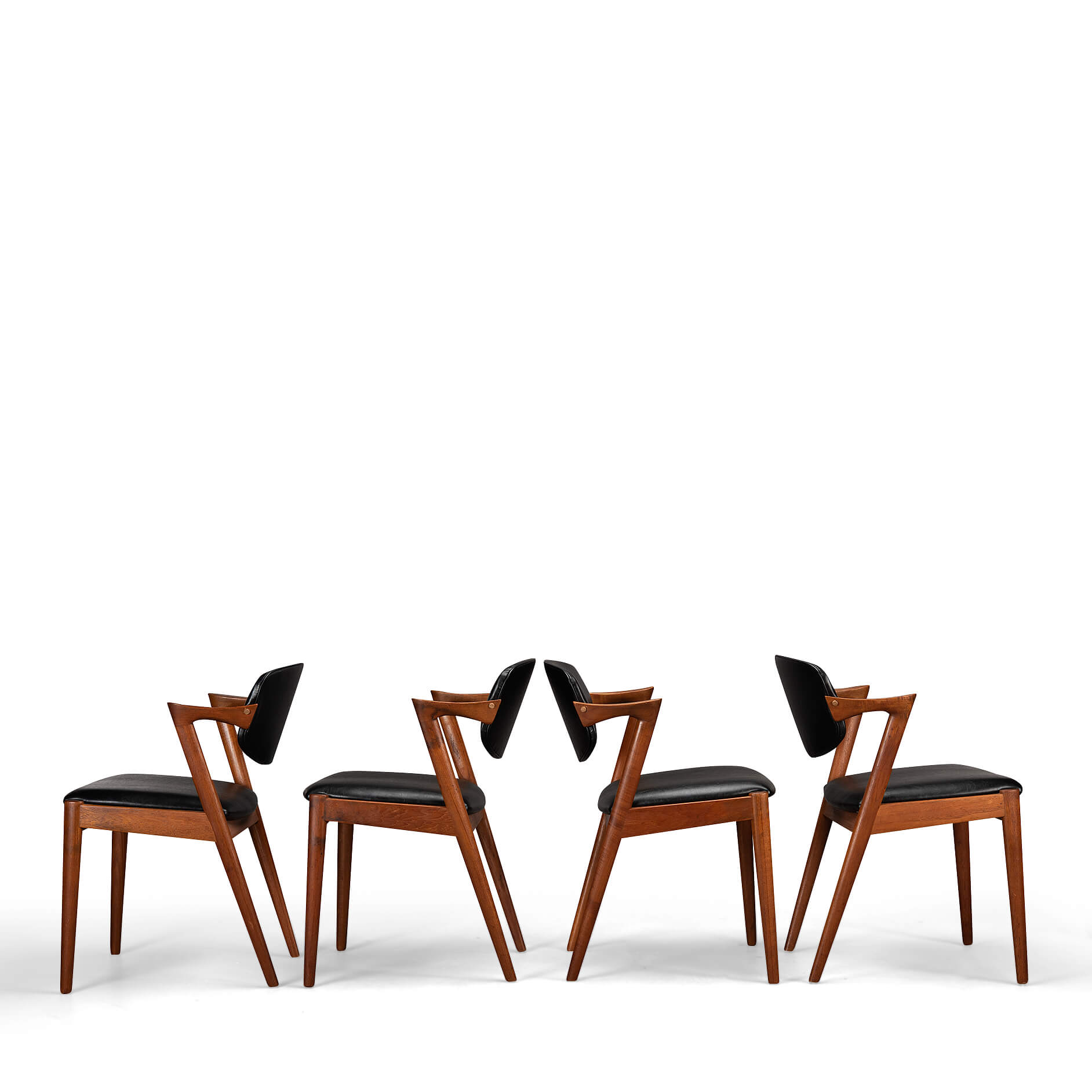 At first sight the chair might look slightly uncomfortable, however sits as a winner. Actually the short armrests are much better sized than typical ones you’ll find on a chair. Kristiansen clearly put some thought into this. These four chairs are from teak and the seats and backs have been reupholstered in a high quality (Retro) leatherette. The subtile glow makes it look like the original upholstery.