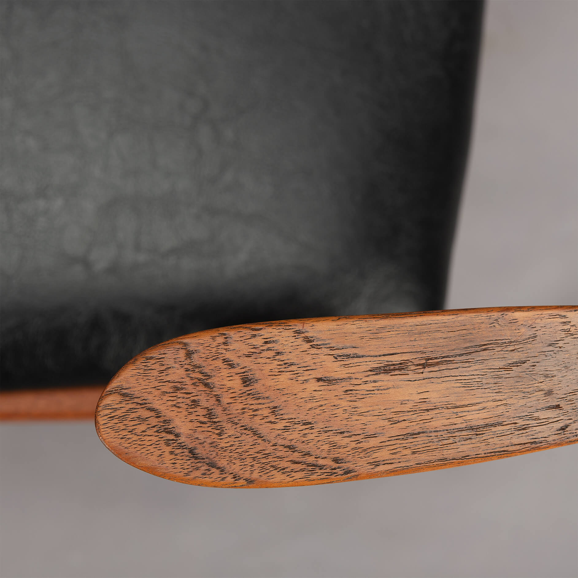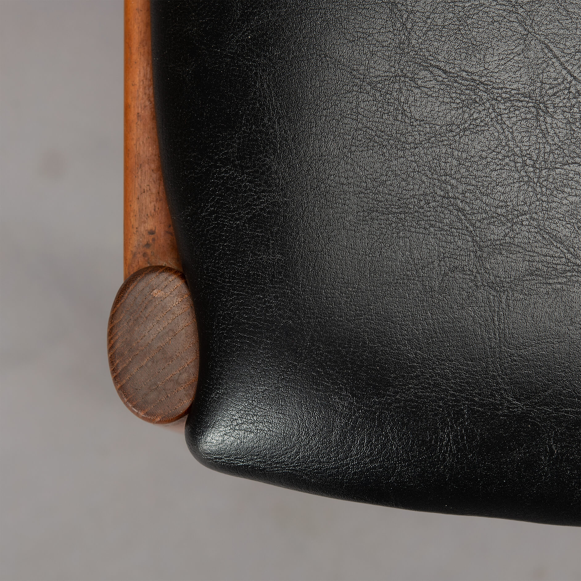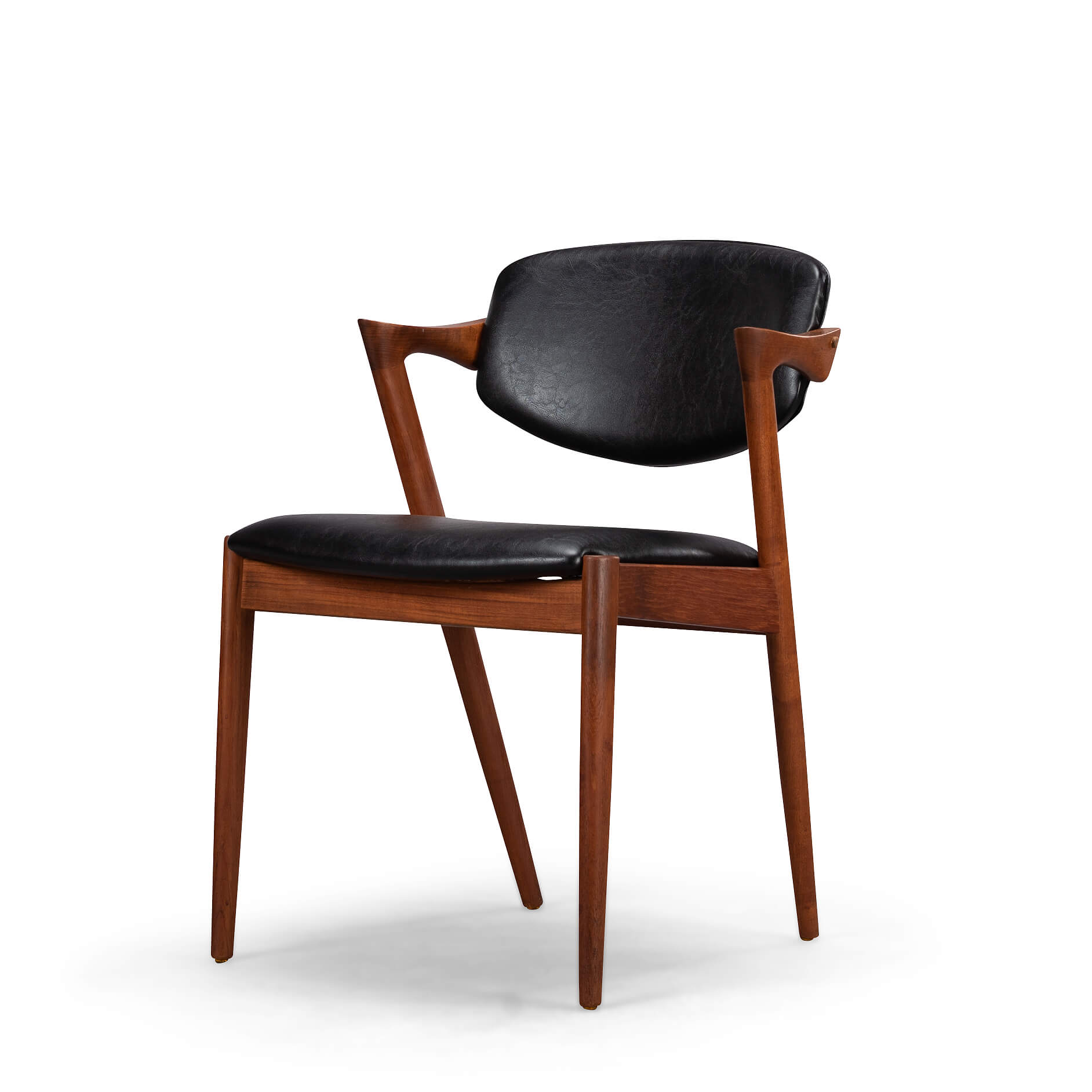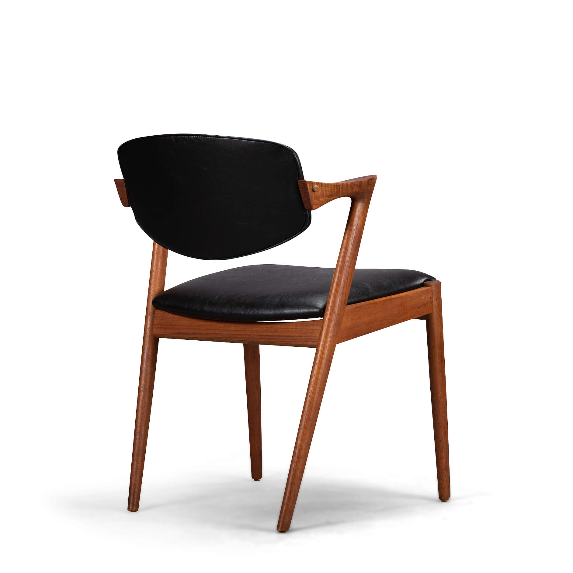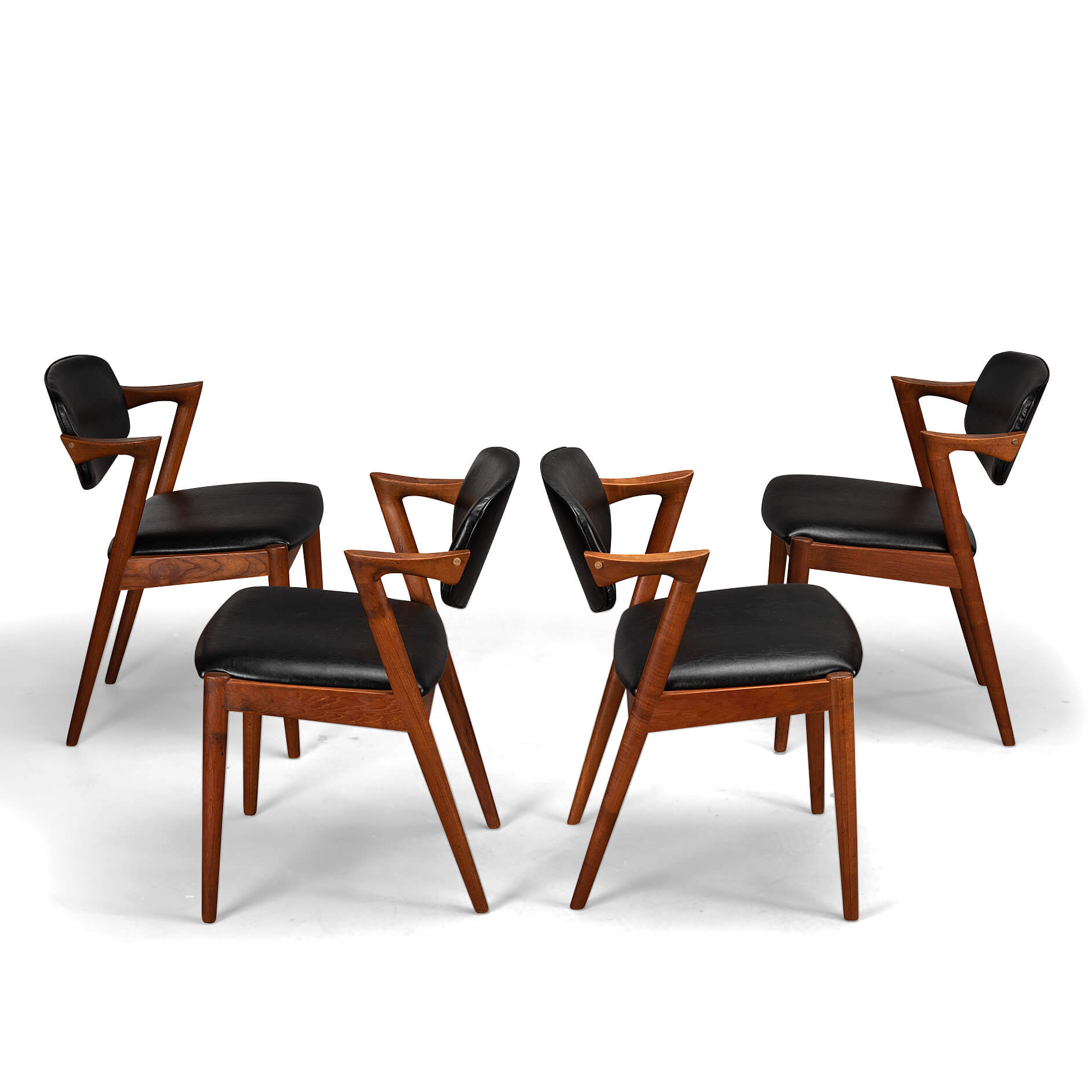 At first sight the chair might look slightly uncomfortable, however sits as a winner. Actually the short armrests are much better sized than typical ones you’ll find on a chair. Kristiansen clearly put some thought into this. These four chairs are from teak and the seats and backs have been reupholstered in a high quality (Retro) leatherette. The subtile glow makes it look like the original upholstery.